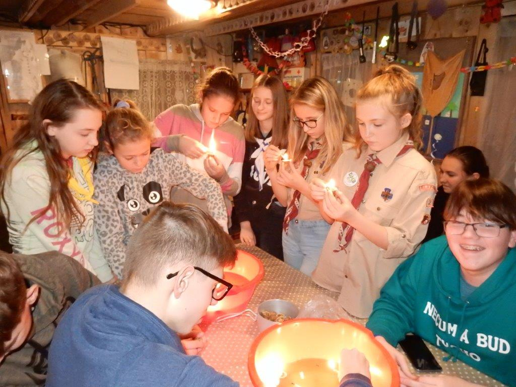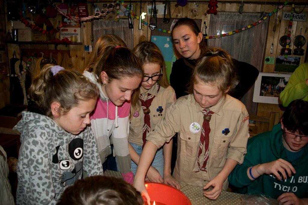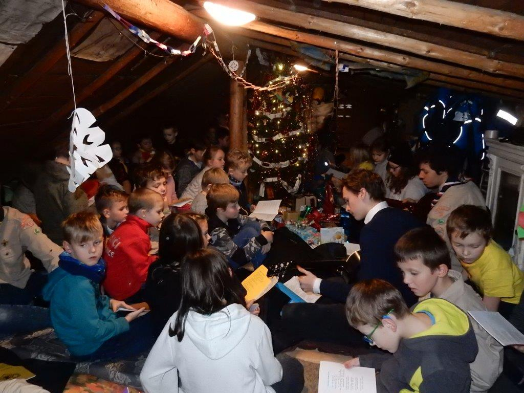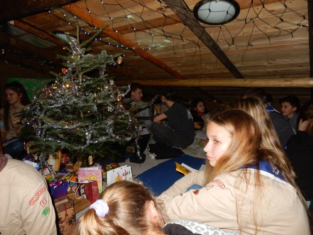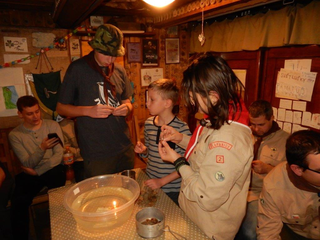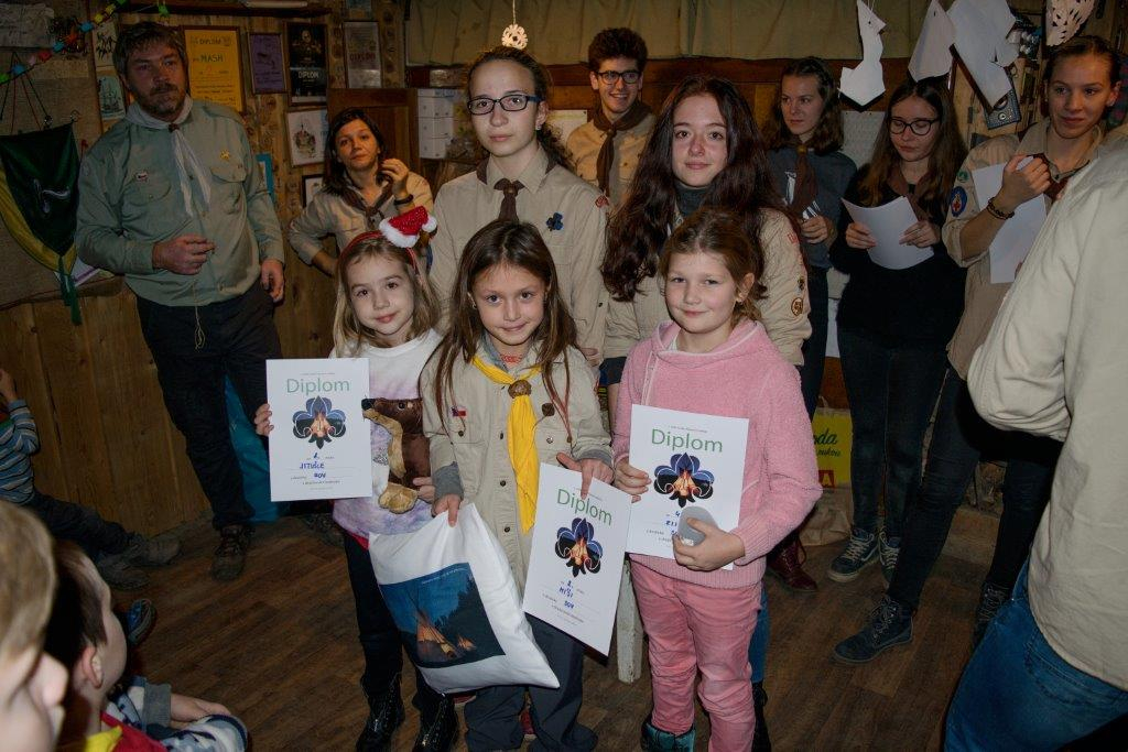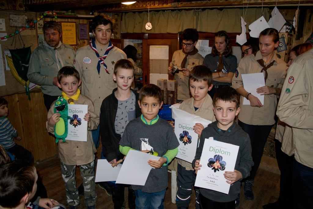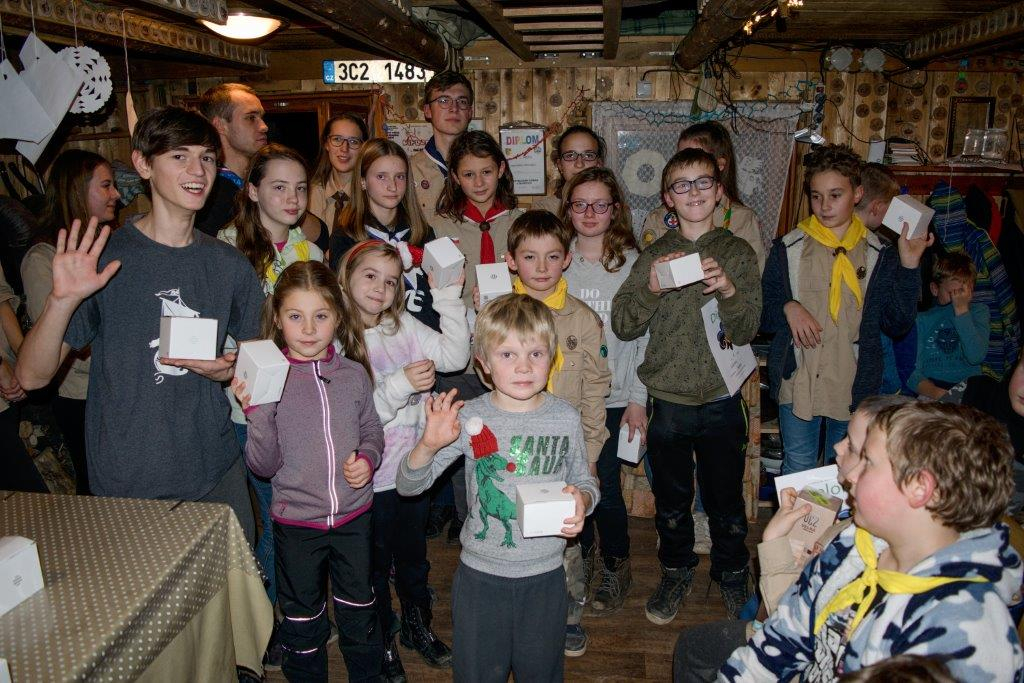 12°C nad nulou, sluníčko, jižní vítr. Tak vypadalo počasí v pátek 20.12. 2019, tedy v den Vánoční oddílové schůzky. Na Boudě se nás sešlo celkem 107 (možná víc, nevím, jestli se všichni zapsali do prezenčky) a bylo veselo. Po nástupu zorganizoval Džany na hřišti molekuly. Postupně se jednotlivé atomy posunuly do Trojky a faktem je, že druhooddíláci zase jednou projevili svoji pověstnou "skladnost". Vedoucí družin vyhlásili výsledky bodování,ti nejlepší převzali diplomy a věcné ceny. Hodnotila se i nejlepší účast, ten nepilnější z každé družiny dostal super cenu - hrníček s oddílovým obrázkem. Následovaly vánoční zvyky: odlévání vosku a lodičky z ořechových skořápek. Kudlanky a Sovičky ve Staré Boudě, Sršni, Žraloci a Kobři v Nové, Tygři, Vlci, Veverky, Pumy a Draci ve Trojce. Prskavky pak byly dalším bodem programu, o který se postaral Krysařík. Než se všichni přesunuli ke stromečkům (straší do podkroví Trojky, mladší nad Starou a Novou Boudu), nafasovali na cestu vánoční zpěvníček. Před rozdáváním dárků se totiž zpívaly koledy. Nevím jak u mladších (nebyl jsem tam), ale u starších zněl zpěv velmi pěkně. Dárečky pak rozdávali ti nejmladší - Sádra z Pum (oslavila teprve 4. narozeniny) a Žabka z Veverek. Moc pěkná schůzka Jura