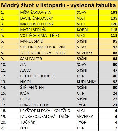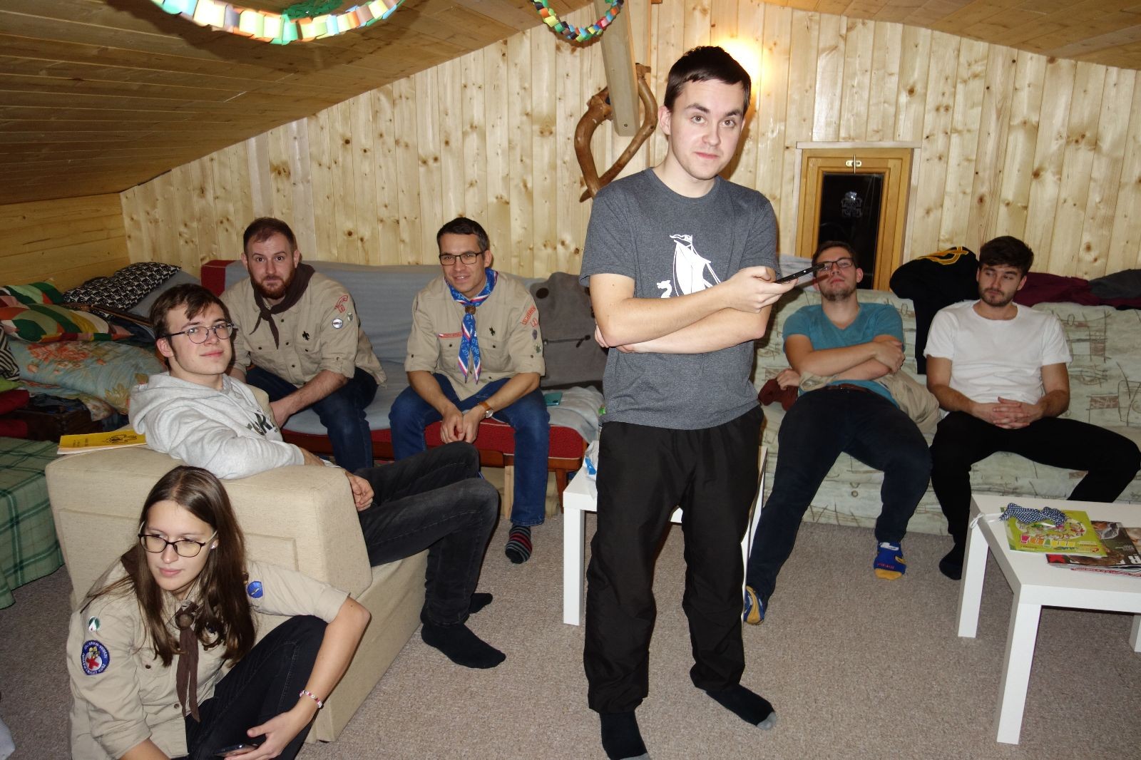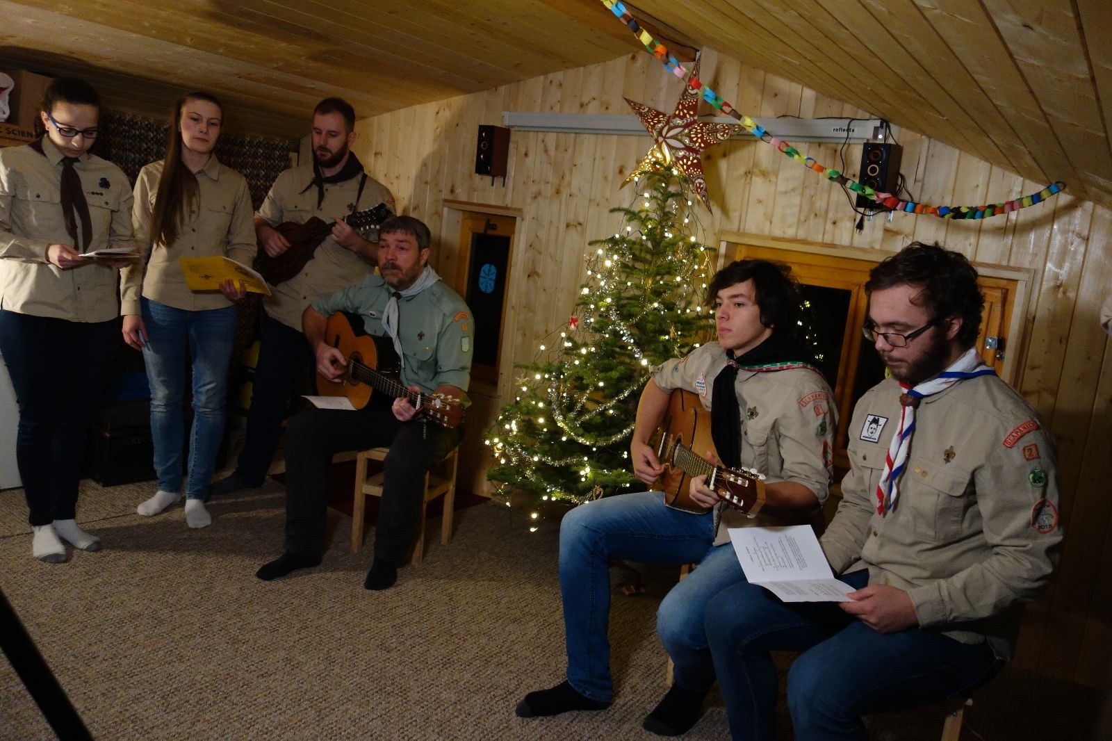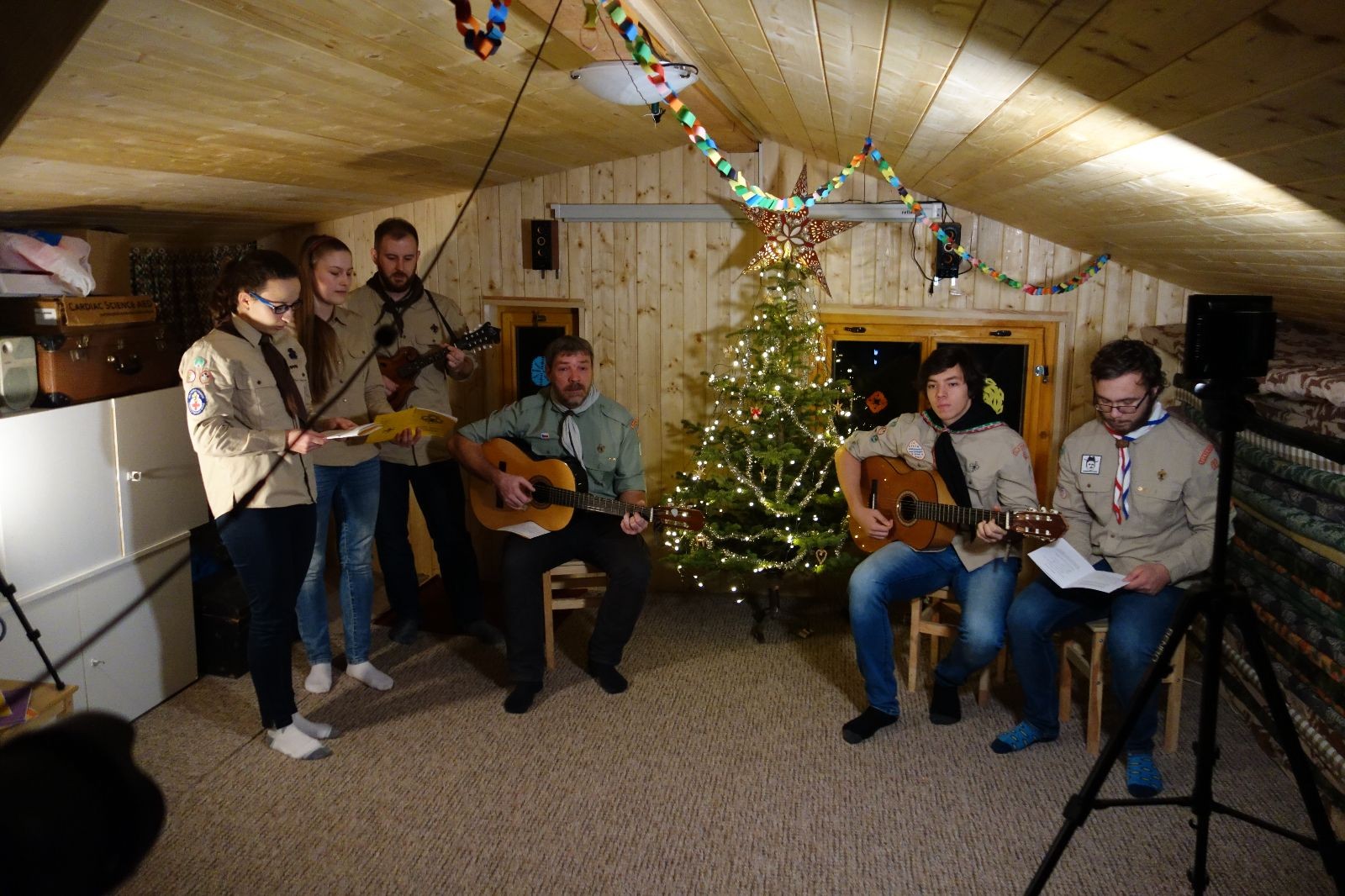 17:00. Filda hlásí asi 35 připojených. Na „plac“ před ozdobený stromeček kráčí Brácha s Džanym. Úvod. Na ně navazuje Petr s vyhodnocením „Modrého života v listopadu“. Nejvíce bodů nasbírali sourozenci Šarlovští, těsně následováni Matoušem Plotěným. Na chatu se začínají scházet komentáře, většinou podpůrné a pozitivní. Dalším na řadě je Kanec a vyhodnocení soutěže „Po stopách cestovatele Lišky“. Z 33 účastníků se pěti dokonce podařilo nashromáždit plný počet bodů. Byli to: Tesák, Kolečko, Kája Jirásková a opět sourozenci Míša a David Šarlovští. Následuje zpěv koled. Kloub a já hrajeme na kytárky, Fuf na Mandolínu, ostatní zpívají. Hezky to zní. A vrchol akce: premiéra filmu z tábora, který letos zpracovával Váca. Nakonec rozloučení a zakončení akce. Snad dobrý :-).
