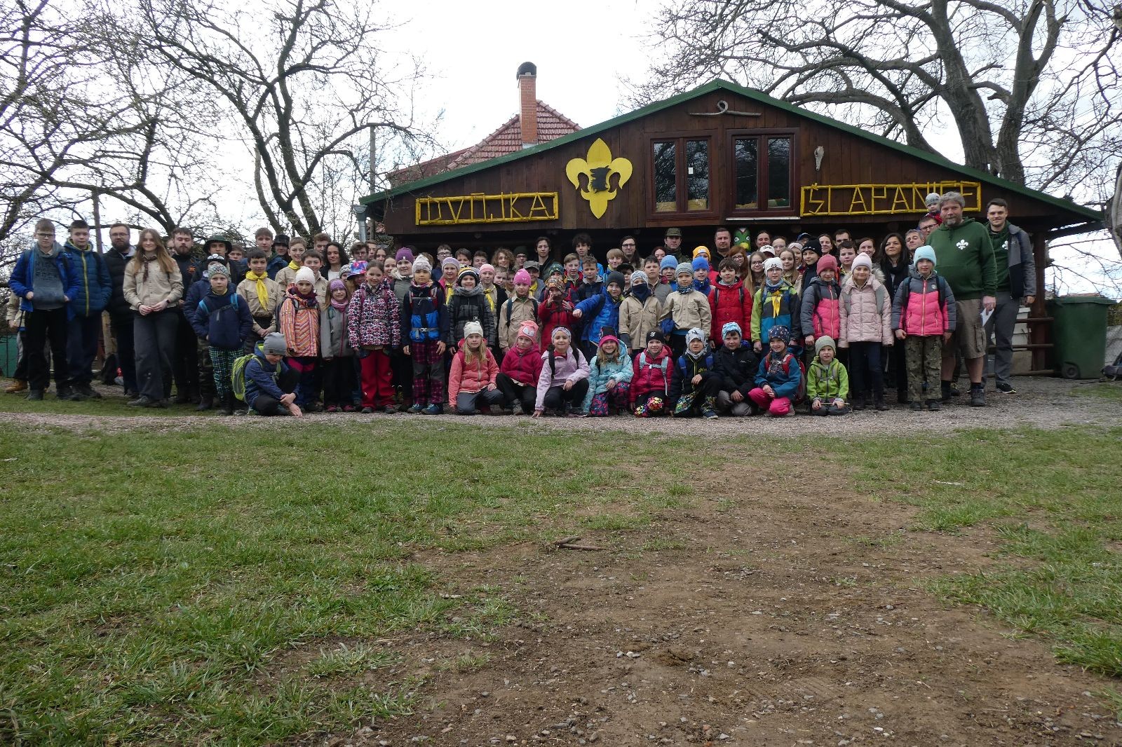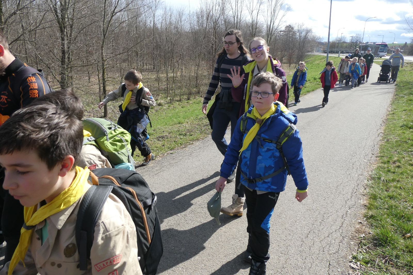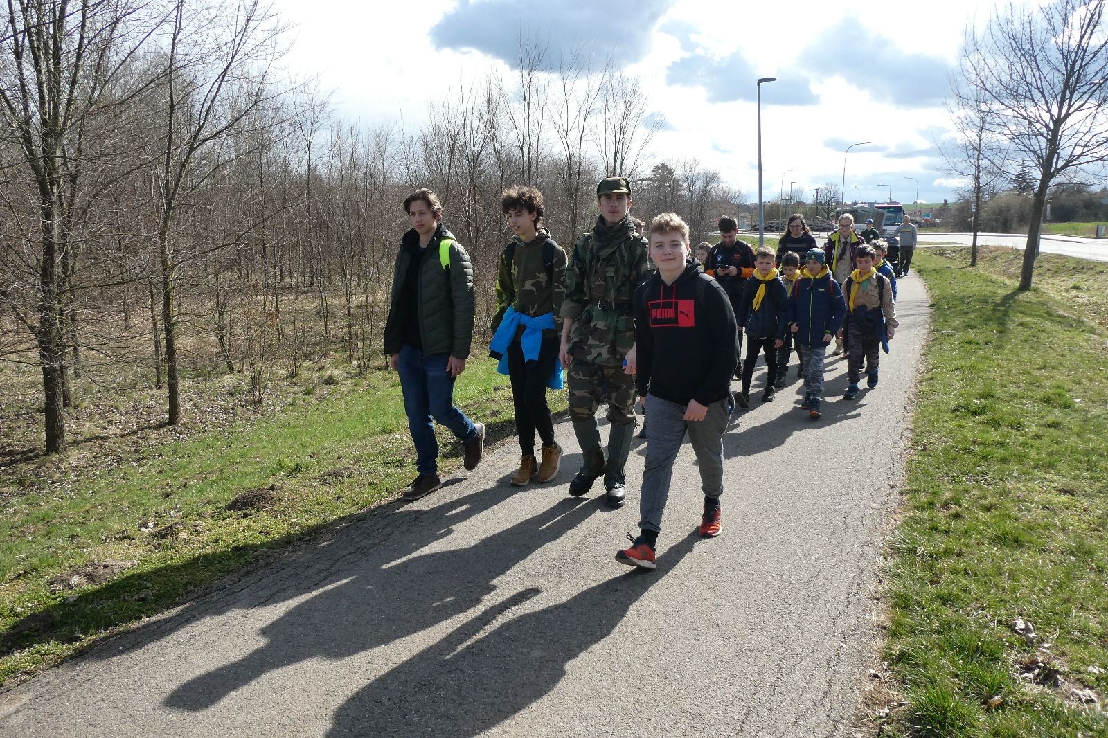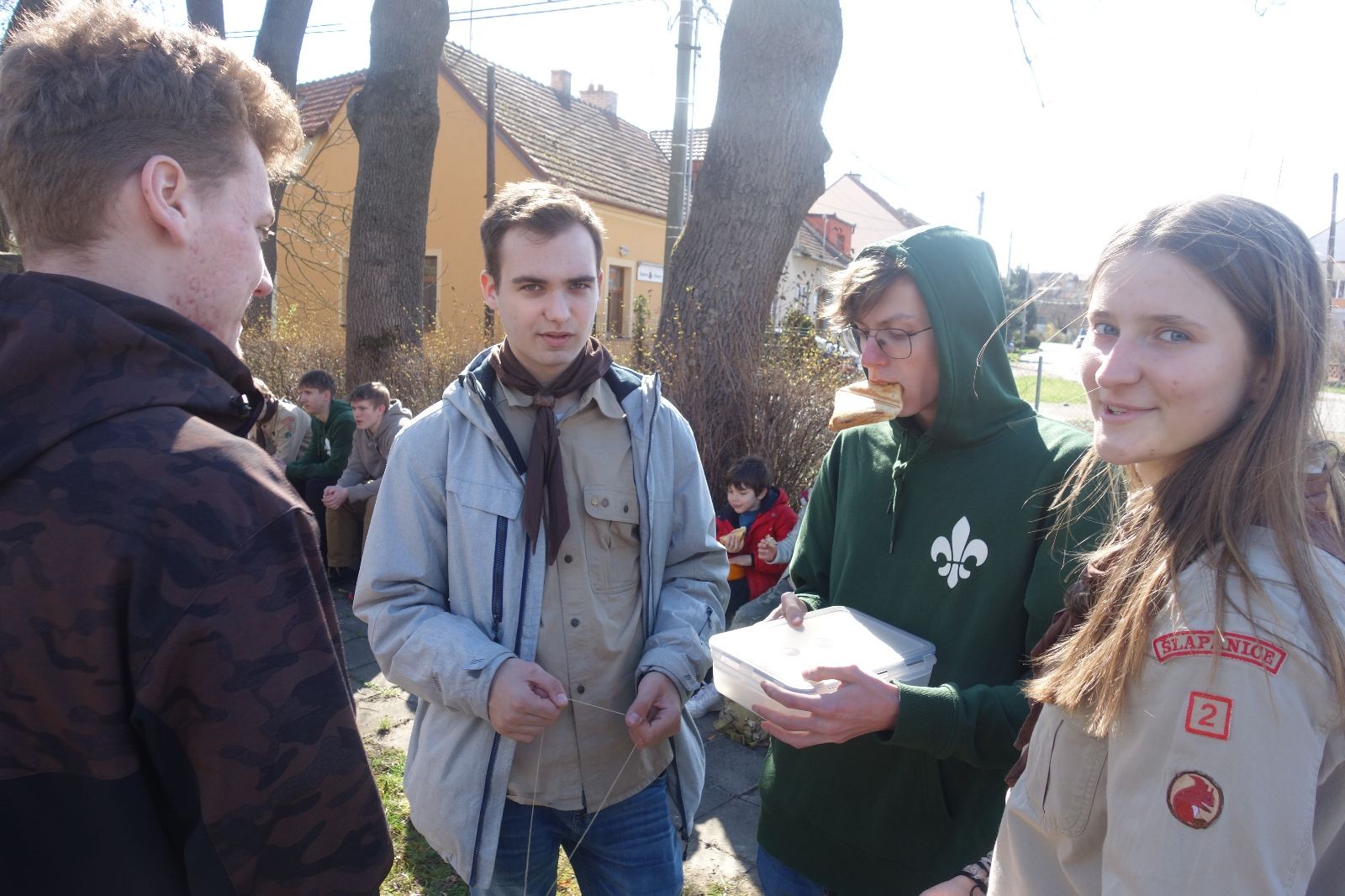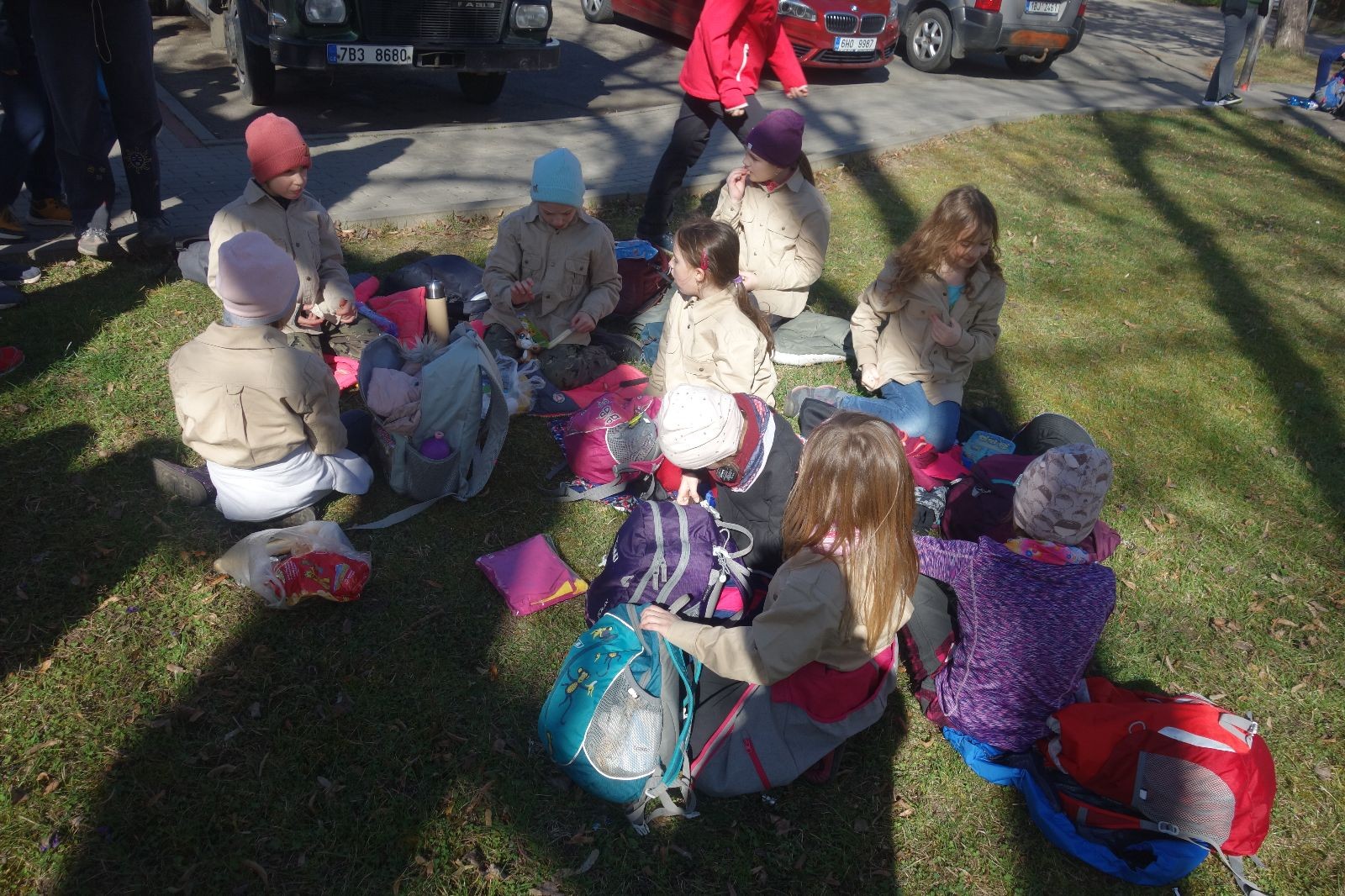 Scházíme se v sobotu ve 13:00 na Boudě. Renča a Betkou balí symboly pro slibaře, Filda bere oddílovou vlajku, Bert balí ovocné čočky, Ovečka lana, Terka s Kosťou svíčičky, Krysařík krepové fáborky… Všude se hemží mrňousci. Žraloci, Tučňáci a mladší se lokují dozadu, Kobři, Sovičky a starší dopředu. Ještě nezbytné společné foto před Trojkou a můžeme vyrazit. Poctivě zapisuju počty přítomných a i s dvojnásobným otcem Vítkem a Elektronkem je nás 94. Na první zastávce v Podolí svačíme a hraje se Hututu. A taky zalézá poprvé sluníčko, spouští se fujavice a prší. Naše řady doplňují Hihňa s Babů, je nás 96. U Vlajkované v Mariánským zase vychází sluníčko, přicházejí Hanz a Lost. 98 nás je. A Kobrák Ondra, takže 99. Bude letos stovka?