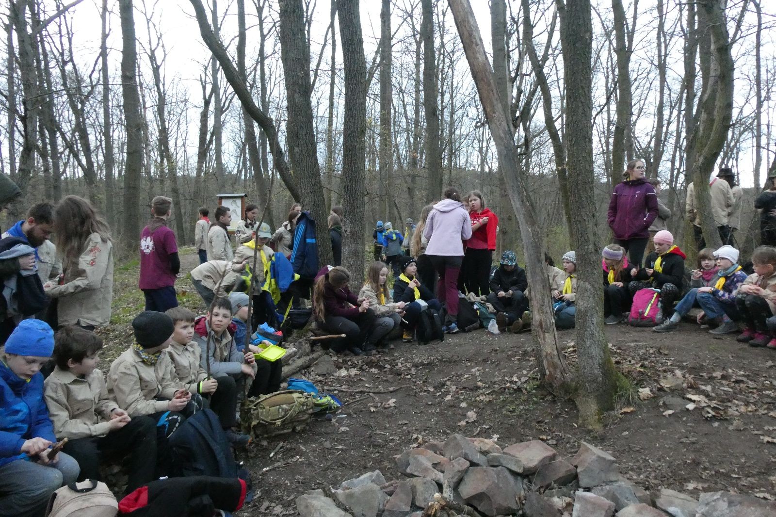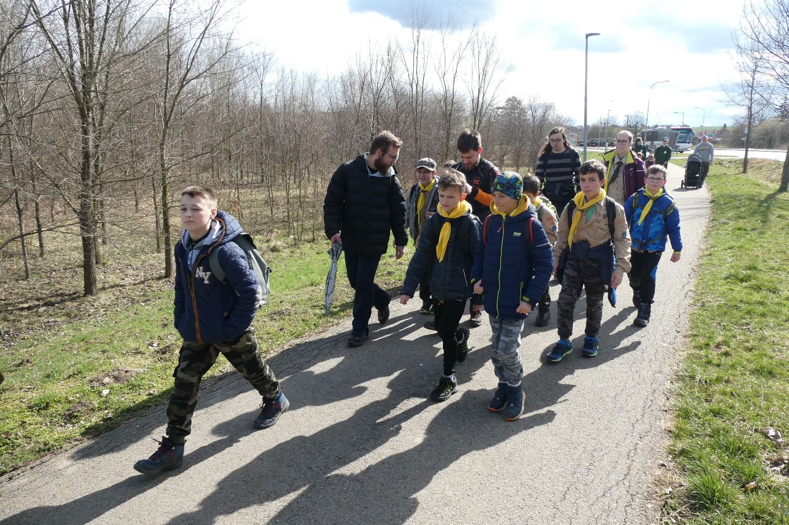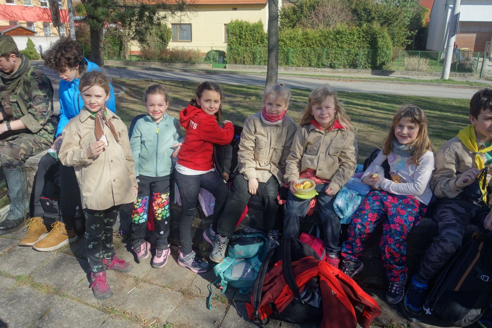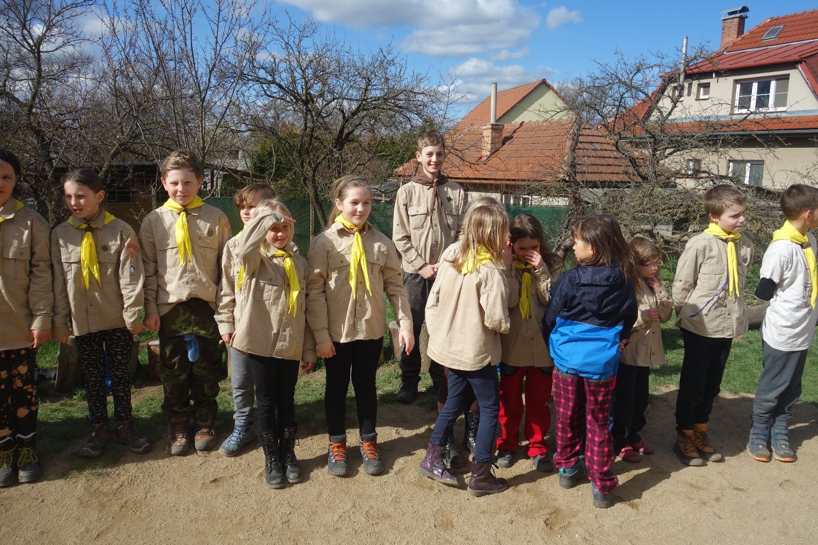 Scházíme se v sobotu ve 13:00 na Boudě. Renča a Betkou balí symboly pro slibaře, Filda bere oddílovou vlajku, Bert balí ovocné čočky, Ovečka lana, Terka s Kosťou svíčičky, Krysařík krepové fáborky… Všude se hemží mrňousci. Žraloci, Tučňáci a mladší se lokují dozadu, Kobři, Sovičky a starší dopředu. Ještě nezbytné společné foto před Trojkou a můžeme vyrazit. Poctivě zapisuju počty přítomných a i s dvojnásobným otcem Vítkem a Elektronkem je nás 94. Na první zastávce v Podolí svačíme a hraje se Hututu. A taky zalézá poprvé sluníčko, spouští se fujavice a prší. Naše řady doplňují Hihňa s Babů, je nás 96. U Vlajkované v Mariánským zase vychází sluníčko, přicházejí Hanz a Lost. 98 nás je. A Kobrák Ondra, takže 99. Bude letos stovka?