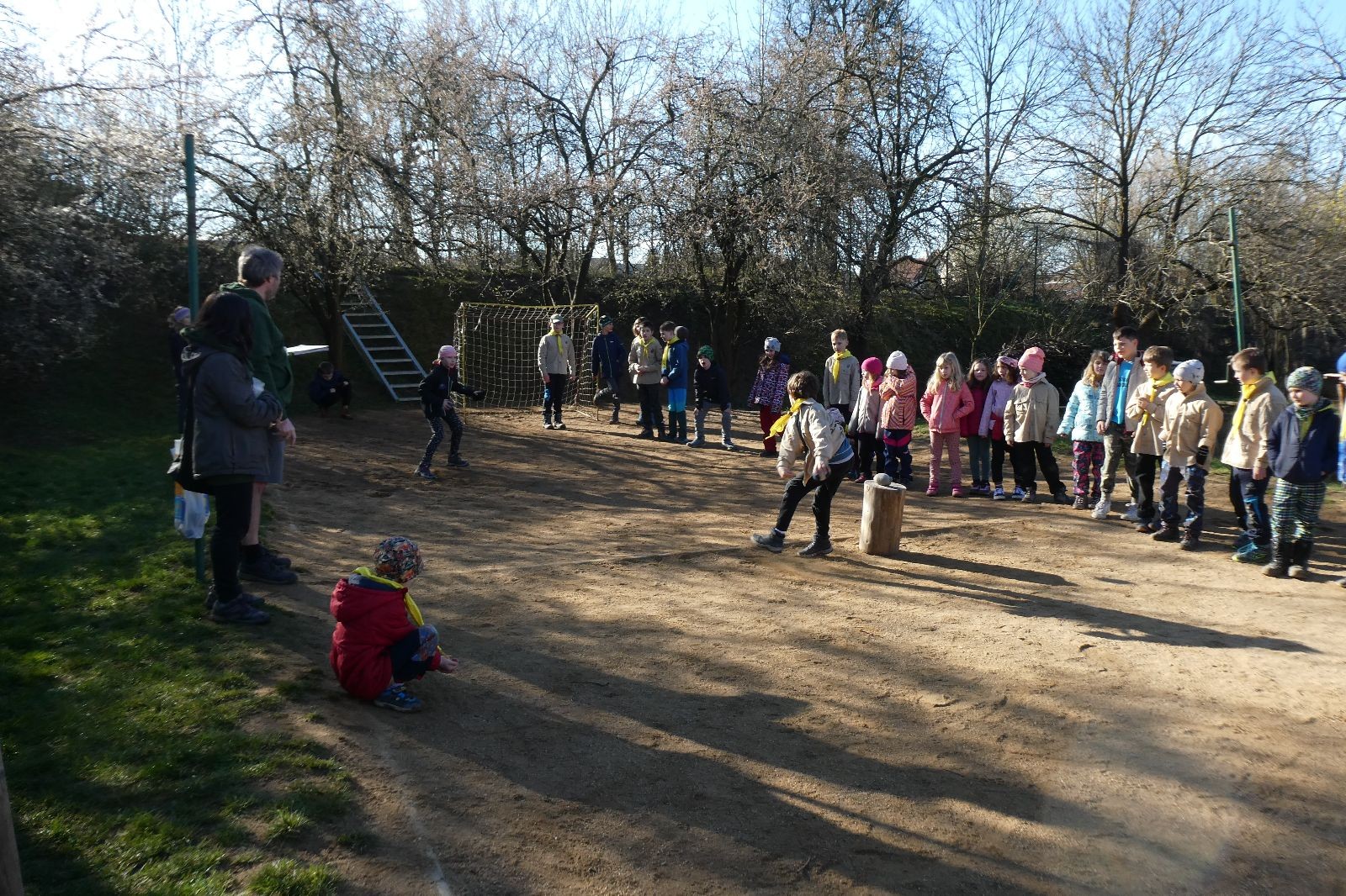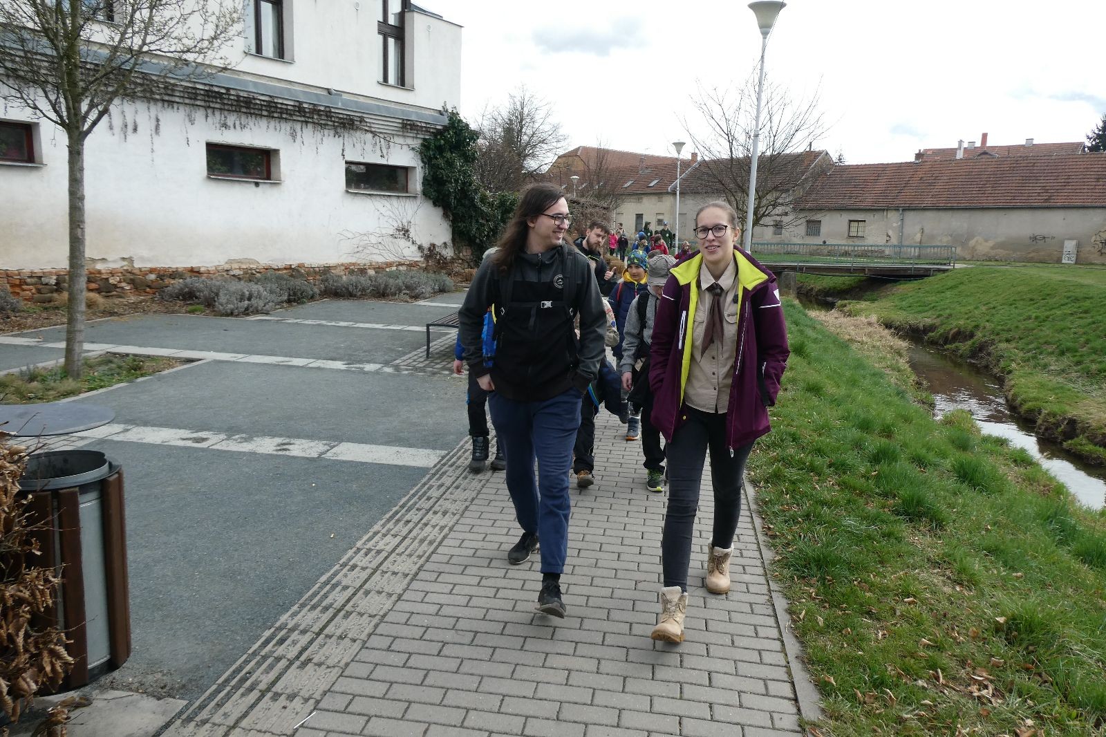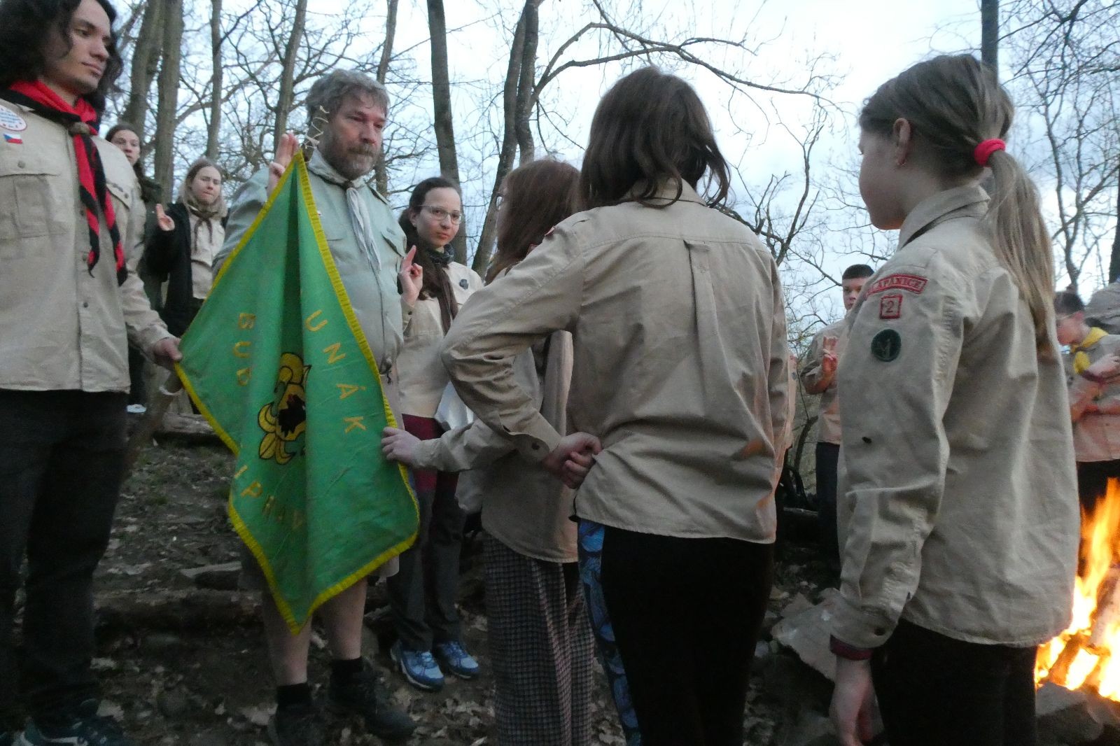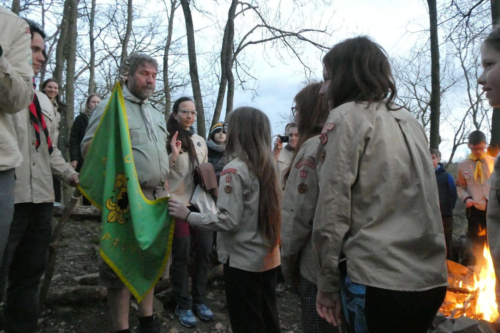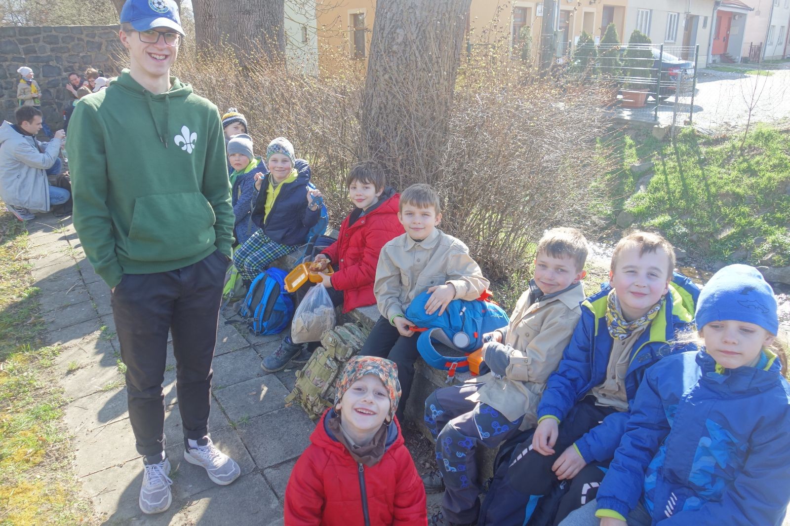 Scházíme se v sobotu ve 13:00 na Boudě. Renča a Betkou balí symboly pro slibaře, Filda bere oddílovou vlajku, Bert balí ovocné čočky, Ovečka lana, Terka s Kosťou svíčičky, Krysařík krepové fáborky… Všude se hemží mrňousci. Žraloci, Tučňáci a mladší se lokují dozadu, Kobři, Sovičky a starší dopředu. Ještě nezbytné společné foto před Trojkou a můžeme vyrazit. Poctivě zapisuju počty přítomných a i s dvojnásobným otcem Vítkem a Elektronkem je nás 94. Na první zastávce v Podolí svačíme a hraje se Hututu. A taky zalézá poprvé sluníčko, spouští se fujavice a prší. Naše řady doplňují Hihňa s Babů, je nás 96. U Vlajkované v Mariánským zase vychází sluníčko, přicházejí Hanz a Lost. 98 nás je. A Kobrák Ondra, takže 99. Bude letos stovka?