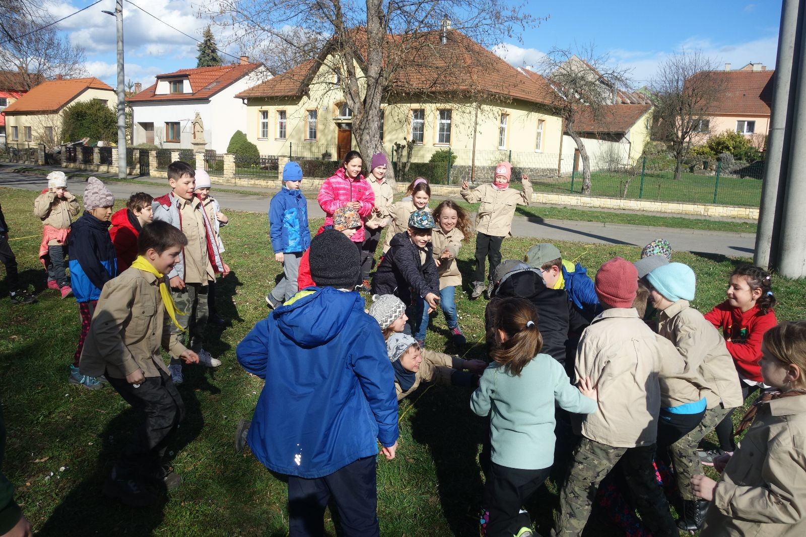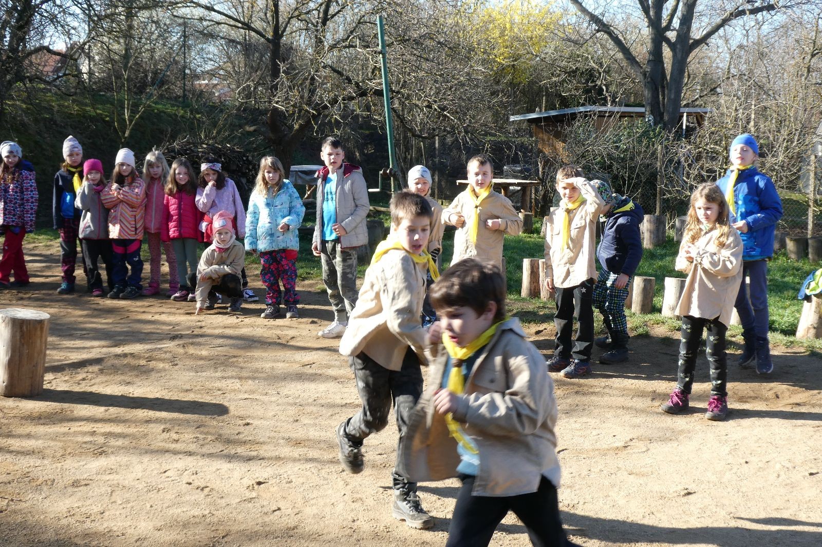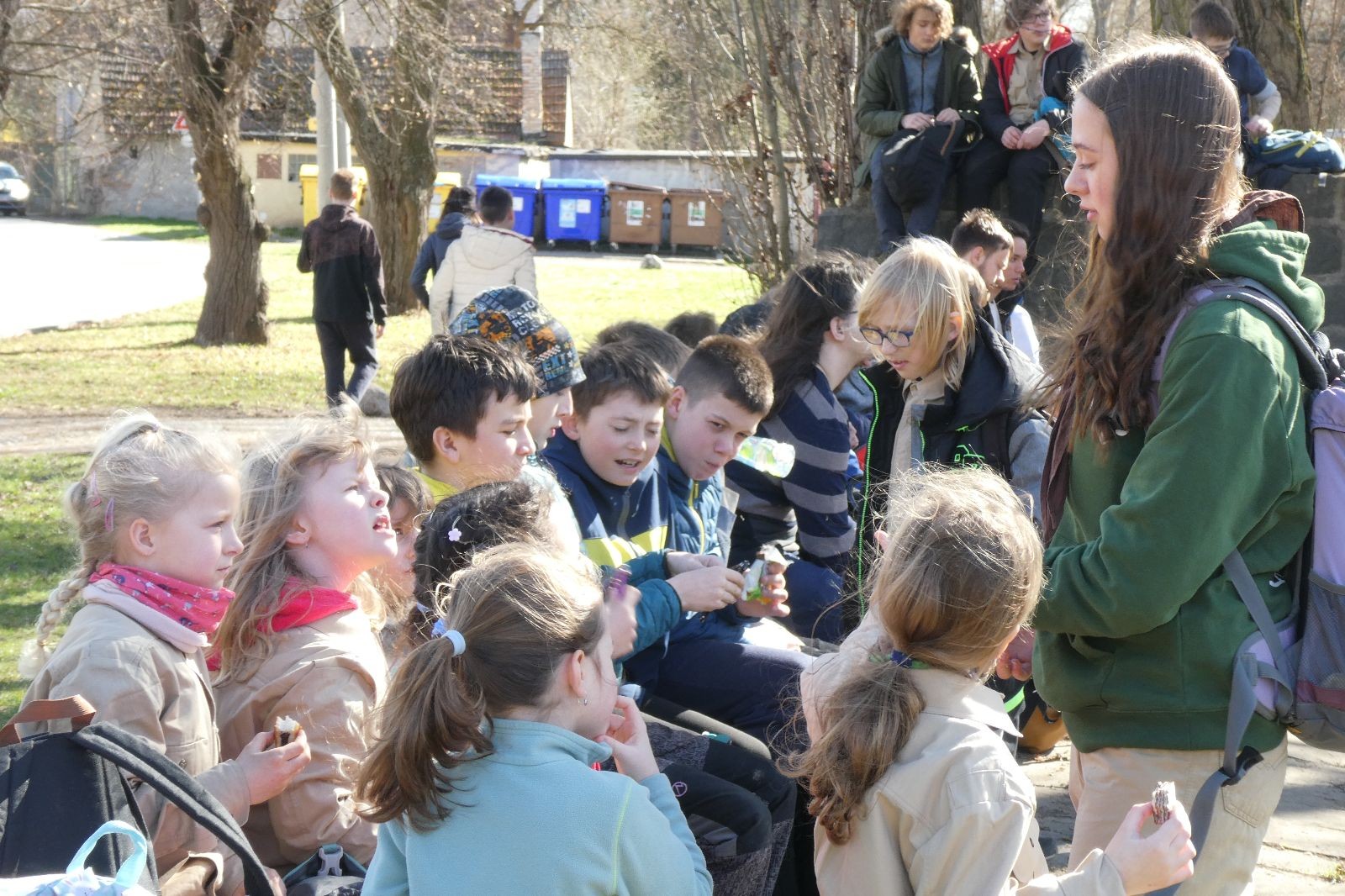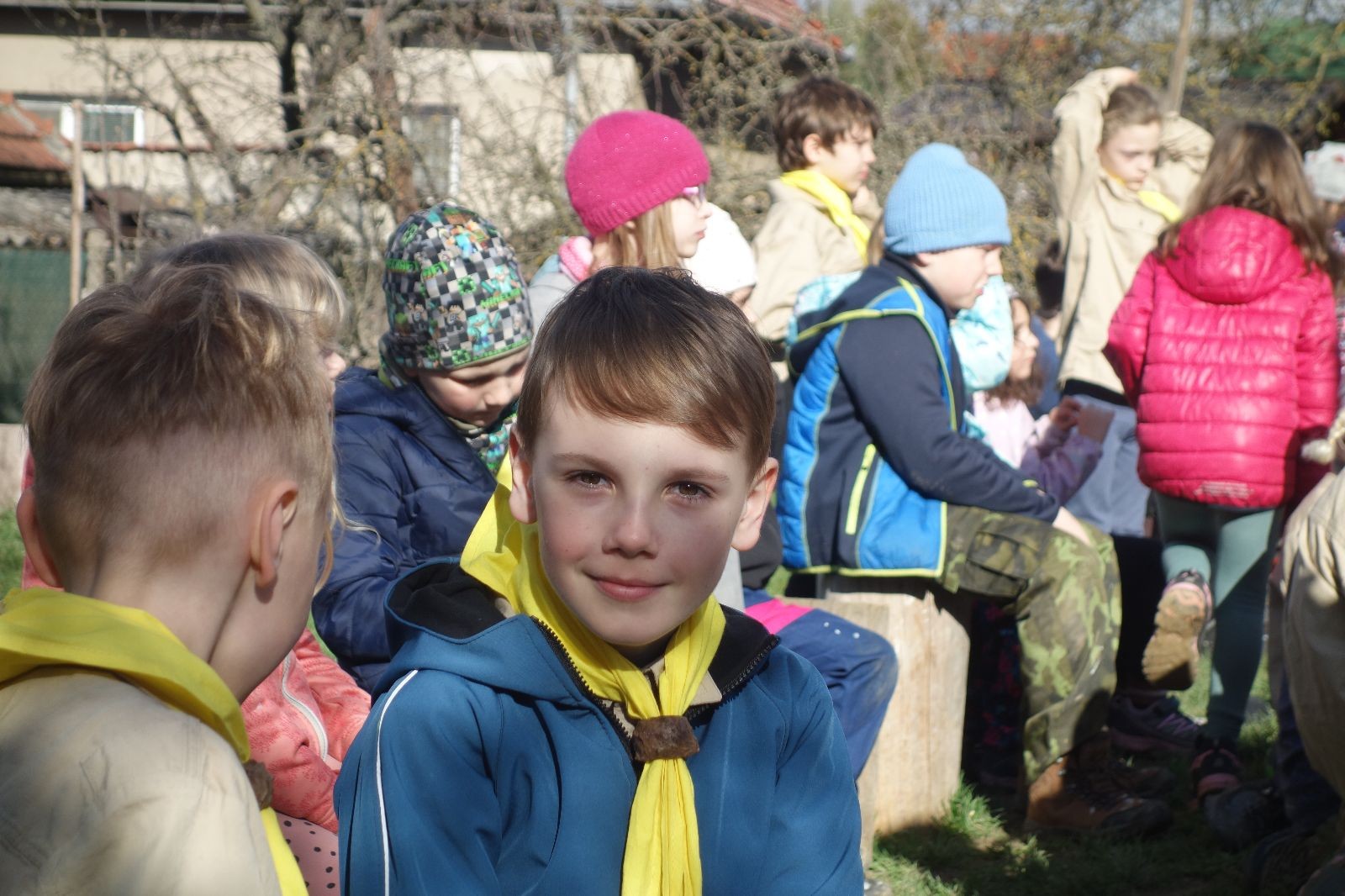 Scházíme se v sobotu ve 13:00 na Boudě. Renča a Betkou balí symboly pro slibaře, Filda bere oddílovou vlajku, Bert balí ovocné čočky, Ovečka lana, Terka s Kosťou svíčičky, Krysařík krepové fáborky… Všude se hemží mrňousci. Žraloci, Tučňáci a mladší se lokují dozadu, Kobři, Sovičky a starší dopředu. Ještě nezbytné společné foto před Trojkou a můžeme vyrazit. Poctivě zapisuju počty přítomných a i s dvojnásobným otcem Vítkem a Elektronkem je nás 94. Na první zastávce v Podolí svačíme a hraje se Hututu. A taky zalézá poprvé sluníčko, spouští se fujavice a prší. Naše řady doplňují Hihňa s Babů, je nás 96. U Vlajkované v Mariánským zase vychází sluníčko, přicházejí Hanz a Lost. 98 nás je. A Kobrák Ondra, takže 99. Bude letos stovka?