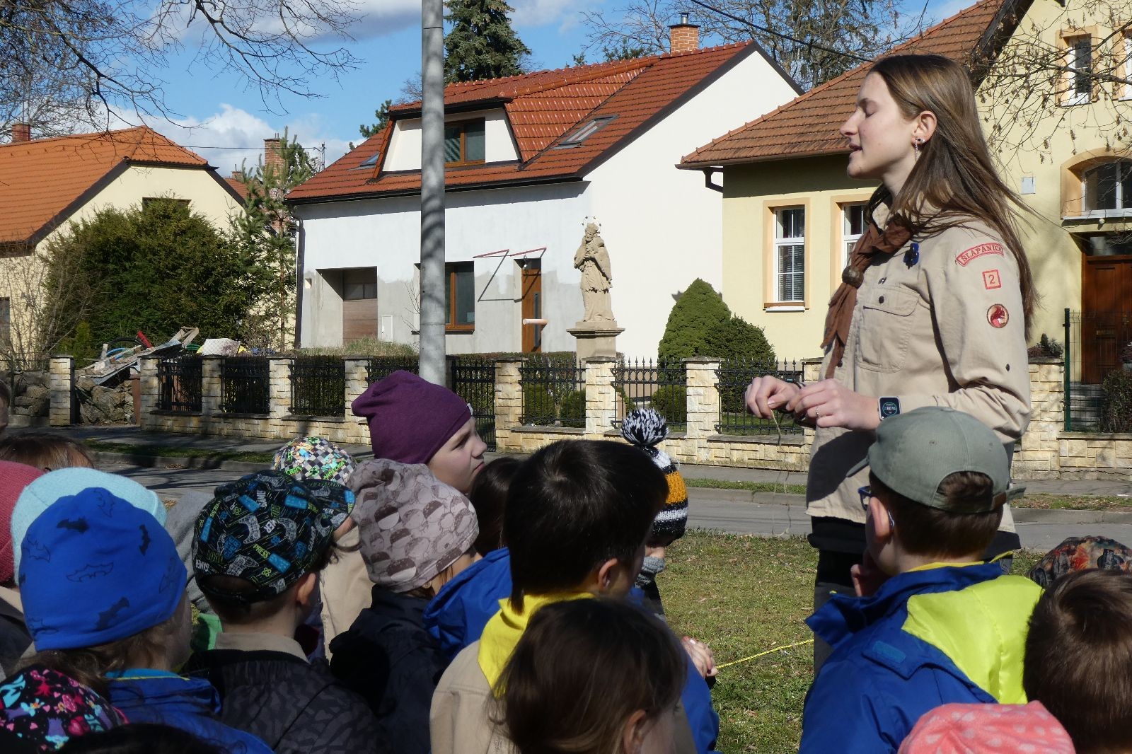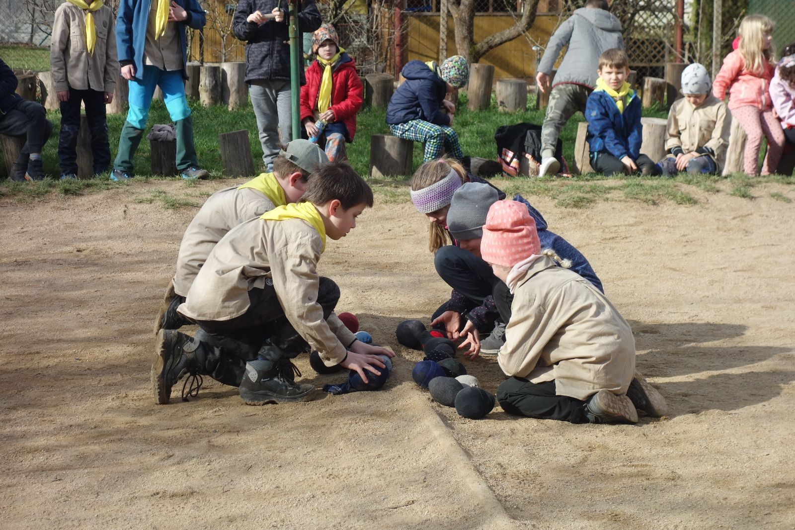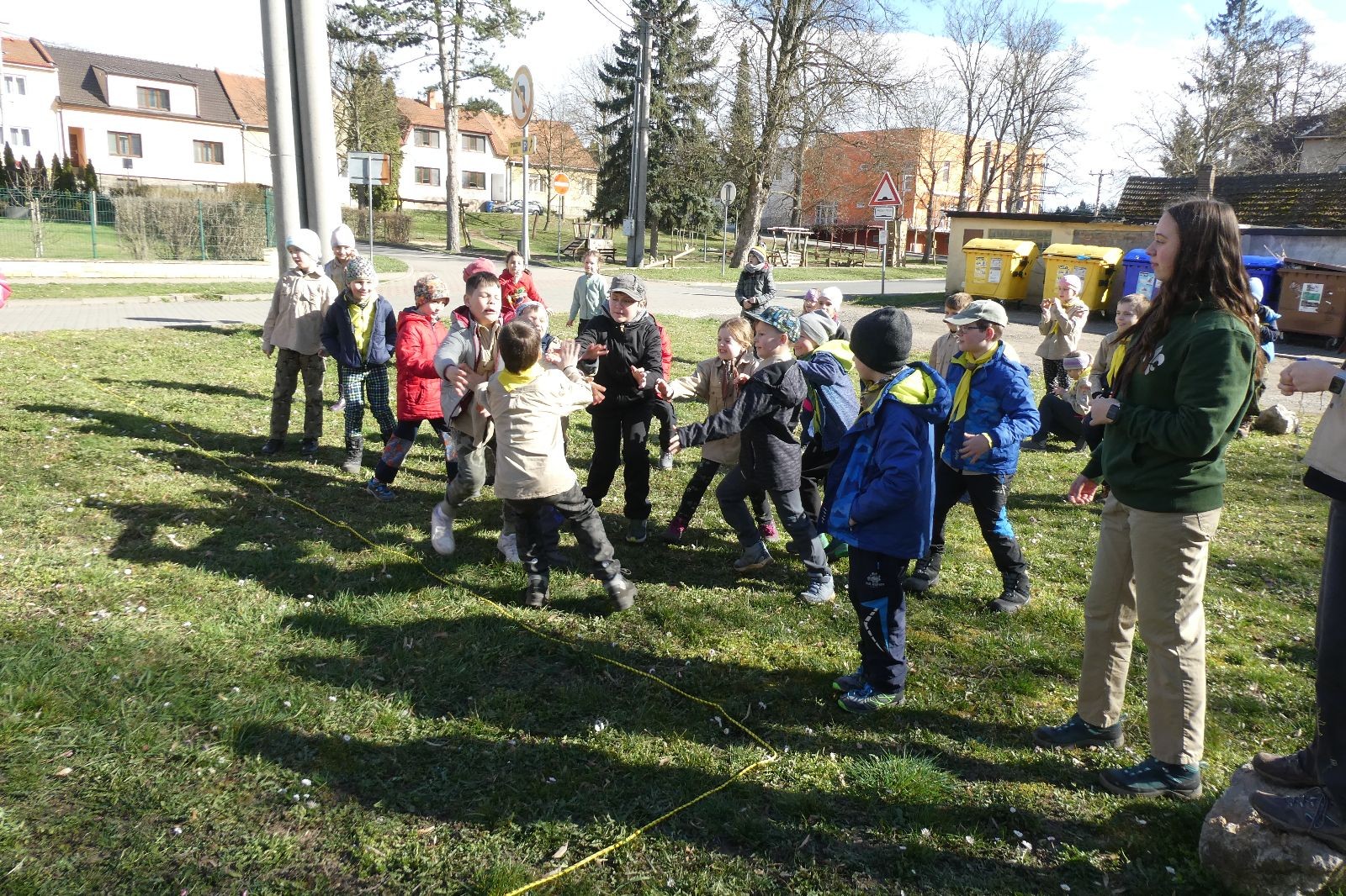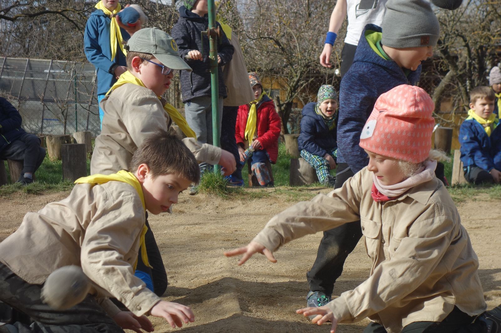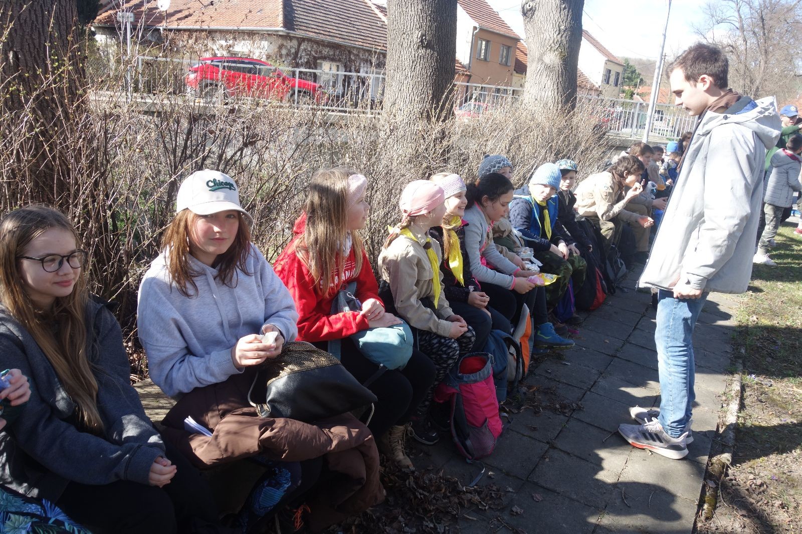 Scházíme se v sobotu ve 13:00 na Boudě. Renča a Betkou balí symboly pro slibaře, Filda bere oddílovou vlajku, Bert balí ovocné čočky, Ovečka lana, Terka s Kosťou svíčičky, Krysařík krepové fáborky… Všude se hemží mrňousci. Žraloci, Tučňáci a mladší se lokují dozadu, Kobři, Sovičky a starší dopředu. Ještě nezbytné společné foto před Trojkou a můžeme vyrazit. Poctivě zapisuju počty přítomných a i s dvojnásobným otcem Vítkem a Elektronkem je nás 94. Na první zastávce v Podolí svačíme a hraje se Hututu. A taky zalézá poprvé sluníčko, spouští se fujavice a prší. Naše řady doplňují Hihňa s Babů, je nás 96. U Vlajkované v Mariánským zase vychází sluníčko, přicházejí Hanz a Lost. 98 nás je. A Kobrák Ondra, takže 99. Bude letos stovka?