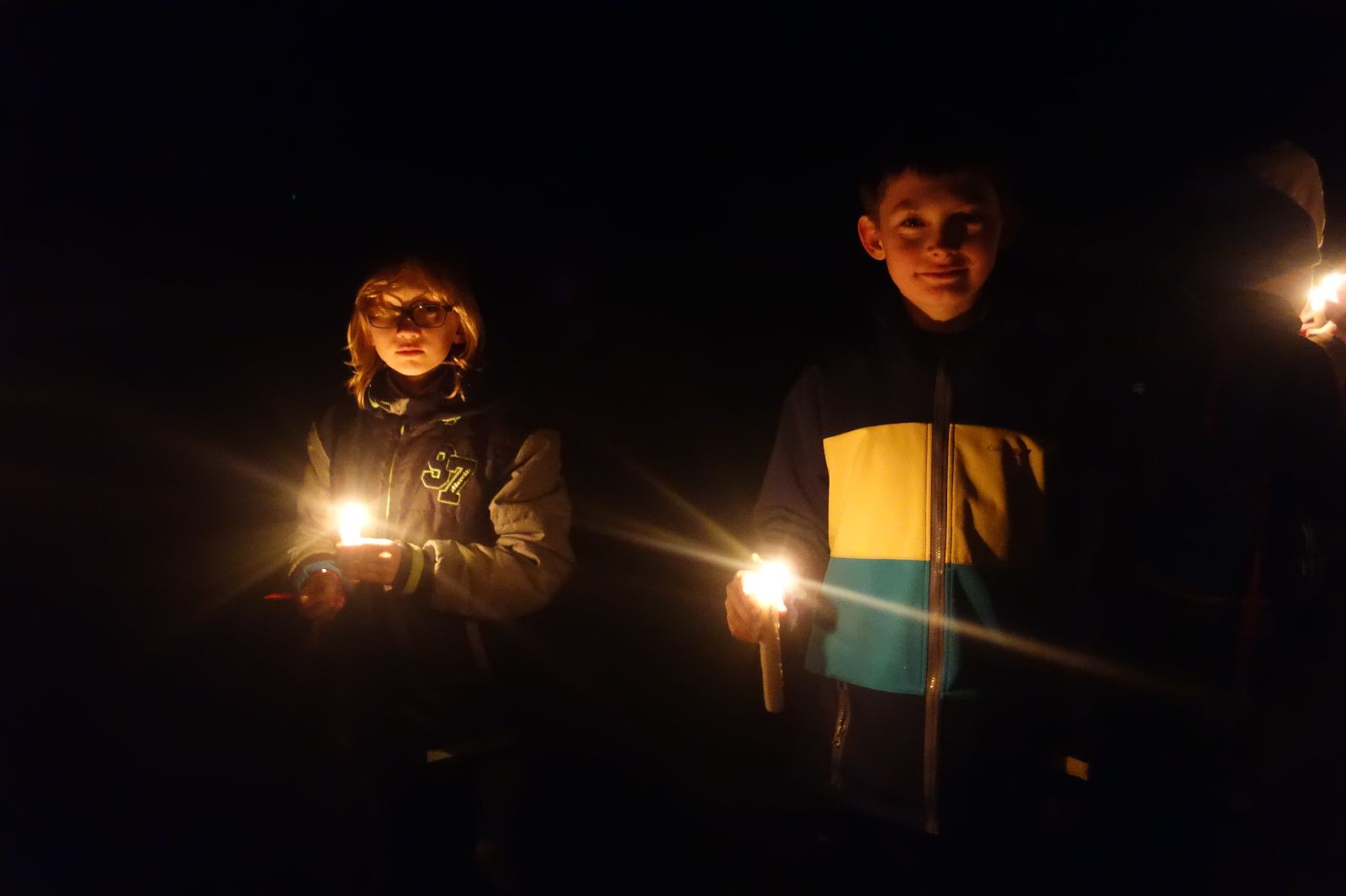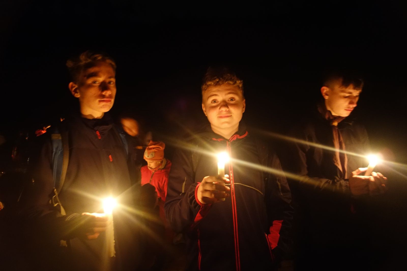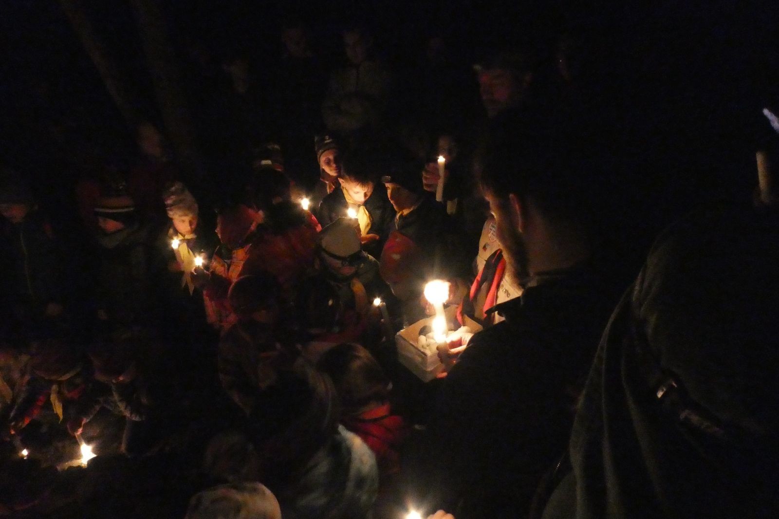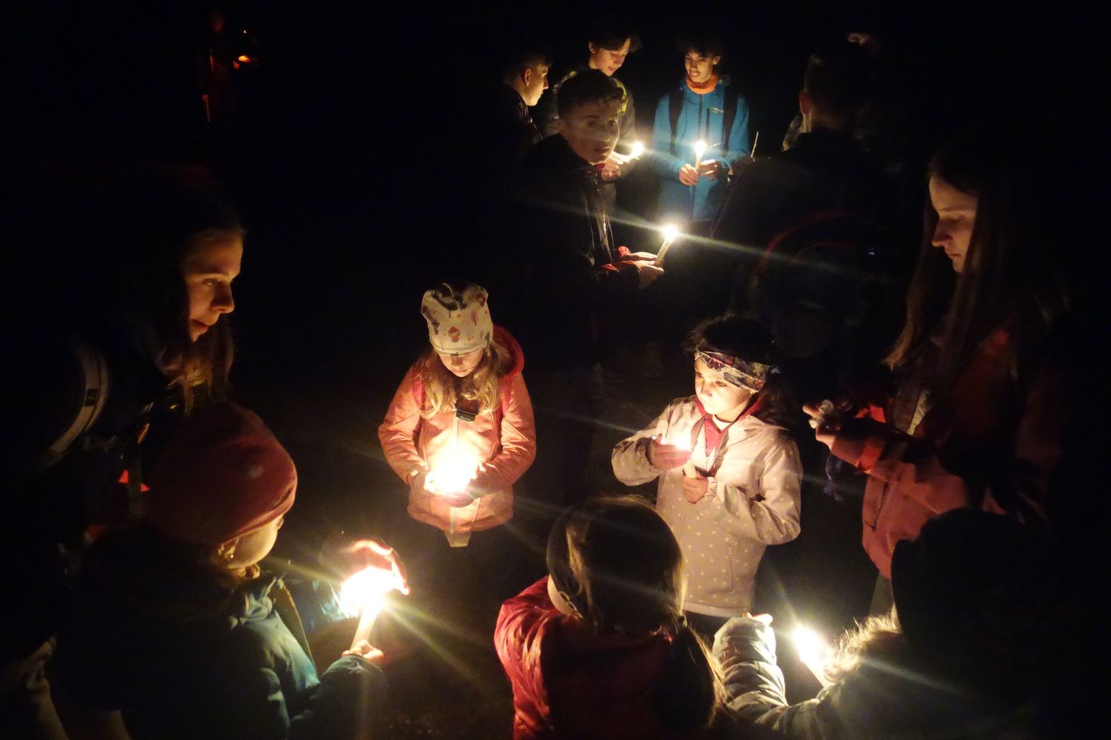 Scházíme se v sobotu ve 13:00 na Boudě. Renča a Betkou balí symboly pro slibaře, Filda bere oddílovou vlajku, Bert balí ovocné čočky, Ovečka lana, Terka s Kosťou svíčičky, Krysařík krepové fáborky… Všude se hemží mrňousci. Žraloci, Tučňáci a mladší se lokují dozadu, Kobři, Sovičky a starší dopředu. Ještě nezbytné společné foto před Trojkou a můžeme vyrazit. Poctivě zapisuju počty přítomných a i s dvojnásobným otcem Vítkem a Elektronkem je nás 94. Na první zastávce v Podolí svačíme a hraje se Hututu. A taky zalézá poprvé sluníčko, spouští se fujavice a prší. Naše řady doplňují Hihňa s Babů, je nás 96. U Vlajkované v Mariánským zase vychází sluníčko, přicházejí Hanz a Lost. 98 nás je. A Kobrák Ondra, takže 99. Bude letos stovka?