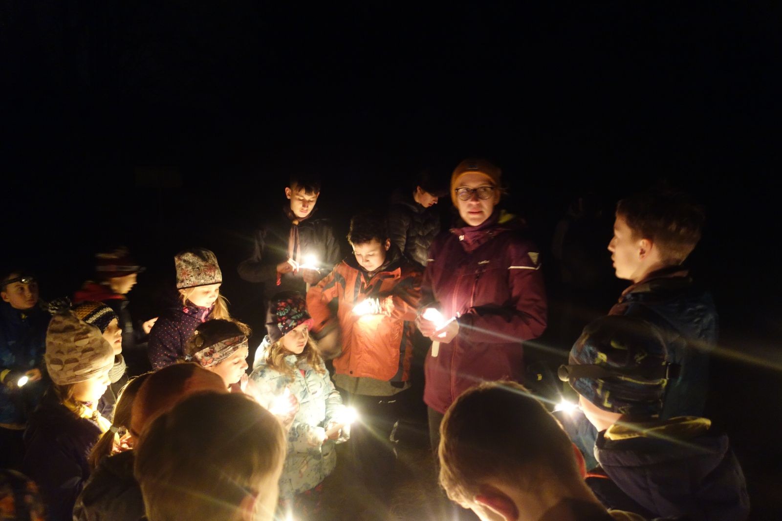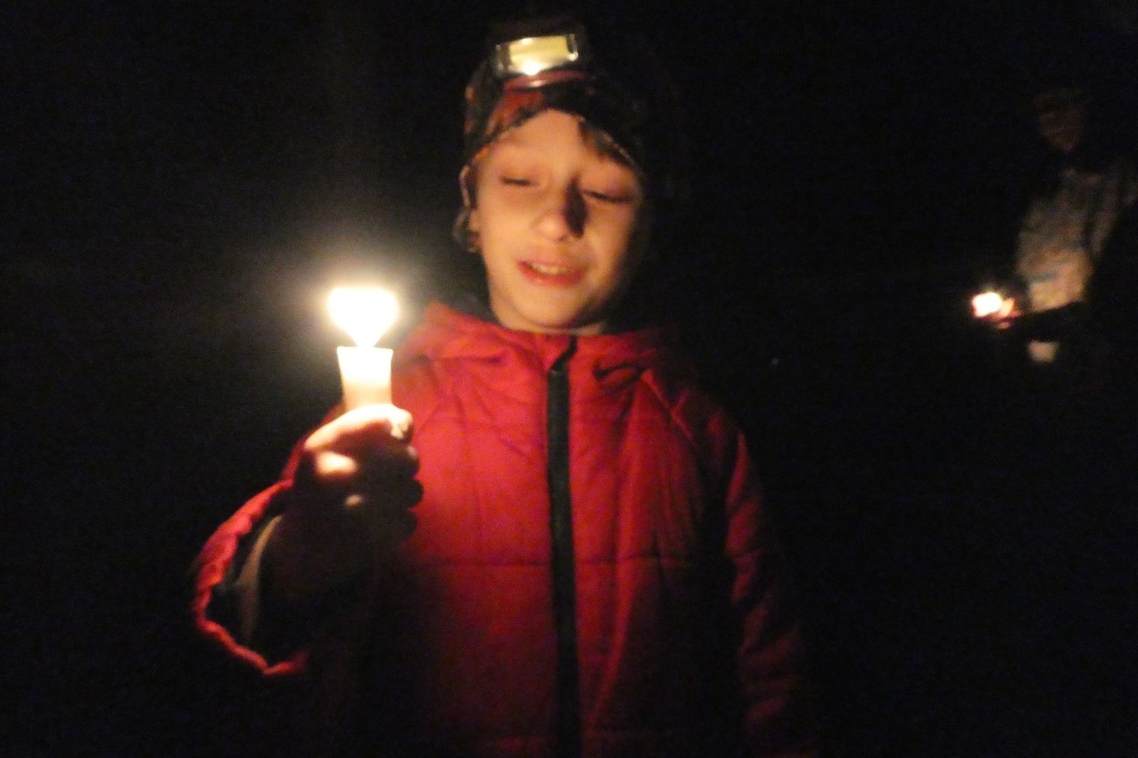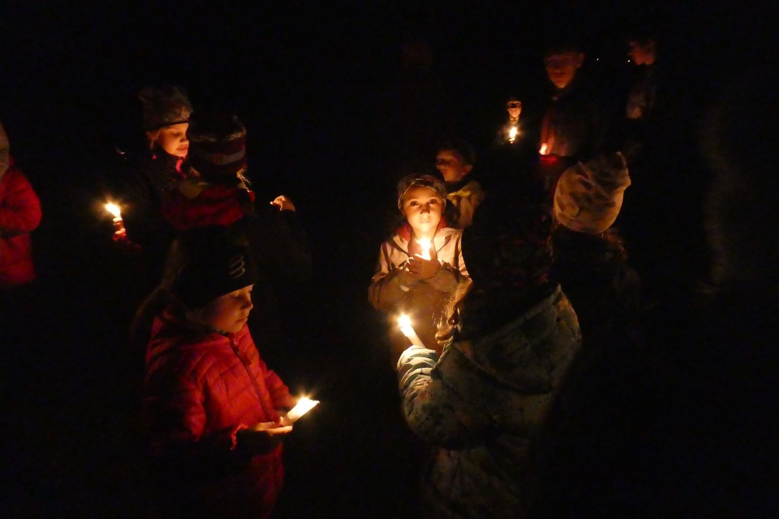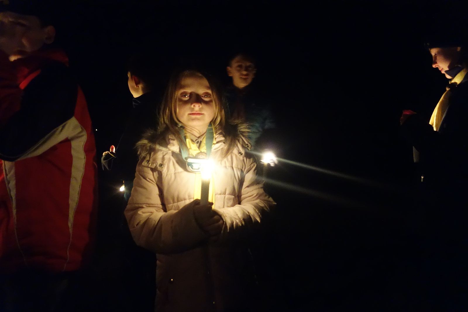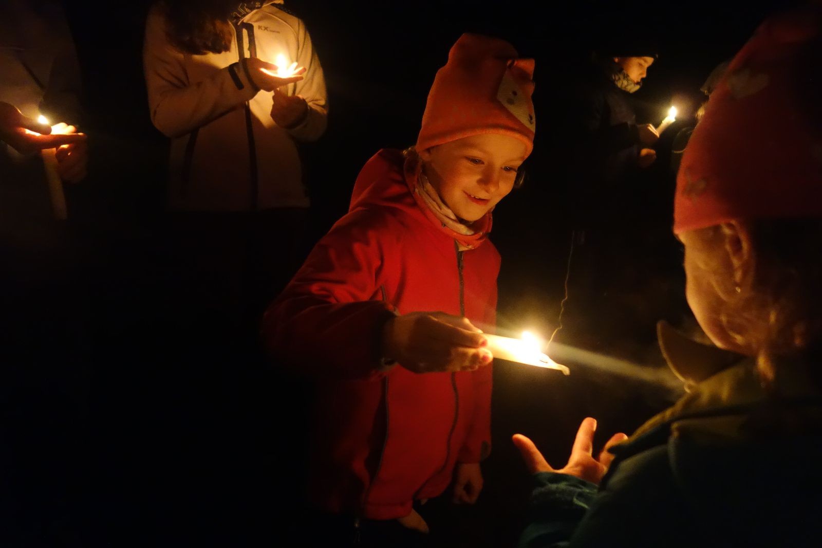 Scházíme se v sobotu ve 13:00 na Boudě. Renča a Betkou balí symboly pro slibaře, Filda bere oddílovou vlajku, Bert balí ovocné čočky, Ovečka lana, Terka s Kosťou svíčičky, Krysařík krepové fáborky… Všude se hemží mrňousci. Žraloci, Tučňáci a mladší se lokují dozadu, Kobři, Sovičky a starší dopředu. Ještě nezbytné společné foto před Trojkou a můžeme vyrazit. Poctivě zapisuju počty přítomných a i s dvojnásobným otcem Vítkem a Elektronkem je nás 94. Na první zastávce v Podolí svačíme a hraje se Hututu. A taky zalézá poprvé sluníčko, spouští se fujavice a prší. Naše řady doplňují Hihňa s Babů, je nás 96. U Vlajkované v Mariánským zase vychází sluníčko, přicházejí Hanz a Lost. 98 nás je. A Kobrák Ondra, takže 99. Bude letos stovka?