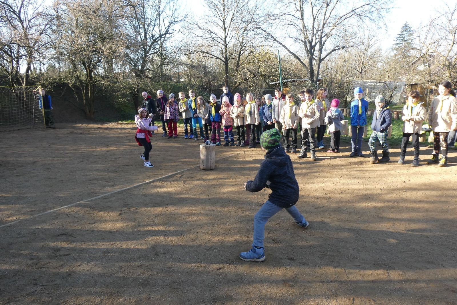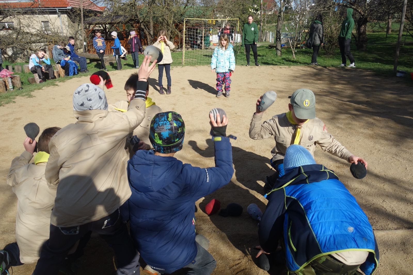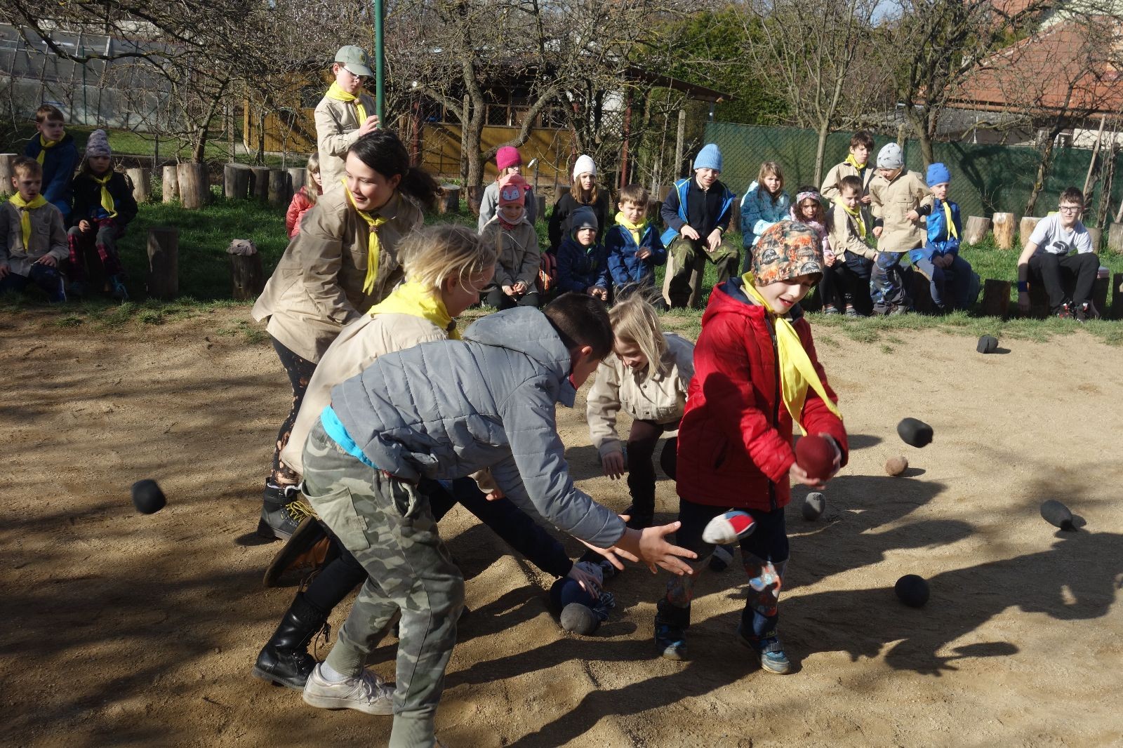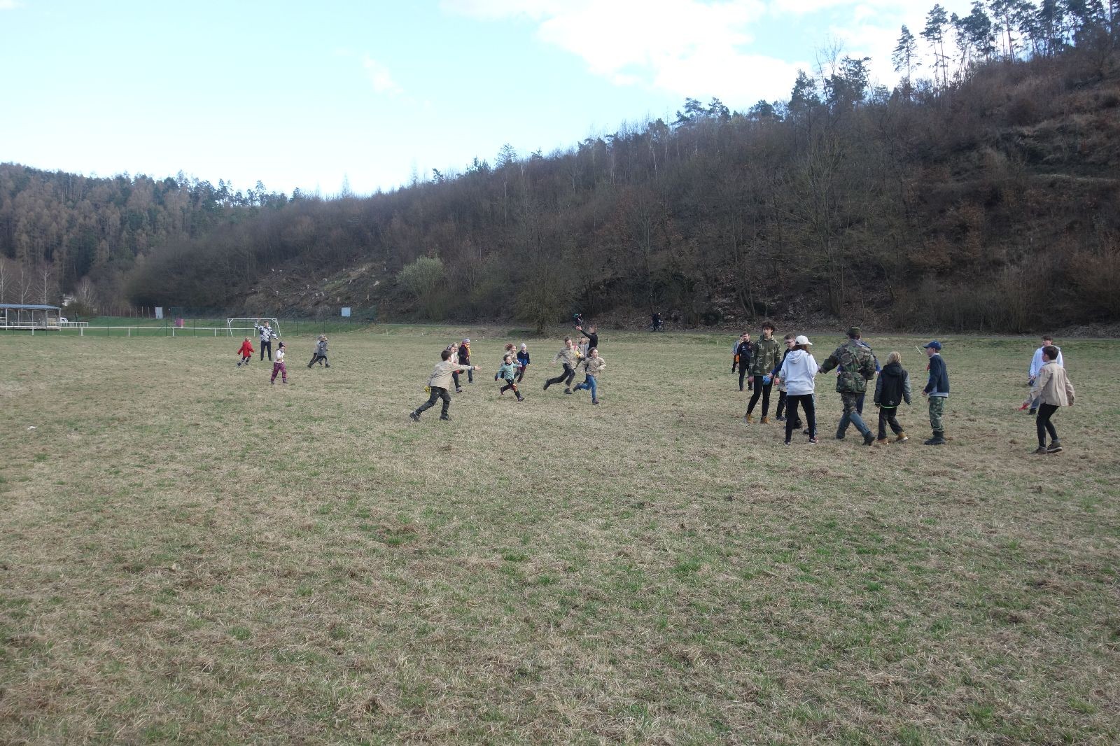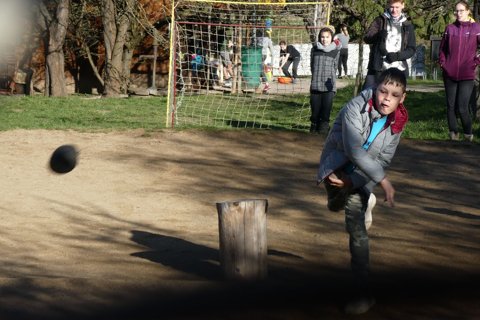 Následuje hra, kterou připravila a organizuje Kiki, po ní tradiční Bojovka. Na nástupu odměňujeme bojovníky ovocnými čočkami, všechny pak lipovými lístky na kroj. V 11:00 akce končí pro mladší, starší se ještě něco přes hodinku věnují úklidu. Myjí podlahy, okna, rovnají věci, vysávají, vynášejí a zase zanášejí nábytek.