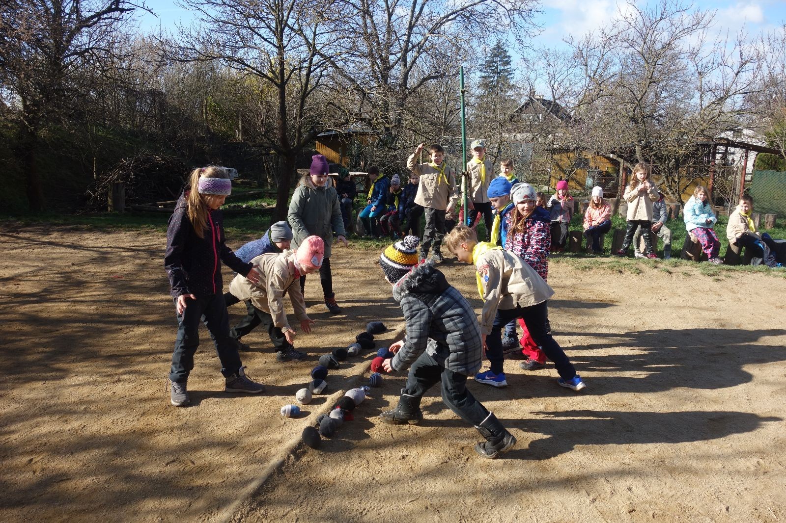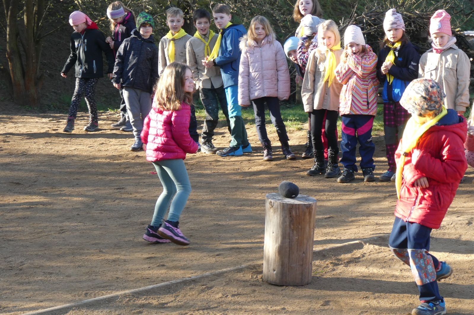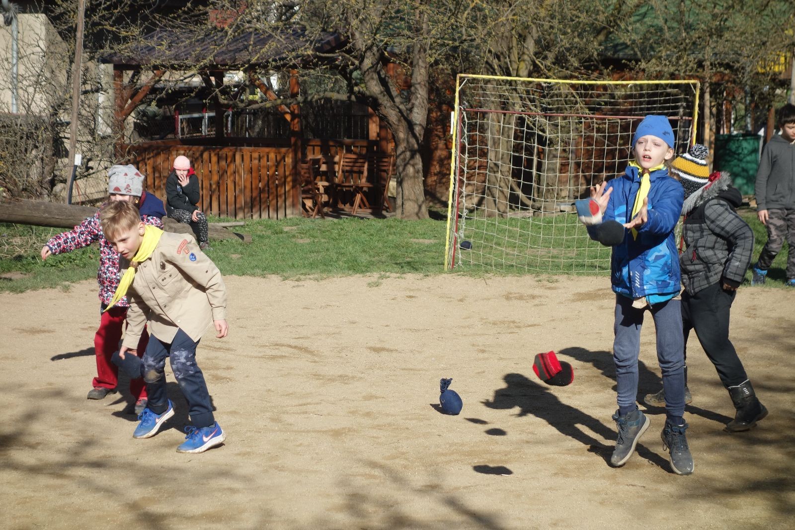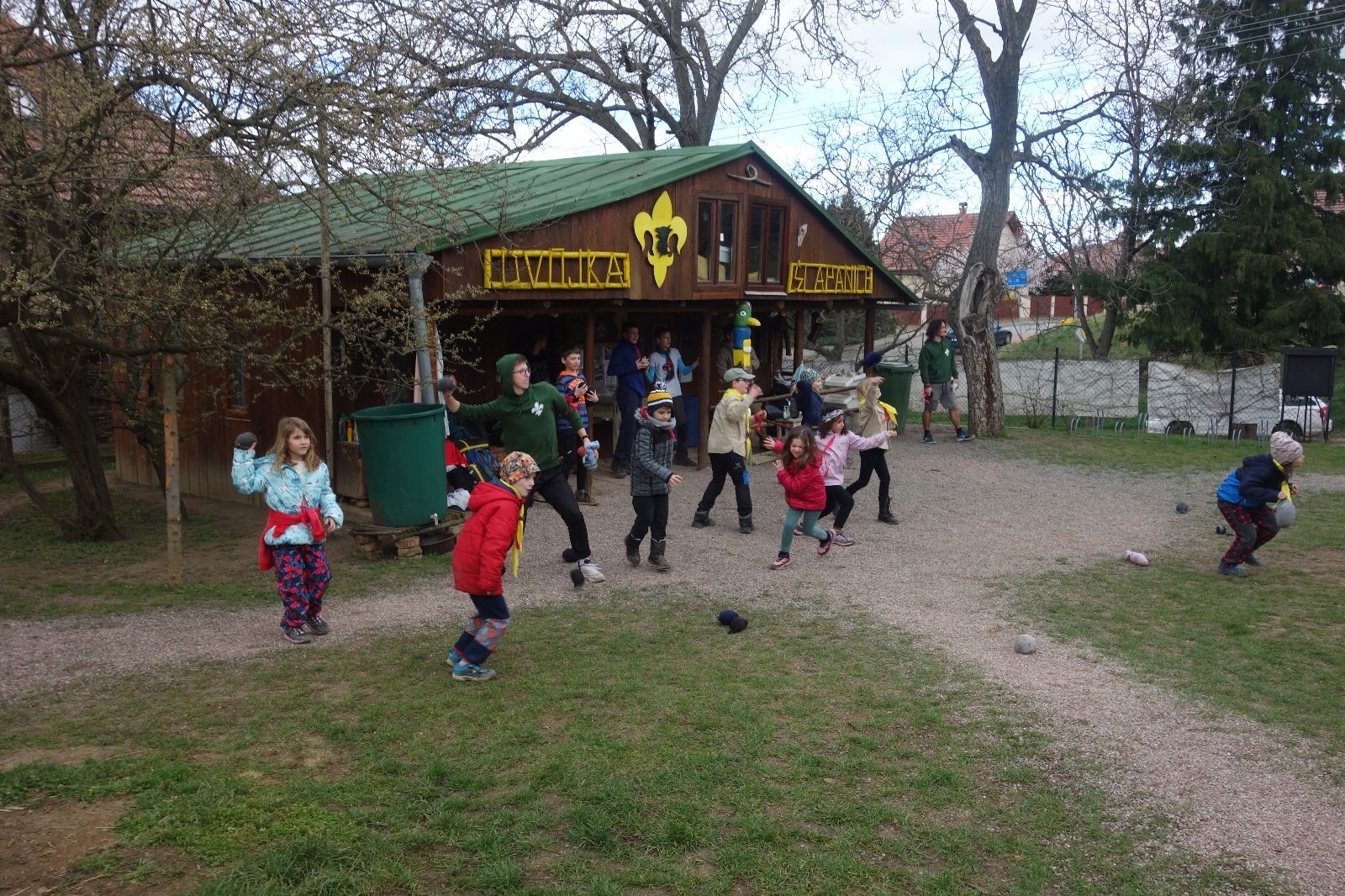 Následuje hra, kterou připravila a organizuje Kiki, po ní tradiční Bojovka. Na nástupu odměňujeme bojovníky ovocnými čočkami, všechny pak lipovými lístky na kroj. V 11:00 akce končí pro mladší, starší se ještě něco přes hodinku věnují úklidu. Myjí podlahy, okna, rovnají věci, vysávají, vynášejí a zase zanášejí nábytek.
