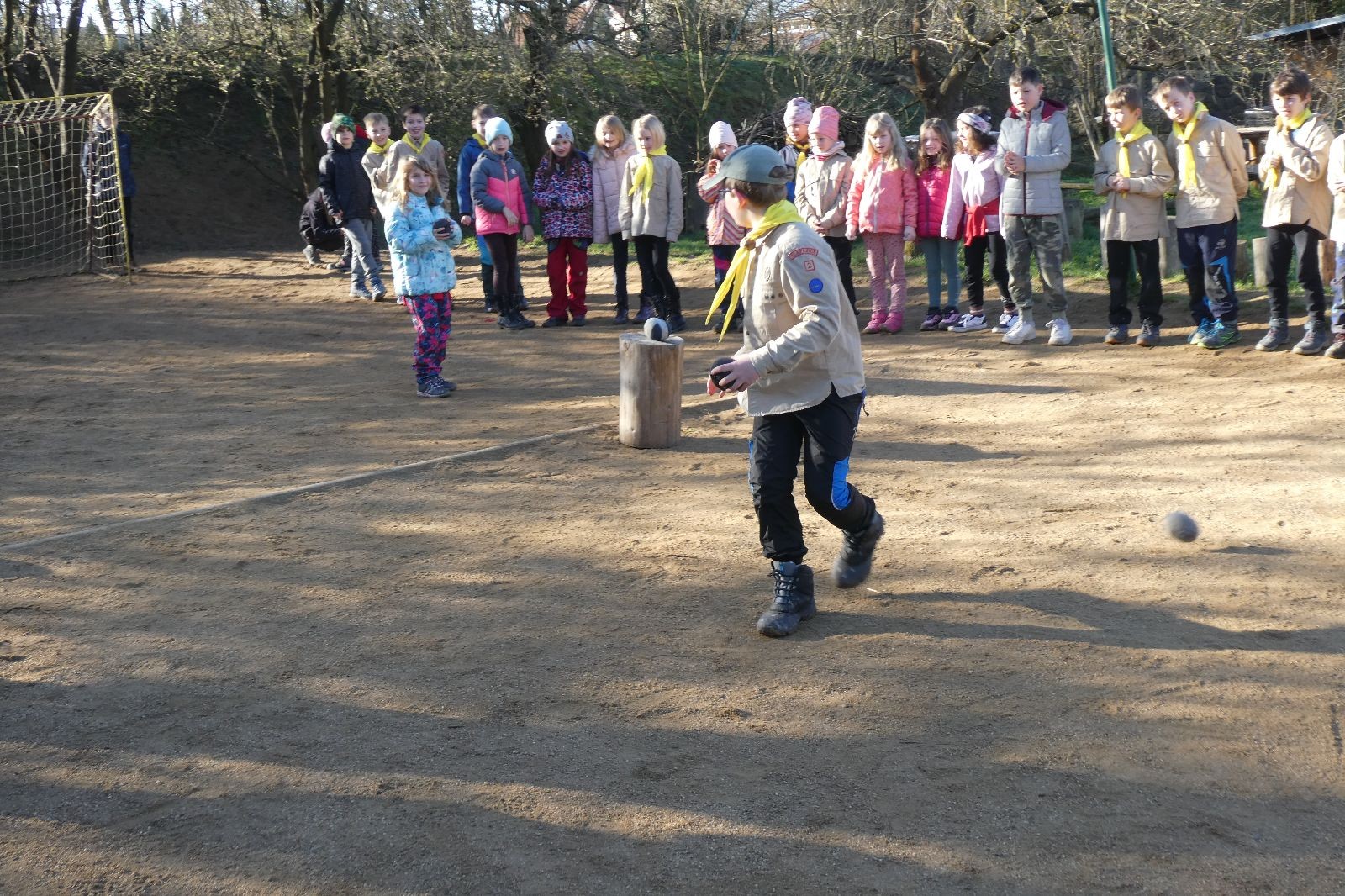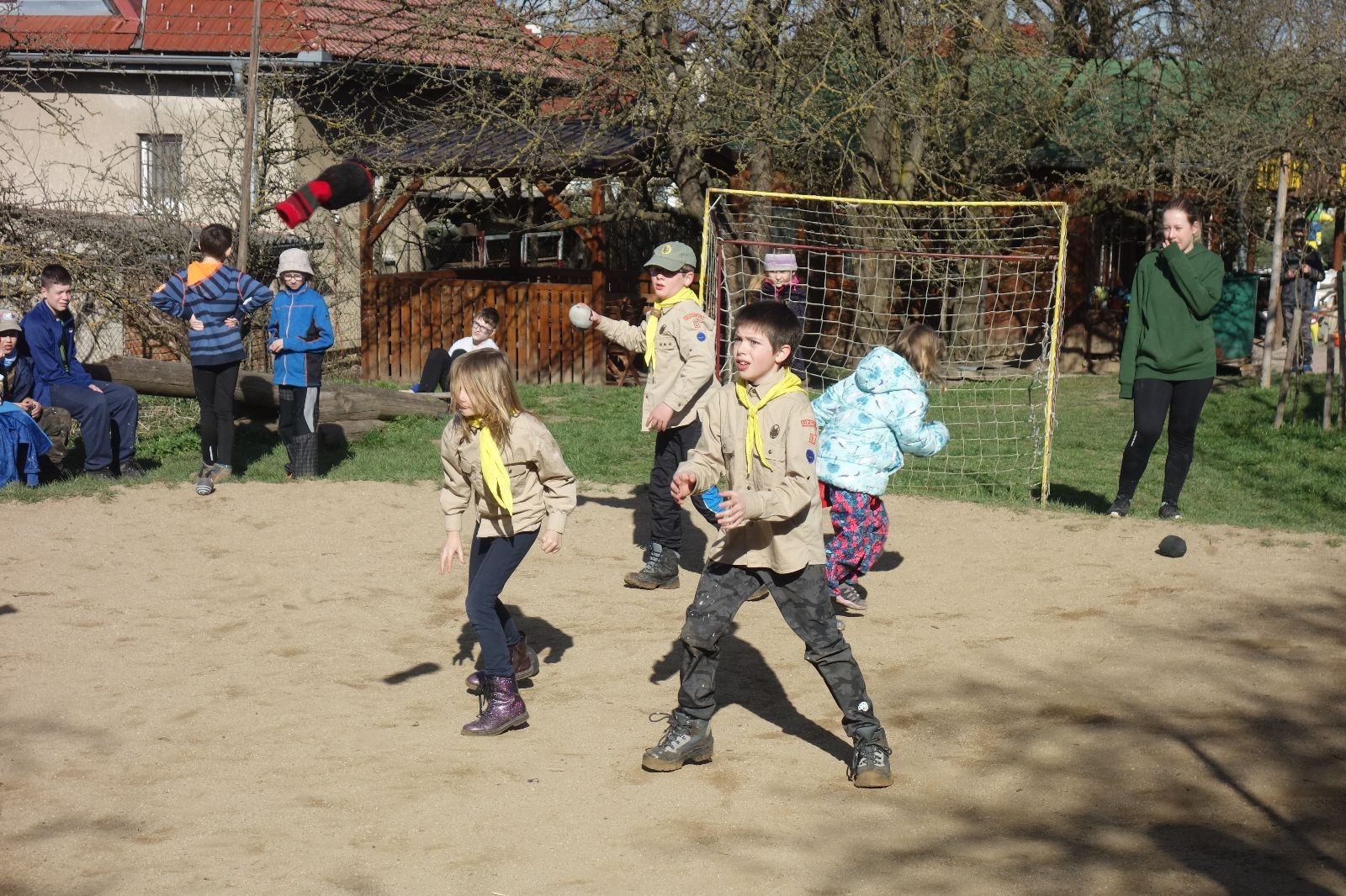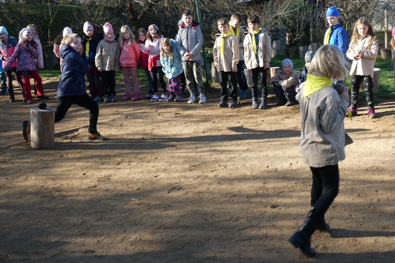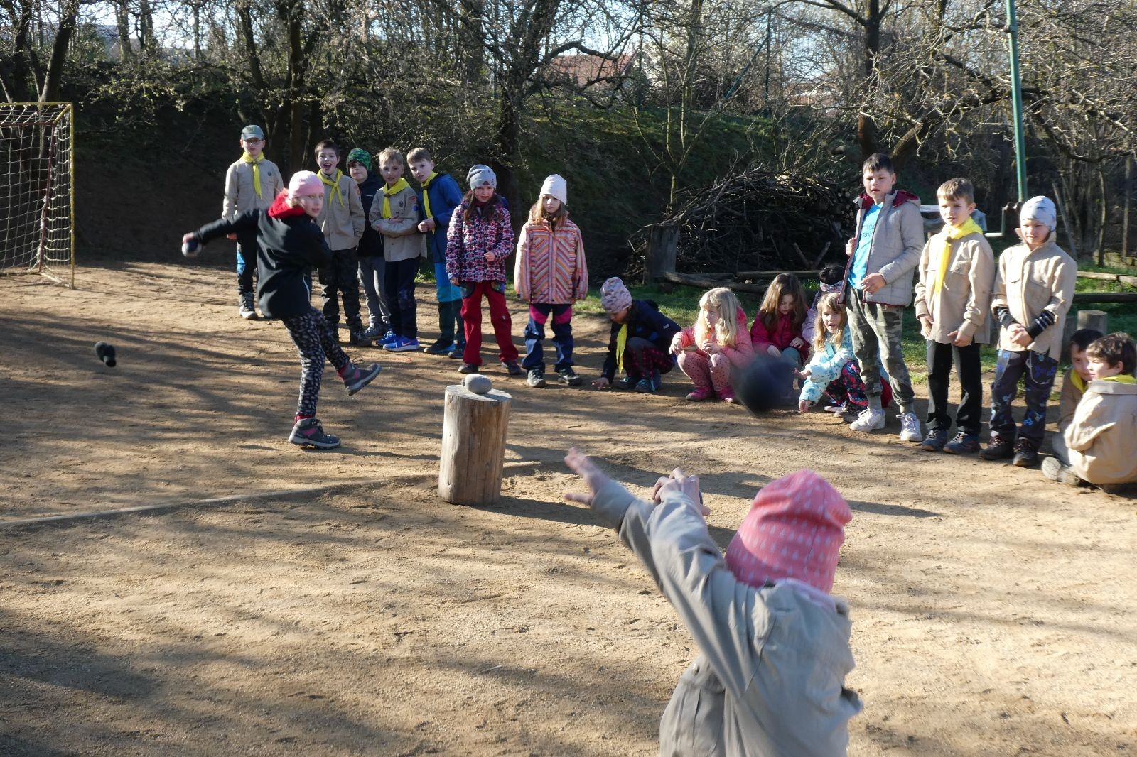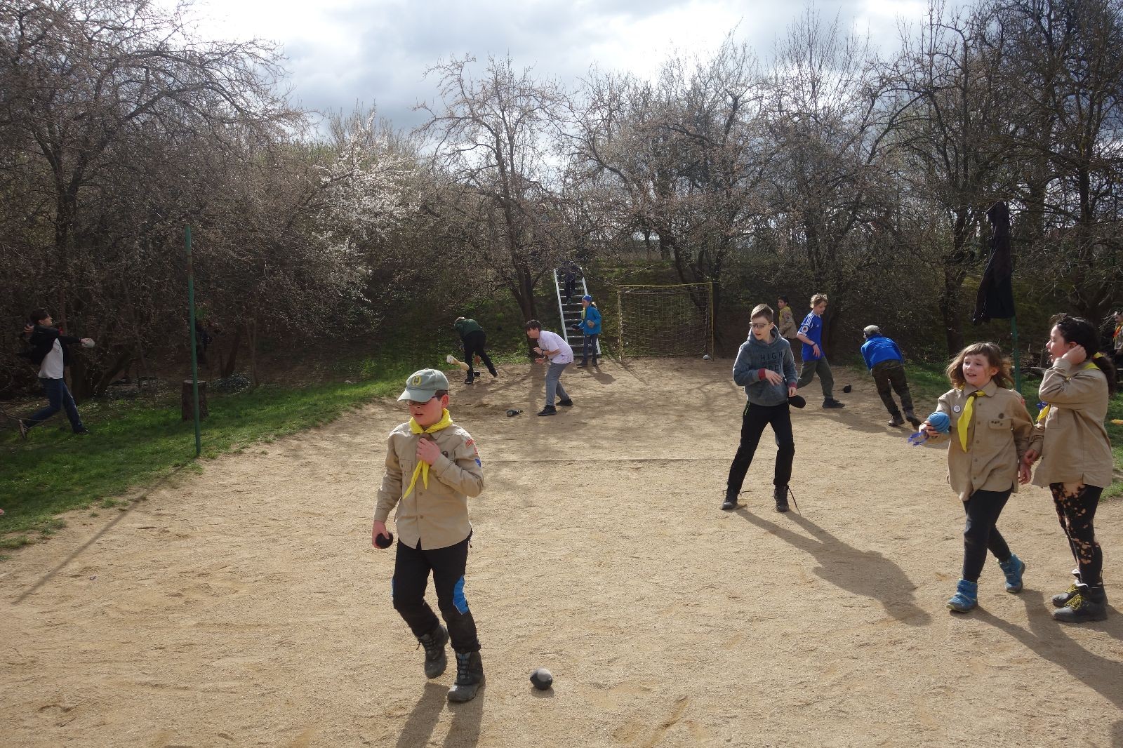 Následuje hra, kterou připravila a organizuje Kiki, po ní tradiční Bojovka. Na nástupu odměňujeme bojovníky ovocnými čočkami, všechny pak lipovými lístky na kroj. V 11:00 akce končí pro mladší, starší se ještě něco přes hodinku věnují úklidu. Myjí podlahy, okna, rovnají věci, vysávají, vynášejí a zase zanášejí nábytek.