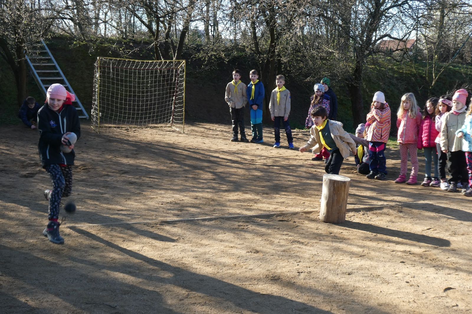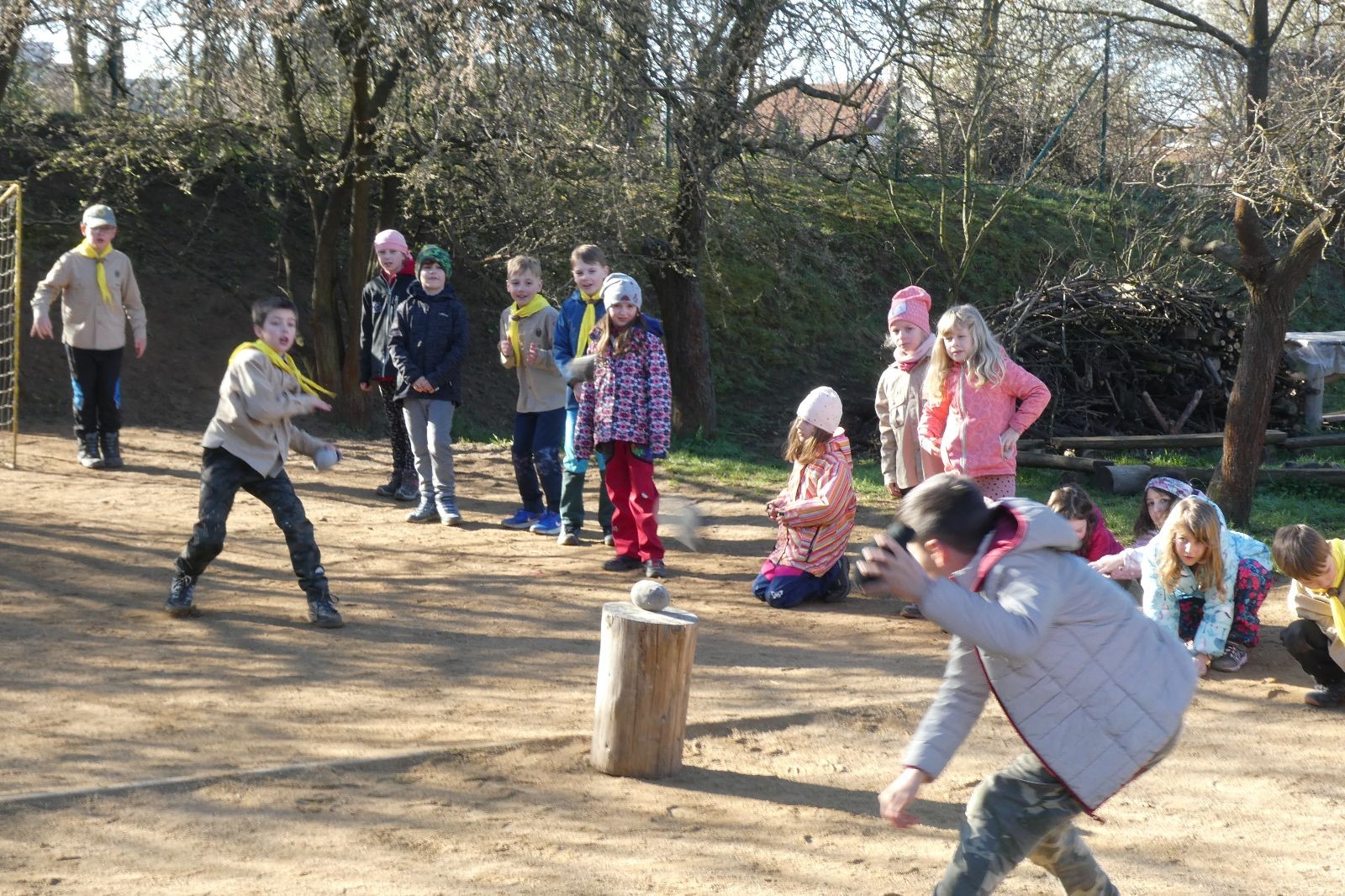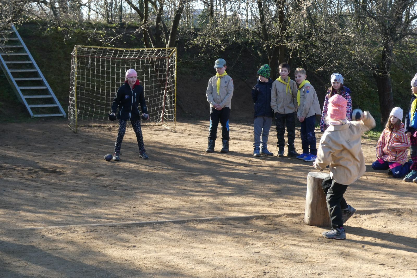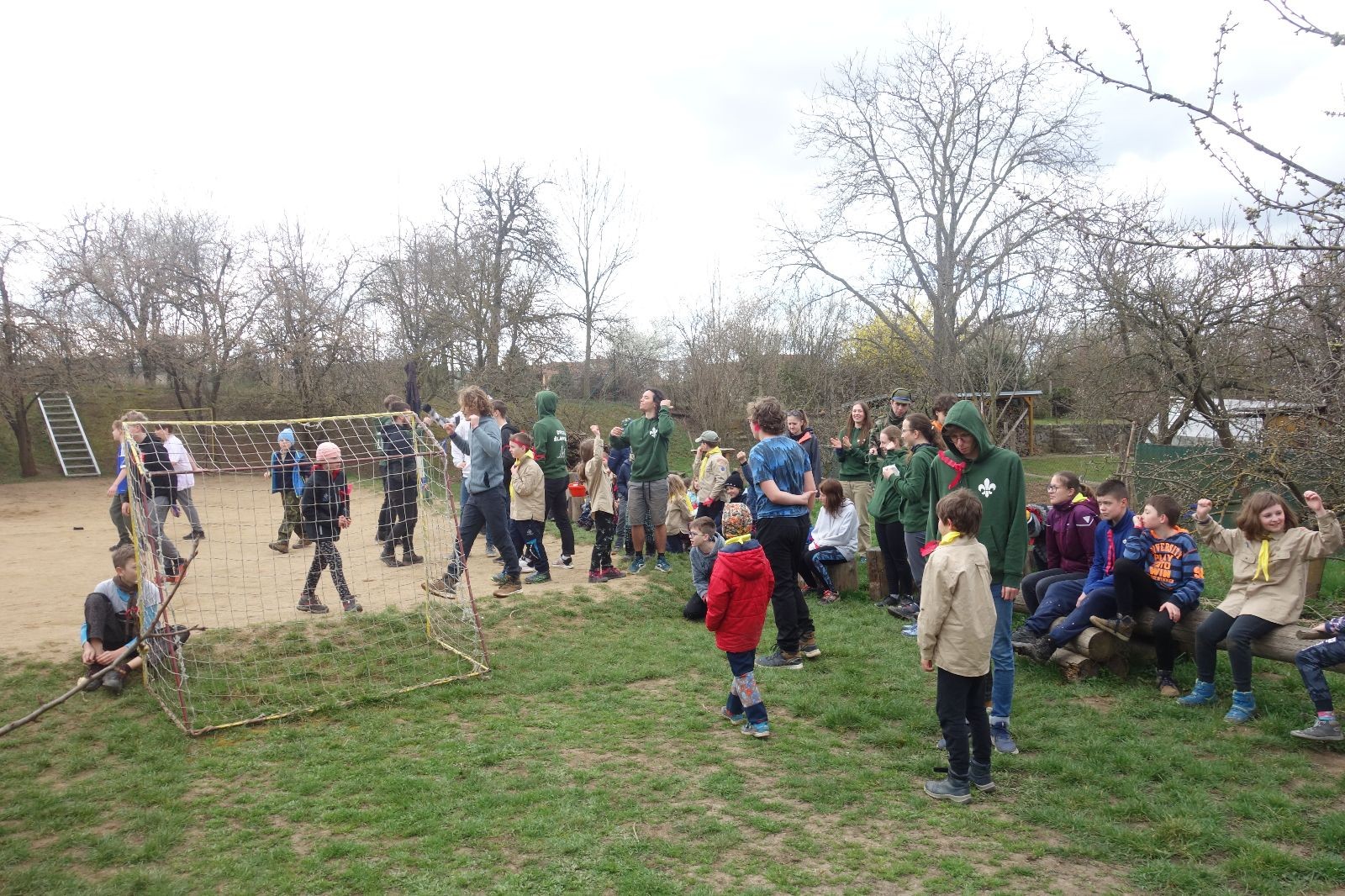 Následuje hra, kterou připravila a organizuje Kiki, po ní tradiční Bojovka. Na nástupu odměňujeme bojovníky ovocnými čočkami, všechny pak lipovými lístky na kroj. V 11:00 akce končí pro mladší, starší se ještě něco přes hodinku věnují úklidu. Myjí podlahy, okna, rovnají věci, vysávají, vynášejí a zase zanášejí nábytek.