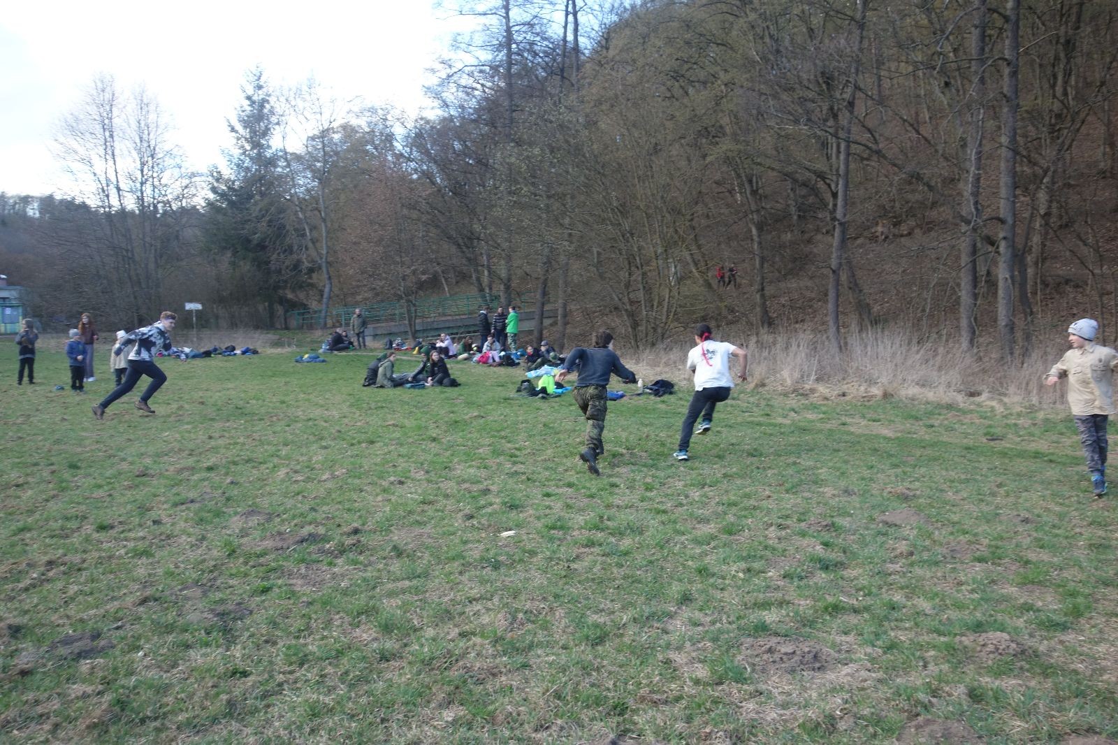 Na Horákovský hrad vyrážejí jako první Sršni a pár vedoucích, chystají oheň. Příroda nás opět rozmařile zkropí dešťovou přeháňkou, naštěstí netrvá dlouho. Každý další příchozí si pak nachází místo u ohně a hledá klacek na opékání. Dobrý nápad byl vyrazit už ve 13. Když jsme v minulosti vycházeli až ve 14, probíhalo veškeré chystání na hradě již za šera a za tmy. Takto je to mnohem víc v pohodě. A taky přichází Kuli s Kloubem. 100 a 101. Tak jsme tu stovku dali!