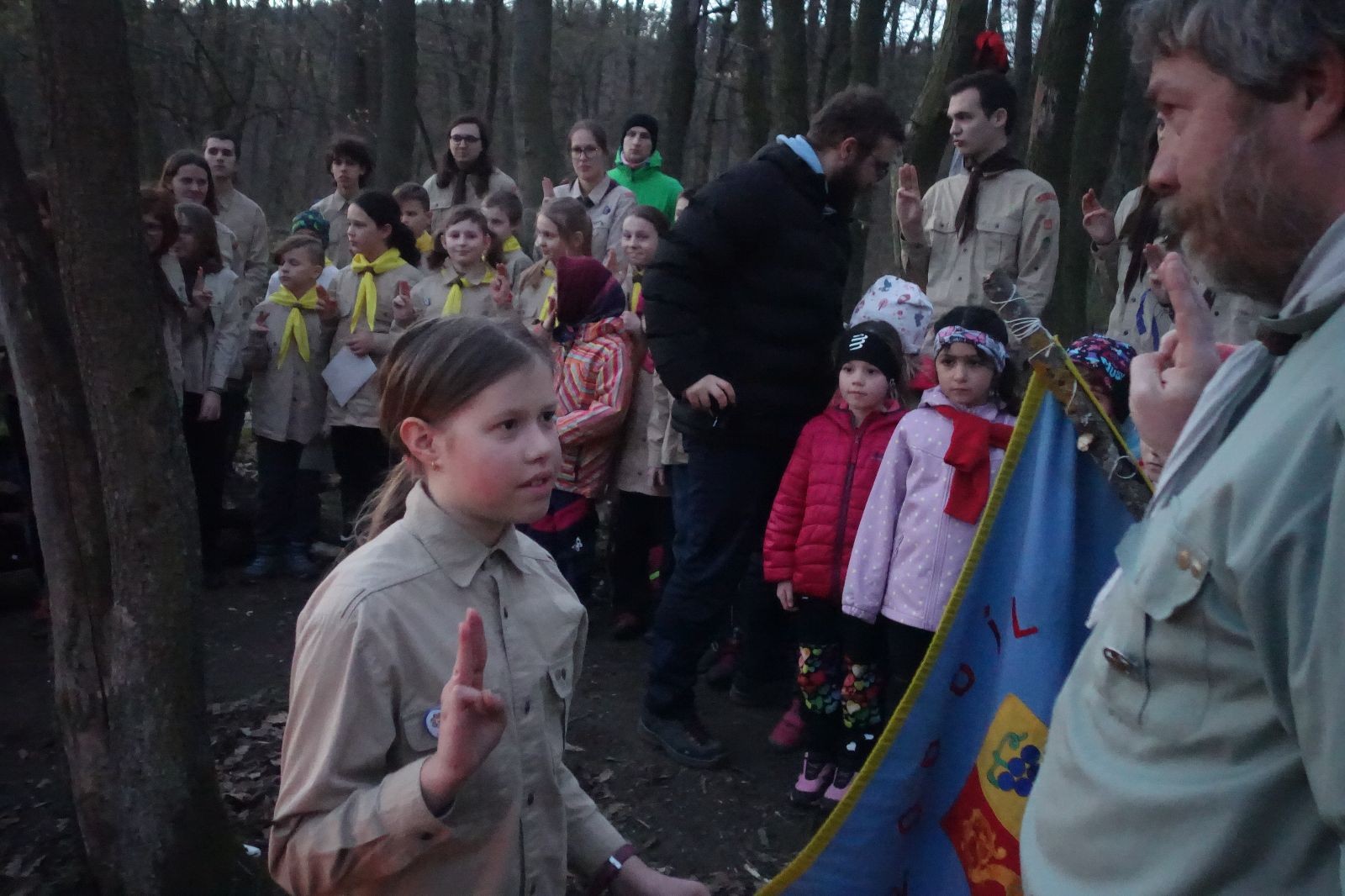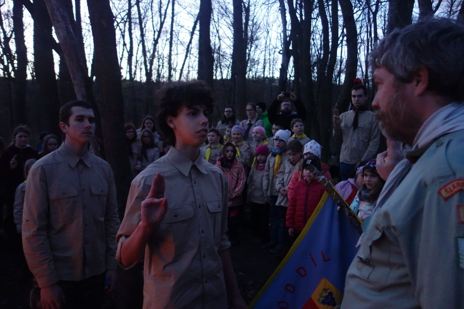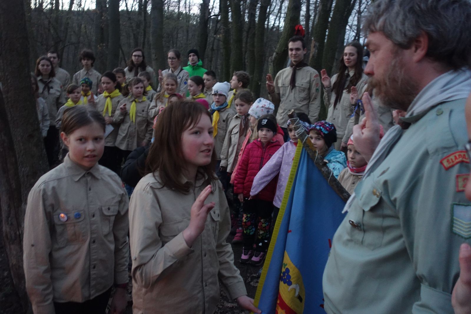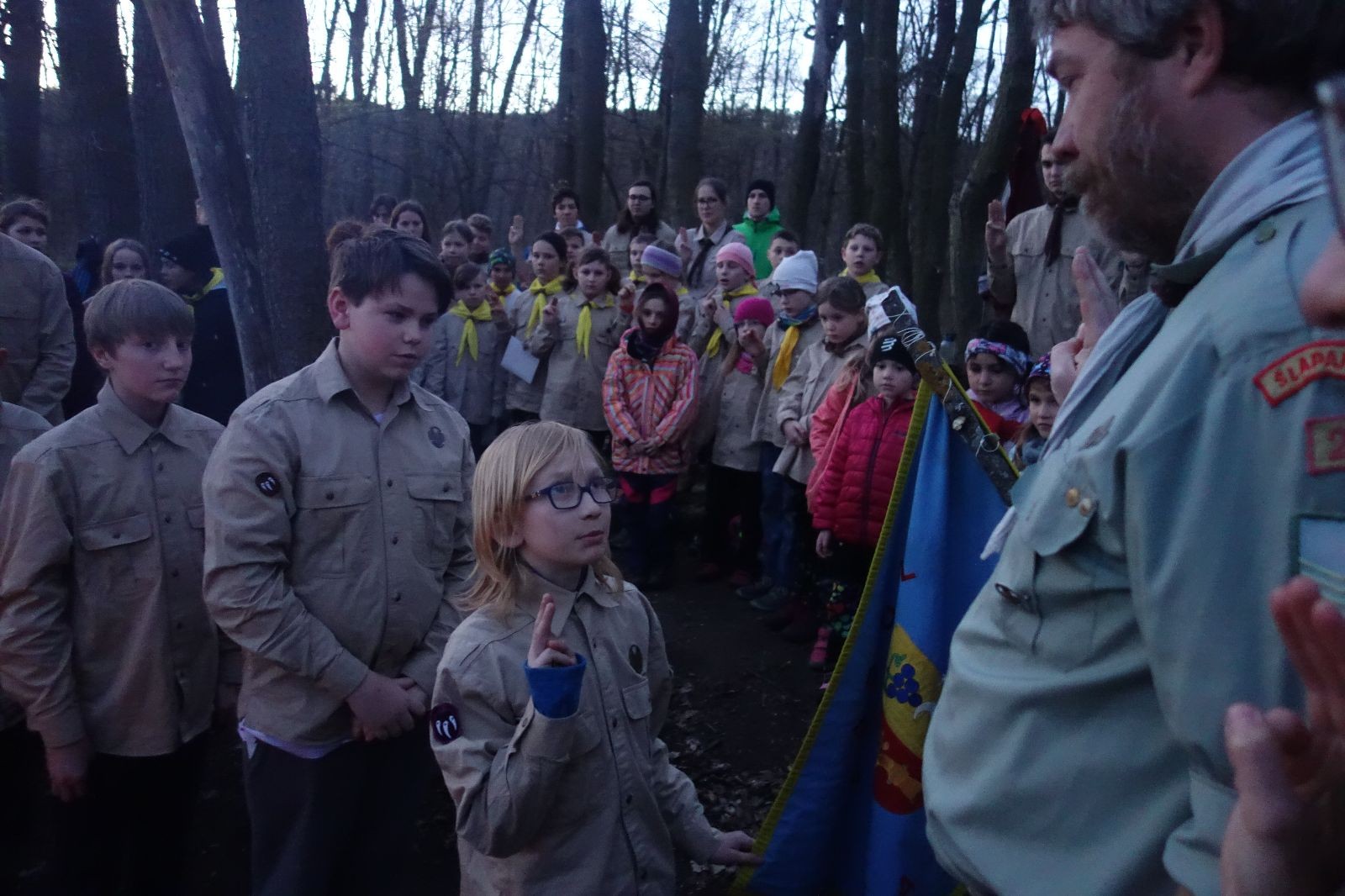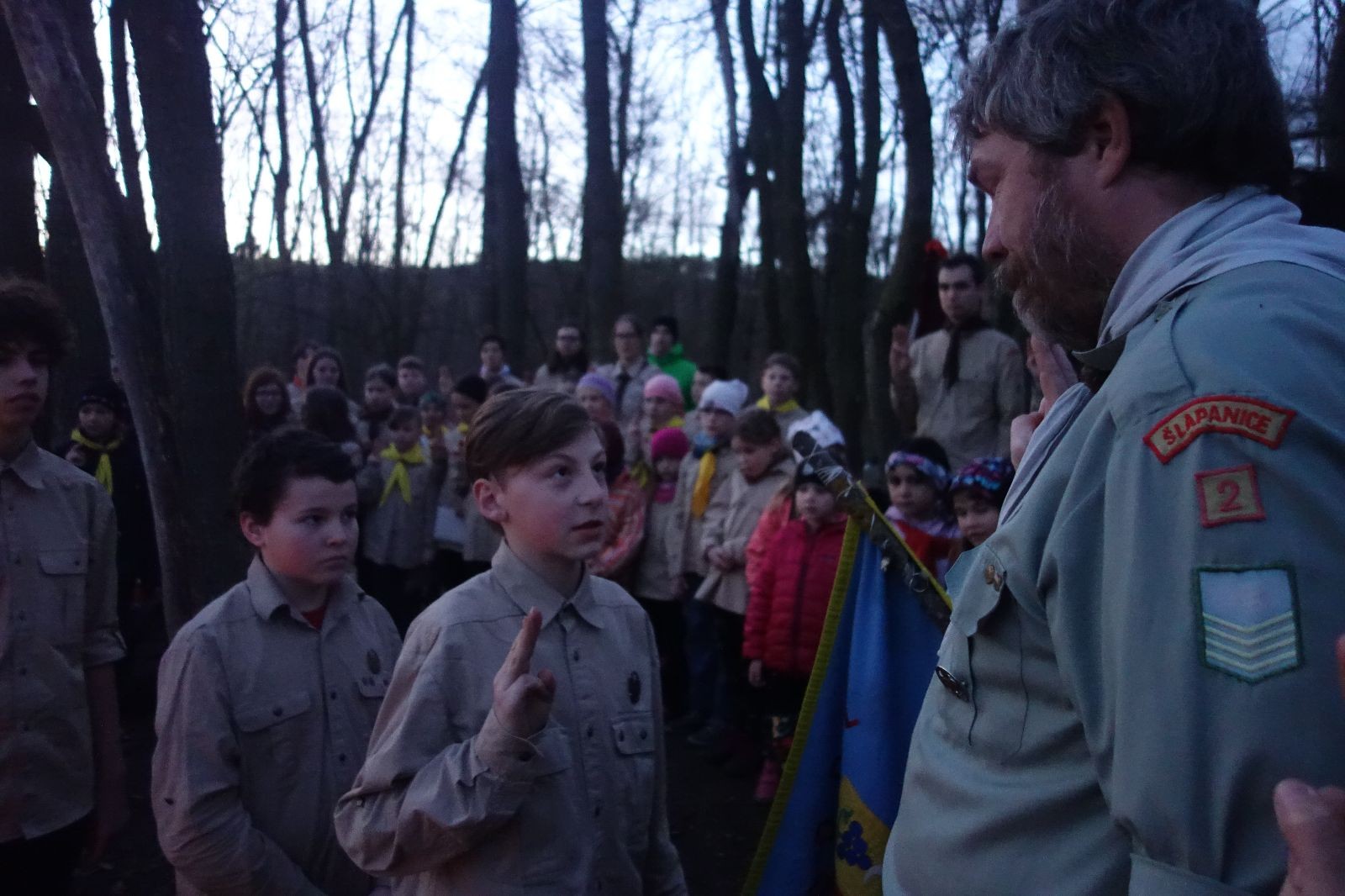 A na řadu přichází sliby. 10 světlušek, většina z Lasiček. Pak 8 vlčat, většina od Lachtanů. 4 skautky – 3 Sovičky a jedna Kudlanka. A skauti. Těch je 10 – 2 Vlci, 4 Sršni a 4 Kobři. Celkem 32 lidiček.