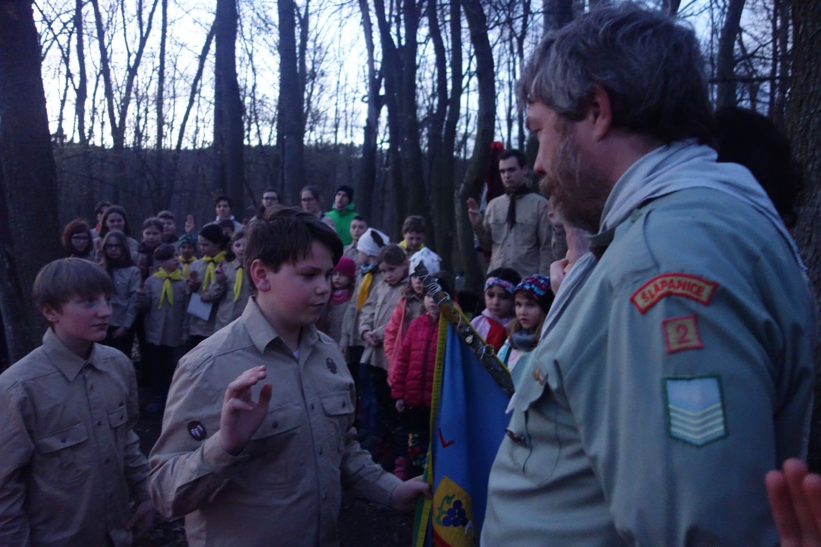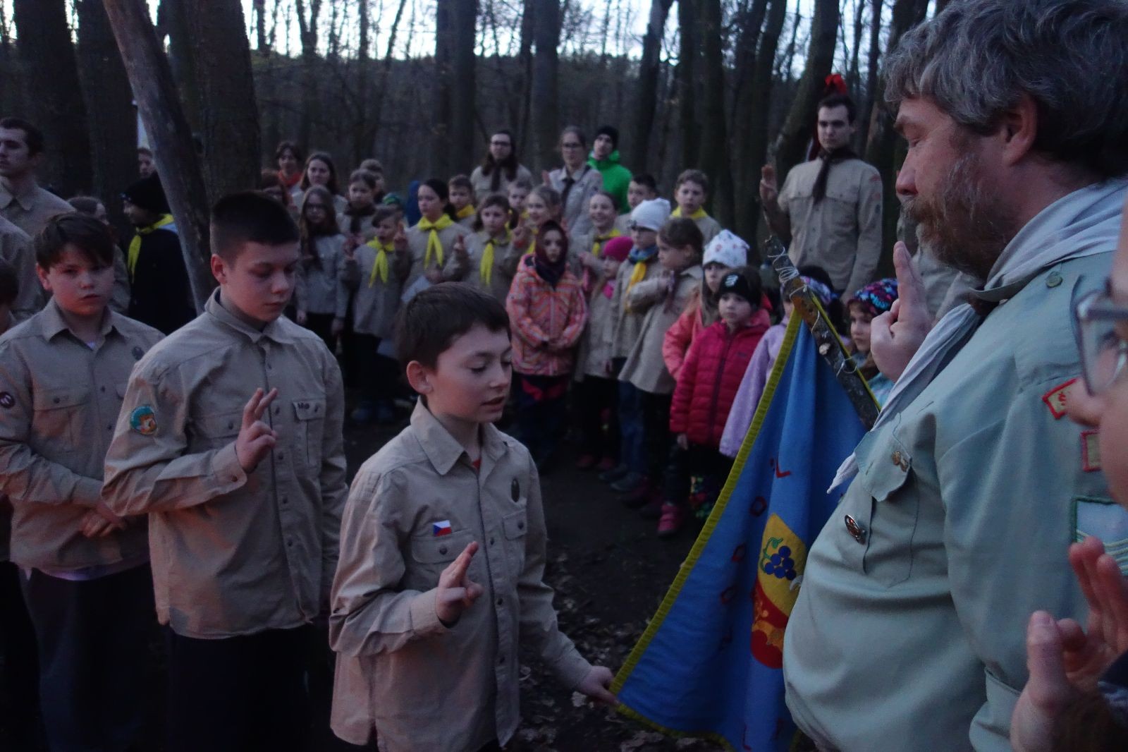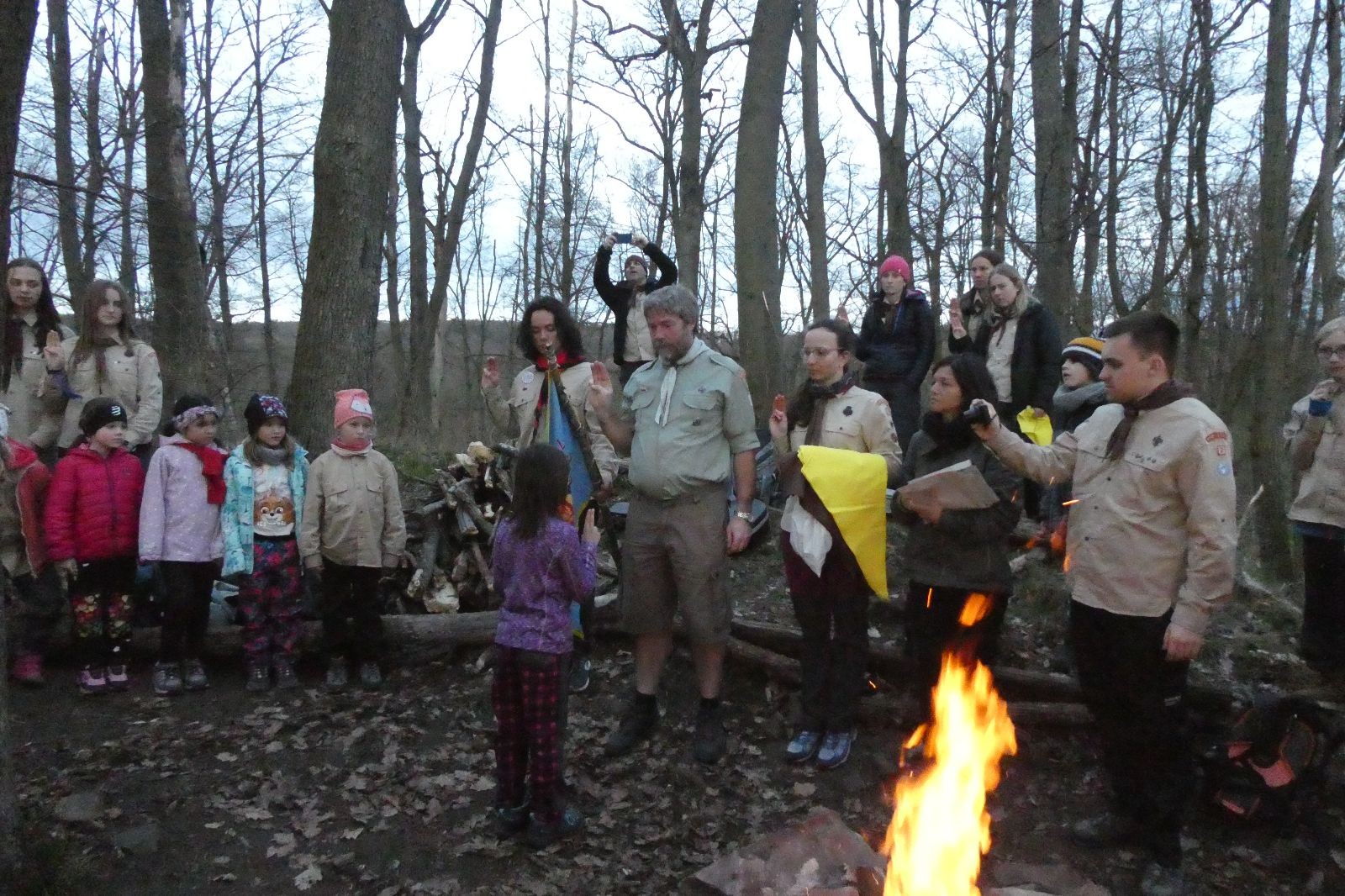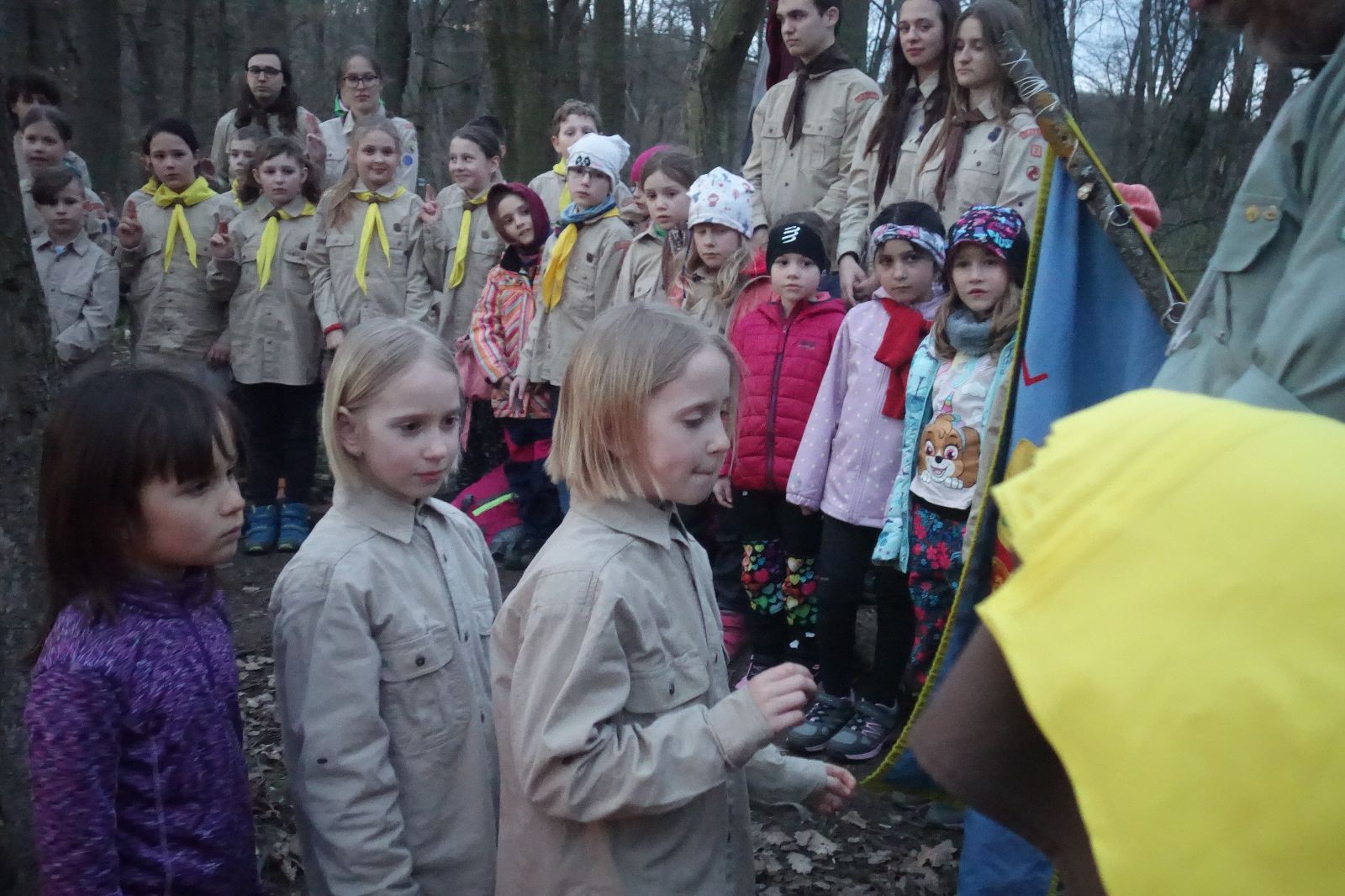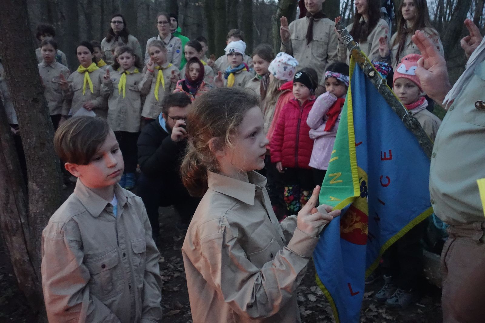A na řadu přichází sliby. 10 světlušek, většina z Lasiček. Pak 8 vlčat, většina od Lachtanů. 4 skautky – 3 Sovičky a jedna Kudlanka. A skauti. Těch je 10 – 2 Vlci, 4 Sršni a 4 Kobři. Celkem 32 lidiček.