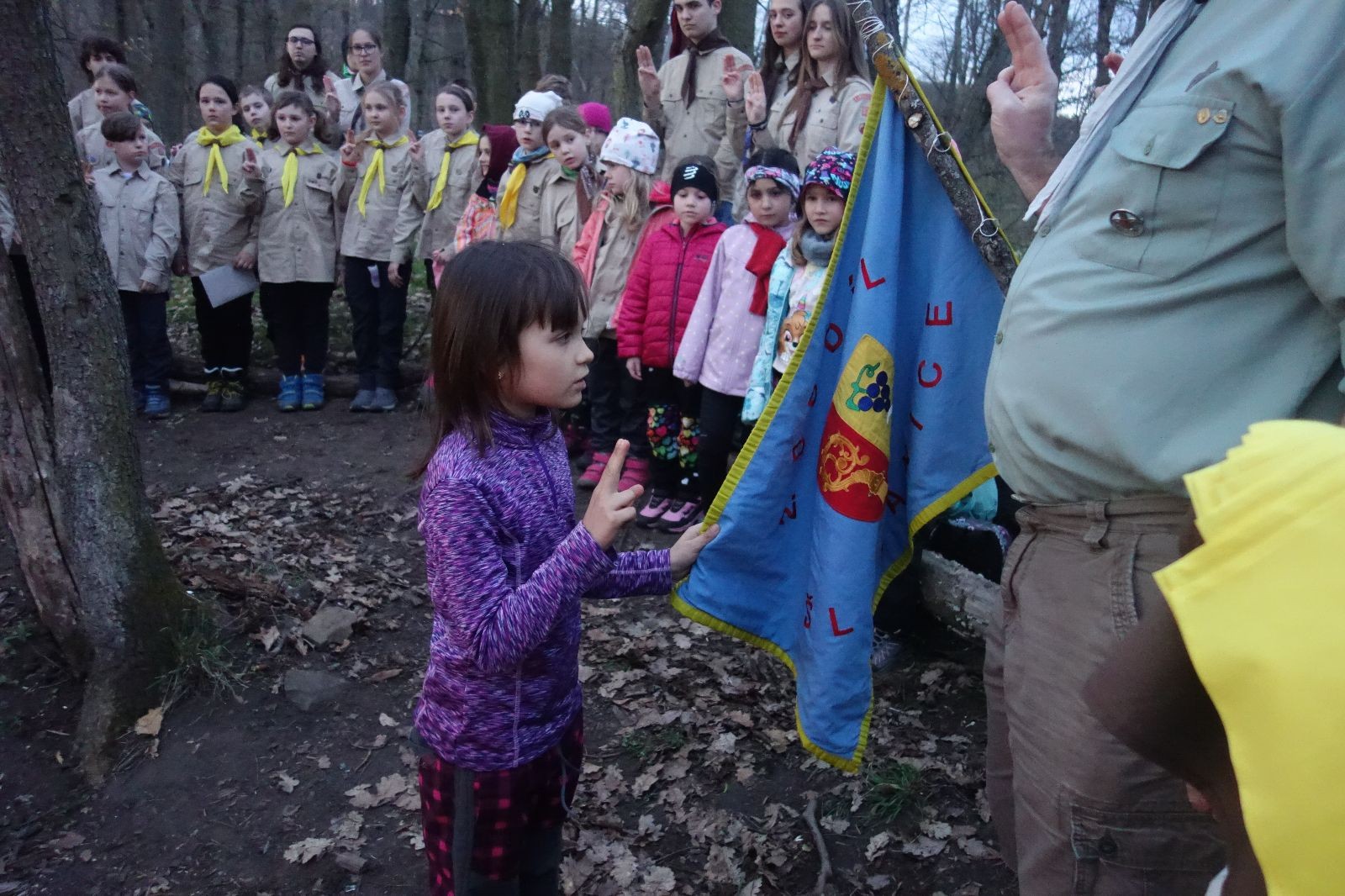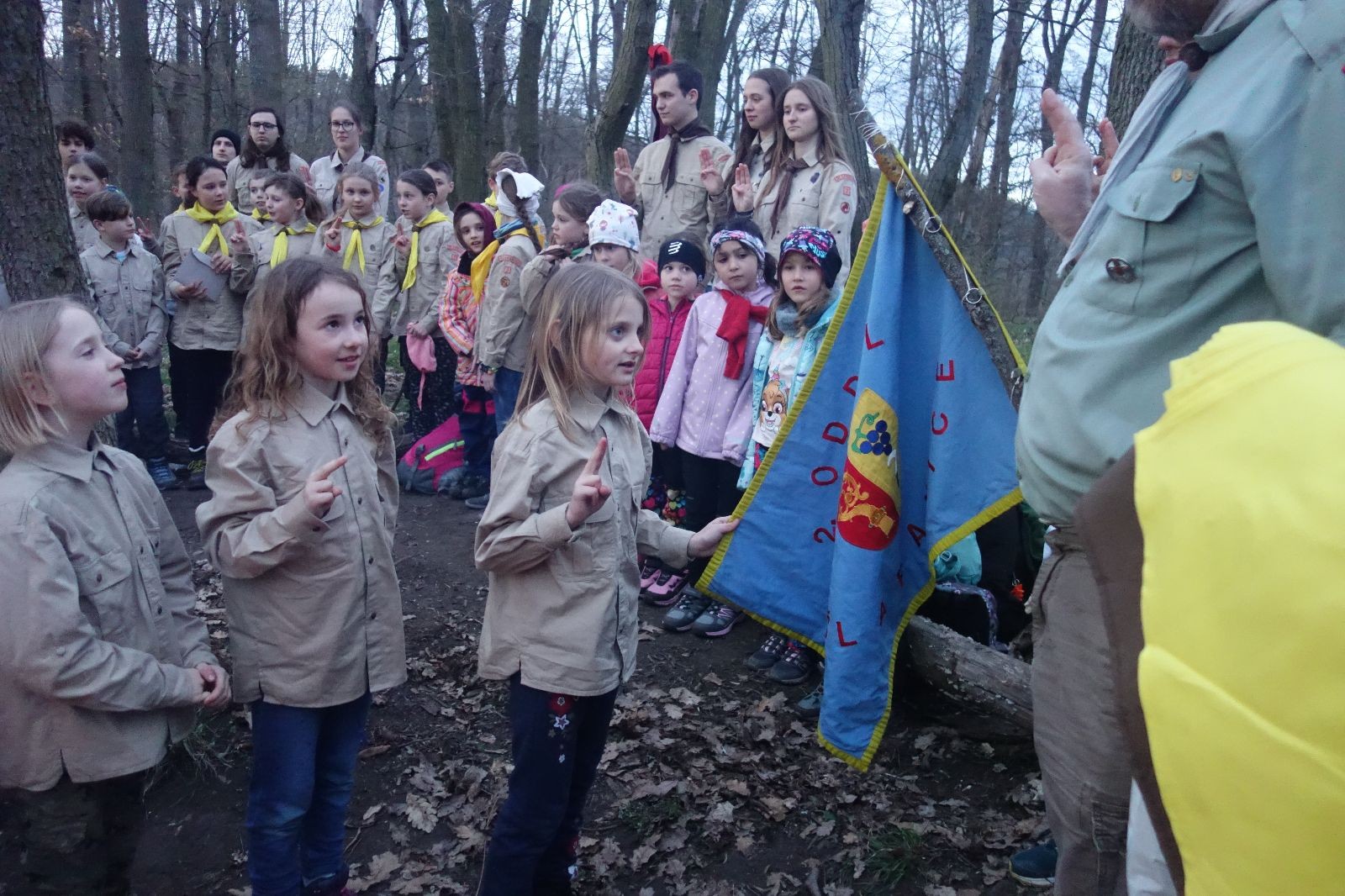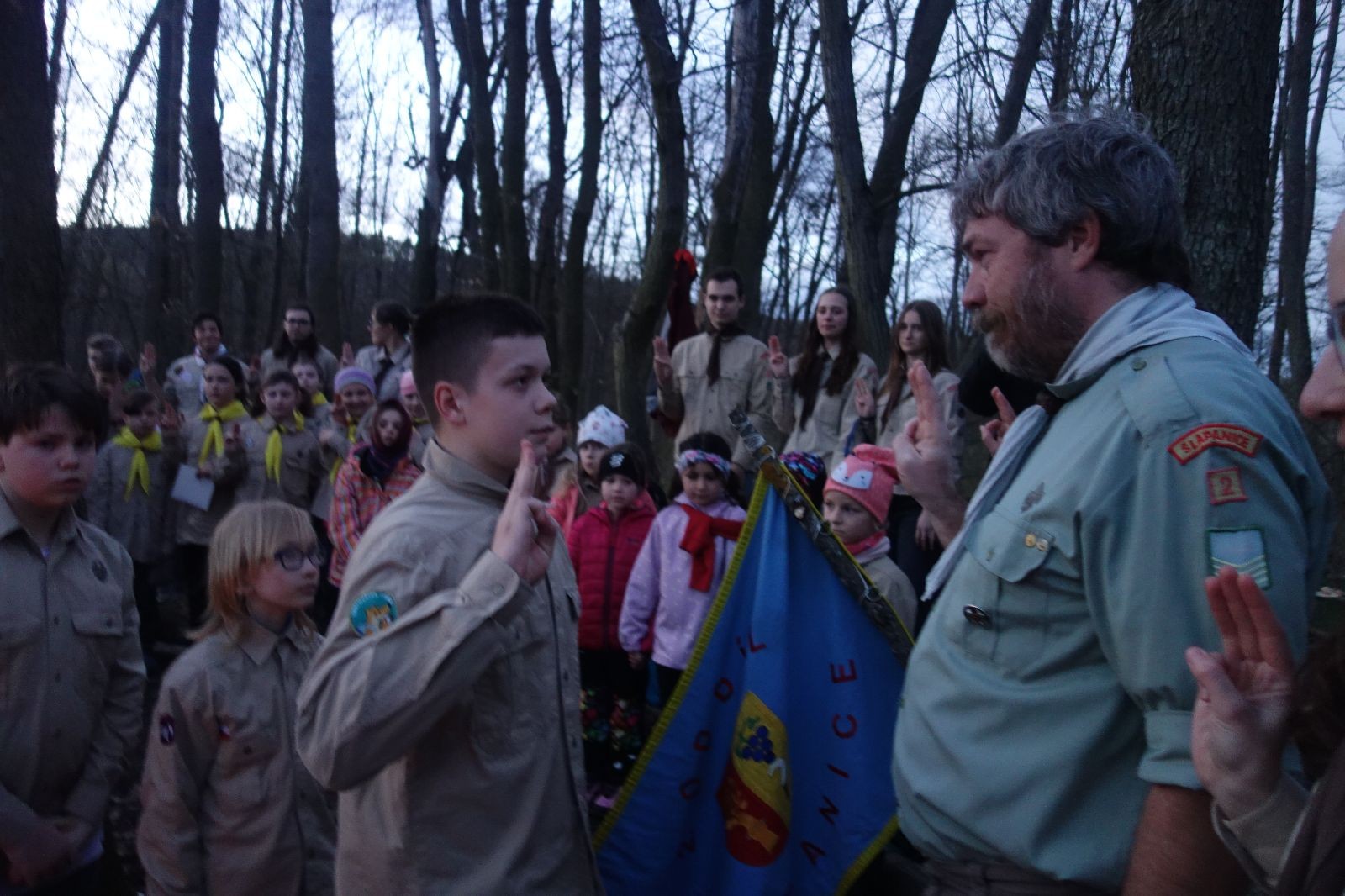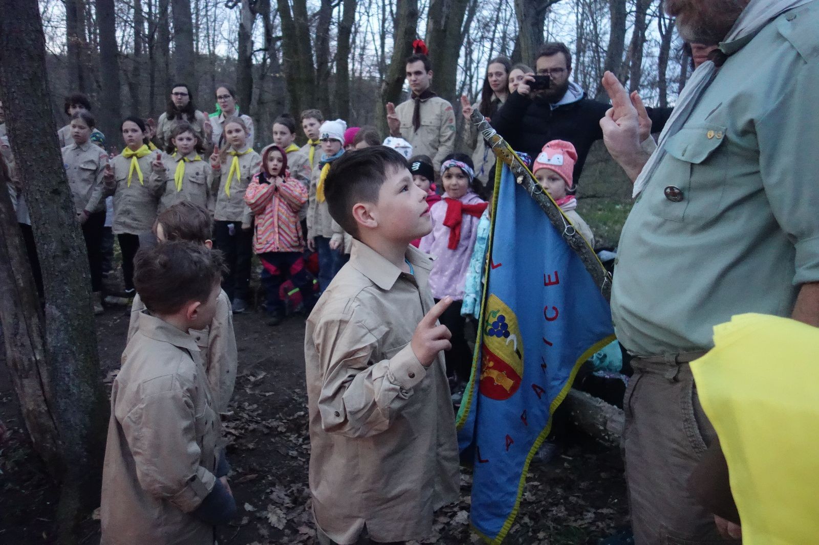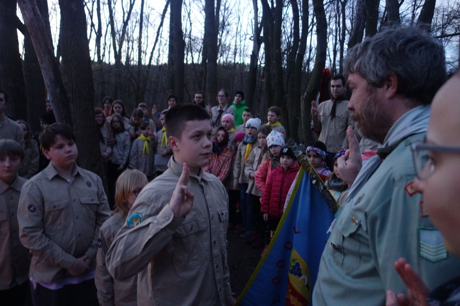 A na řadu přichází sliby. 10 světlušek, většina z Lasiček. Pak 8 vlčat, většina od Lachtanů. 4 skautky – 3 Sovičky a jedna Kudlanka. A skauti. Těch je 10 – 2 Vlci, 4 Sršni a 4 Kobři. Celkem 32 lidiček.