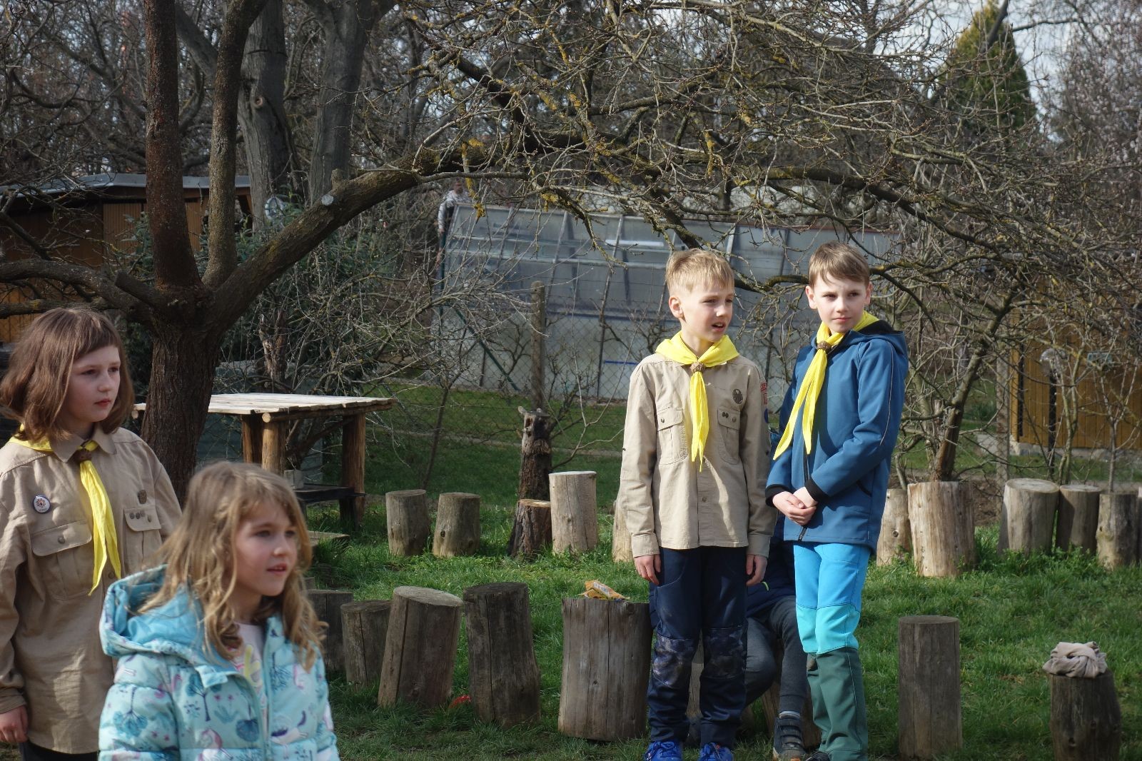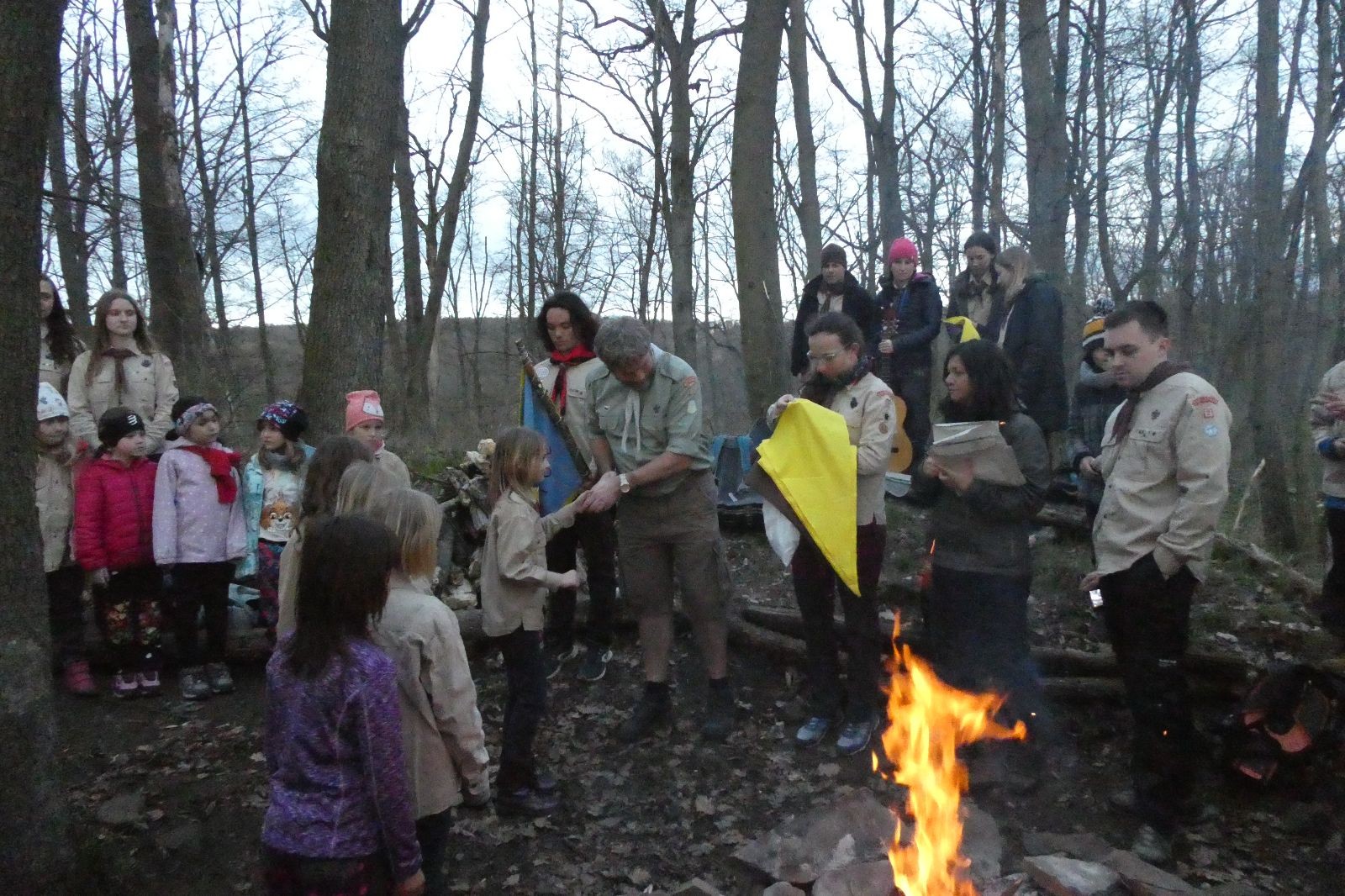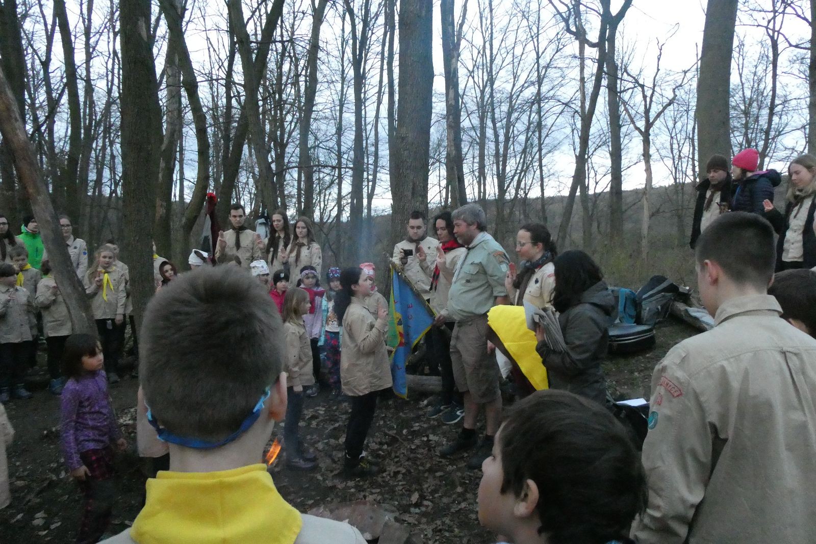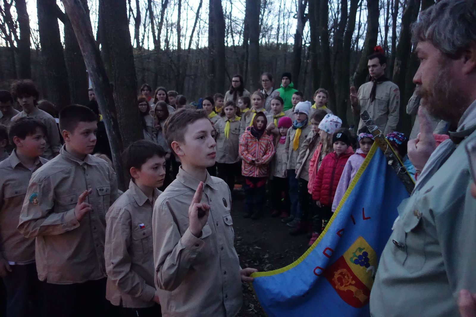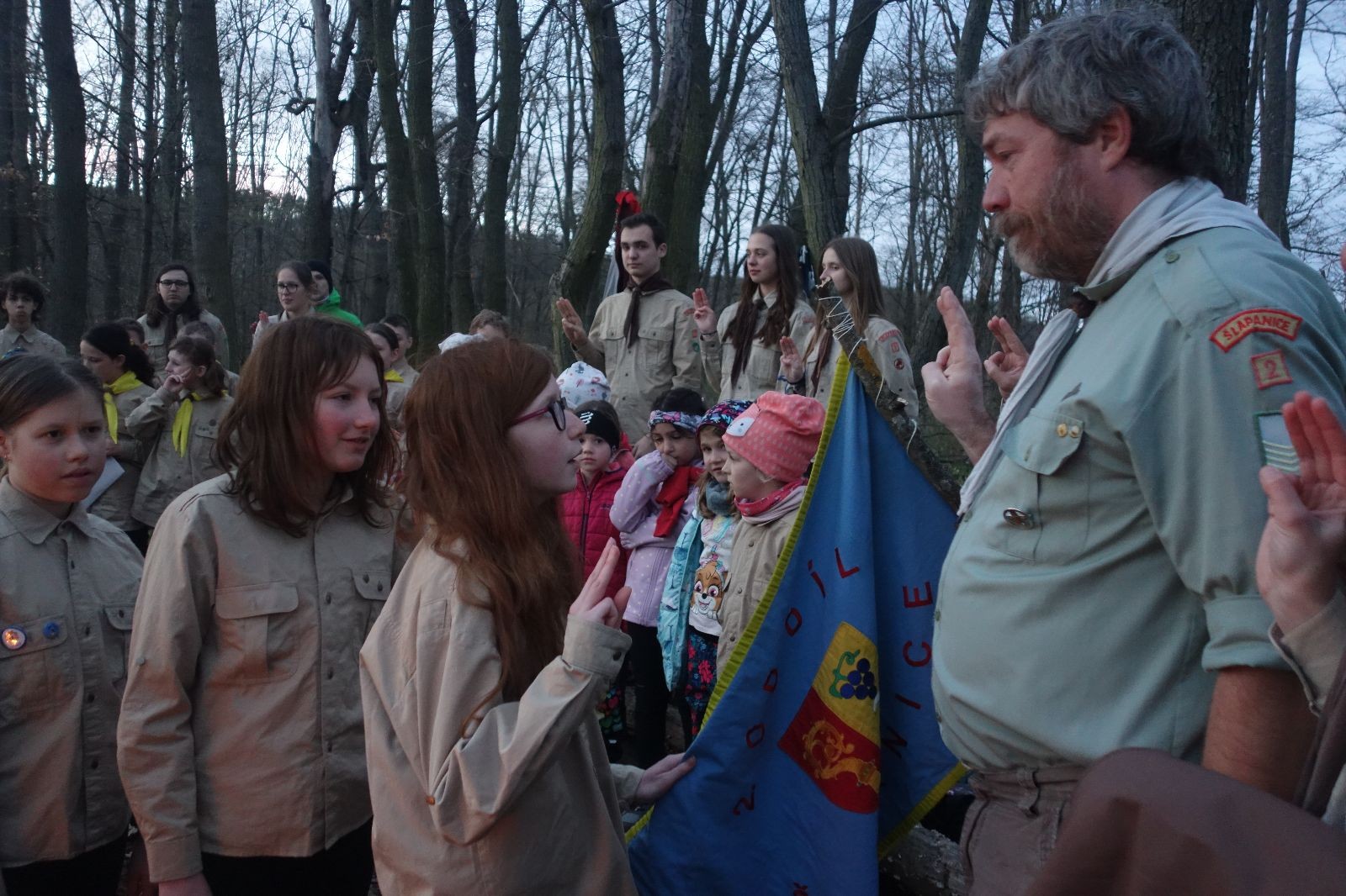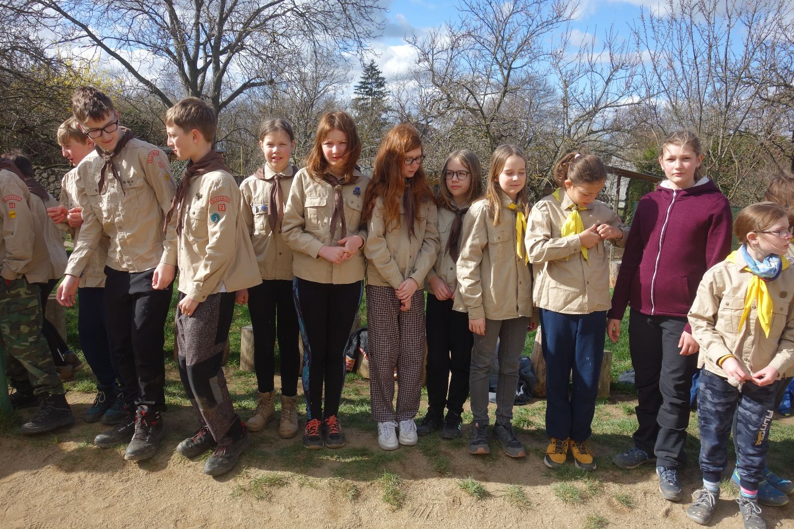A na řadu přichází sliby. 10 světlušek, většina z Lasiček. Pak 8 vlčat, většina od Lachtanů. 4 skautky – 3 Sovičky a jedna Kudlanka. A skauti. Těch je 10 – 2 Vlci, 4 Sršni a 4 Kobři. Celkem 32 lidiček.