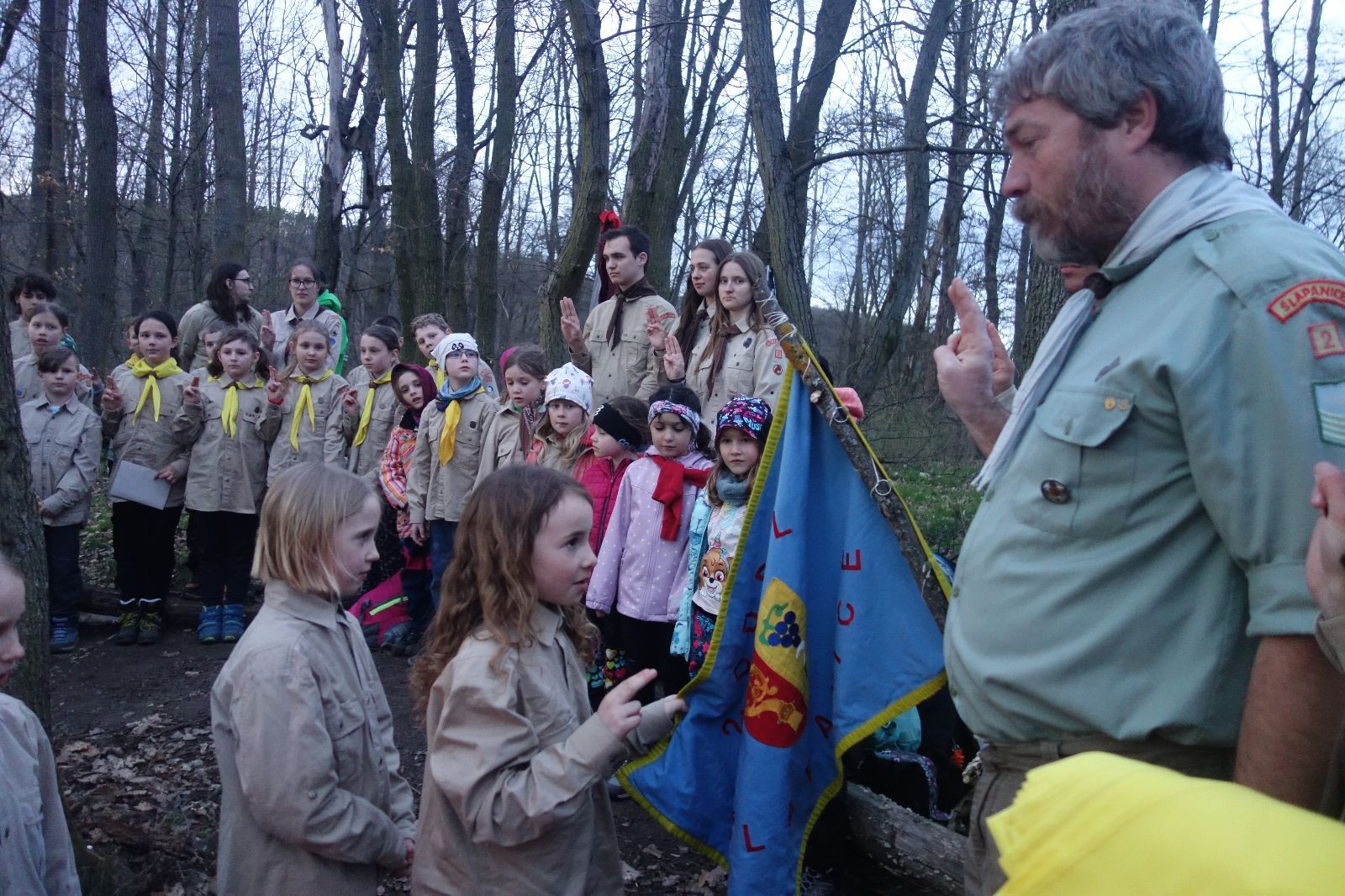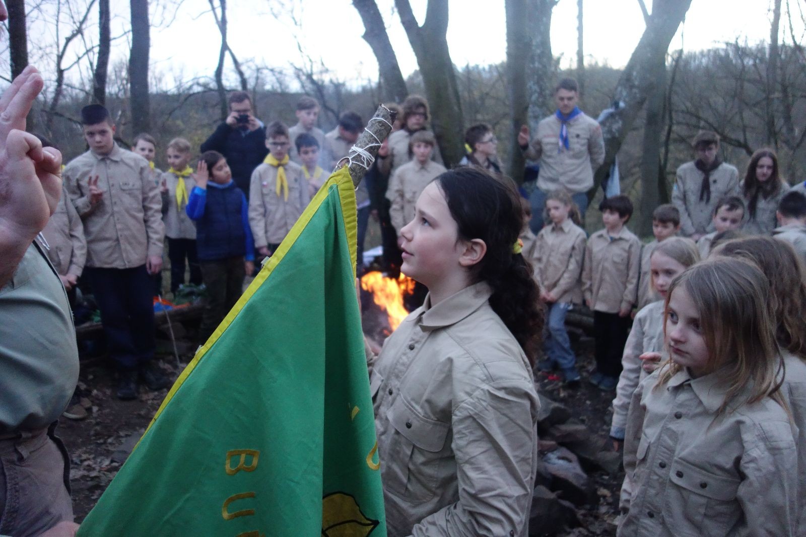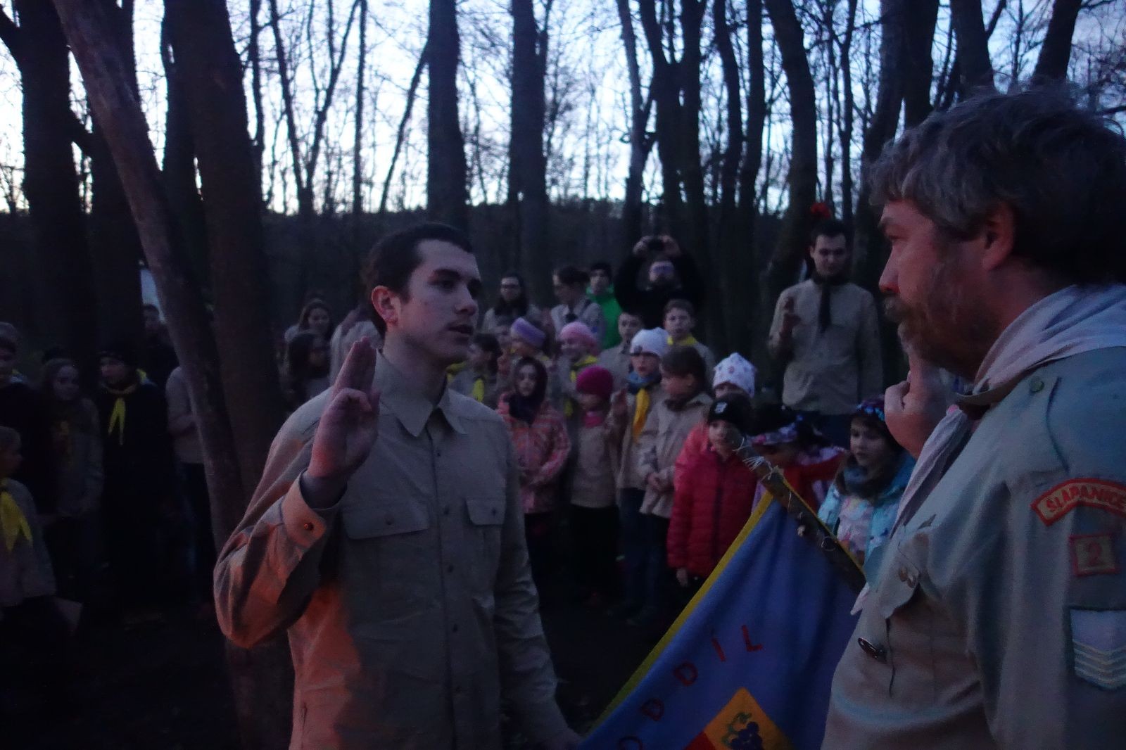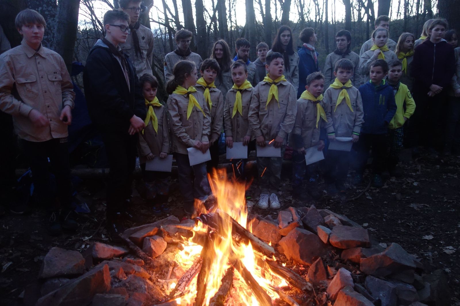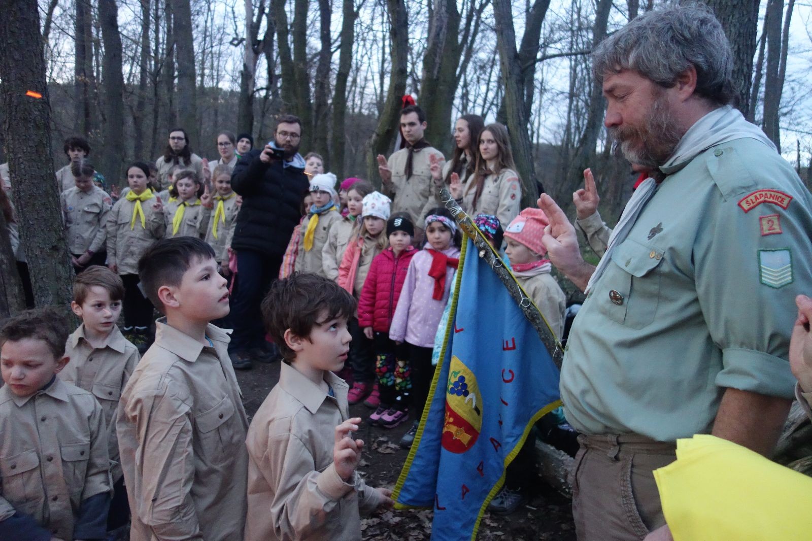 A na řadu přichází sliby. 10 světlušek, většina z Lasiček. Pak 8 vlčat, většina od Lachtanů. 4 skautky – 3 Sovičky a jedna Kudlanka. A skauti. Těch je 10 – 2 Vlci, 4 Sršni a 4 Kobři. Celkem 32 lidiček.
