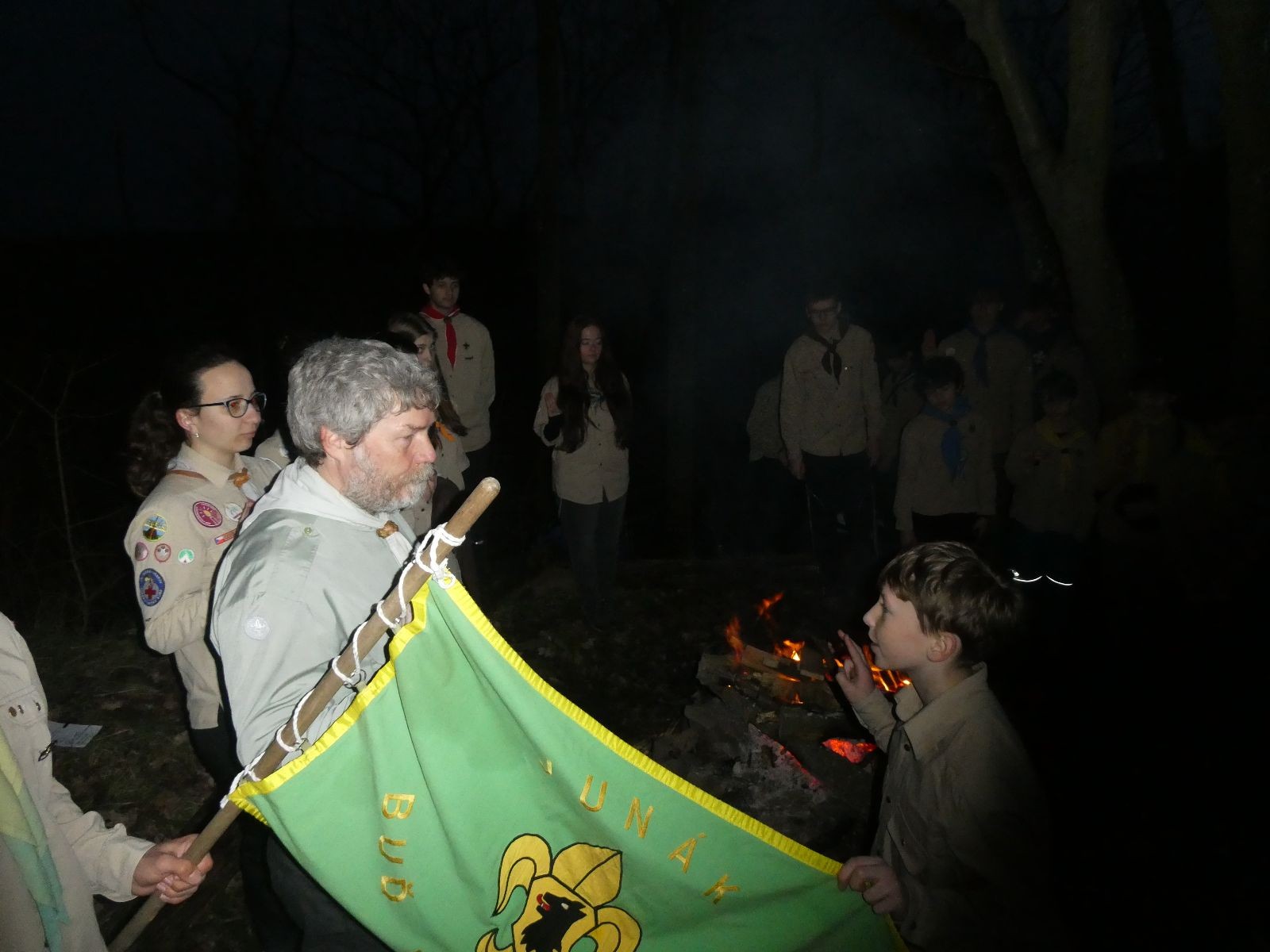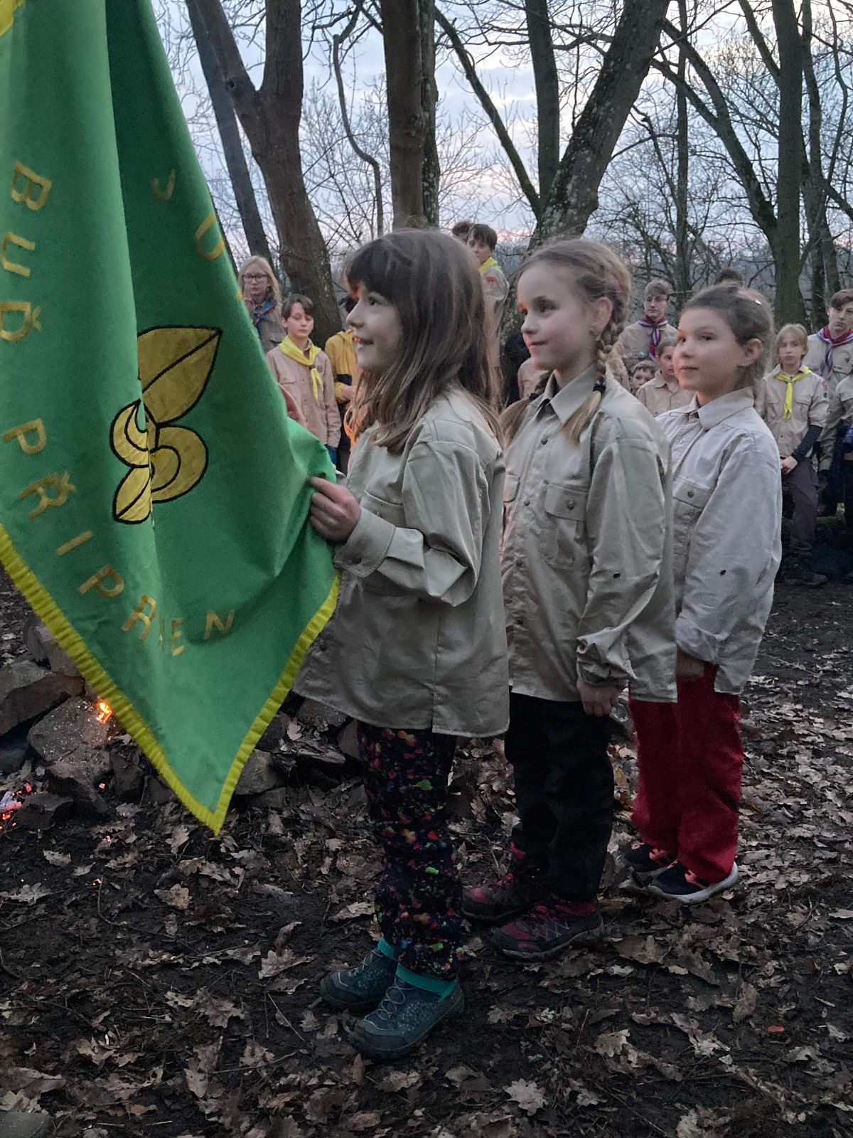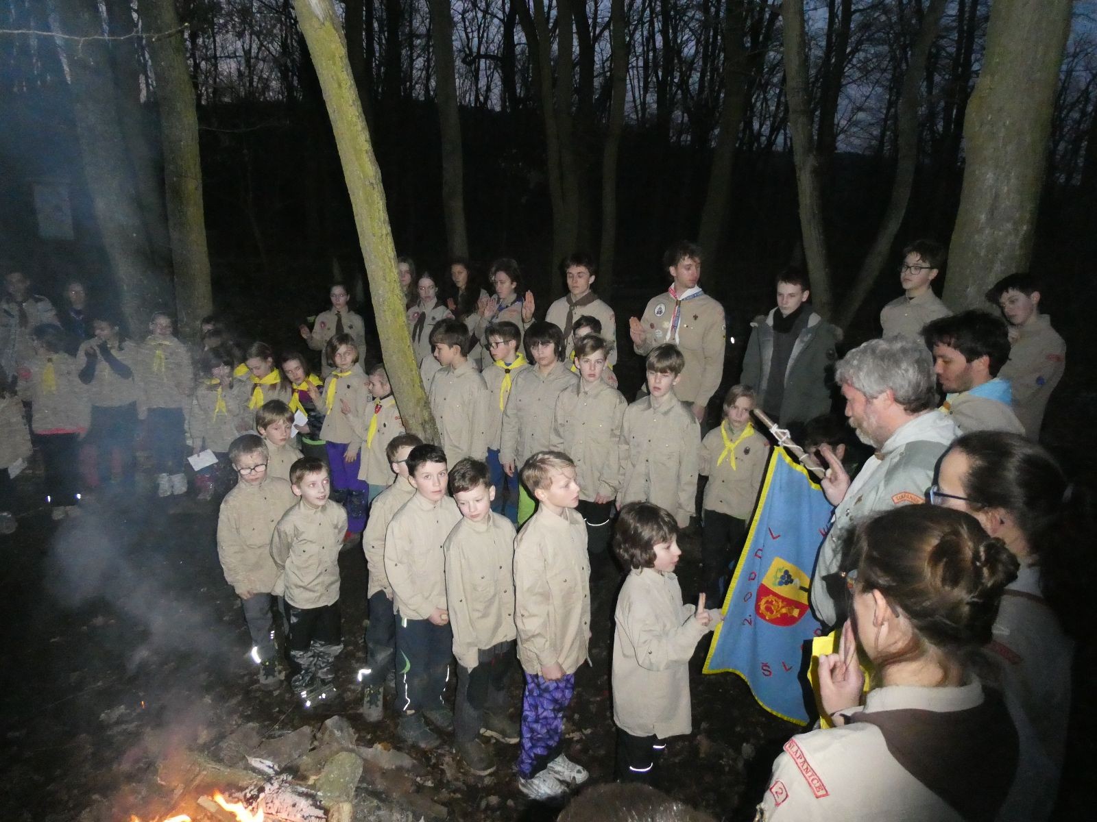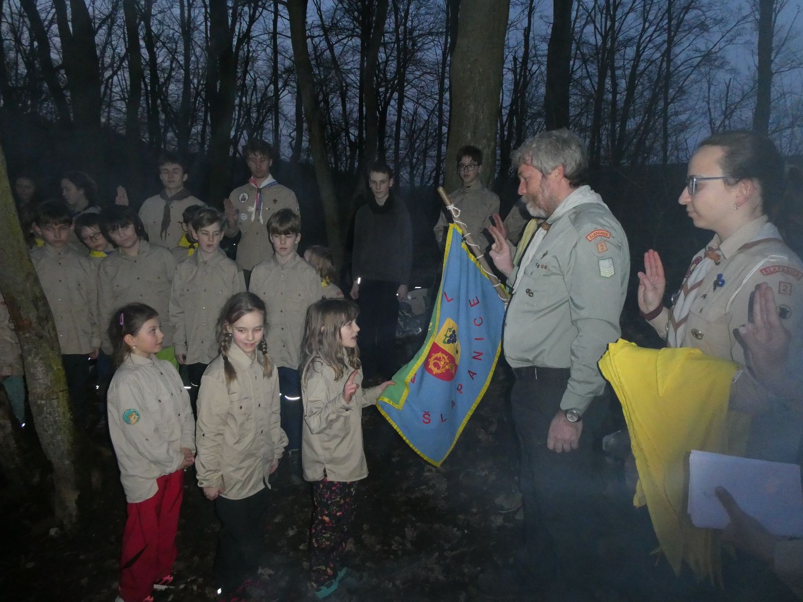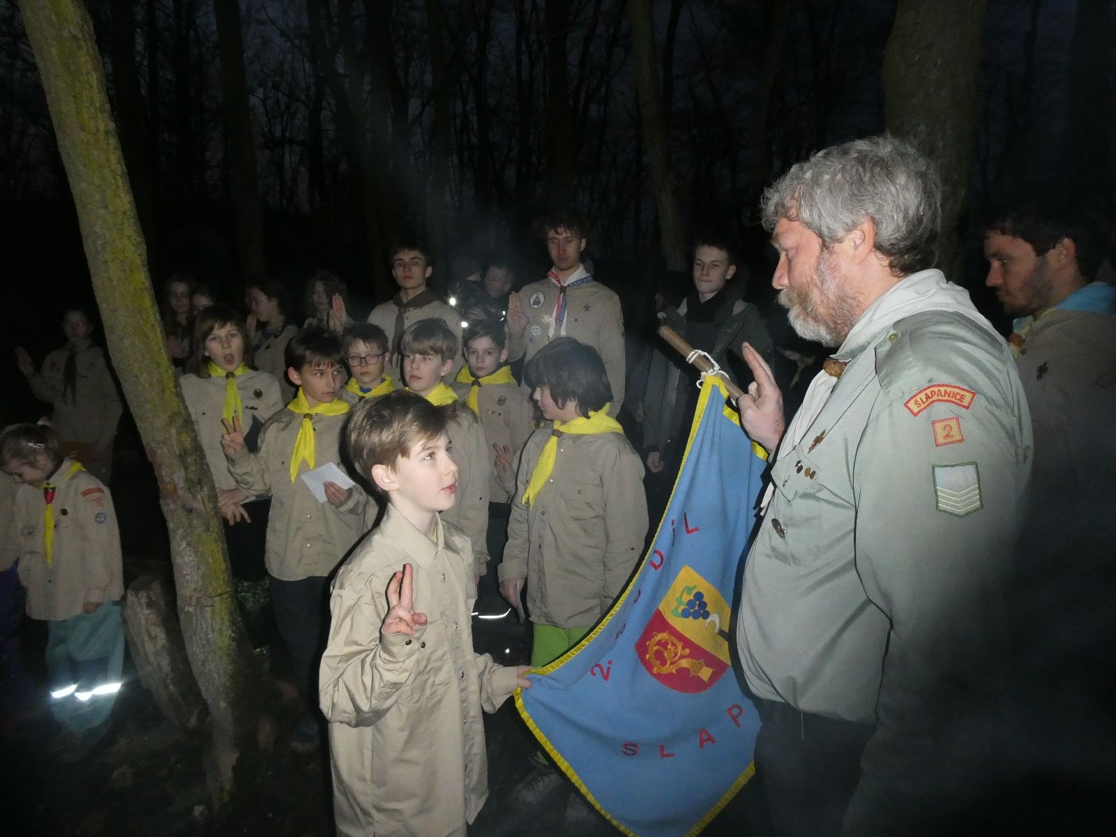 Pak už jsme vyrazili rovnou na zříceninu Horákovského hradu.Tradiční vlajkovanou jsme tentokrát vynechali, abychom se před slavnostním ohněm všichni nevyváleli v blátě. Letos u něj svůj slib skládalo 14 vlčat, 7 světlušek a 2 skauti. Také se rozdalo pár bobříků odvahy do družinky Lasiček, odborky bosých nohou a nočního bdění pro Sovičky a jedna odborka Tetrisáře pro Bětku. Potom byl slavnostní oheň prohlášen za oheň užitkový, tak jsme si na něm všichni opekli nějaký ten špekáček, zazpívali si s Jurovou kytarou a nechyběla ani každoroční jarní přáníčka.