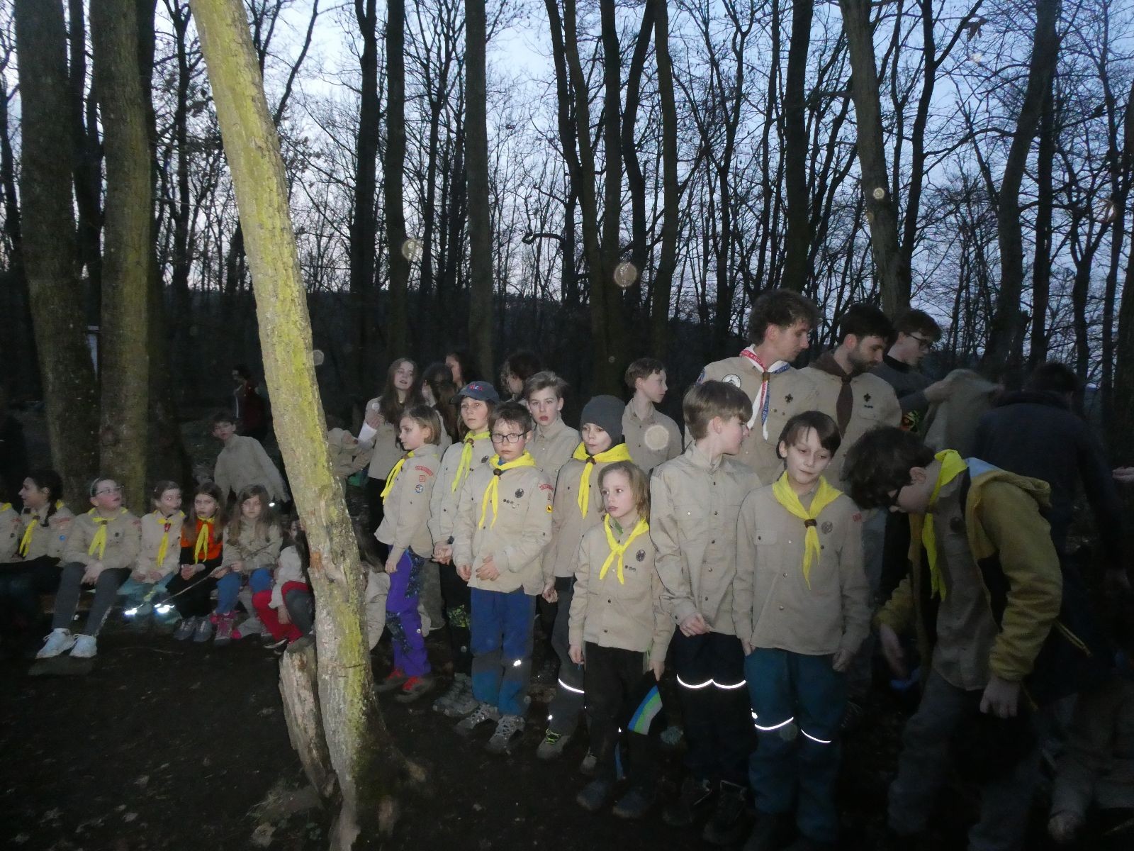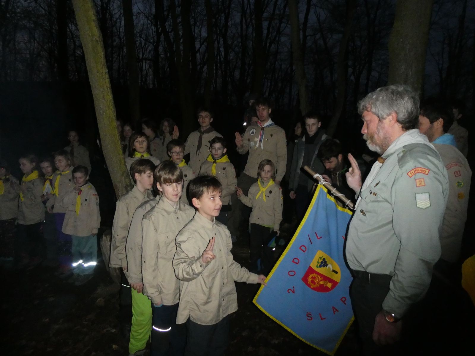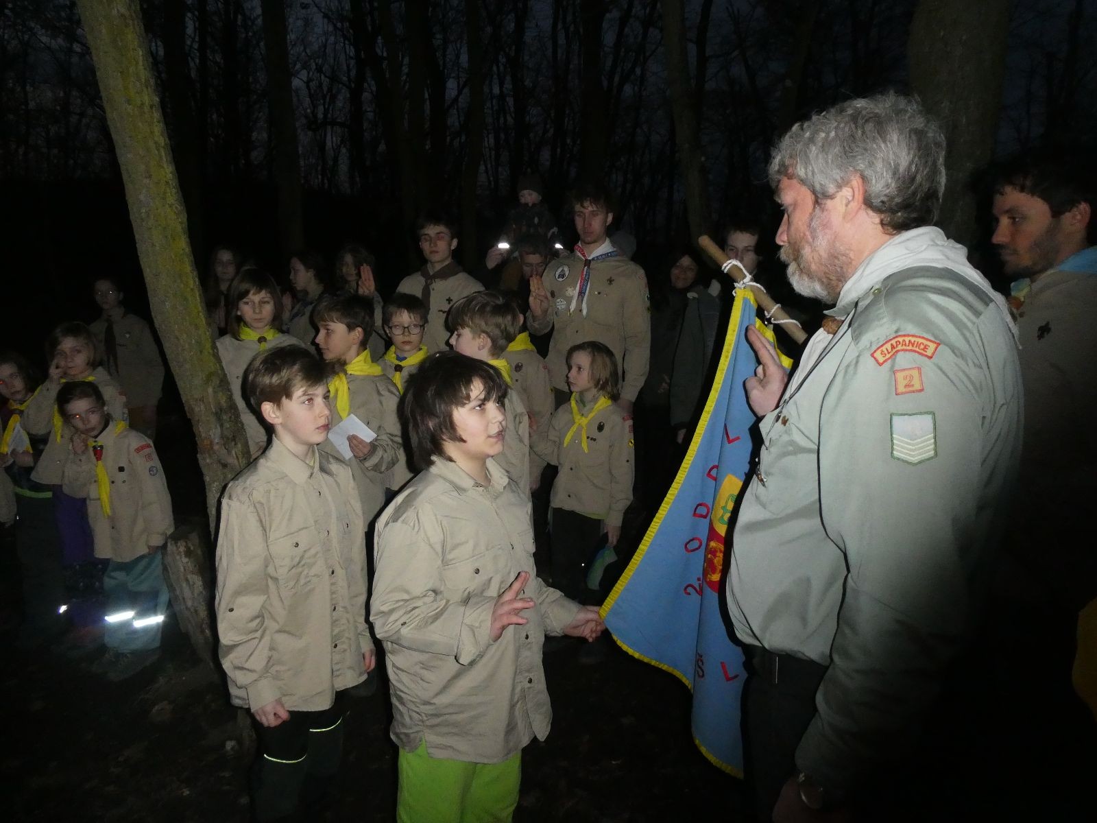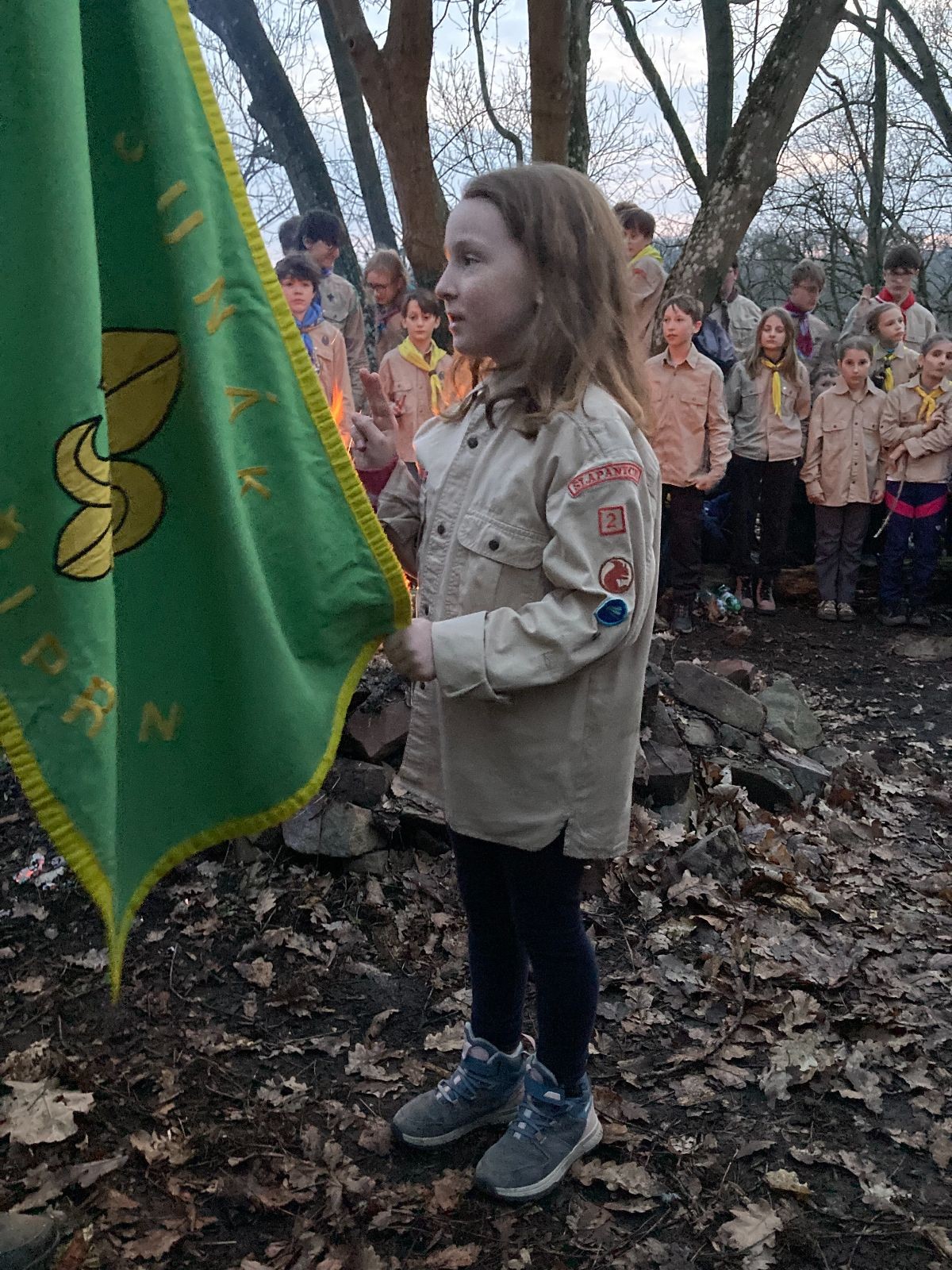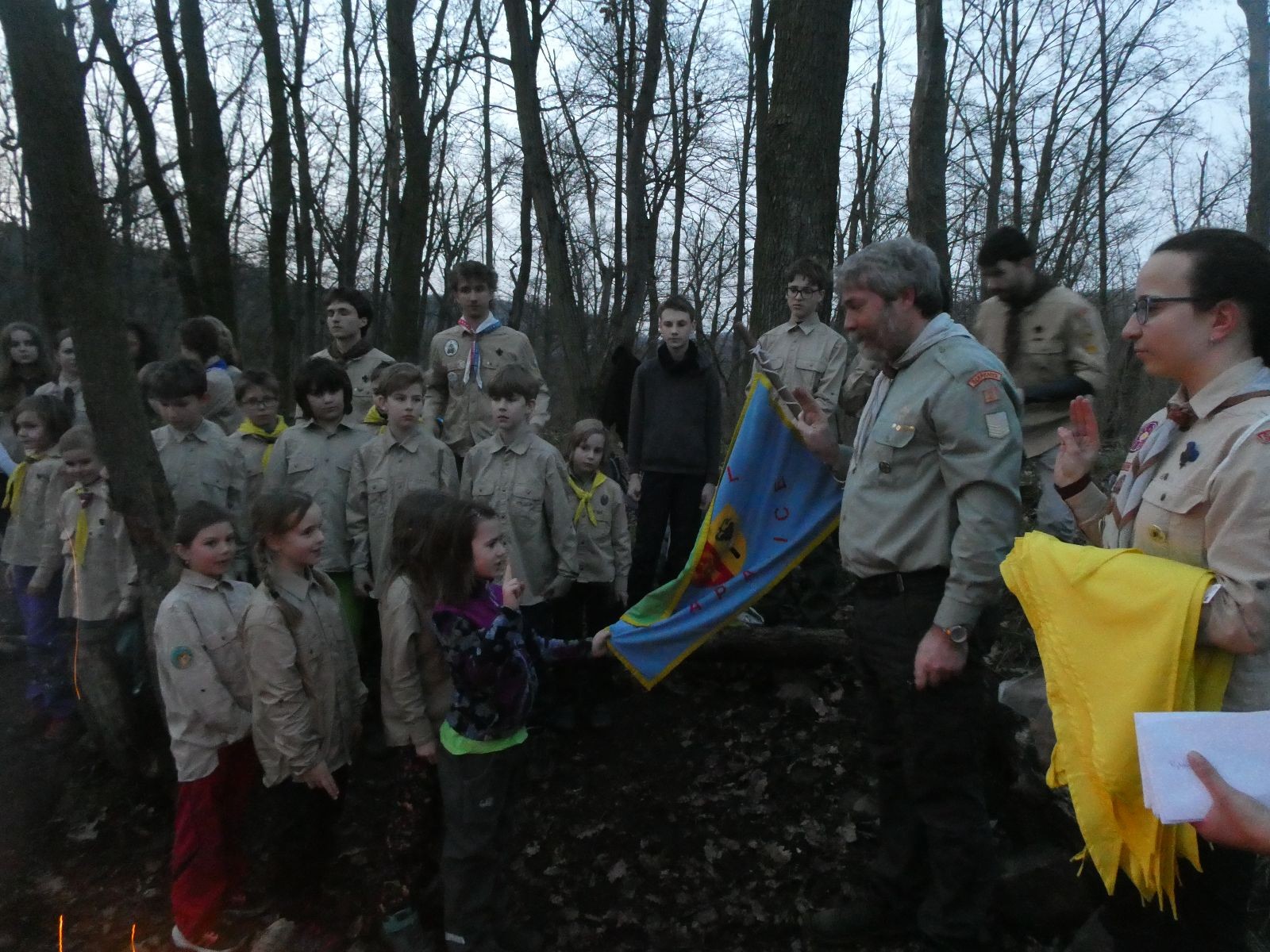 Pak už jsme vyrazili rovnou na zříceninu Horákovského hradu.Tradiční vlajkovanou jsme tentokrát vynechali, abychom se před slavnostním ohněm všichni nevyváleli v blátě. Letos u něj svůj slib skládalo 14 vlčat, 7 světlušek a 2 skauti. Také se rozdalo pár bobříků odvahy do družinky Lasiček, odborky bosých nohou a nočního bdění pro Sovičky a jedna odborka Tetrisáře pro Bětku. Potom byl slavnostní oheň prohlášen za oheň užitkový, tak jsme si na něm všichni opekli nějaký ten špekáček, zazpívali si s Jurovou kytarou a nechyběla ani každoroční jarní přáníčka.