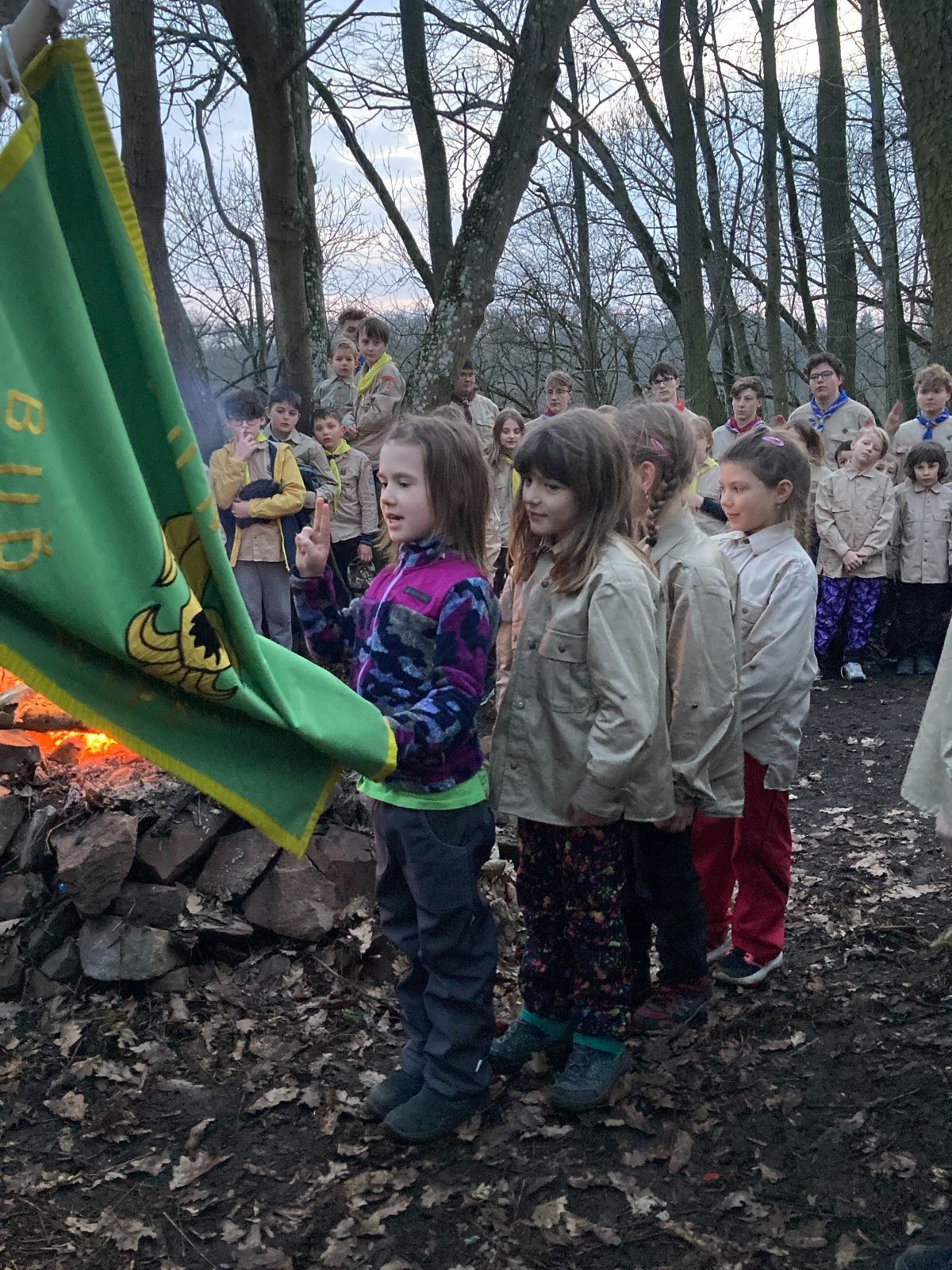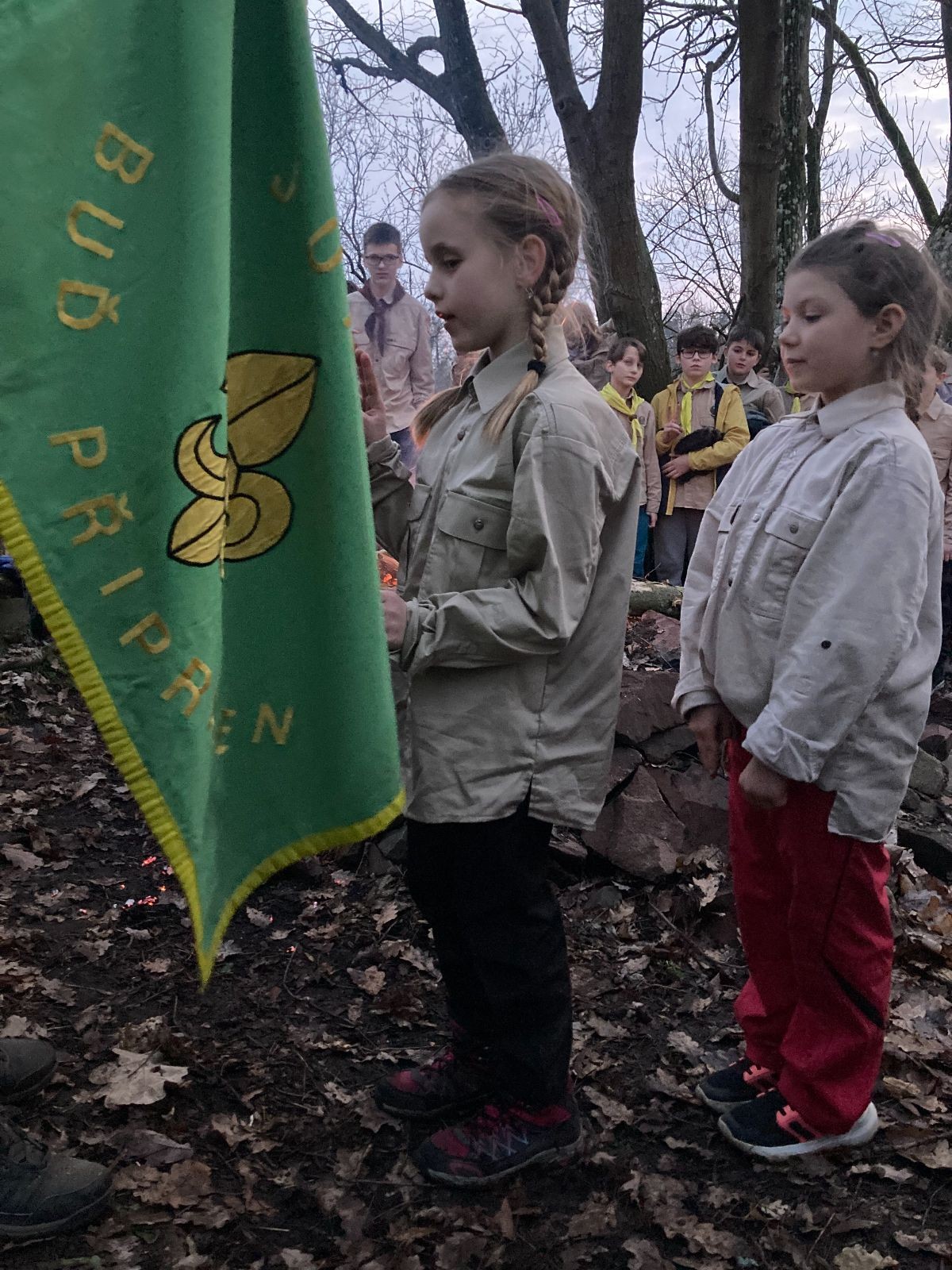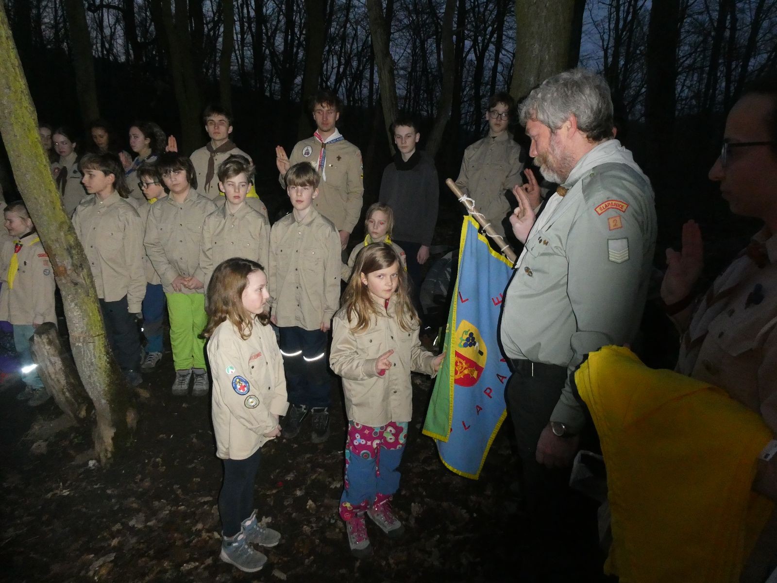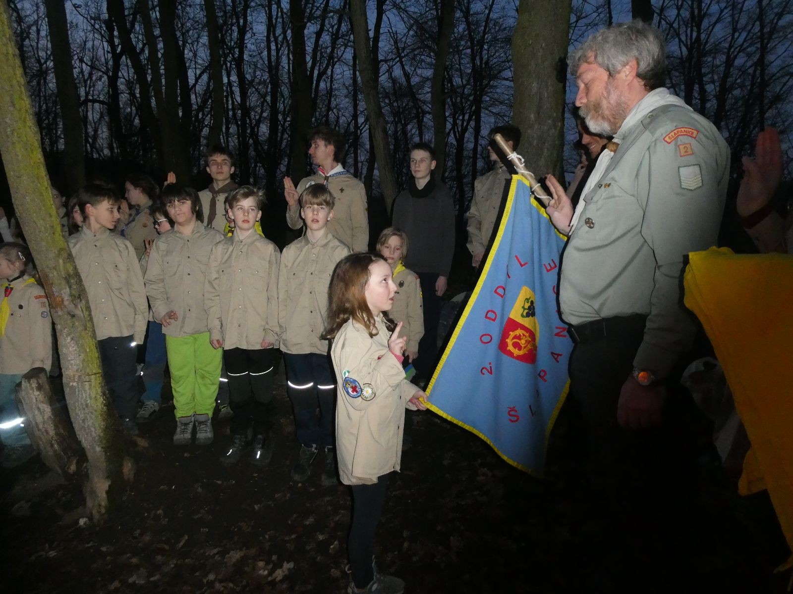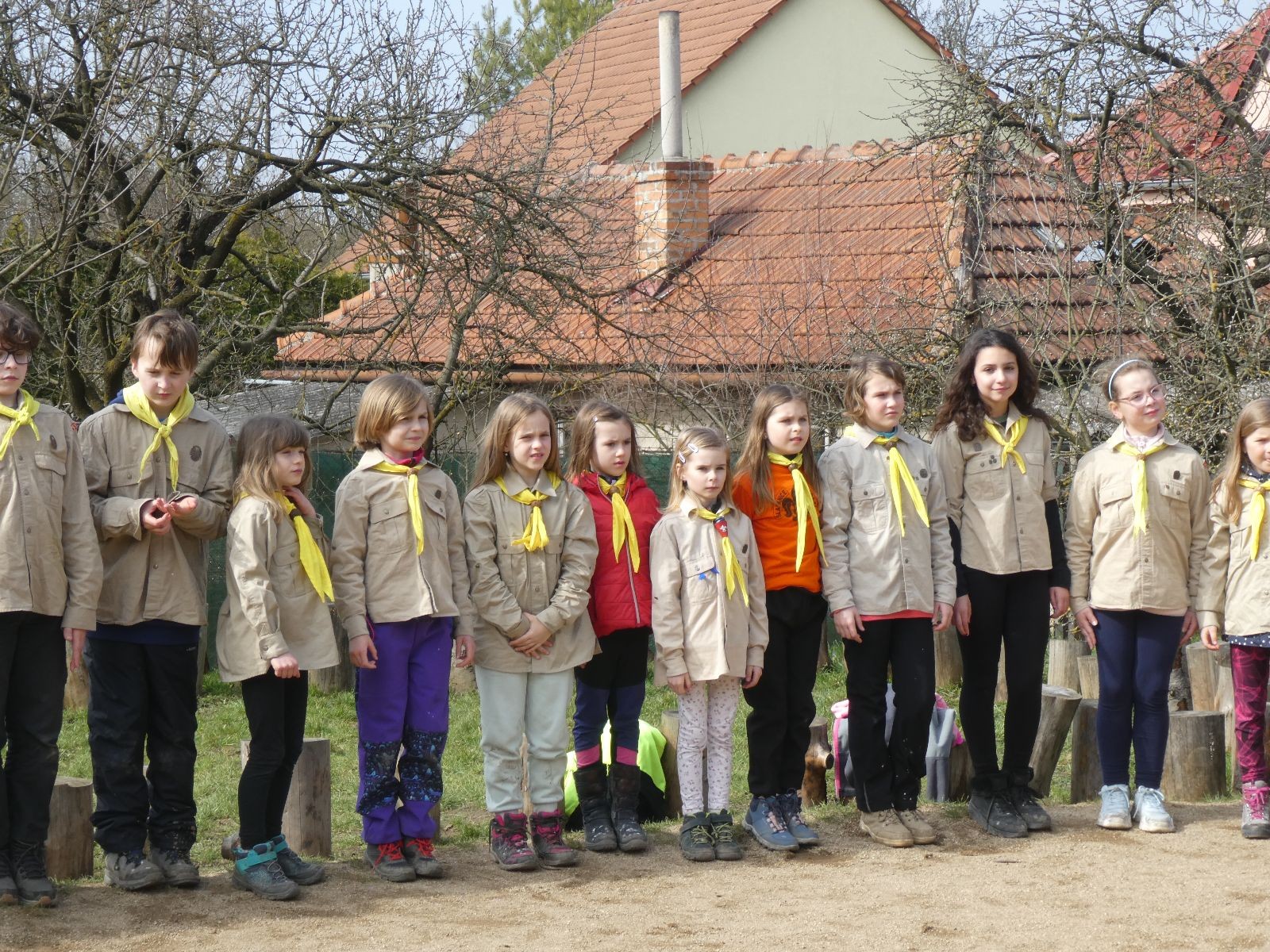 Pak už jsme vyrazili rovnou na zříceninu Horákovského hradu.Tradiční vlajkovanou jsme tentokrát vynechali, abychom se před slavnostním ohněm všichni nevyváleli v blátě. Letos u něj svůj slib skládalo 14 vlčat, 7 světlušek a 2 skauti. Také se rozdalo pár bobříků odvahy do družinky Lasiček, odborky bosých nohou a nočního bdění pro Sovičky a jedna odborka Tetrisáře pro Bětku. Potom byl slavnostní oheň prohlášen za oheň užitkový, tak jsme si na něm všichni opekli nějaký ten špekáček, zazpívali si s Jurovou kytarou a nechyběla ani každoroční jarní přáníčka.
