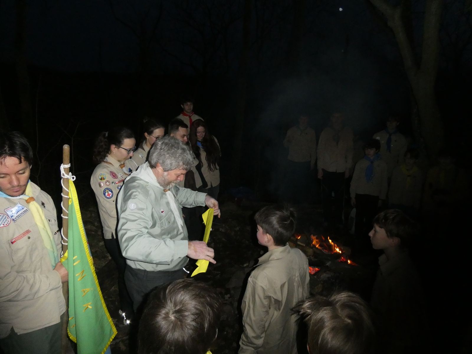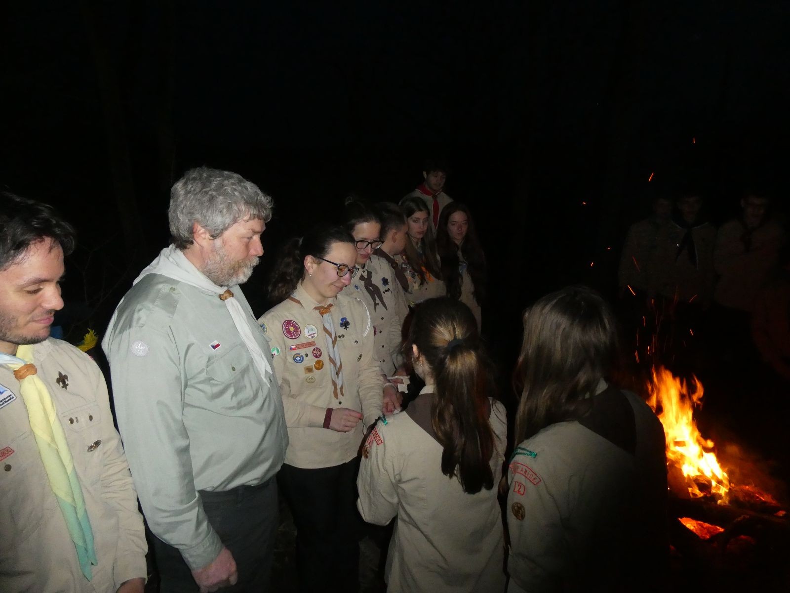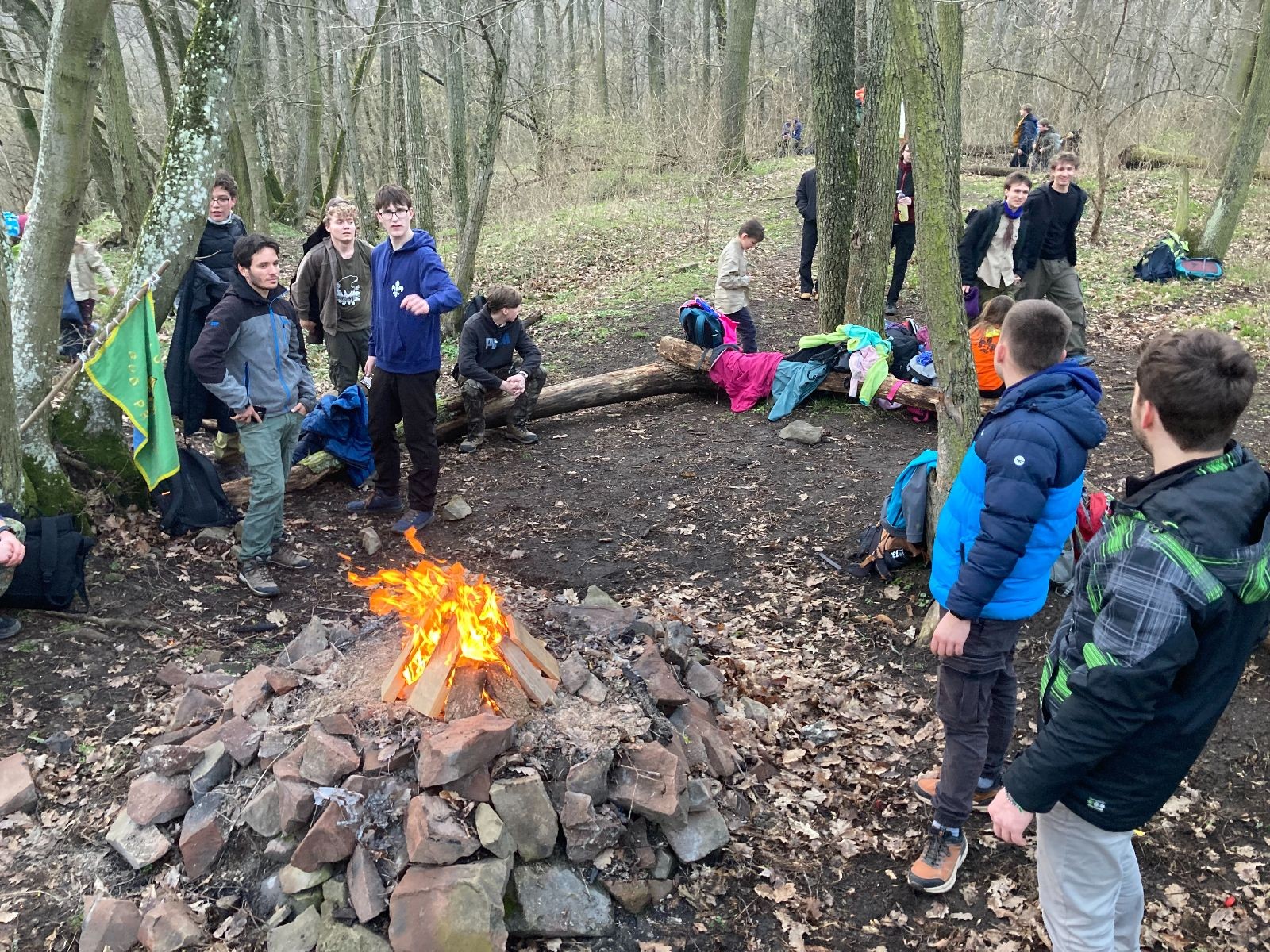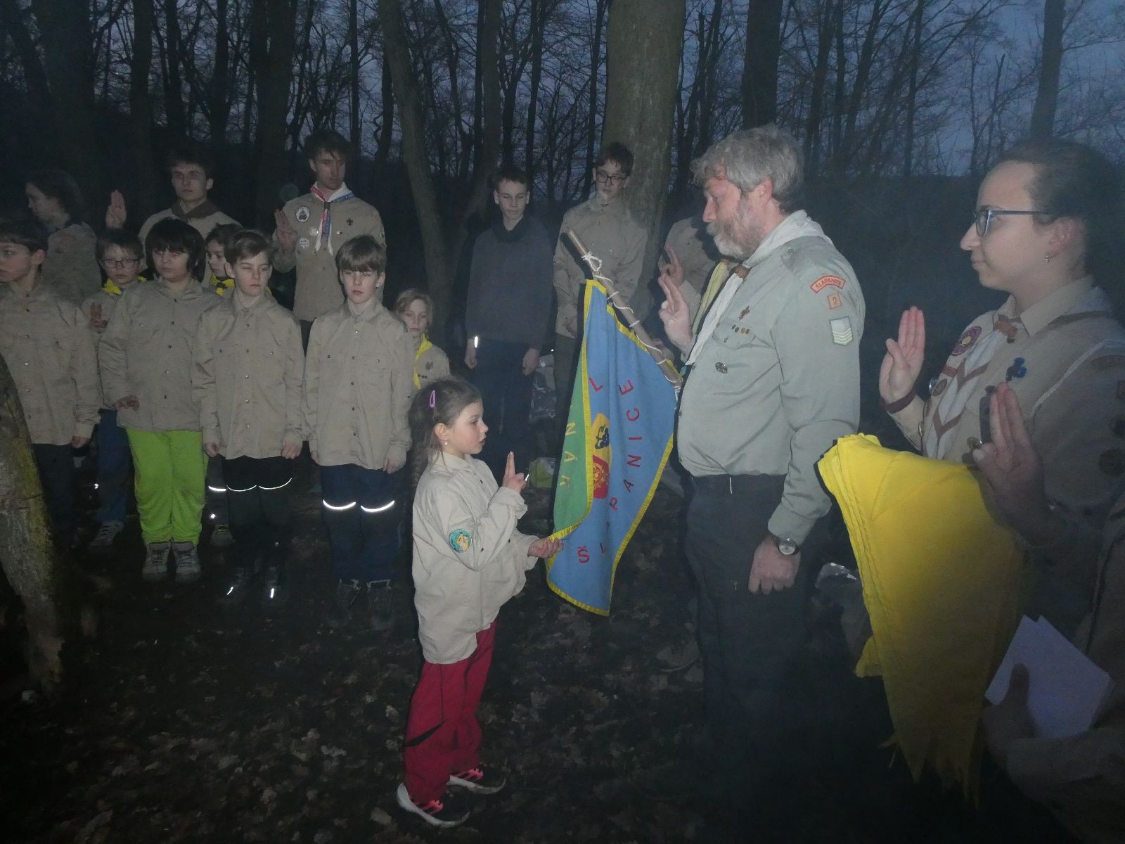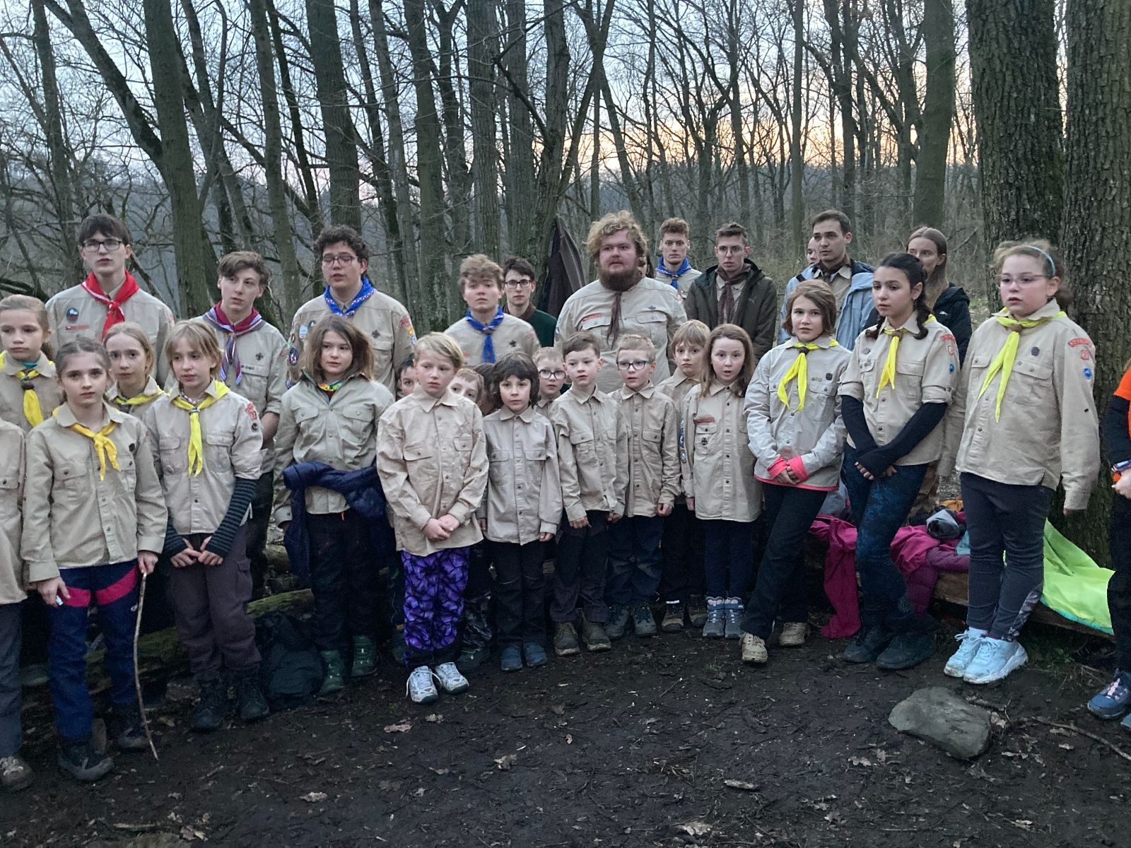 Pak už jsme vyrazili rovnou na zříceninu Horákovského hradu.Tradiční vlajkovanou jsme tentokrát vynechali, abychom se před slavnostním ohněm všichni nevyváleli v blátě. Letos u něj svůj slib skládalo 14 vlčat, 7 světlušek a 2 skauti. Také se rozdalo pár bobříků odvahy do družinky Lasiček, odborky bosých nohou a nočního bdění pro Sovičky a jedna odborka Tetrisáře pro Bětku. Potom byl slavnostní oheň prohlášen za oheň užitkový, tak jsme si na něm všichni opekli nějaký ten špekáček, zazpívali si s Jurovou kytarou a nechyběla ani každoroční jarní přáníčka.