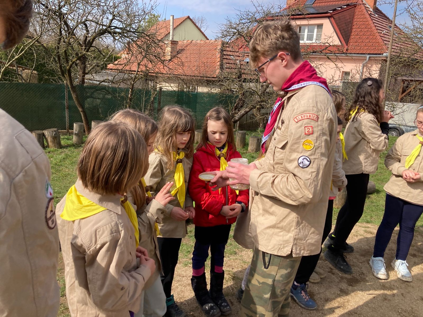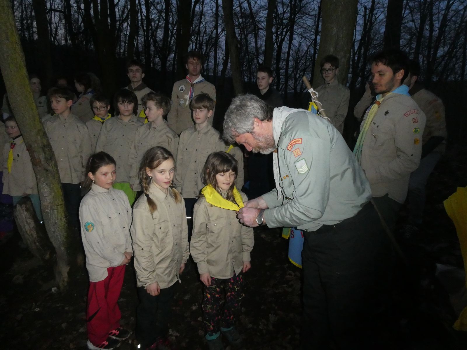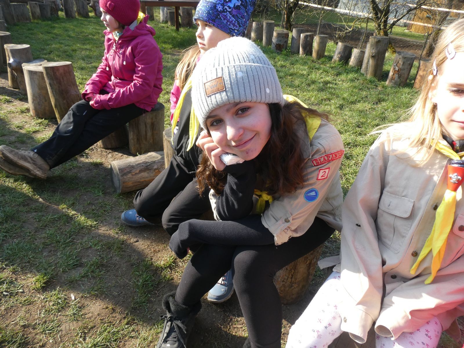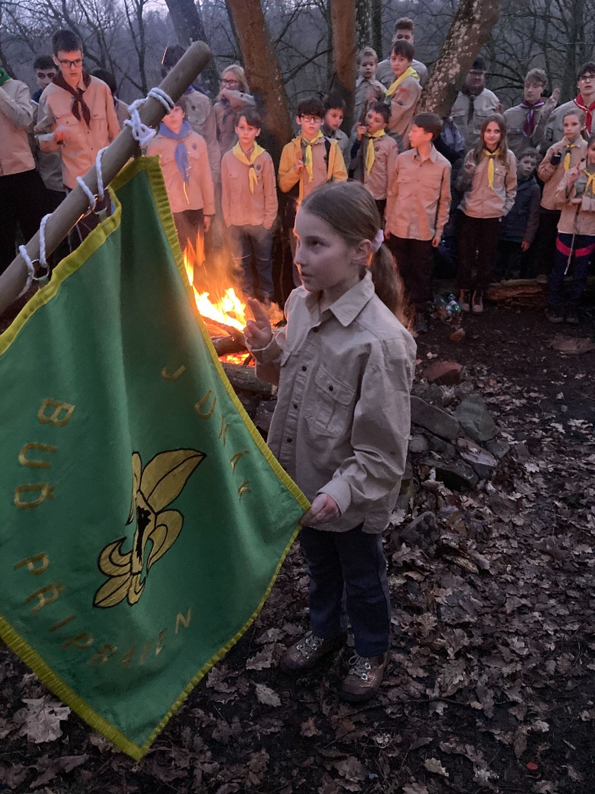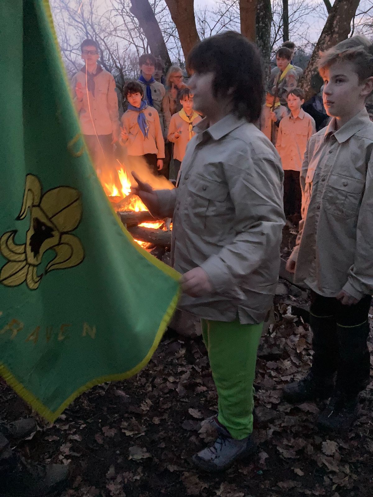Pak už jsme vyrazili rovnou na zříceninu Horákovského hradu.Tradiční vlajkovanou jsme tentokrát vynechali, abychom se před slavnostním ohněm všichni nevyváleli v blátě. Letos u něj svůj slib skládalo 14 vlčat, 7 světlušek a 2 skauti. Také se rozdalo pár bobříků odvahy do družinky Lasiček, odborky bosých nohou a nočního bdění pro Sovičky a jedna odborka Tetrisáře pro Bětku. Potom byl slavnostní oheň prohlášen za oheň užitkový, tak jsme si na něm všichni opekli nějaký ten špekáček, zazpívali si s Jurovou kytarou a nechyběla ani každoroční jarní přáníčka.