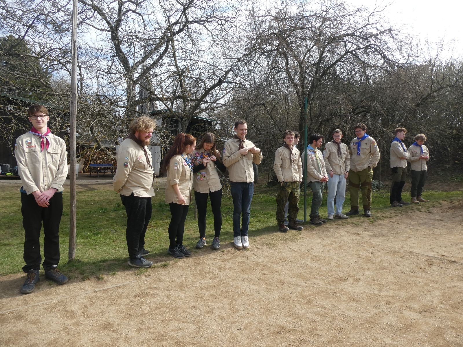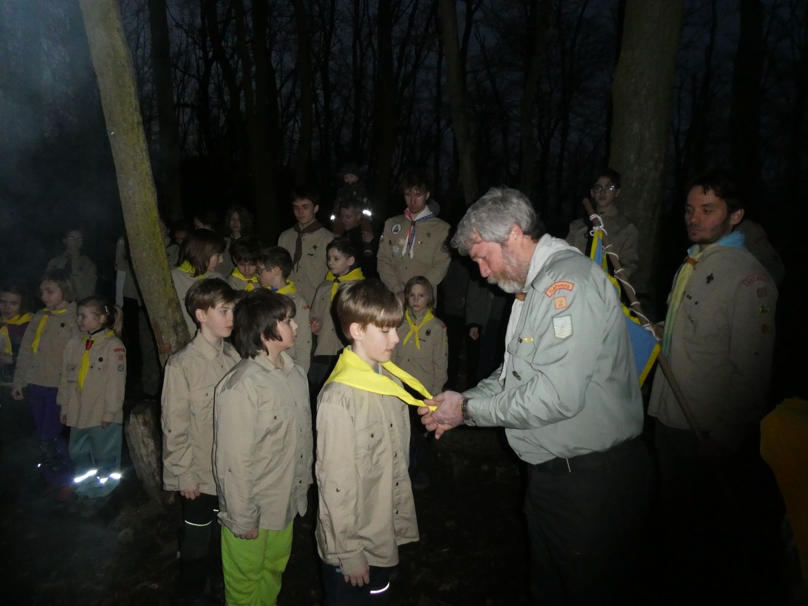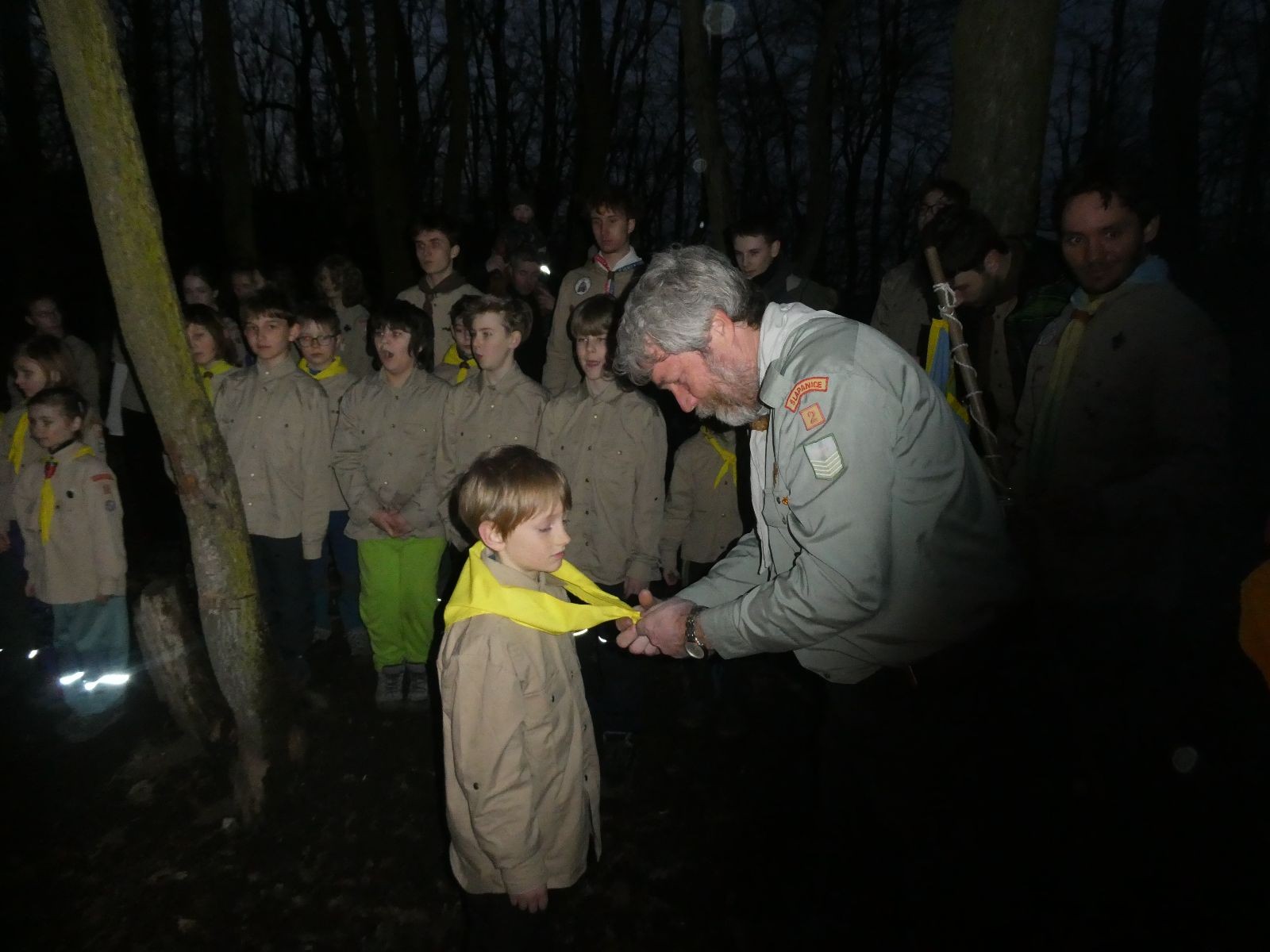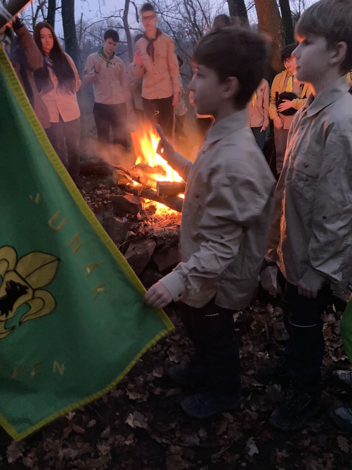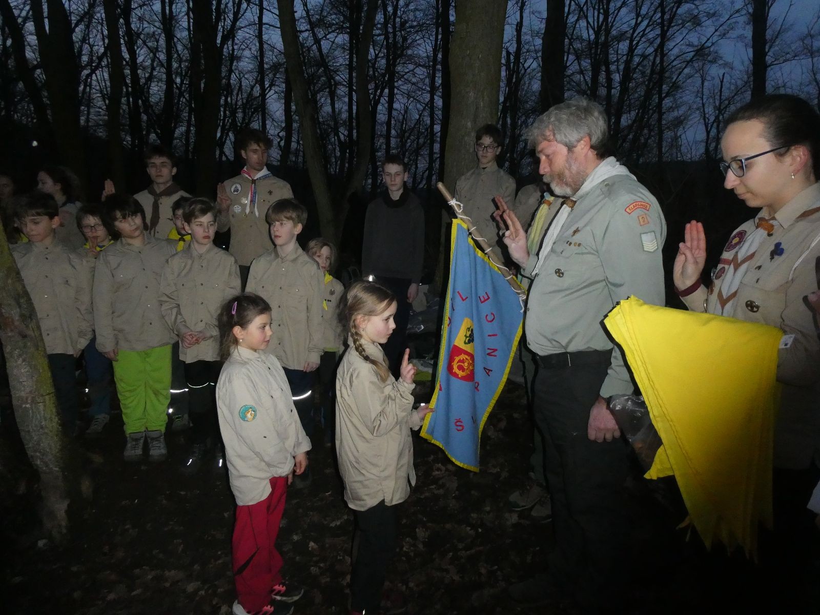 Pak už jsme vyrazili rovnou na zříceninu Horákovského hradu.Tradiční vlajkovanou jsme tentokrát vynechali, abychom se před slavnostním ohněm všichni nevyváleli v blátě. Letos u něj svůj slib skládalo 14 vlčat, 7 světlušek a 2 skauti. Také se rozdalo pár bobříků odvahy do družinky Lasiček, odborky bosých nohou a nočního bdění pro Sovičky a jedna odborka Tetrisáře pro Bětku. Potom byl slavnostní oheň prohlášen za oheň užitkový, tak jsme si na něm všichni opekli nějaký ten špekáček, zazpívali si s Jurovou kytarou a nechyběla ani každoroční jarní přáníčka.