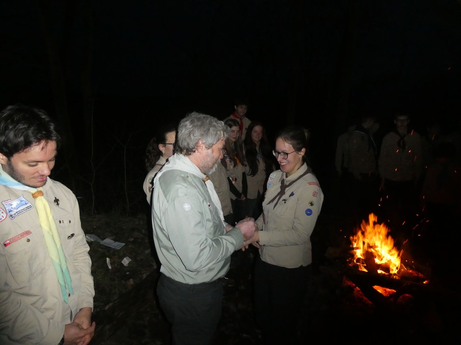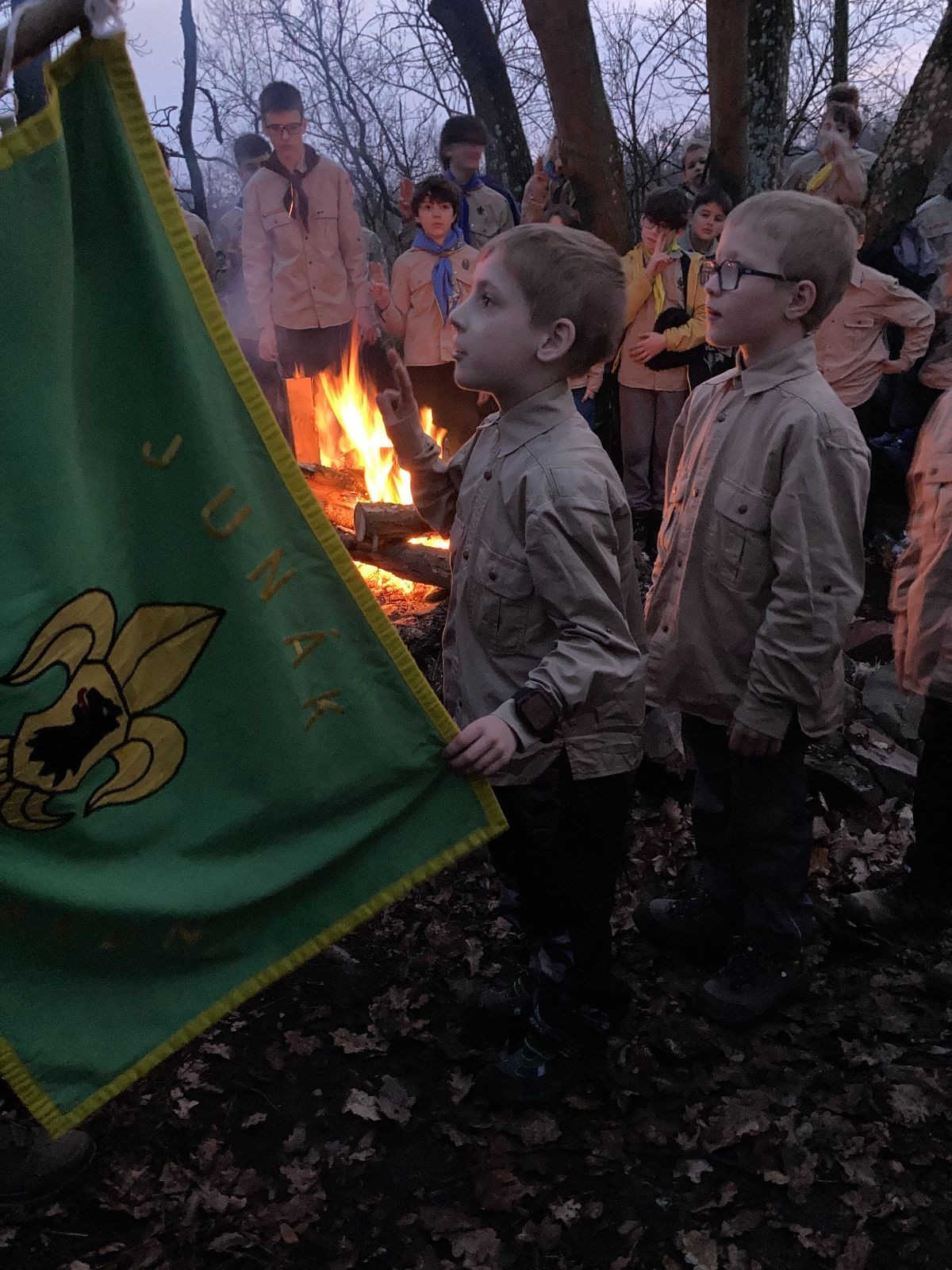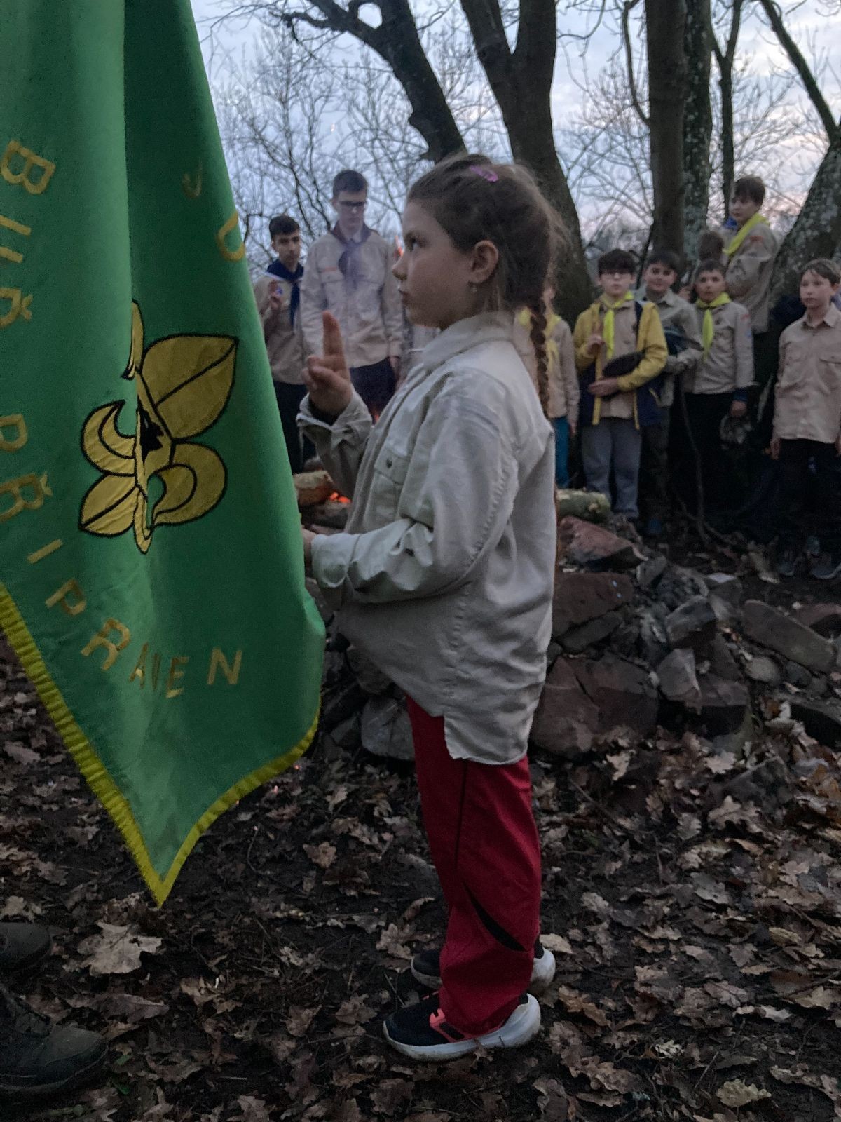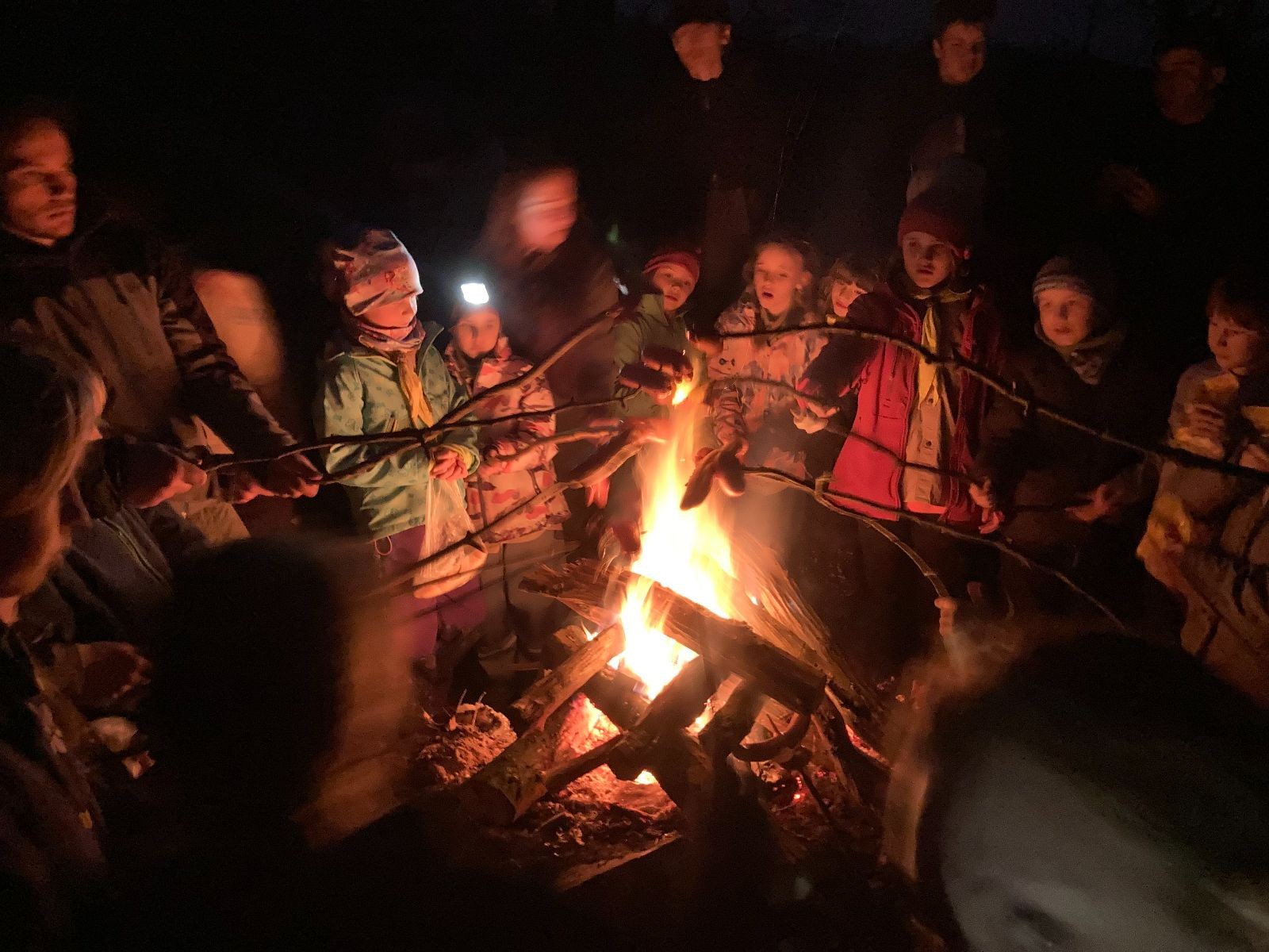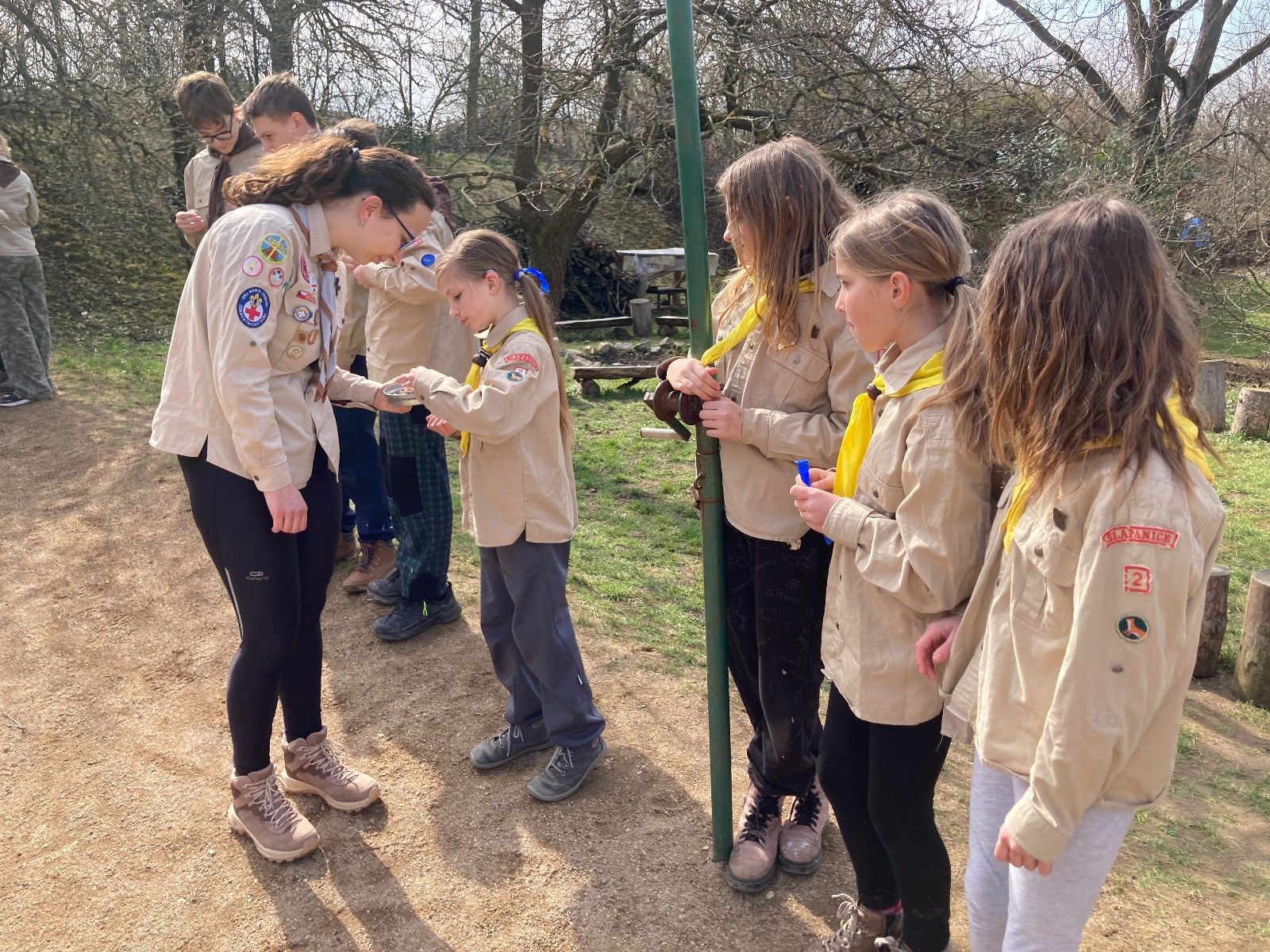 Pak už jsme vyrazili rovnou na zříceninu Horákovského hradu.Tradiční vlajkovanou jsme tentokrát vynechali, abychom se před slavnostním ohněm všichni nevyváleli v blátě. Letos u něj svůj slib skládalo 14 vlčat, 7 světlušek a 2 skauti. Také se rozdalo pár bobříků odvahy do družinky Lasiček, odborky bosých nohou a nočního bdění pro Sovičky a jedna odborka Tetrisáře pro Bětku. Potom byl slavnostní oheň prohlášen za oheň užitkový, tak jsme si na něm všichni opekli nějaký ten špekáček, zazpívali si s Jurovou kytarou a nechyběla ani každoroční jarní přáníčka.
