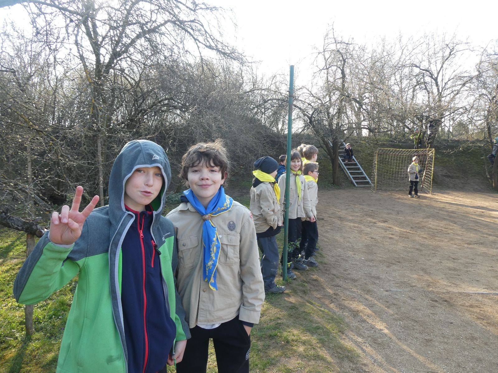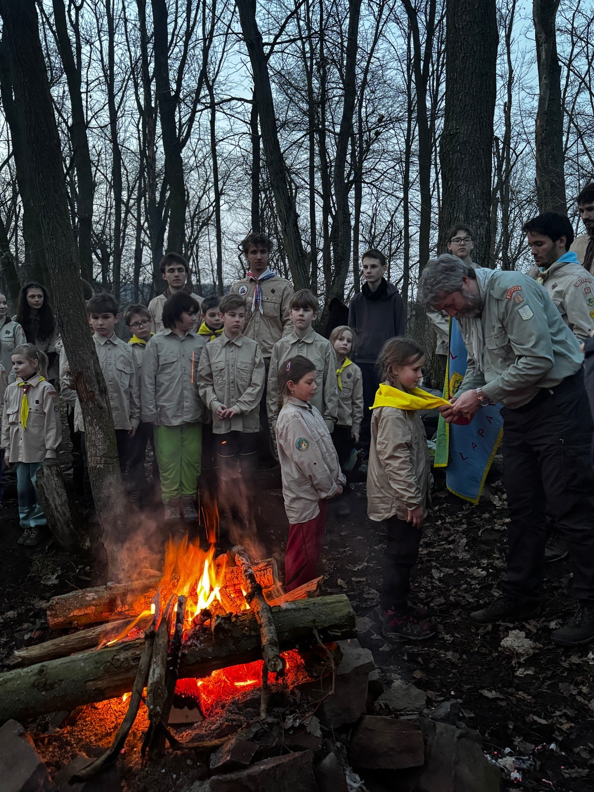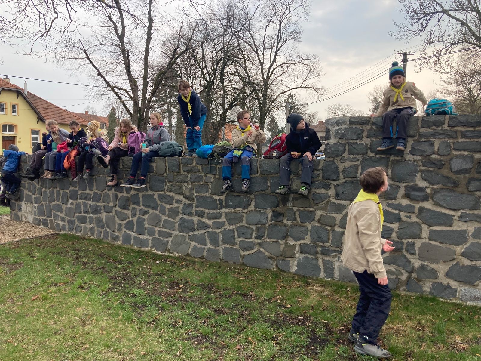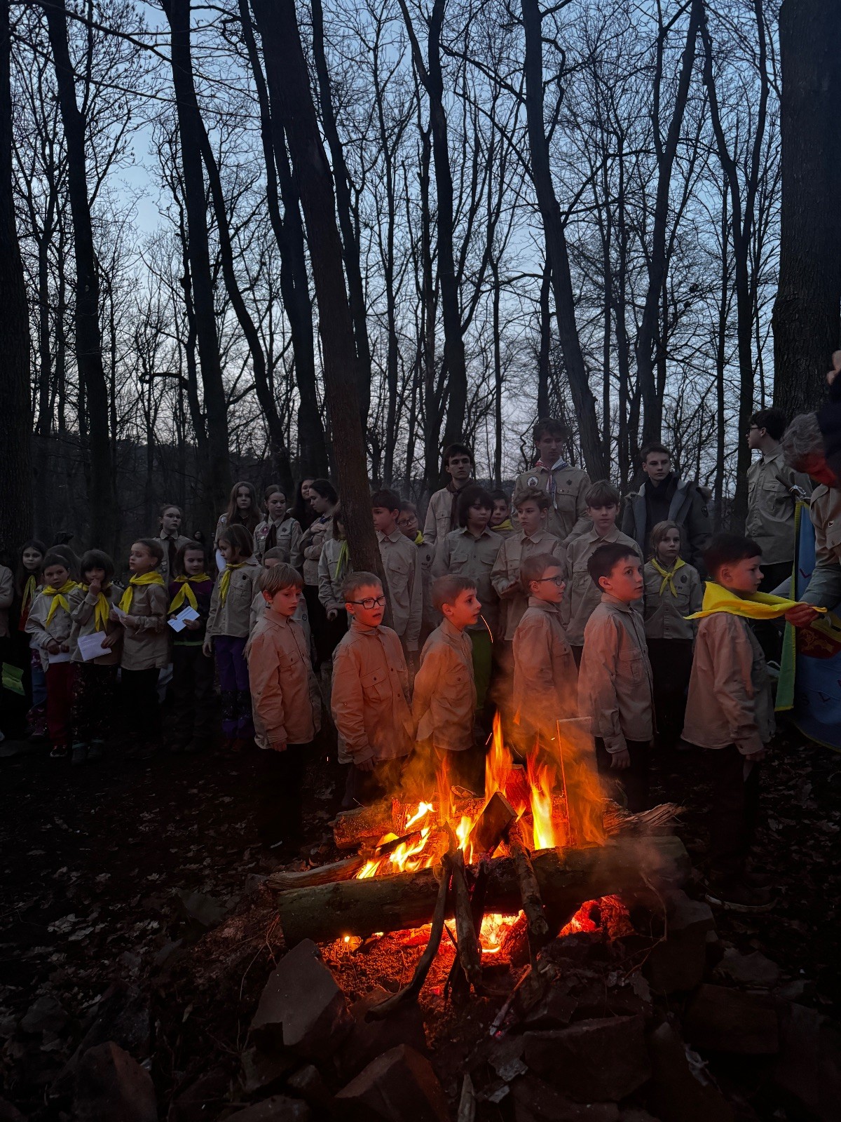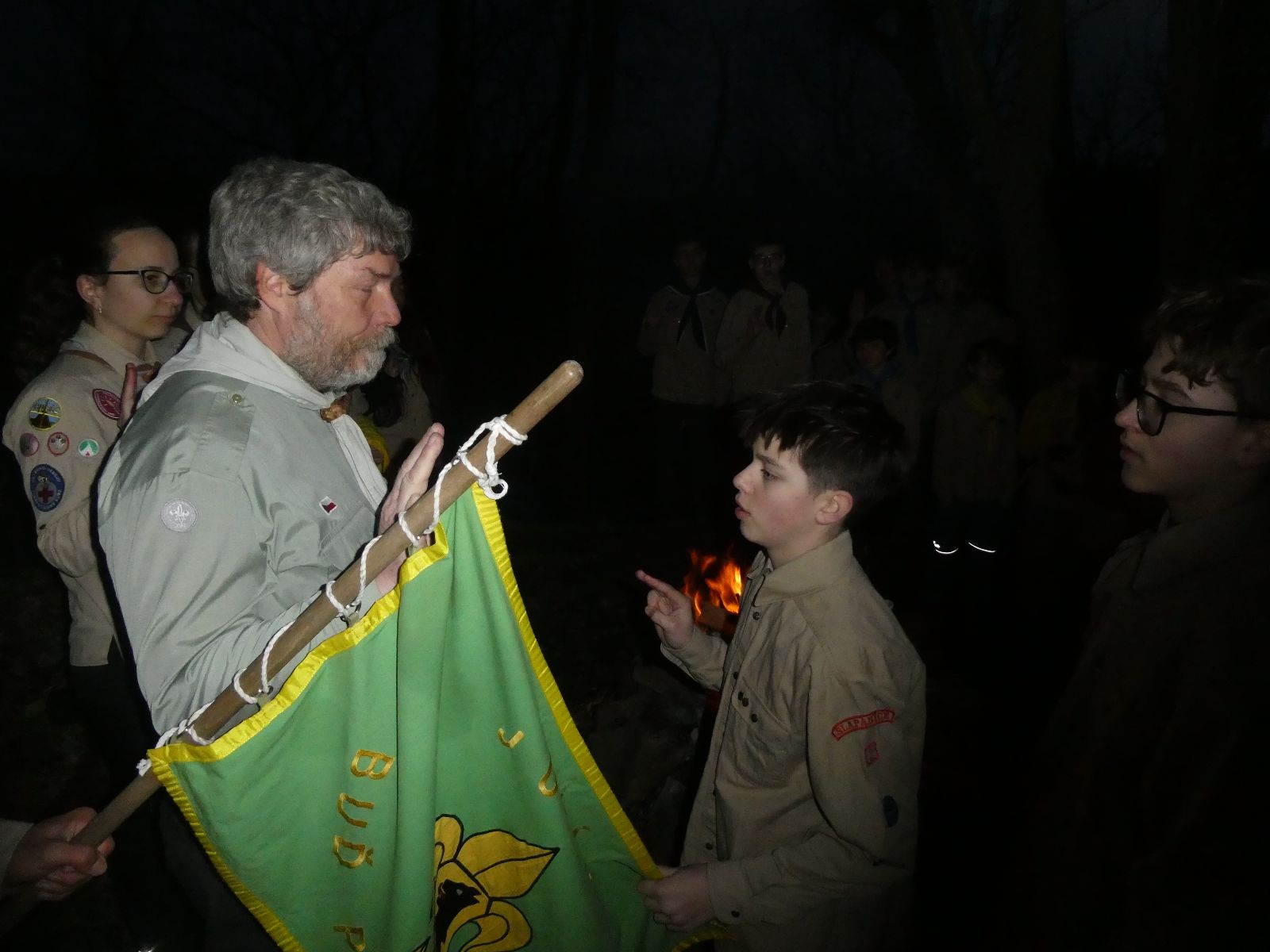 Pak už jsme vyrazili rovnou na zříceninu Horákovského hradu.Tradiční vlajkovanou jsme tentokrát vynechali, abychom se před slavnostním ohněm všichni nevyváleli v blátě. Letos u něj svůj slib skládalo 14 vlčat, 7 světlušek a 2 skauti. Také se rozdalo pár bobříků odvahy do družinky Lasiček, odborky bosých nohou a nočního bdění pro Sovičky a jedna odborka Tetrisáře pro Bětku. Potom byl slavnostní oheň prohlášen za oheň užitkový, tak jsme si na něm všichni opekli nějaký ten špekáček, zazpívali si s Jurovou kytarou a nechyběla ani každoroční jarní přáníčka.