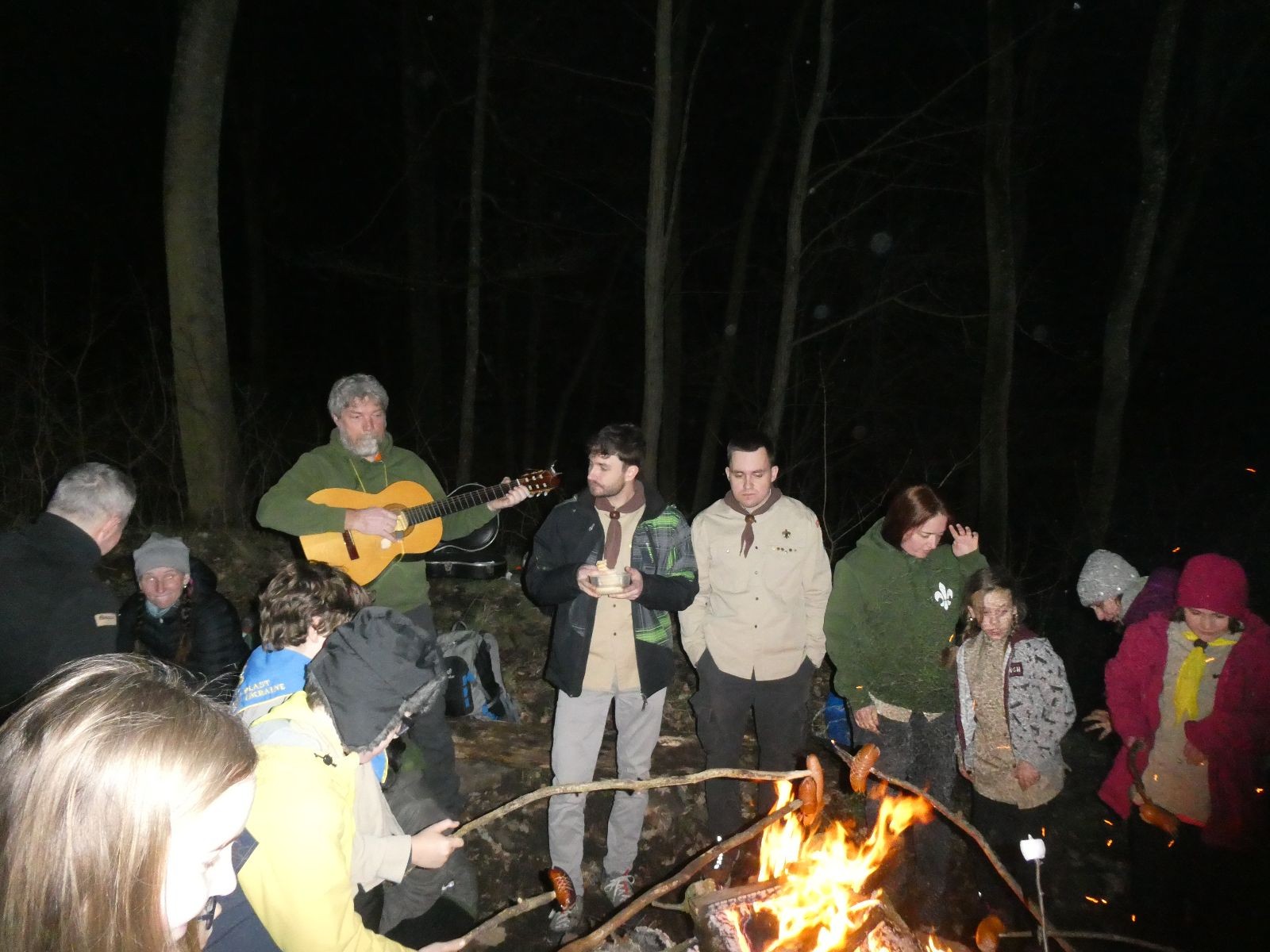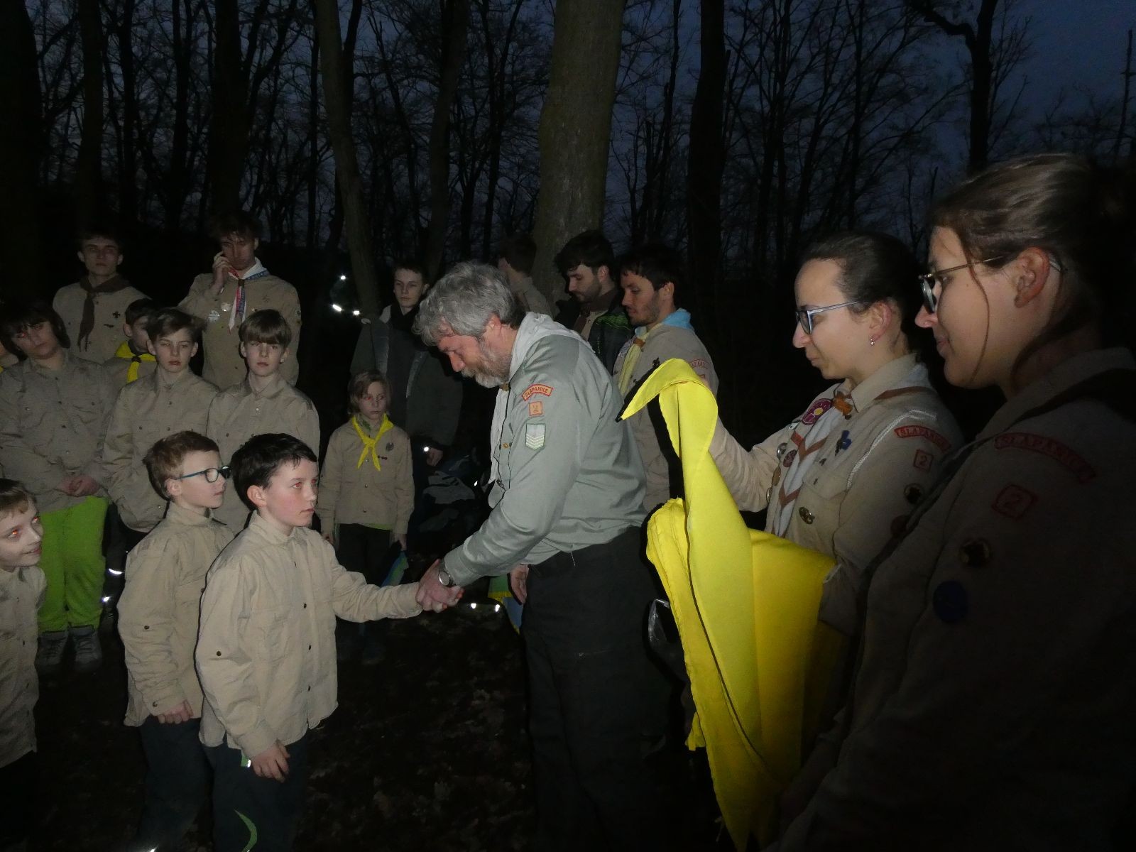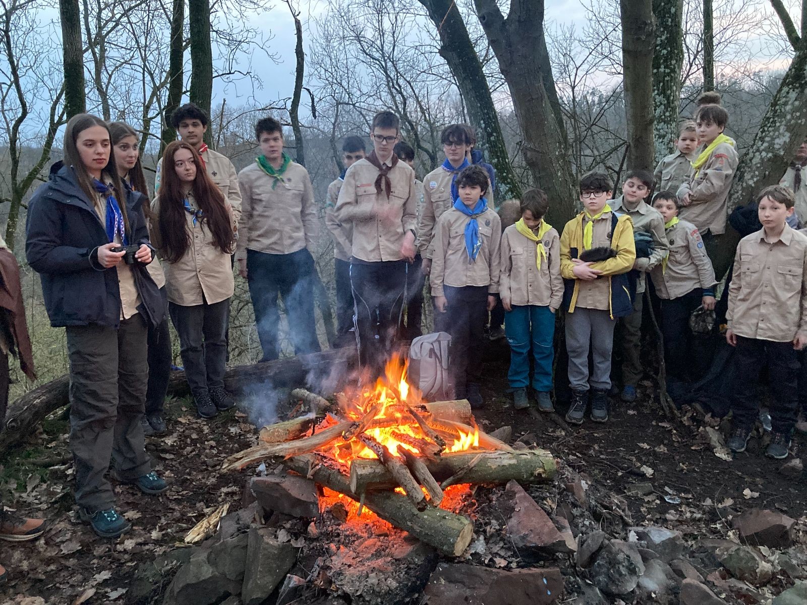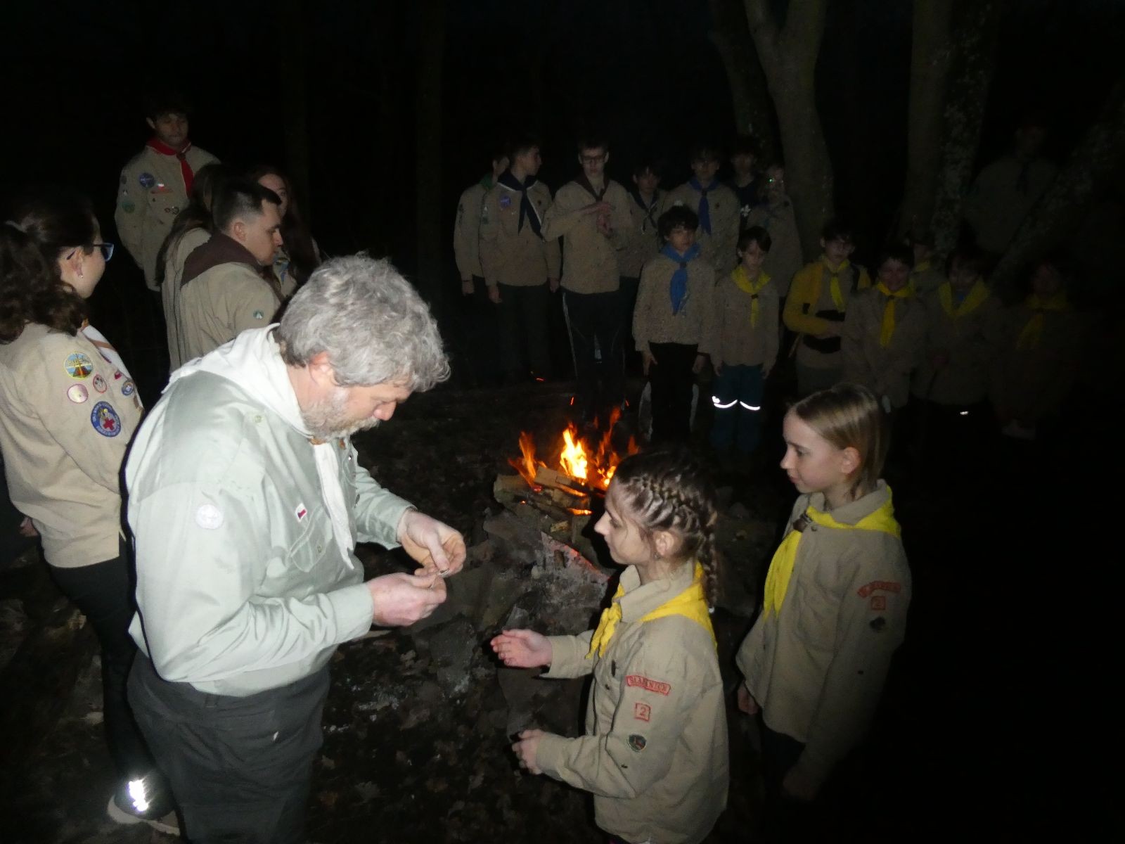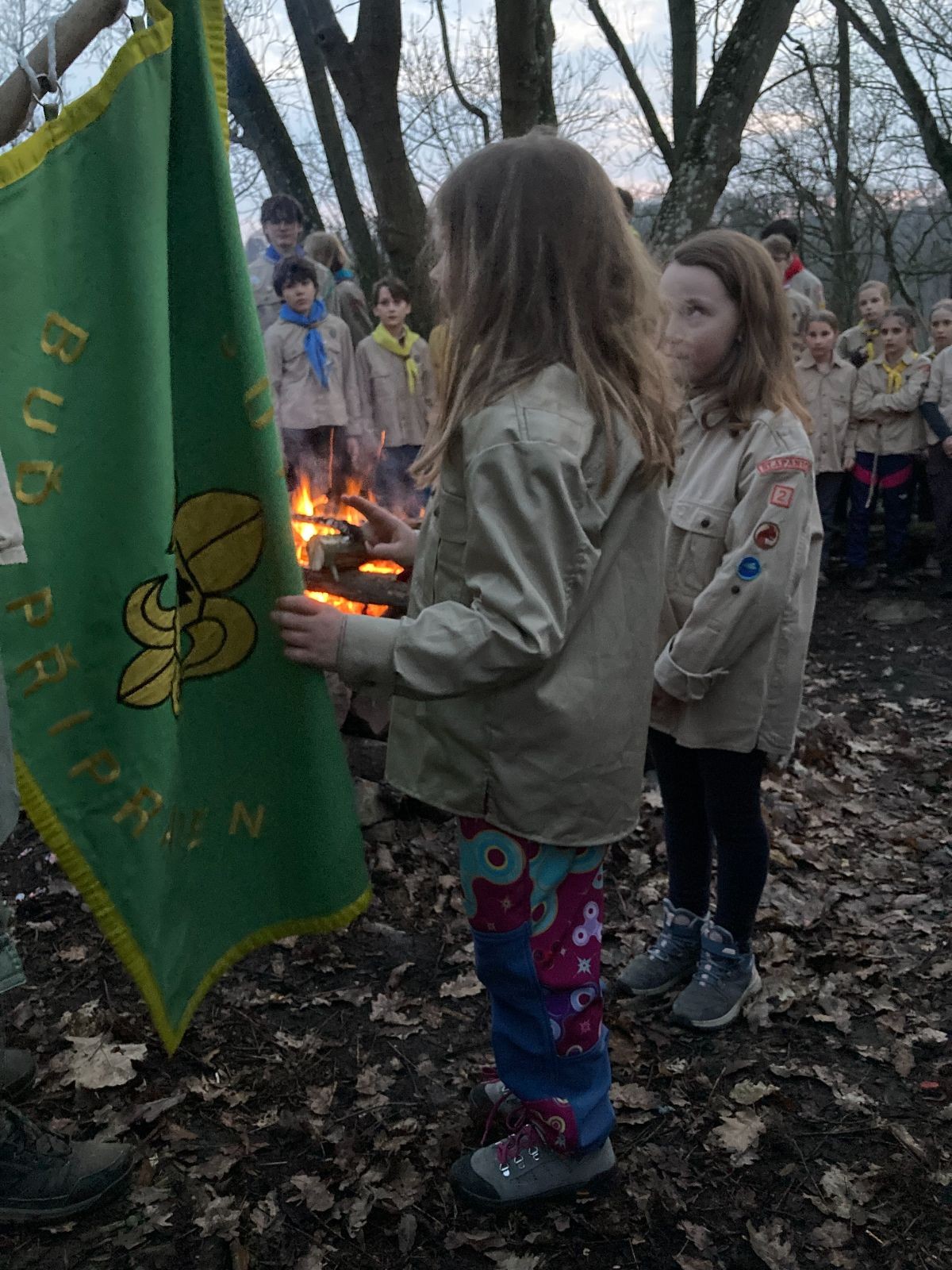 Pak už jsme vyrazili rovnou na zříceninu Horákovského hradu.Tradiční vlajkovanou jsme tentokrát vynechali, abychom se před slavnostním ohněm všichni nevyváleli v blátě. Letos u něj svůj slib skládalo 14 vlčat, 7 světlušek a 2 skauti. Také se rozdalo pár bobříků odvahy do družinky Lasiček, odborky bosých nohou a nočního bdění pro Sovičky a jedna odborka Tetrisáře pro Bětku. Potom byl slavnostní oheň prohlášen za oheň užitkový, tak jsme si na něm všichni opekli nějaký ten špekáček, zazpívali si s Jurovou kytarou a nechyběla ani každoroční jarní přáníčka.