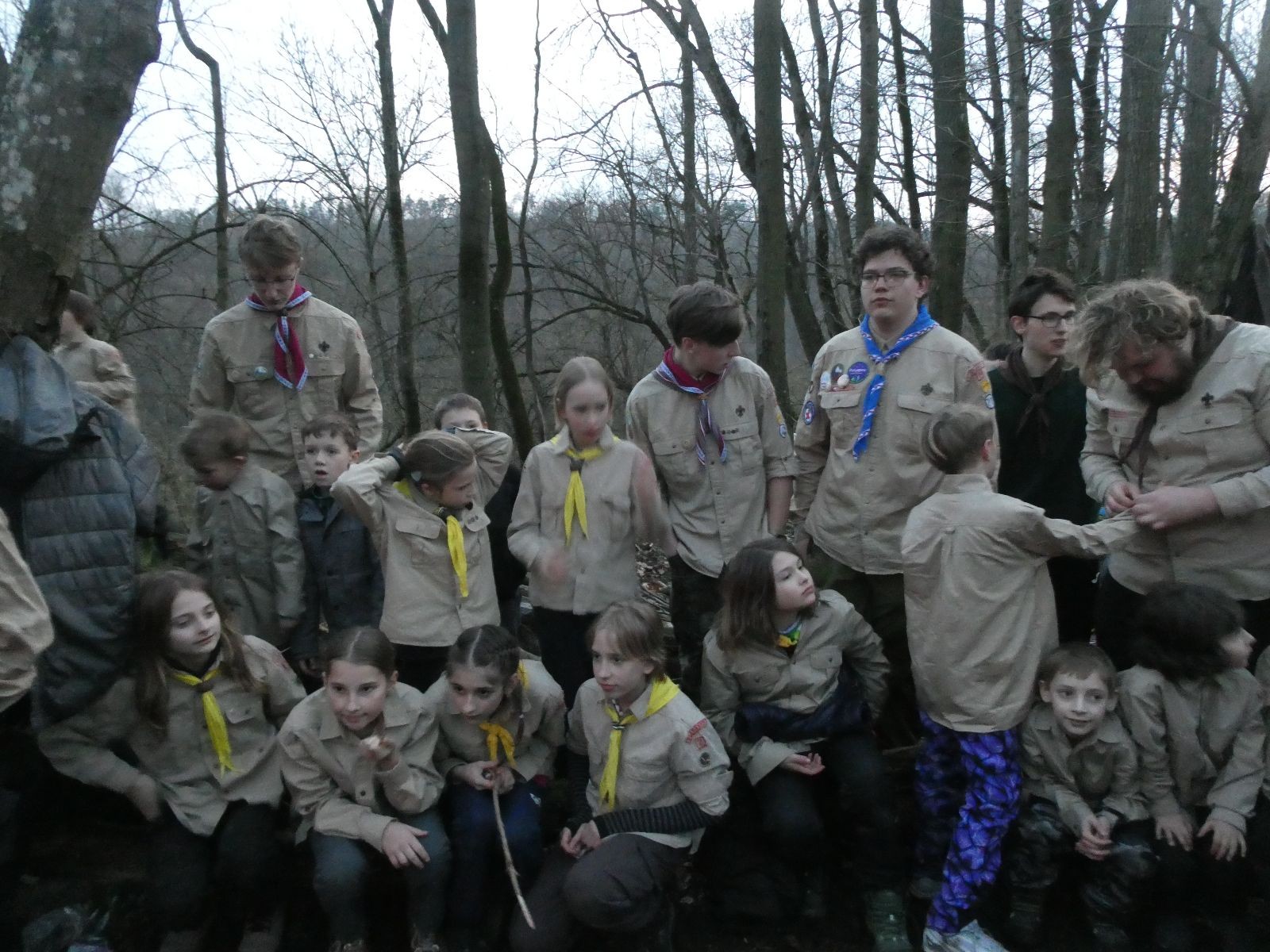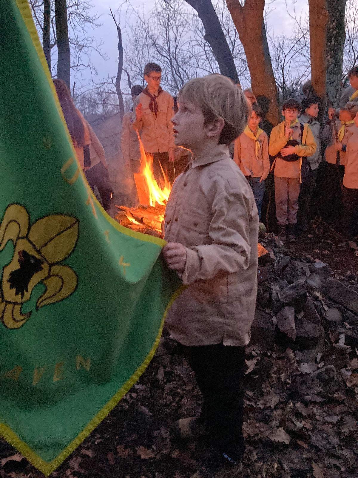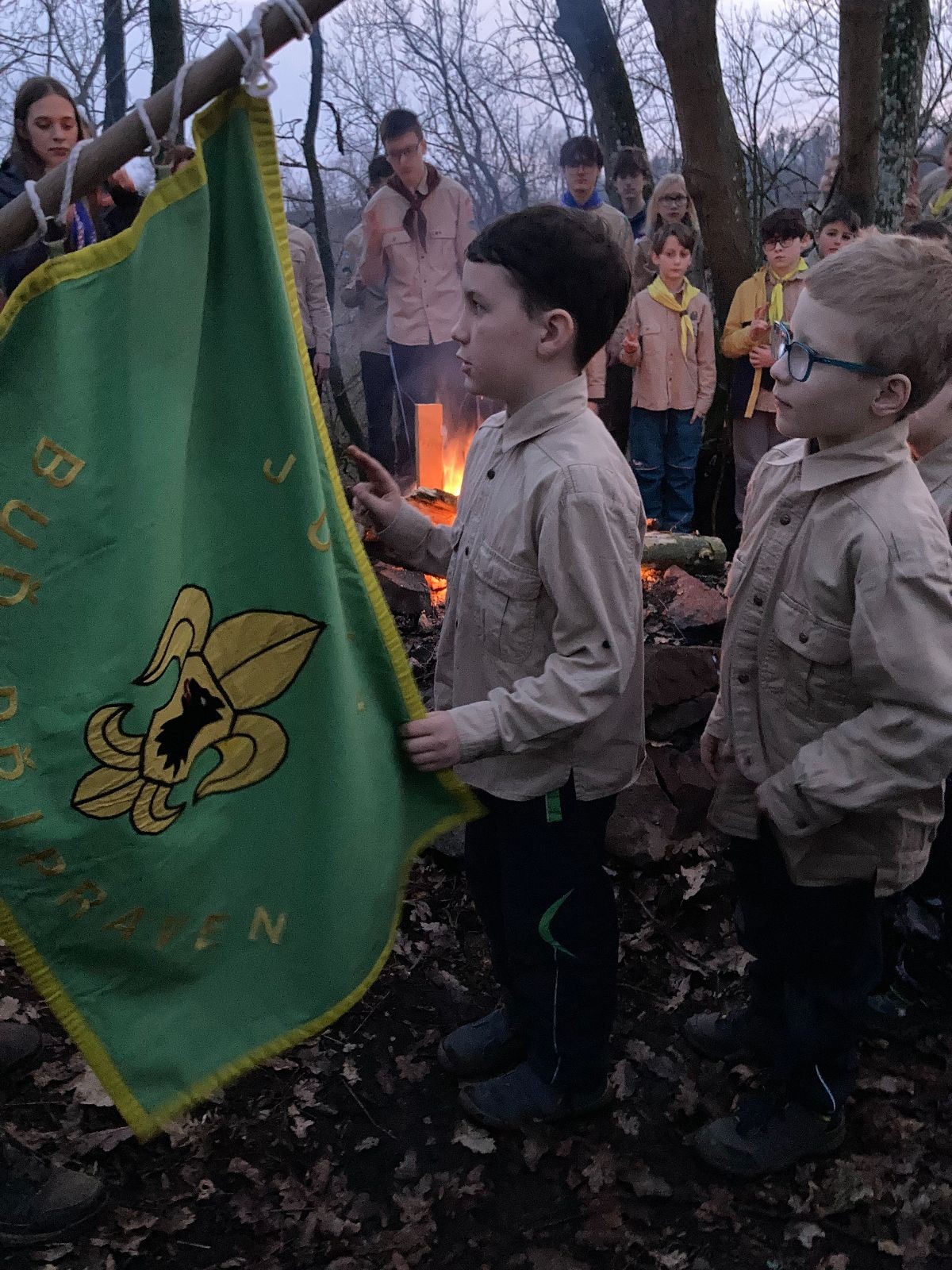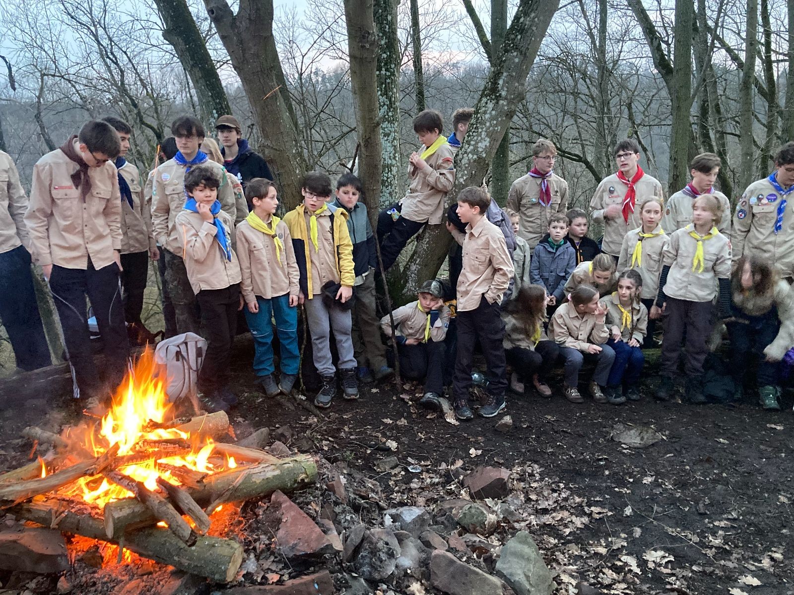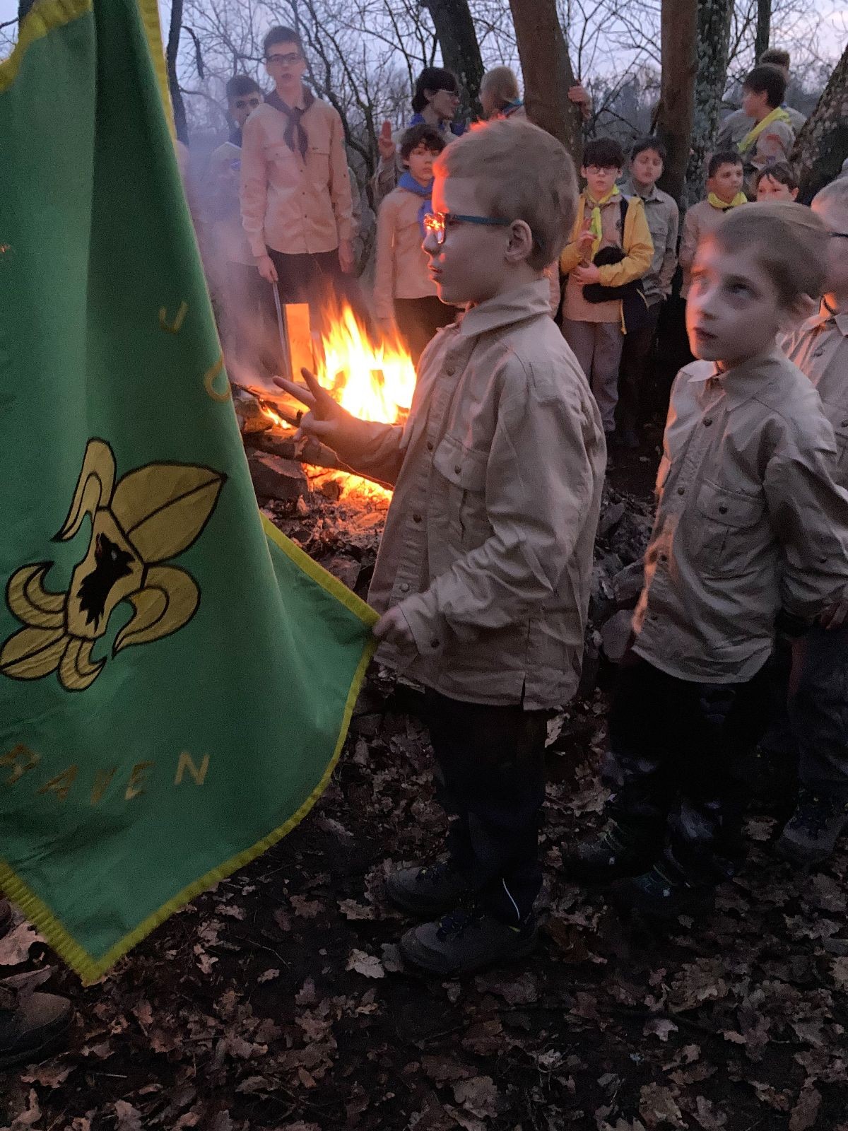 Pak už jsme vyrazili rovnou na zříceninu Horákovského hradu.Tradiční vlajkovanou jsme tentokrát vynechali, abychom se před slavnostním ohněm všichni nevyváleli v blátě. Letos u něj svůj slib skládalo 14 vlčat, 7 světlušek a 2 skauti. Také se rozdalo pár bobříků odvahy do družinky Lasiček, odborky bosých nohou a nočního bdění pro Sovičky a jedna odborka Tetrisáře pro Bětku. Potom byl slavnostní oheň prohlášen za oheň užitkový, tak jsme si na něm všichni opekli nějaký ten špekáček, zazpívali si s Jurovou kytarou a nechyběla ani každoroční jarní přáníčka.