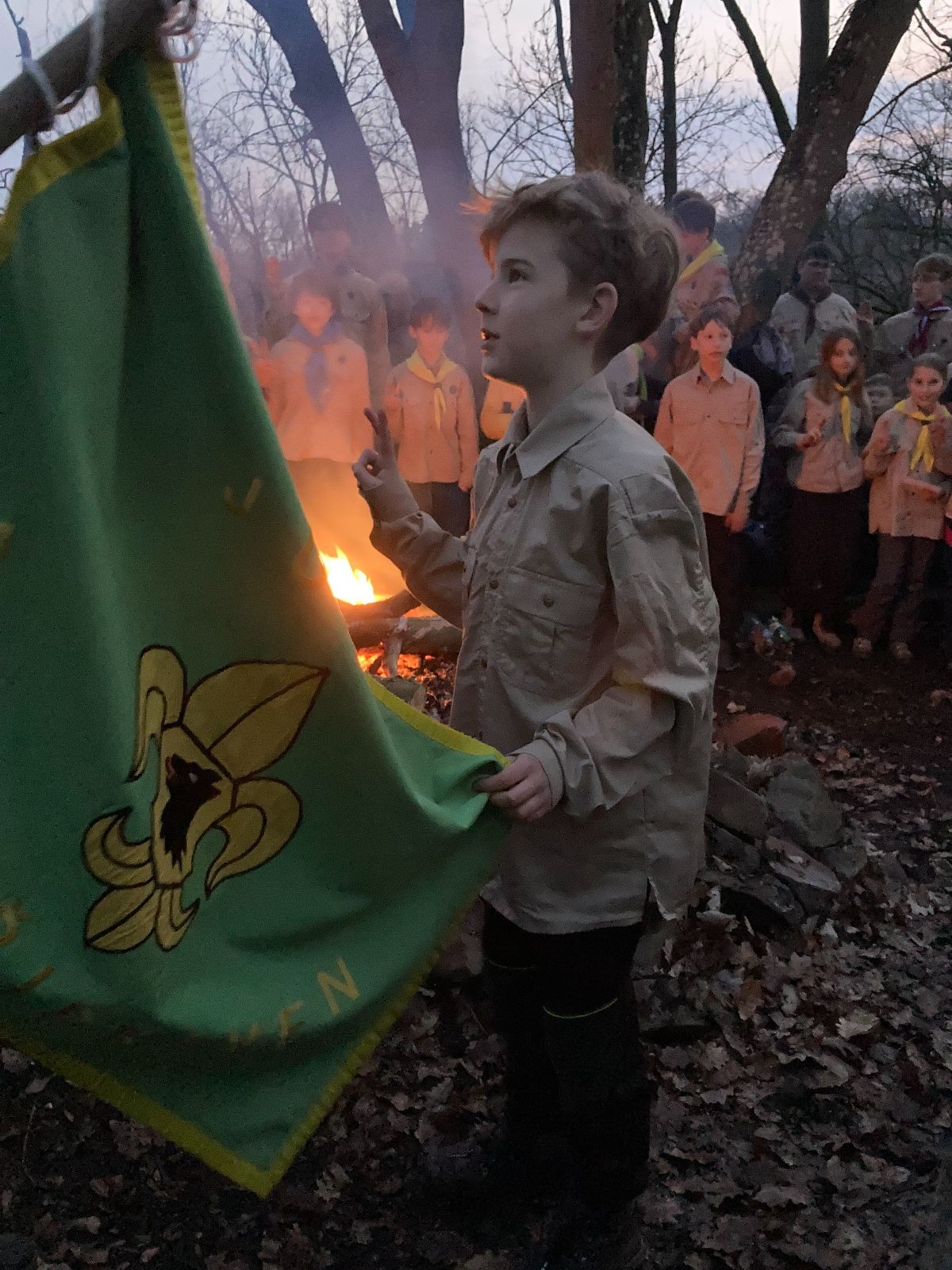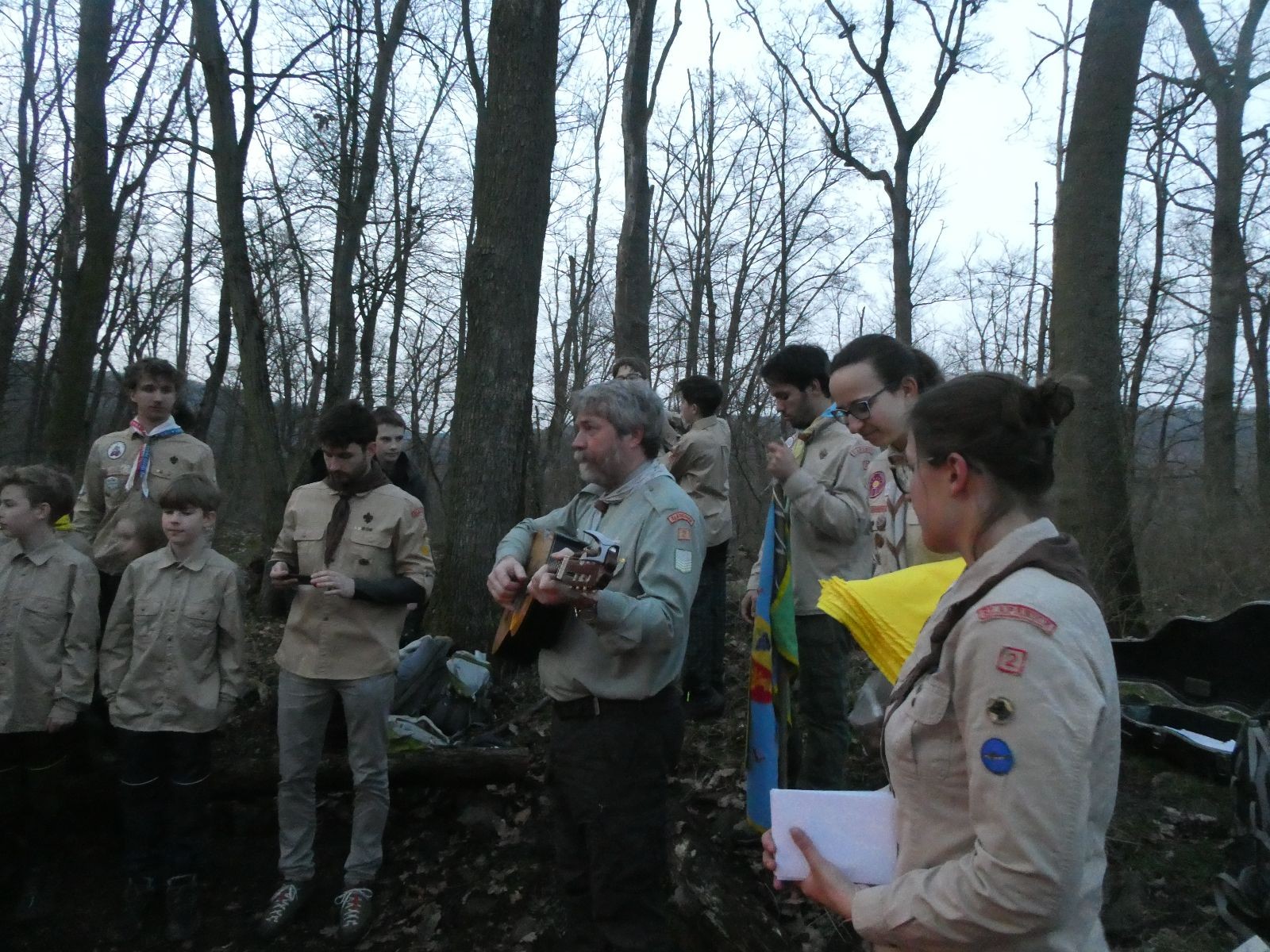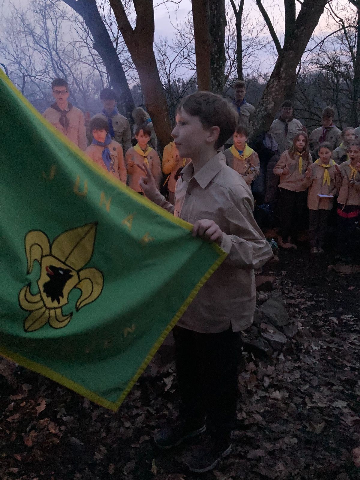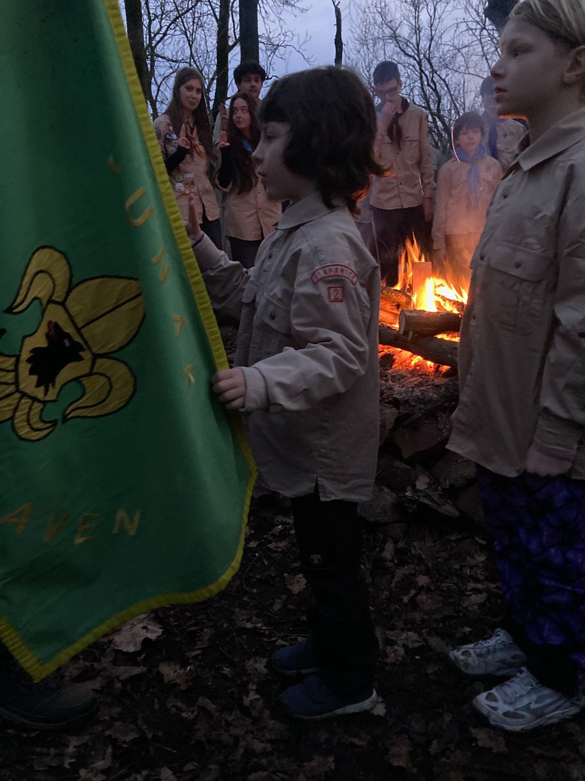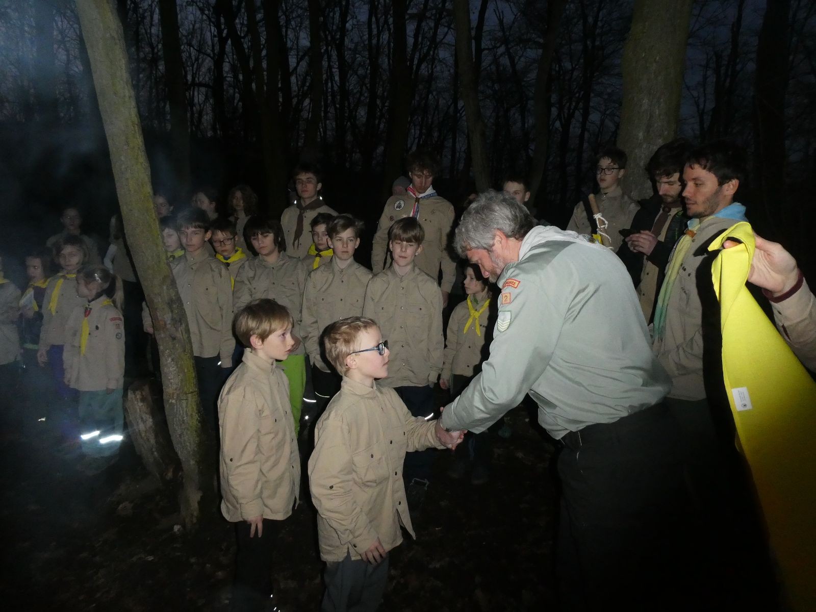 Pak už jsme vyrazili rovnou na zříceninu Horákovského hradu.Tradiční vlajkovanou jsme tentokrát vynechali, abychom se před slavnostním ohněm všichni nevyváleli v blátě. Letos u něj svůj slib skládalo 14 vlčat, 7 světlušek a 2 skauti. Také se rozdalo pár bobříků odvahy do družinky Lasiček, odborky bosých nohou a nočního bdění pro Sovičky a jedna odborka Tetrisáře pro Bětku. Potom byl slavnostní oheň prohlášen za oheň užitkový, tak jsme si na něm všichni opekli nějaký ten špekáček, zazpívali si s Jurovou kytarou a nechyběla ani každoroční jarní přáníčka.