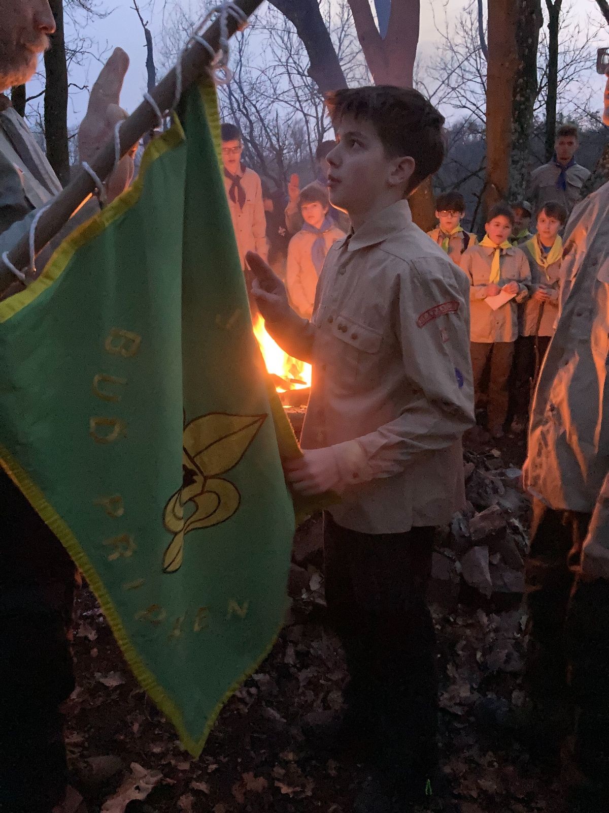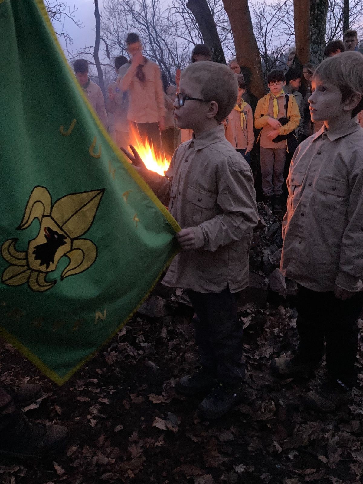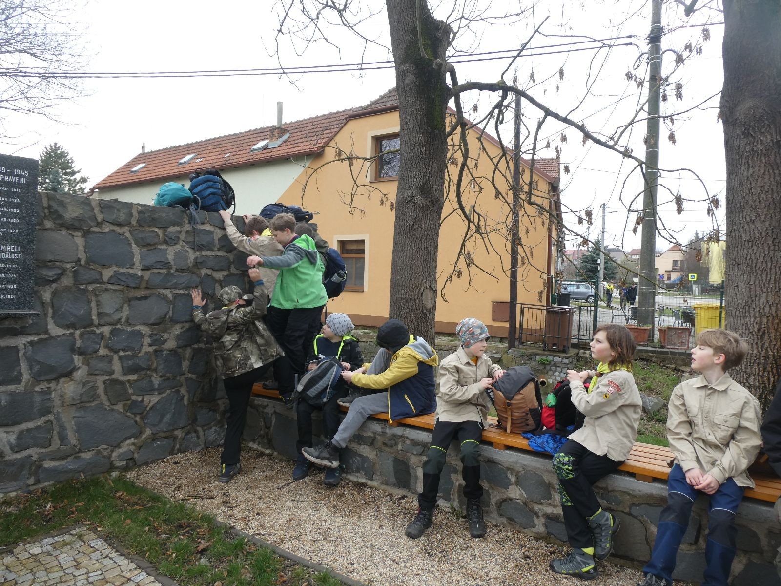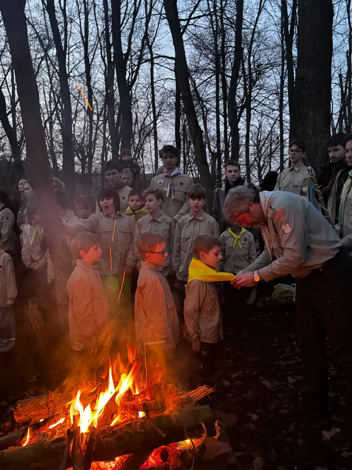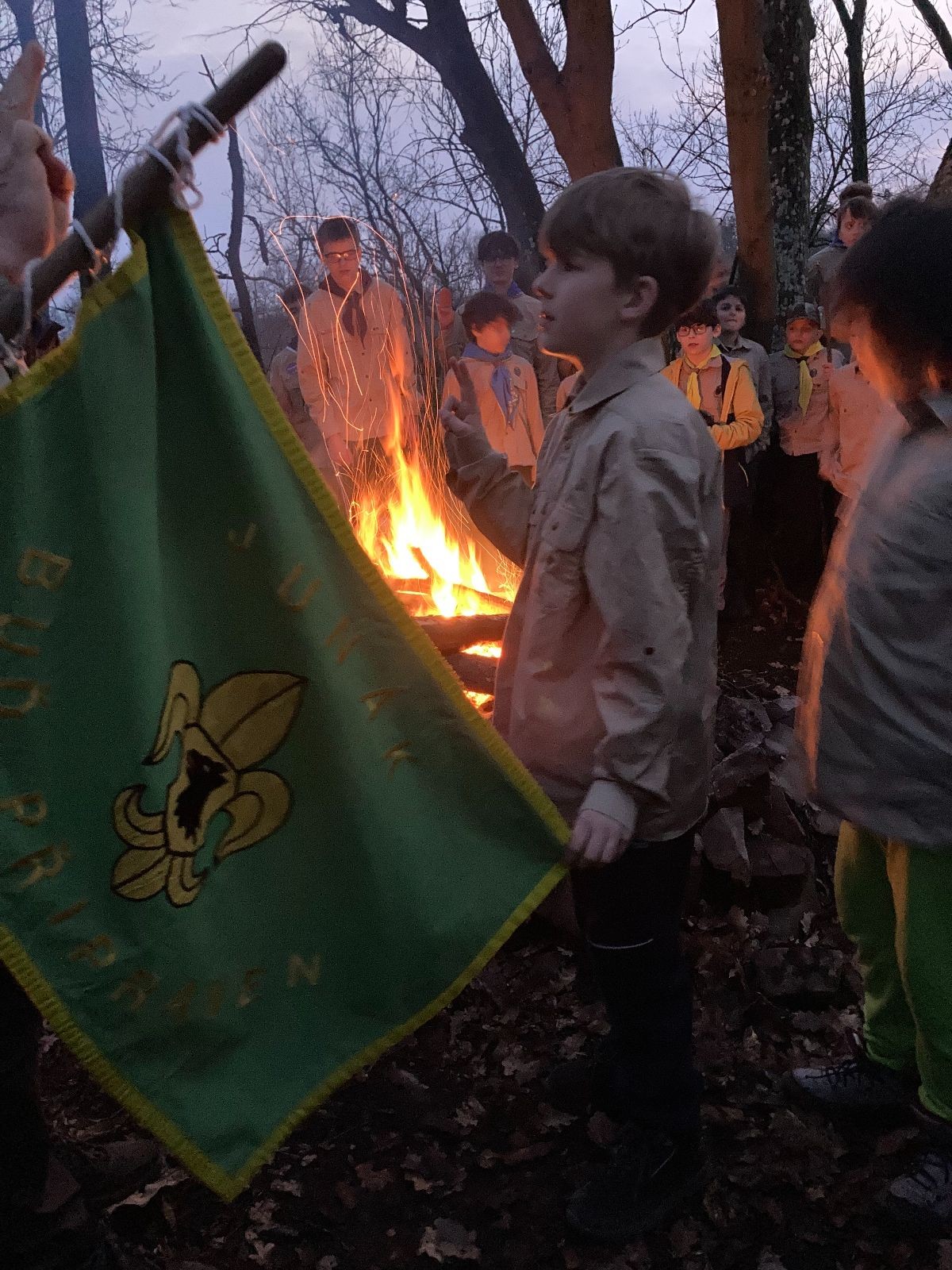 Pak už jsme vyrazili rovnou na zříceninu Horákovského hradu.Tradiční vlajkovanou jsme tentokrát vynechali, abychom se před slavnostním ohněm všichni nevyváleli v blátě. Letos u něj svůj slib skládalo 14 vlčat, 7 světlušek a 2 skauti. Také se rozdalo pár bobříků odvahy do družinky Lasiček, odborky bosých nohou a nočního bdění pro Sovičky a jedna odborka Tetrisáře pro Bětku. Potom byl slavnostní oheň prohlášen za oheň užitkový, tak jsme si na něm všichni opekli nějaký ten špekáček, zazpívali si s Jurovou kytarou a nechyběla ani každoroční jarní přáníčka.