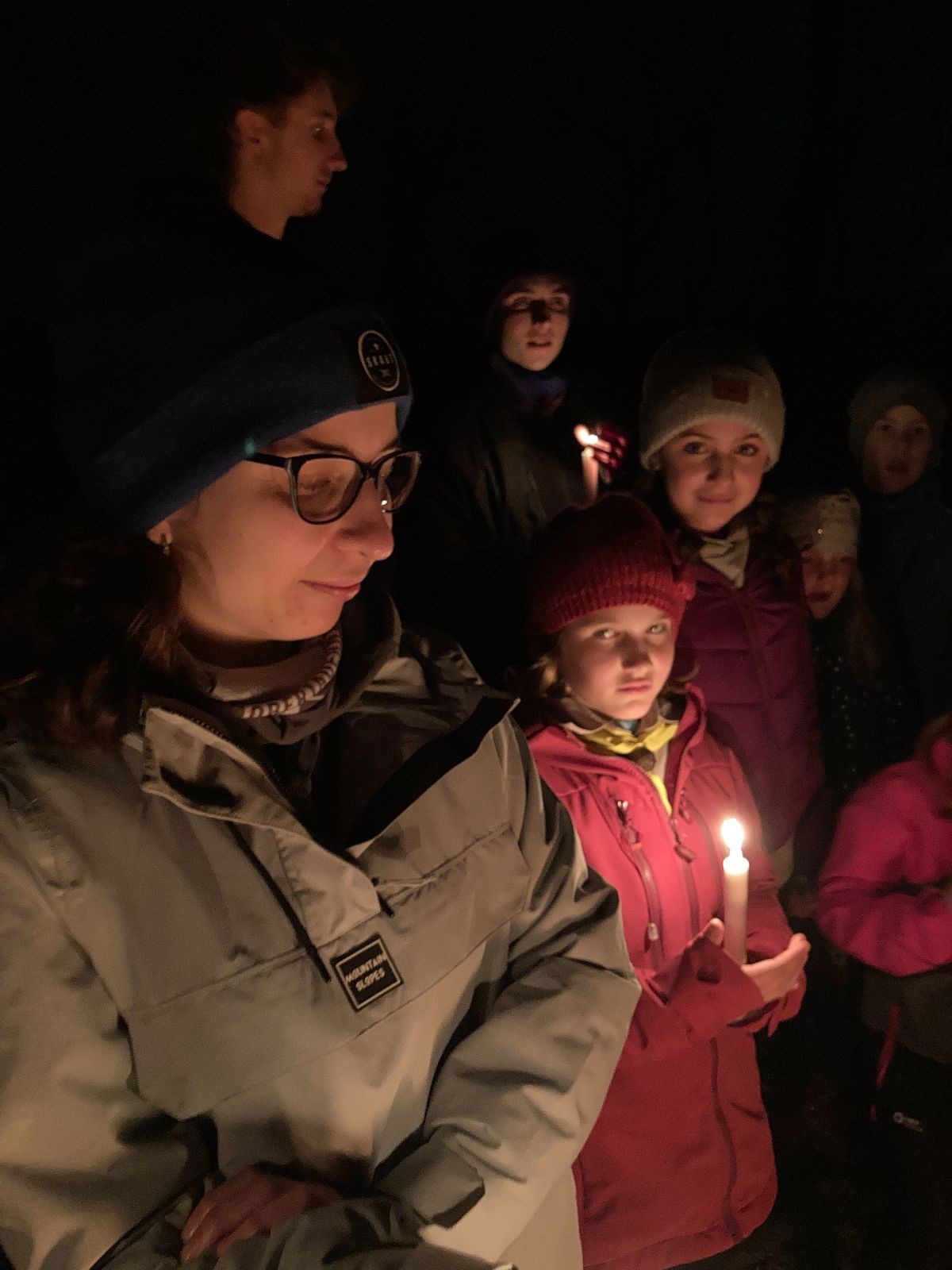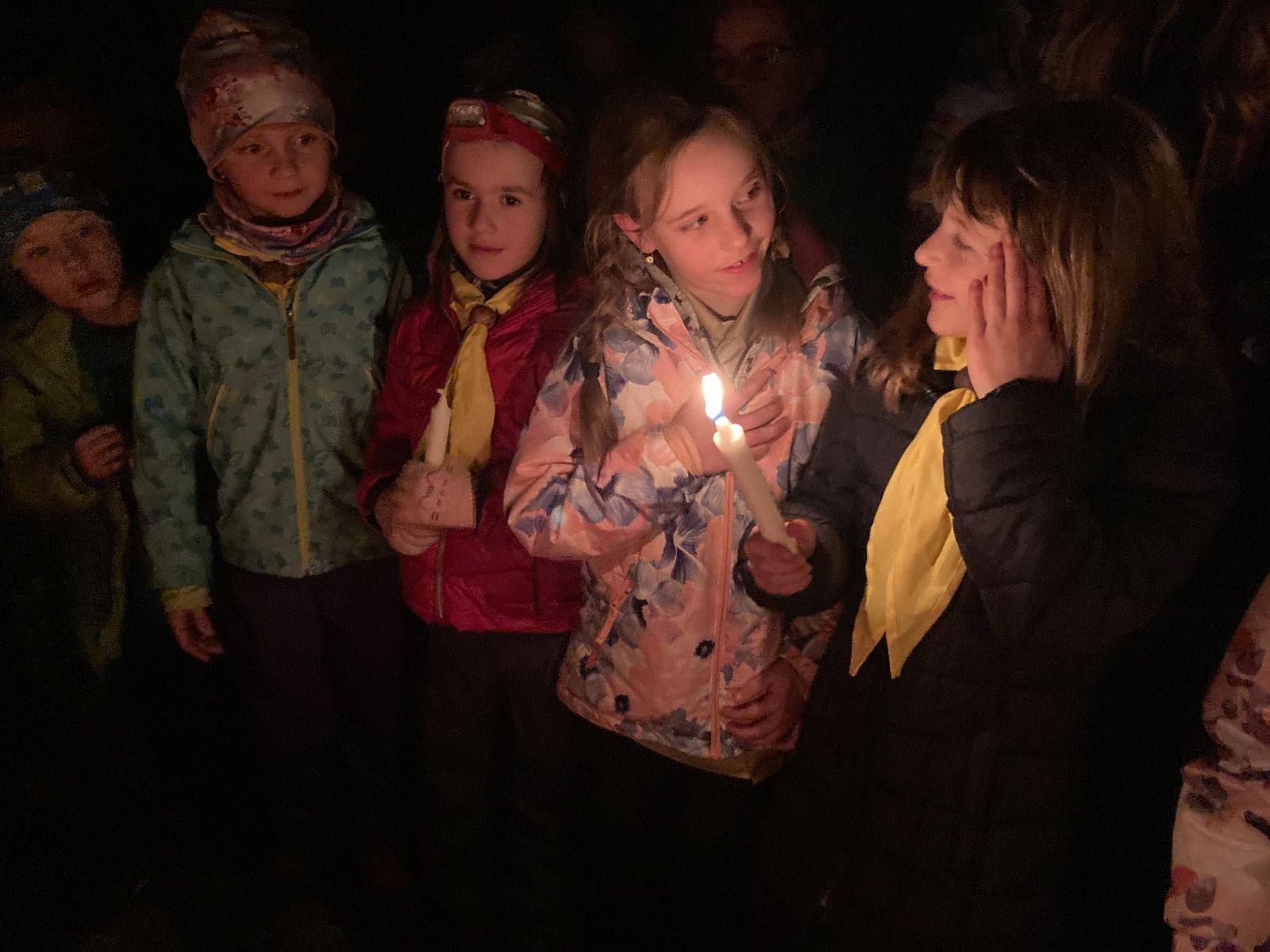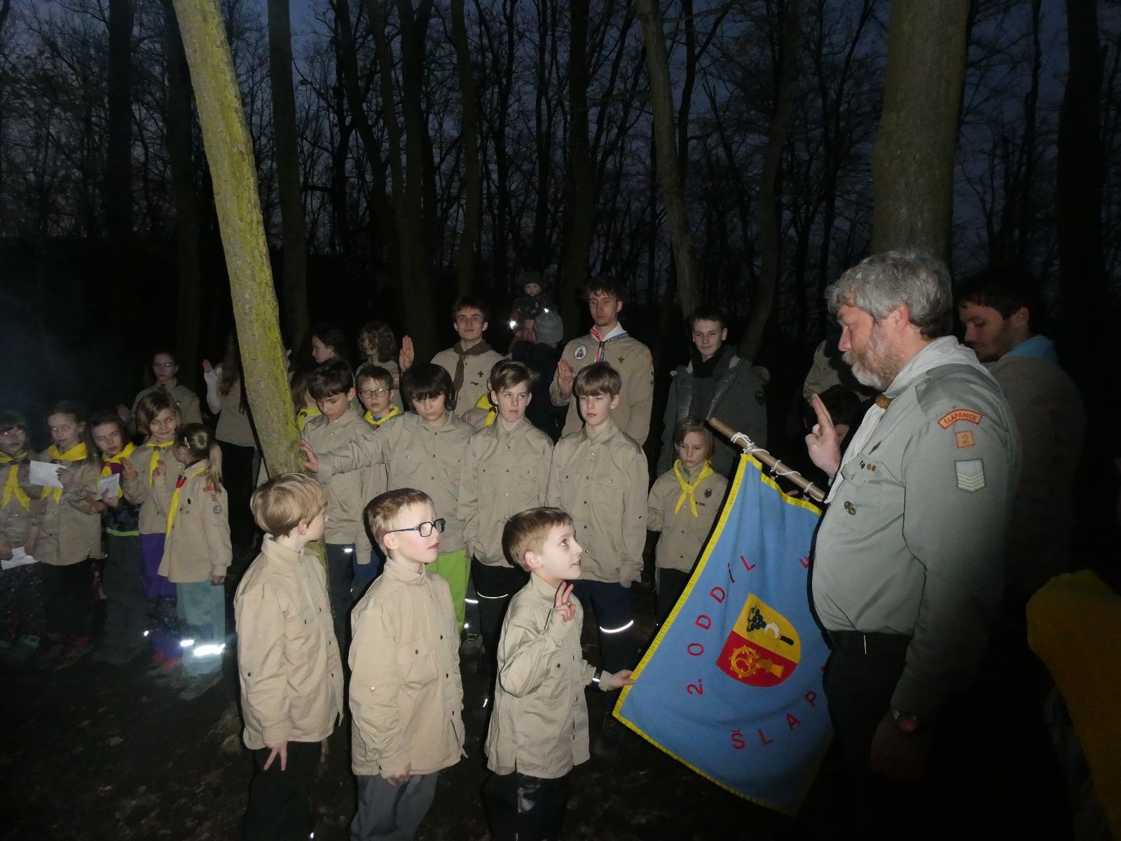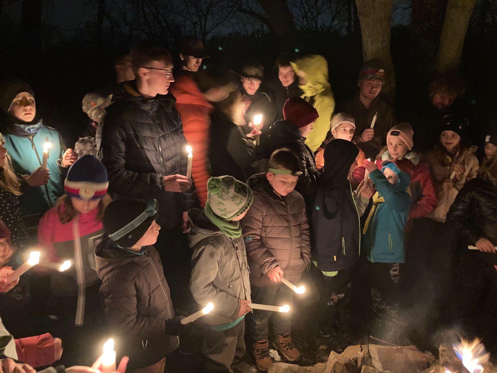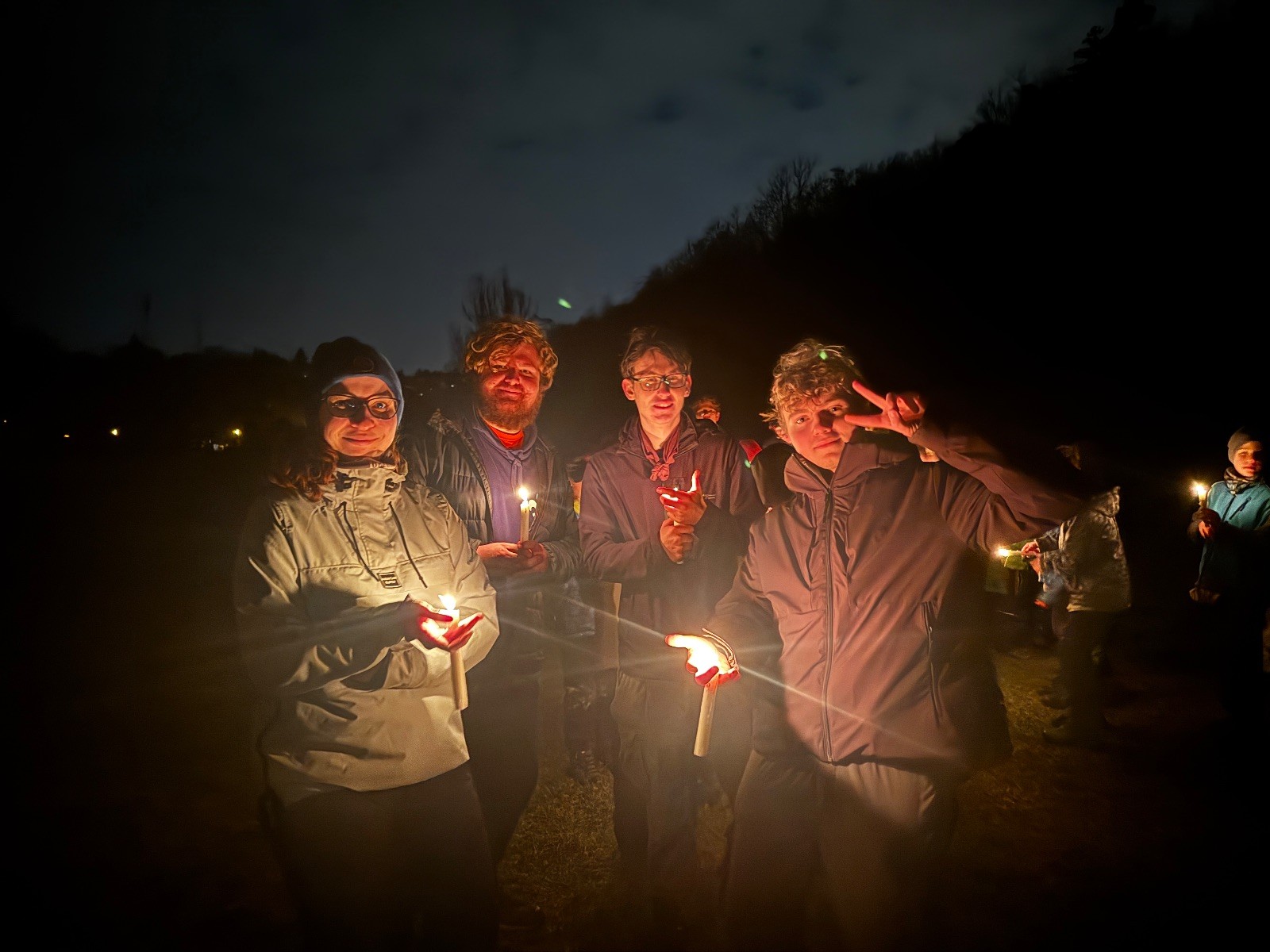 Poté jsme se už pomalu po tmě, nebo skoro po tmě (některým Lasičkám se povedlo donést si plamínek svíčky až do Šlapanic), vydali zpátky do naší vyhřáté Boudy. Po cestě samozřejmě nesměla chybět ani zastávka na sfoukávanou, kdy jednou vyhrál tým pod vedením Kapra, jednou tým pod vedením Vydrýska a poslední hru jsme dali všichni proti všem. Poslední část cesty pak utekla opravdu rychle a všichni jsme se už jen těšili jak se svýma uondanýma nožkama zalezeme do spacáků.