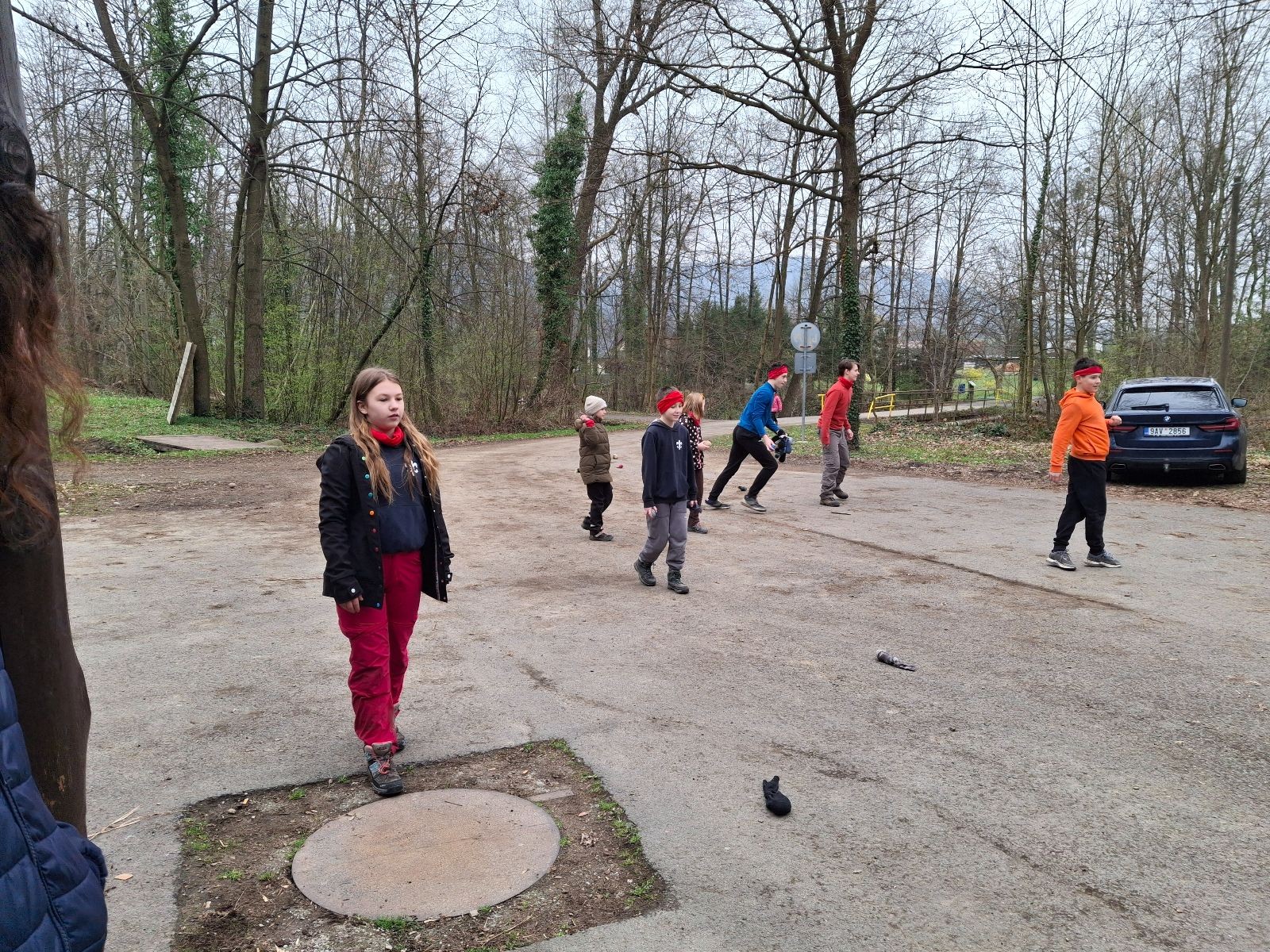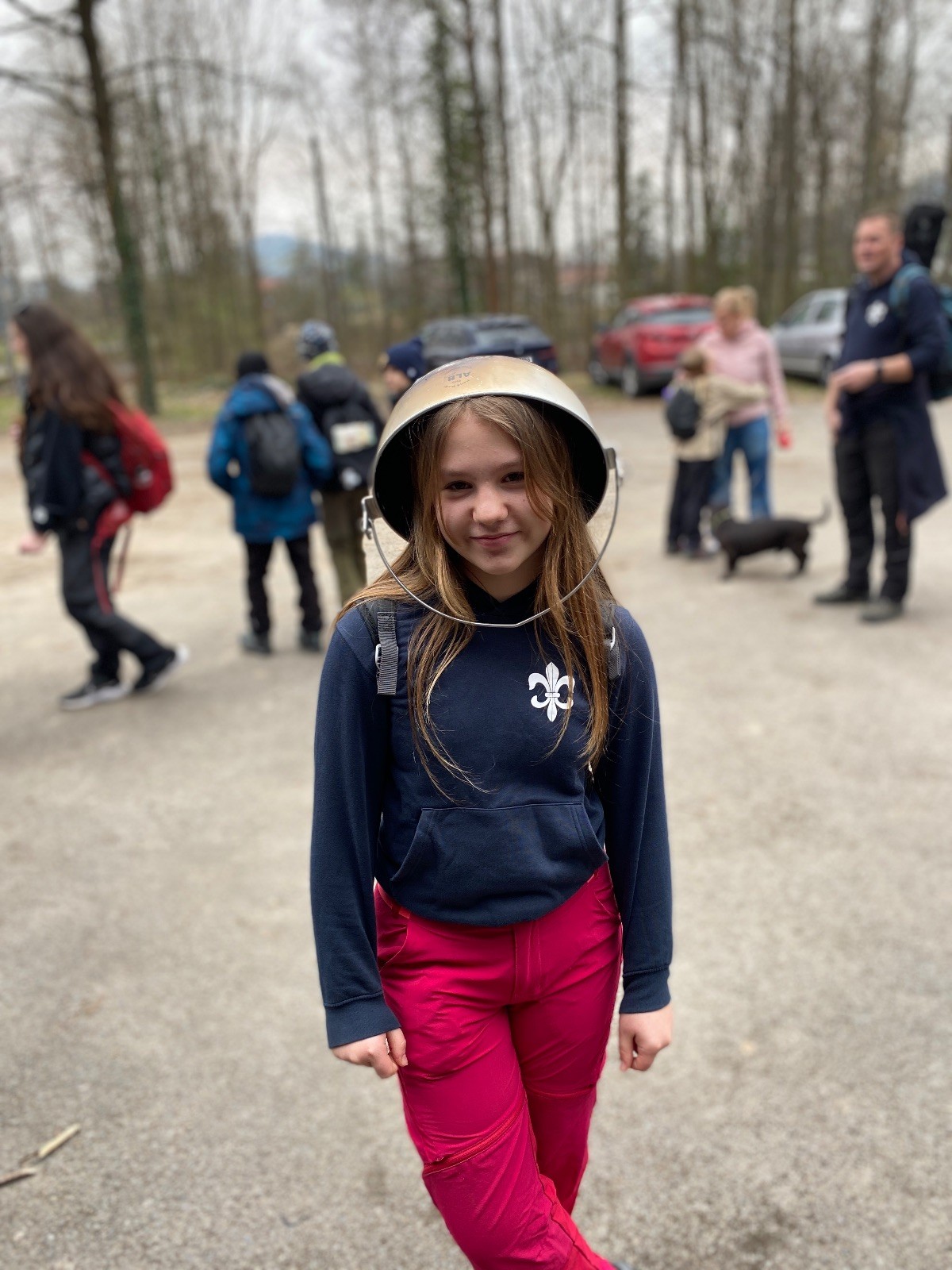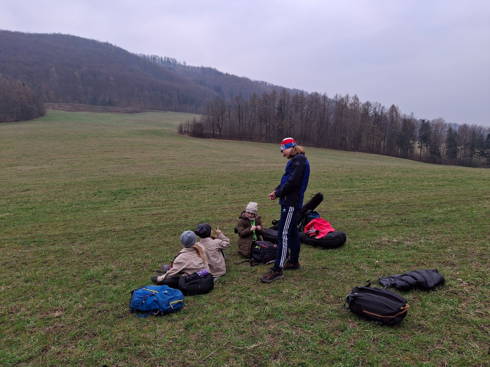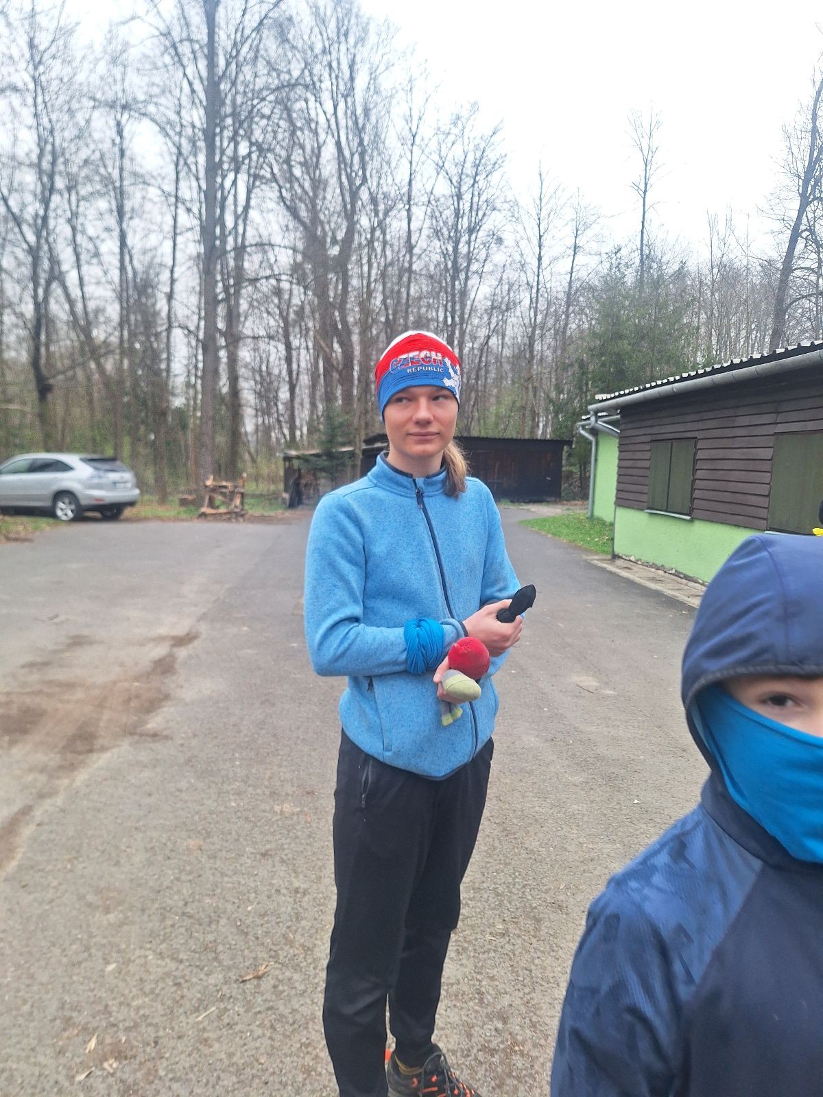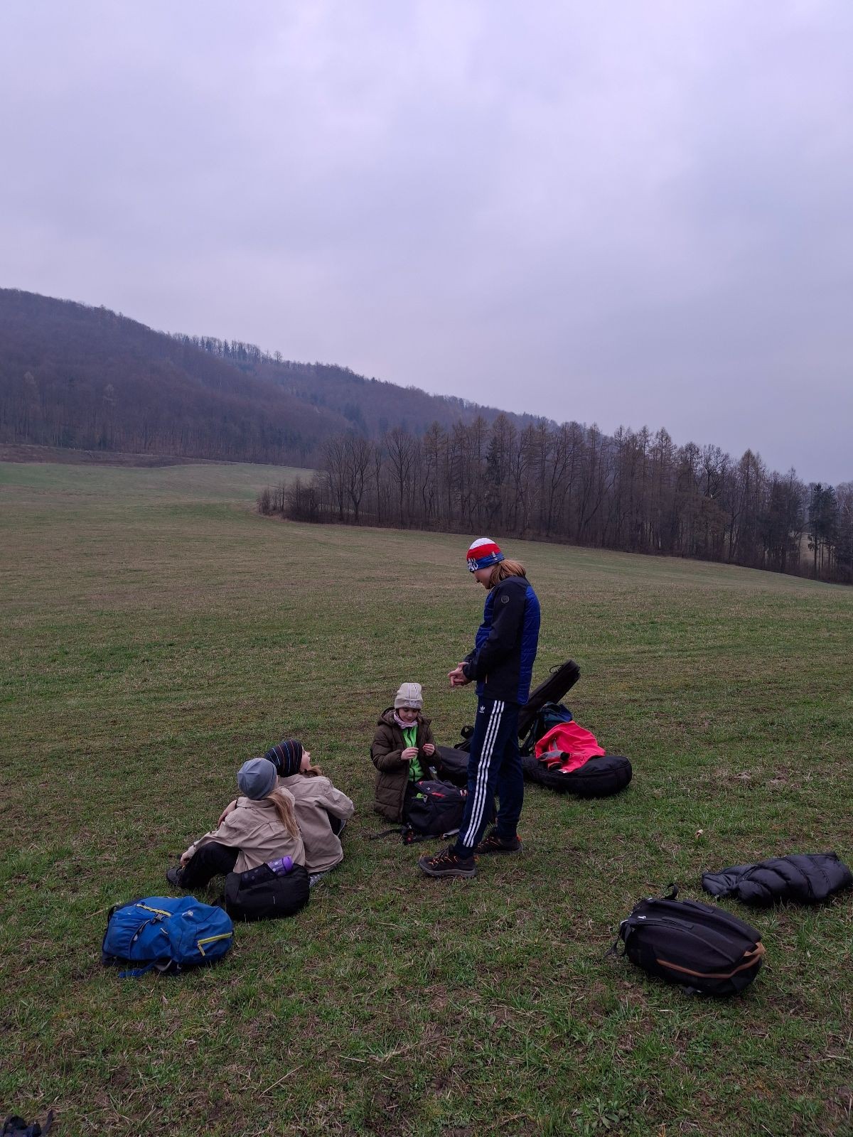 Scuka máme na myslivecké v 15 hodin. Postupně se slízáme, chystáme si místa na spaní nebo z povzdálí obdivujeme buchty a muffiny, které nám přivezli rodiče na snídani. Balíme věci na vlajkovanou a Tuleni nasazujeme na hlavu kotlík, který potřebujeme taky vzít. Docela ji to sekne a připomnělo mi to módní kreace z královské svatby Kate a Williama. Vyrážíme směrem větřkovský lom a cestou nám začíná lehce poprchávat. Ne tolik, aby stálo za to vytahovat pláštěnku, ale dost na to, aby nás to štvalo. Koukáme na radar a zjišťujeme, že mraky jsou východní, takže to jen potvrzuje staré moudro, že z východu k nám nikdy nic dobrého nepřišlo. Cestou začínají Bať bolet nožičky a ocitá se tak v bezvýchodné situaci, protože cesta do lomu i na zpět by znamenala jen další chůzi a další bolení nožiček. Marťan spatřil ptáka co se třepotá na místě jako dron co ztrácí signál a neví kudy se vydat. Marťan to tipuje na epileptický záchvat. S ostatníma tipujeme, že by to mohla být poštolka, která takhle loví - prostě taková malá rozcvička před útokem a jídlem. Ale fógl je příliš daleko na to, abychom byli schopni s jistotou říct, že to je poštolka. Varianatu káně s epilepťákem tak nemůžeme zcela vyloučit.