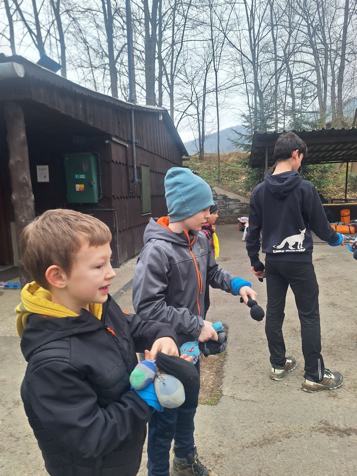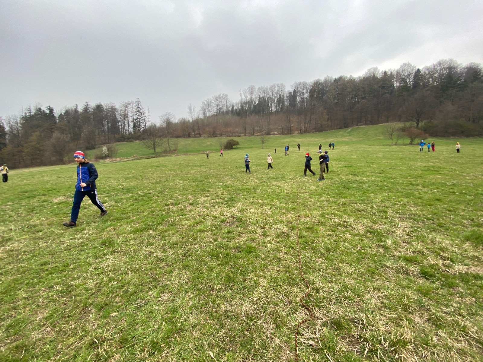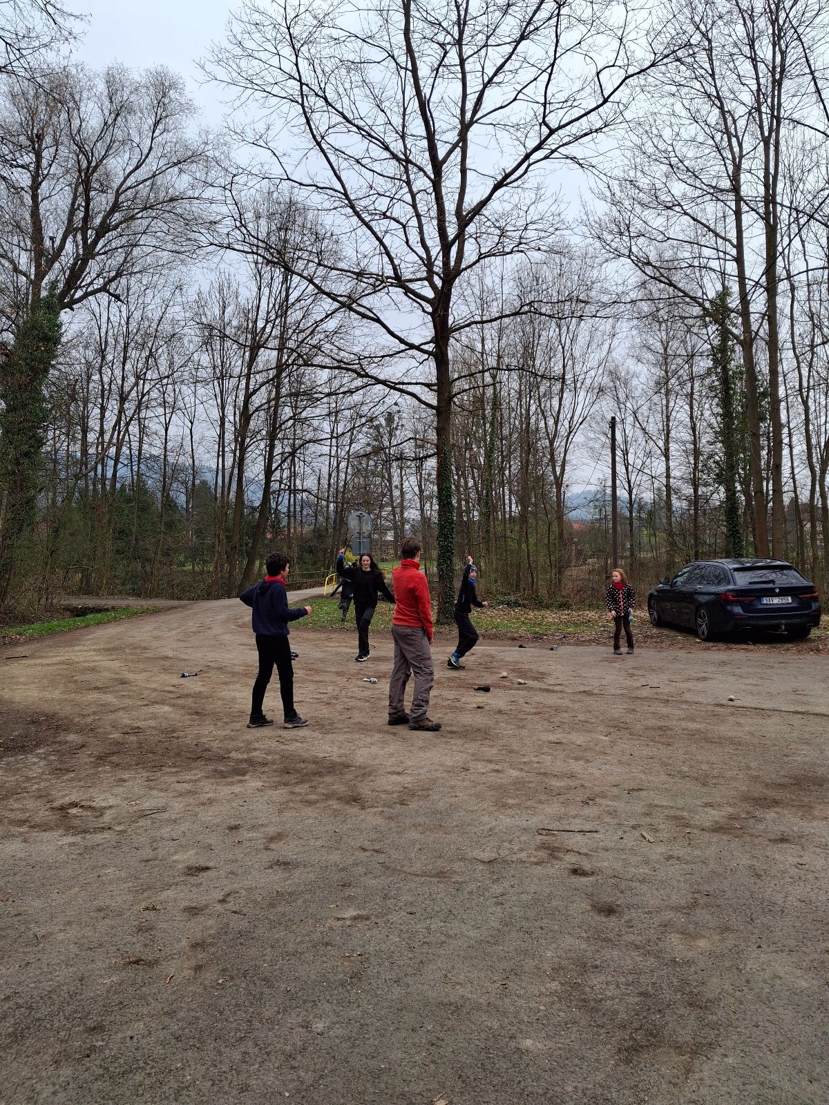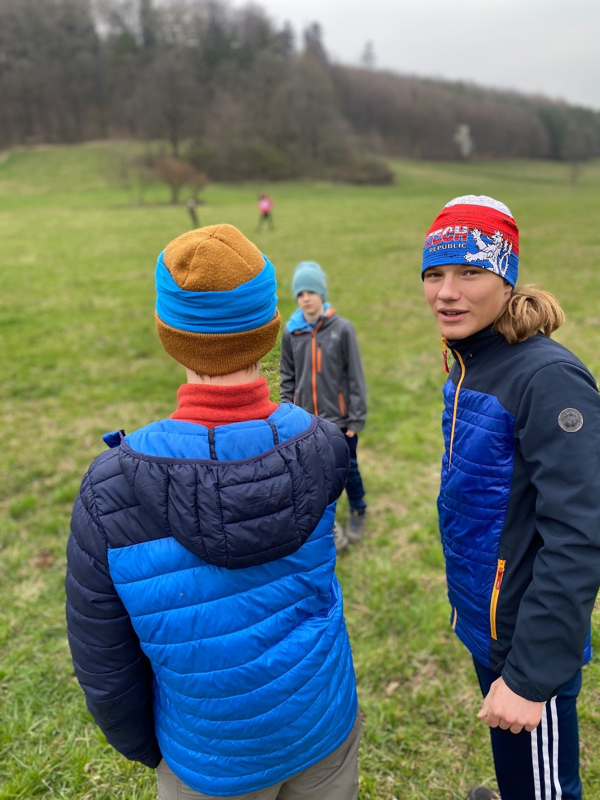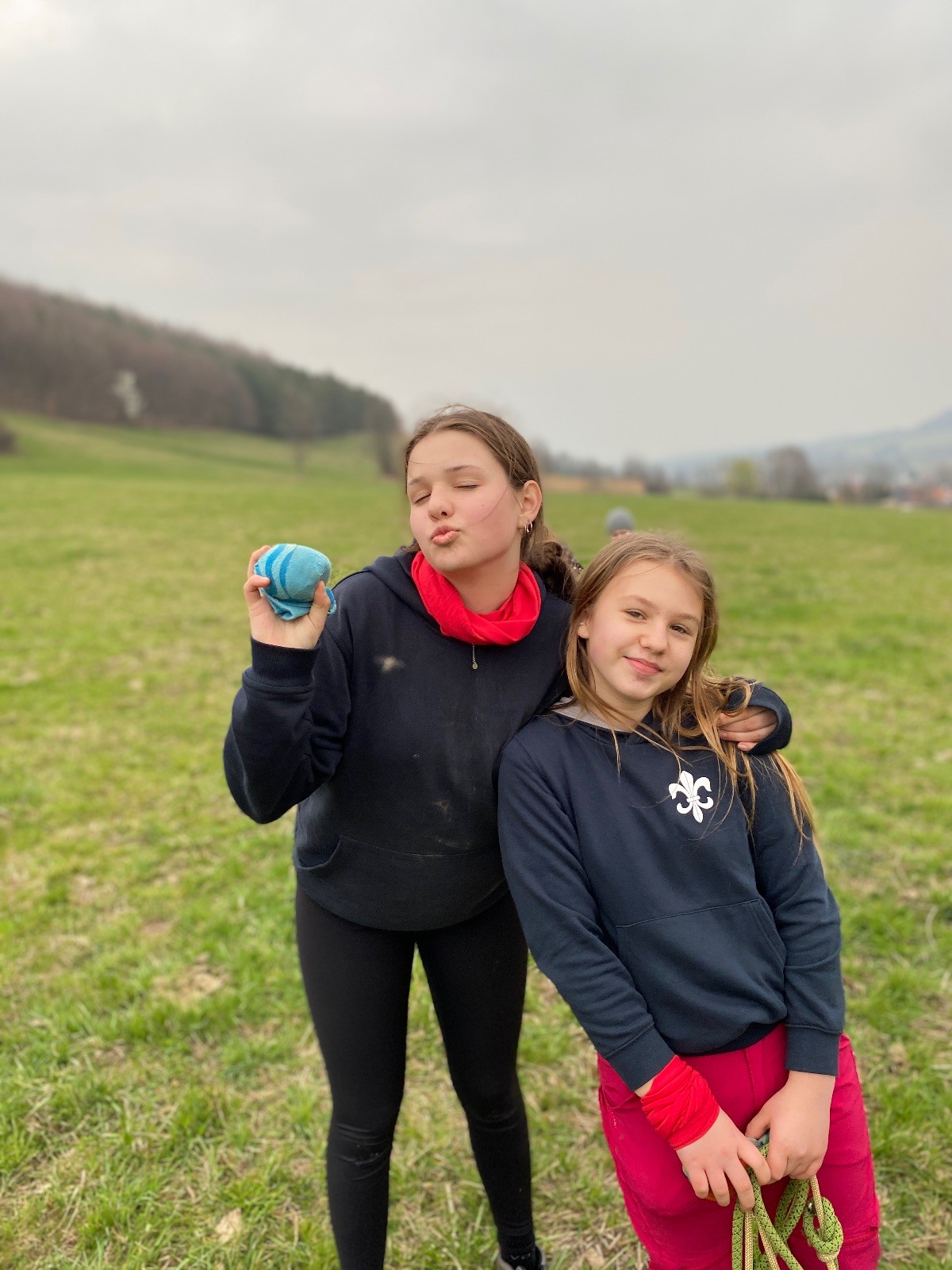 Scuka máme na myslivecké v 15 hodin. Postupně se slízáme, chystáme si místa na spaní nebo z povzdálí obdivujeme buchty a muffiny, které nám přivezli rodiče na snídani. Balíme věci na vlajkovanou a Tuleni nasazujeme na hlavu kotlík, který potřebujeme taky vzít. Docela ji to sekne a připomnělo mi to módní kreace z královské svatby Kate a Williama. Vyrážíme směrem větřkovský lom a cestou nám začíná lehce poprchávat. Ne tolik, aby stálo za to vytahovat pláštěnku, ale dost na to, aby nás to štvalo. Koukáme na radar a zjišťujeme, že mraky jsou východní, takže to jen potvrzuje staré moudro, že z východu k nám nikdy nic dobrého nepřišlo. Cestou začínají Bať bolet nožičky a ocitá se tak v bezvýchodné situaci, protože cesta do lomu i na zpět by znamenala jen další chůzi a další bolení nožiček. Marťan spatřil ptáka co se třepotá na místě jako dron co ztrácí signál a neví kudy se vydat. Marťan to tipuje na epileptický záchvat. S ostatníma tipujeme, že by to mohla být poštolka, která takhle loví - prostě taková malá rozcvička před útokem a jídlem. Ale fógl je příliš daleko na to, abychom byli schopni s jistotou říct, že to je poštolka. Varianatu káně s epilepťákem tak nemůžeme zcela vyloučit.