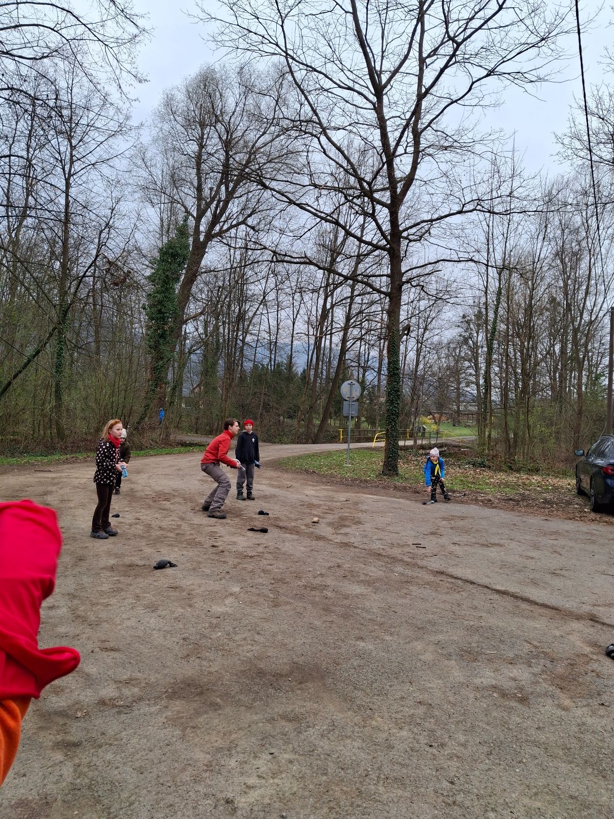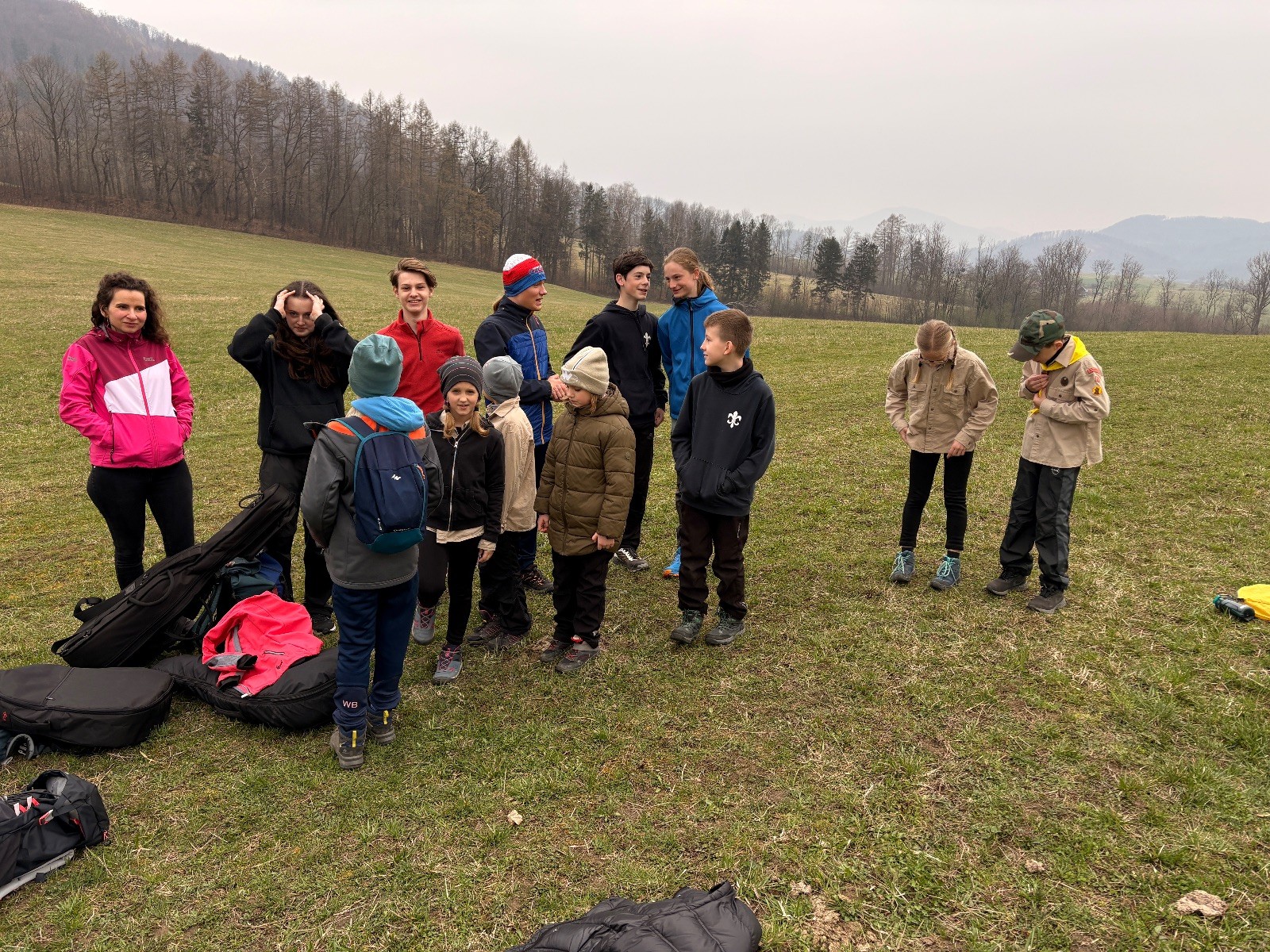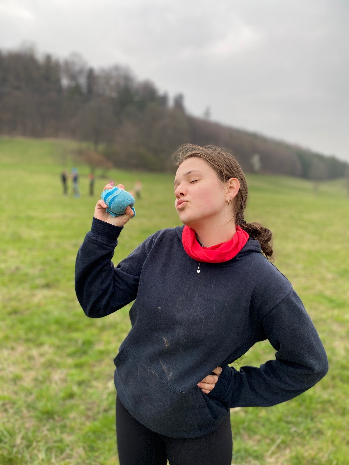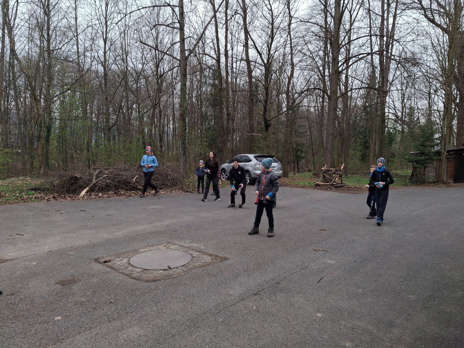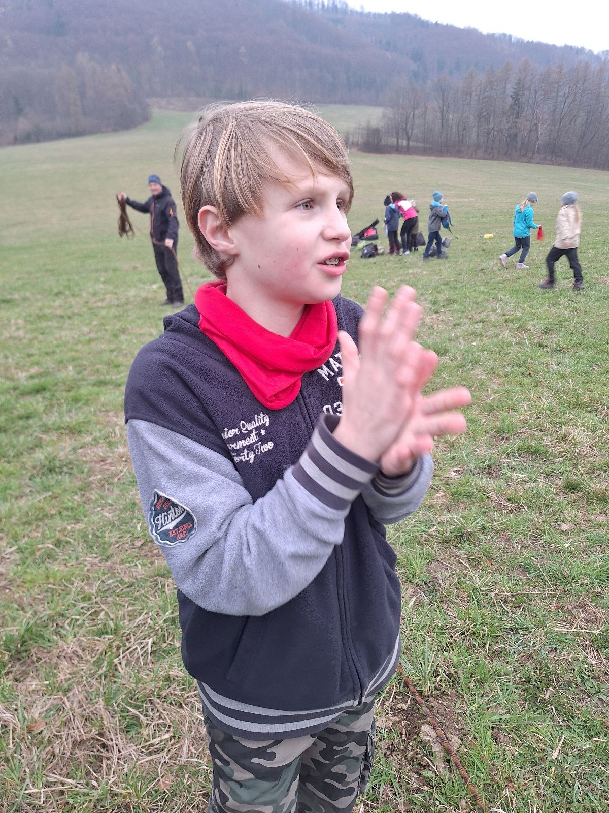 Scuka máme na myslivecké v 15 hodin. Postupně se slízáme, chystáme si místa na spaní nebo z povzdálí obdivujeme buchty a muffiny, které nám přivezli rodiče na snídani. Balíme věci na vlajkovanou a Tuleni nasazujeme na hlavu kotlík, který potřebujeme taky vzít. Docela ji to sekne a připomnělo mi to módní kreace z královské svatby Kate a Williama. Vyrážíme směrem větřkovský lom a cestou nám začíná lehce poprchávat. Ne tolik, aby stálo za to vytahovat pláštěnku, ale dost na to, aby nás to štvalo. Koukáme na radar a zjišťujeme, že mraky jsou východní, takže to jen potvrzuje staré moudro, že z východu k nám nikdy nic dobrého nepřišlo. Cestou začínají Bať bolet nožičky a ocitá se tak v bezvýchodné situaci, protože cesta do lomu i na zpět by znamenala jen další chůzi a další bolení nožiček. Marťan spatřil ptáka co se třepotá na místě jako dron co ztrácí signál a neví kudy se vydat. Marťan to tipuje na epileptický záchvat. S ostatníma tipujeme, že by to mohla být poštolka, která takhle loví - prostě taková malá rozcvička před útokem a jídlem. Ale fógl je příliš daleko na to, abychom byli schopni s jistotou říct, že to je poštolka. Varianatu káně s epilepťákem tak nemůžeme zcela vyloučit.