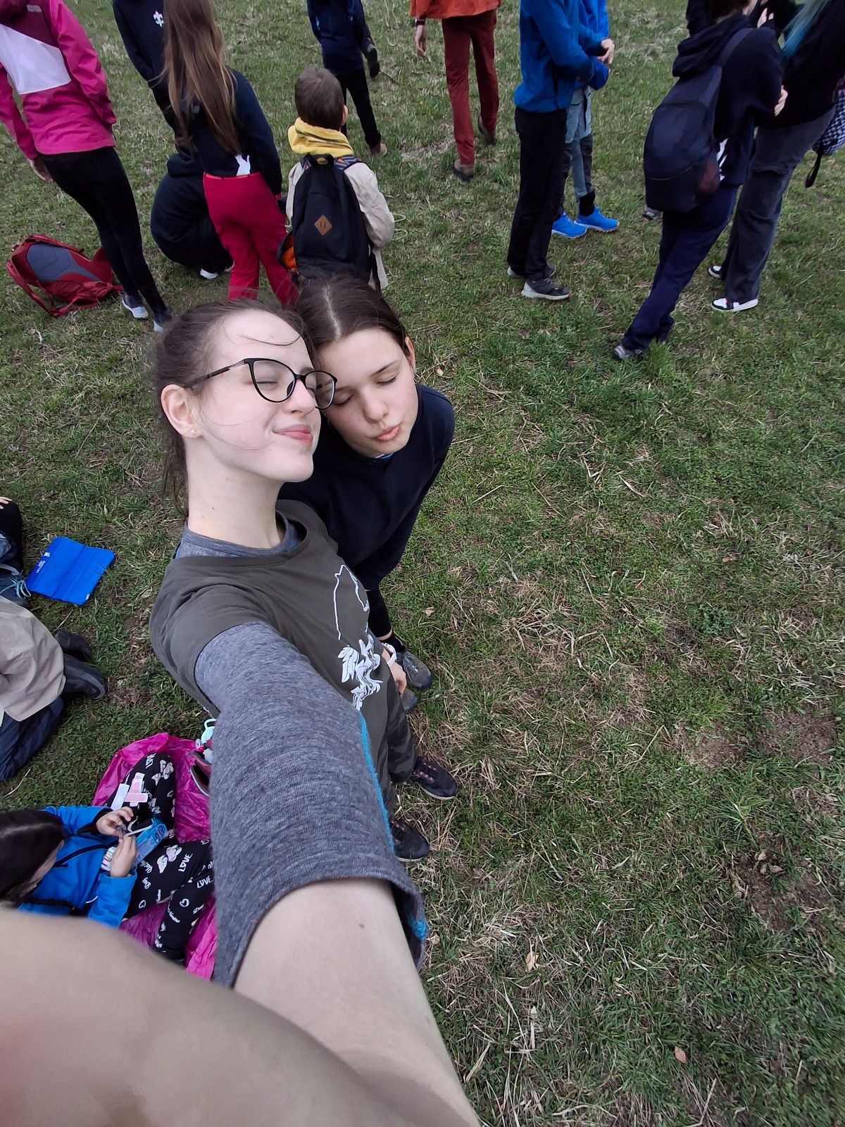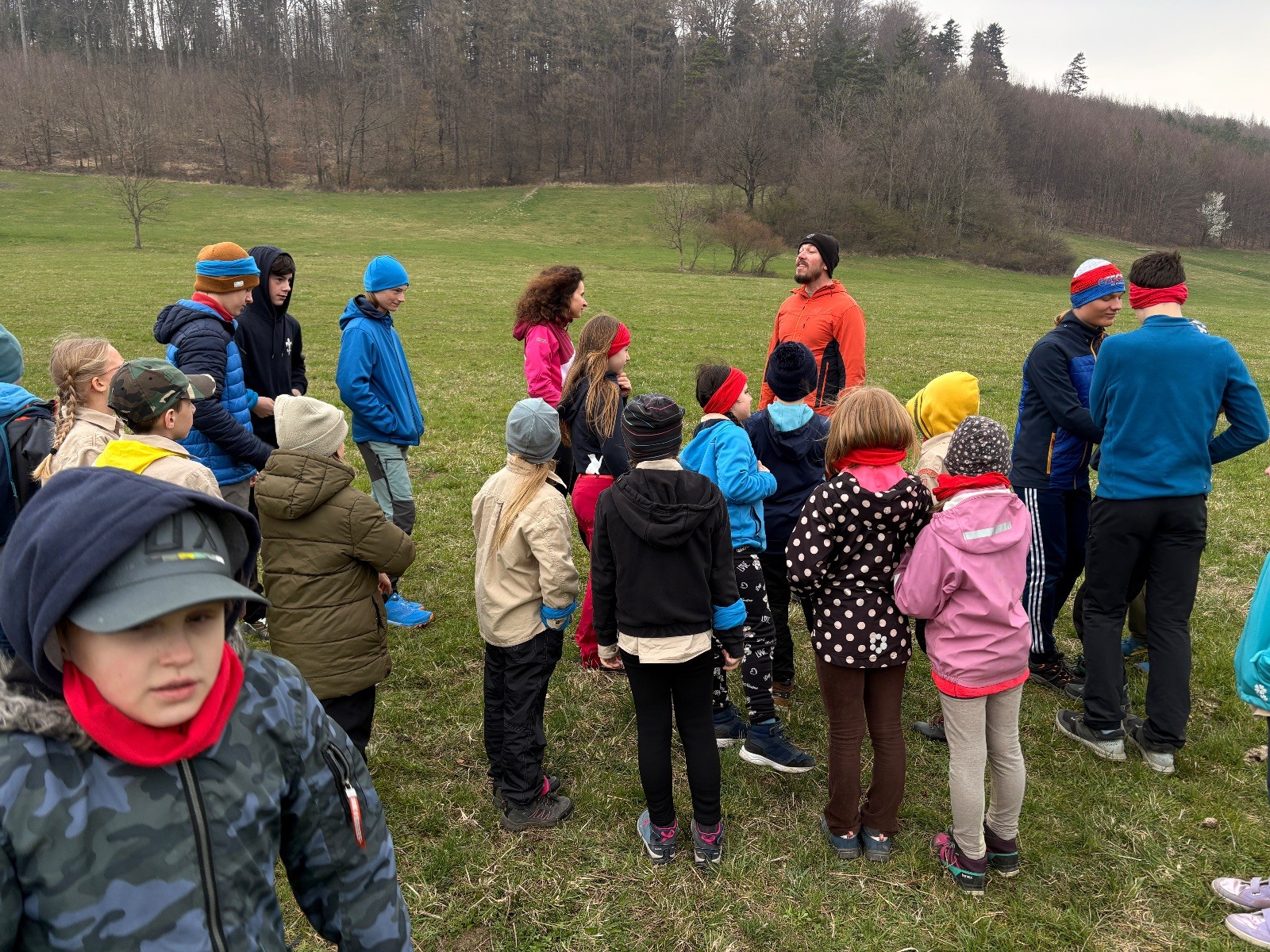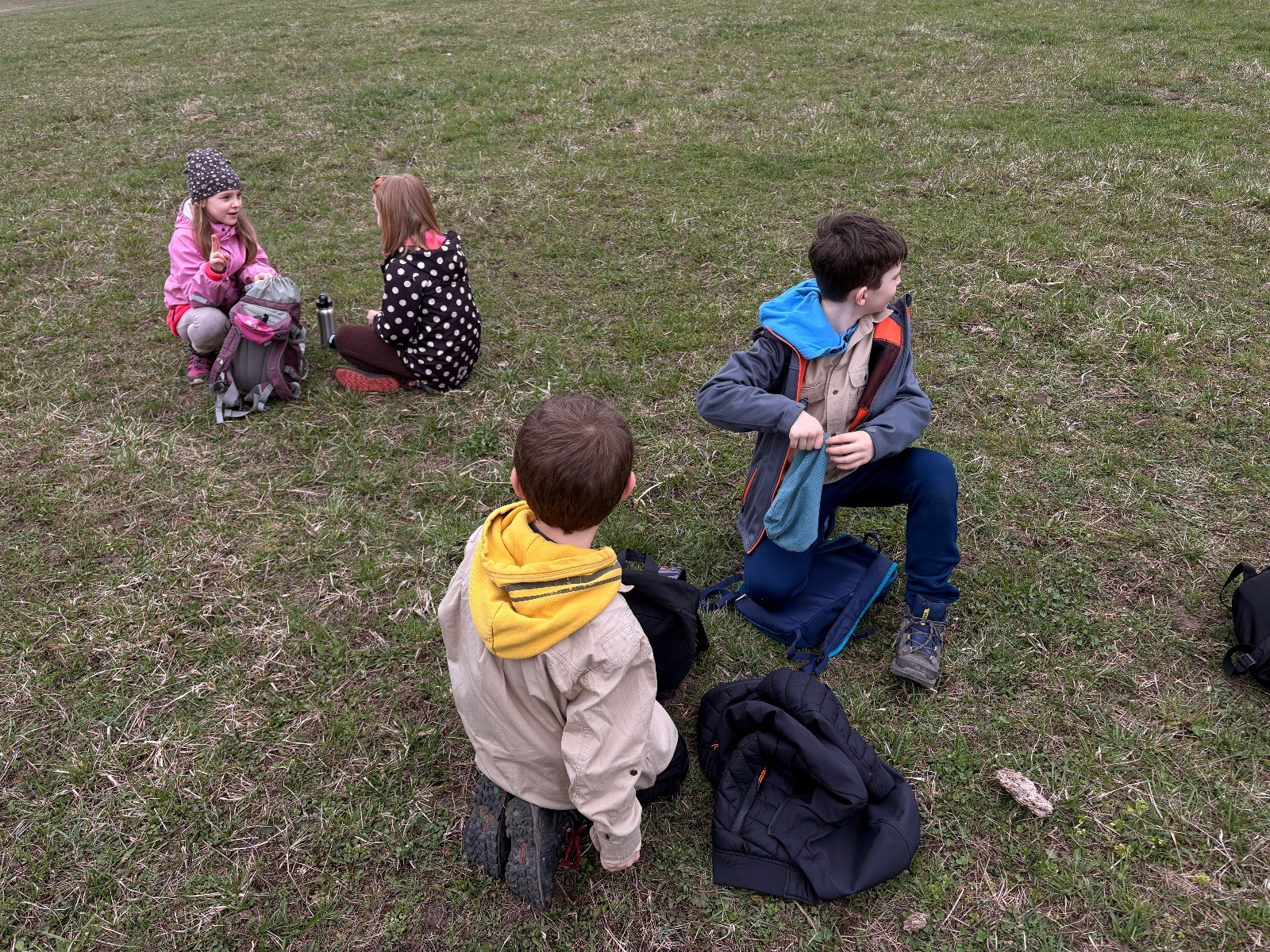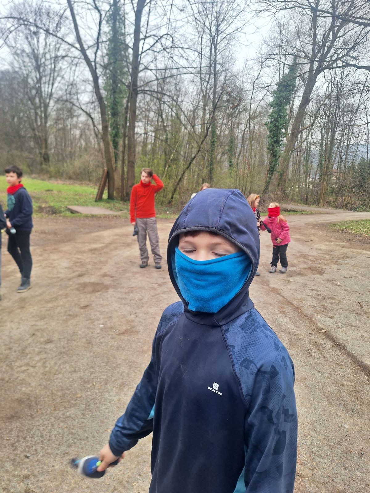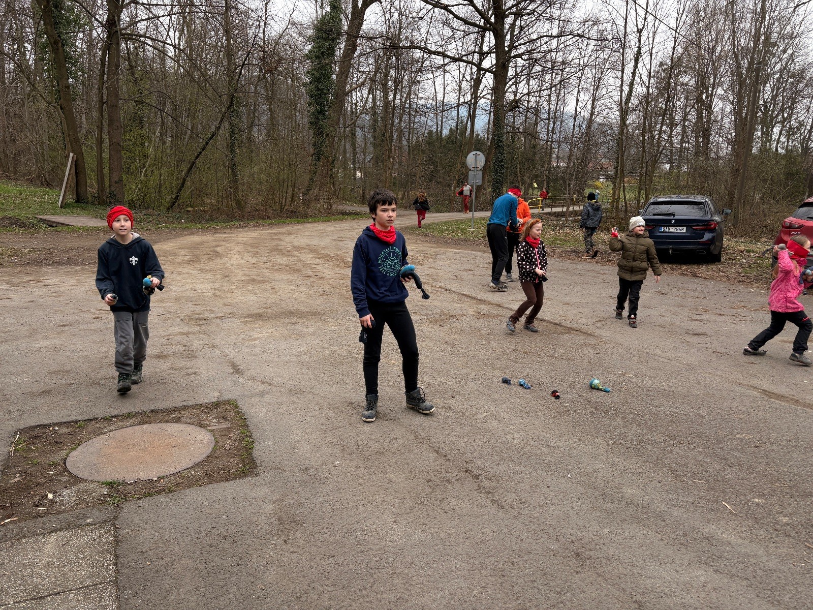 Scuka máme na myslivecké v 15 hodin. Postupně se slízáme, chystáme si místa na spaní nebo z povzdálí obdivujeme buchty a muffiny, které nám přivezli rodiče na snídani. Balíme věci na vlajkovanou a Tuleni nasazujeme na hlavu kotlík, který potřebujeme taky vzít. Docela ji to sekne a připomnělo mi to módní kreace z královské svatby Kate a Williama. Vyrážíme směrem větřkovský lom a cestou nám začíná lehce poprchávat. Ne tolik, aby stálo za to vytahovat pláštěnku, ale dost na to, aby nás to štvalo. Koukáme na radar a zjišťujeme, že mraky jsou východní, takže to jen potvrzuje staré moudro, že z východu k nám nikdy nic dobrého nepřišlo. Cestou začínají Bať bolet nožičky a ocitá se tak v bezvýchodné situaci, protože cesta do lomu i na zpět by znamenala jen další chůzi a další bolení nožiček. Marťan spatřil ptáka co se třepotá na místě jako dron co ztrácí signál a neví kudy se vydat. Marťan to tipuje na epileptický záchvat. S ostatníma tipujeme, že by to mohla být poštolka, která takhle loví - prostě taková malá rozcvička před útokem a jídlem. Ale fógl je příliš daleko na to, abychom byli schopni s jistotou říct, že to je poštolka. Varianatu káně s epilepťákem tak nemůžeme zcela vyloučit.