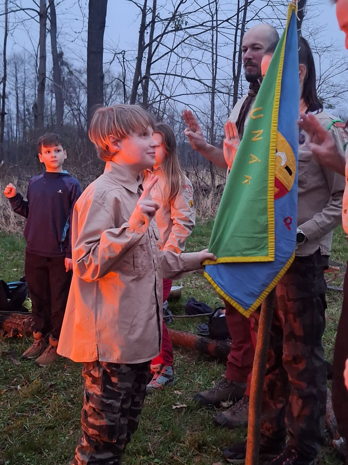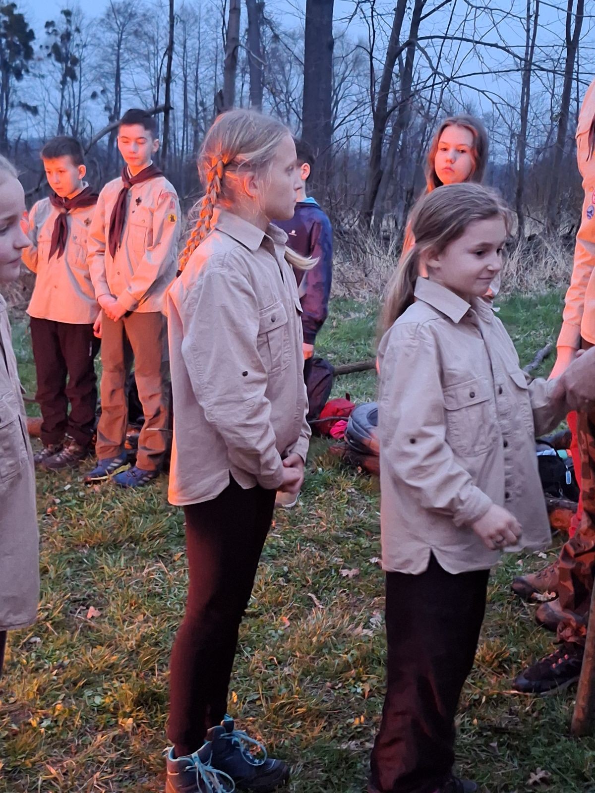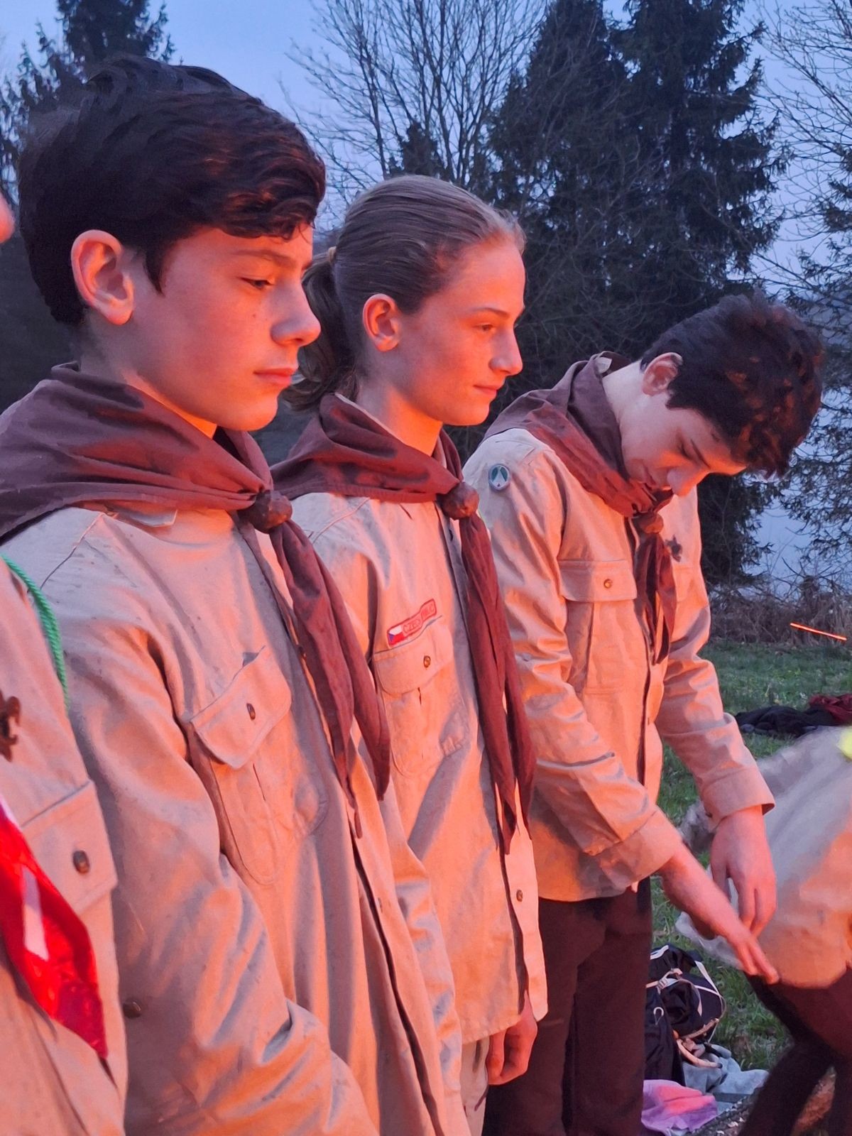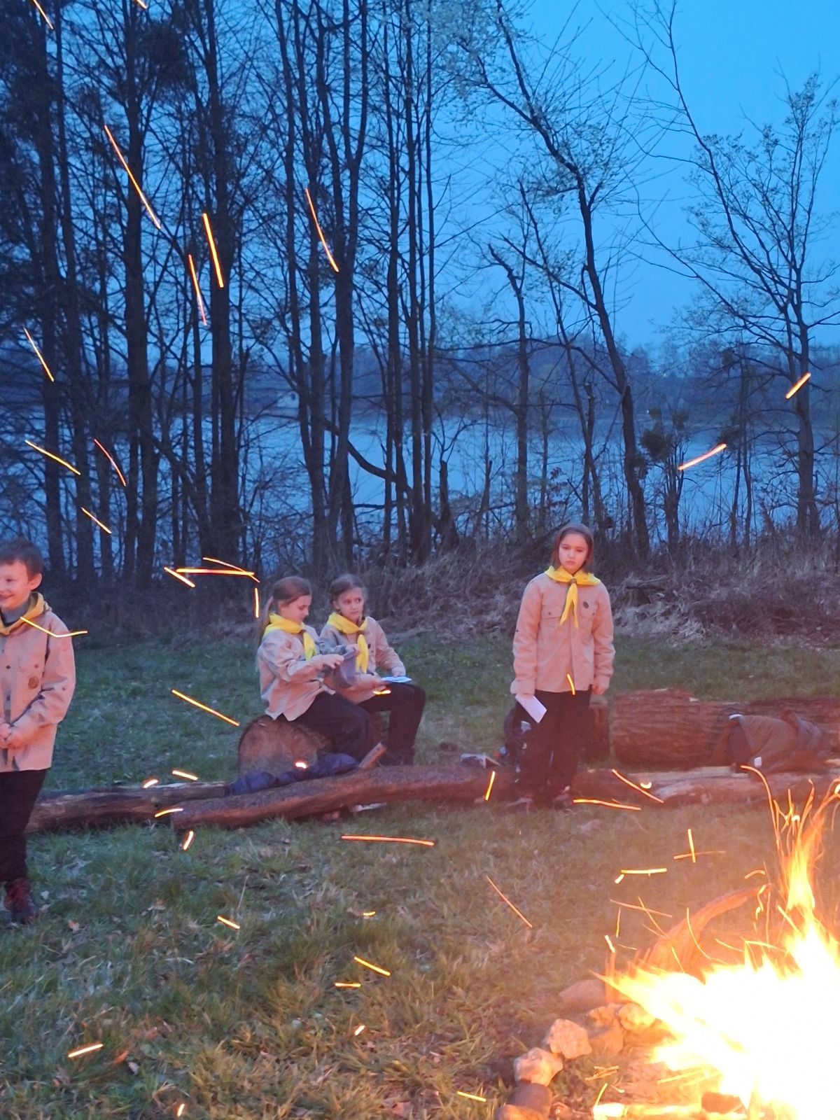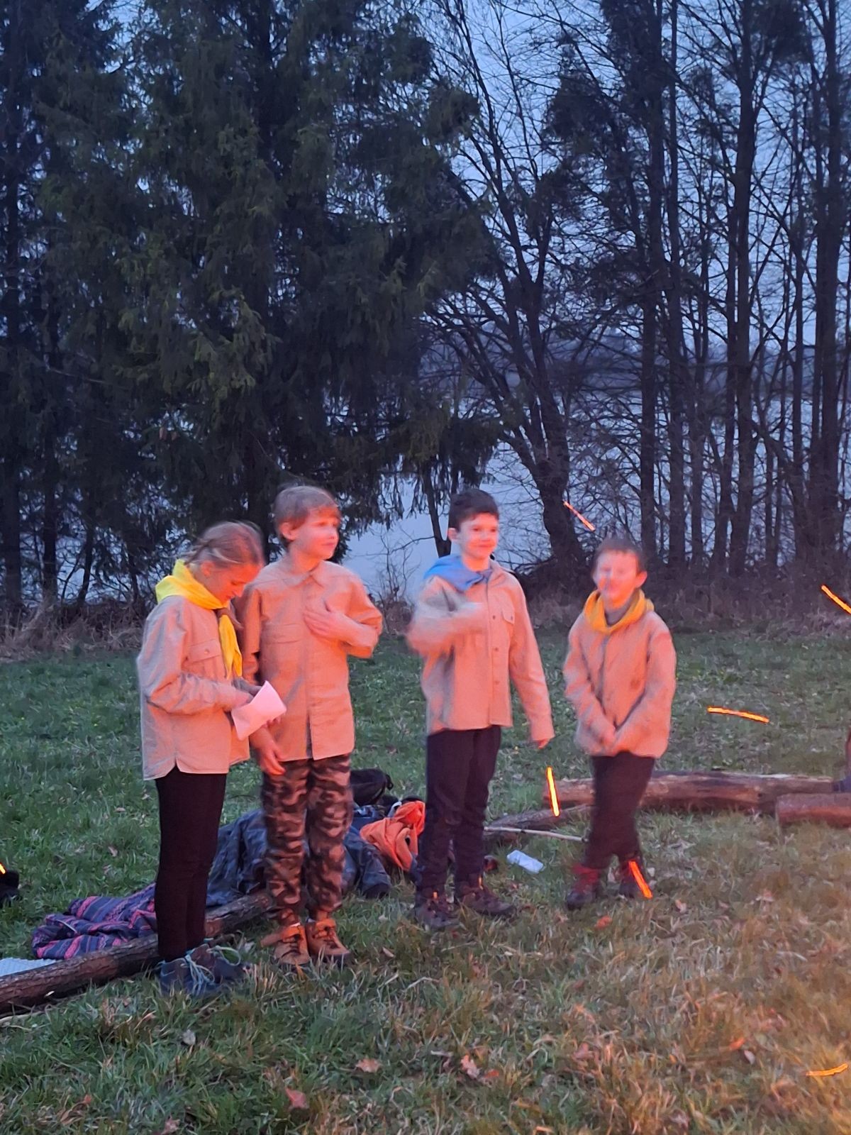 Sbíráme šutry na ohniště. Dřeva je v okolí všude dost, což nám šetří práci. Kolča se mi svěřuje, že má nehty po taťkovi. Koukám na její upravené, gelové nehty růžové barvy a říkám si „hmmm. Libor má fakt vytříbený vkus“ Pořád mi teď naskakuje obrázek Libora s růžovou manikúrou a třpytkami. Toho se asi dlouho nezbavím. Zapalujeme slavnostní oheň, zpíváme Tulácký ráno, znovu zapalujeme slavnostní oheň, který mezitím zhasíná a jde se na sliby. Máme nepočítaně světlušek a vlčat + dva novopečené skauty. I ve třiceti lidech se nám při skládání slibu u ohně dařilo být v klidu, což je u nás dost nezvyk a vlastně i docela paradox. Čím více nás je, tím větší máme schopnost být zticha. A už se to stalo podruhé, což cením a je to hodno zaznamenání, což tímto činím.