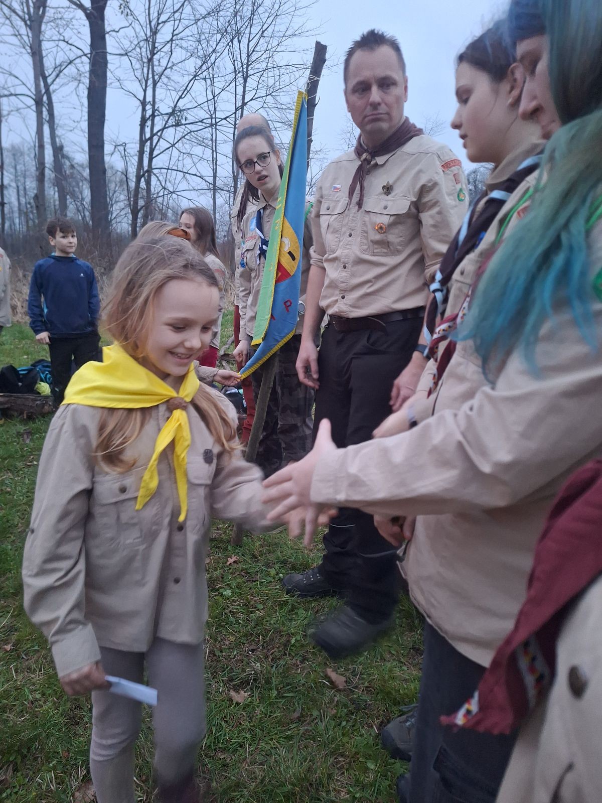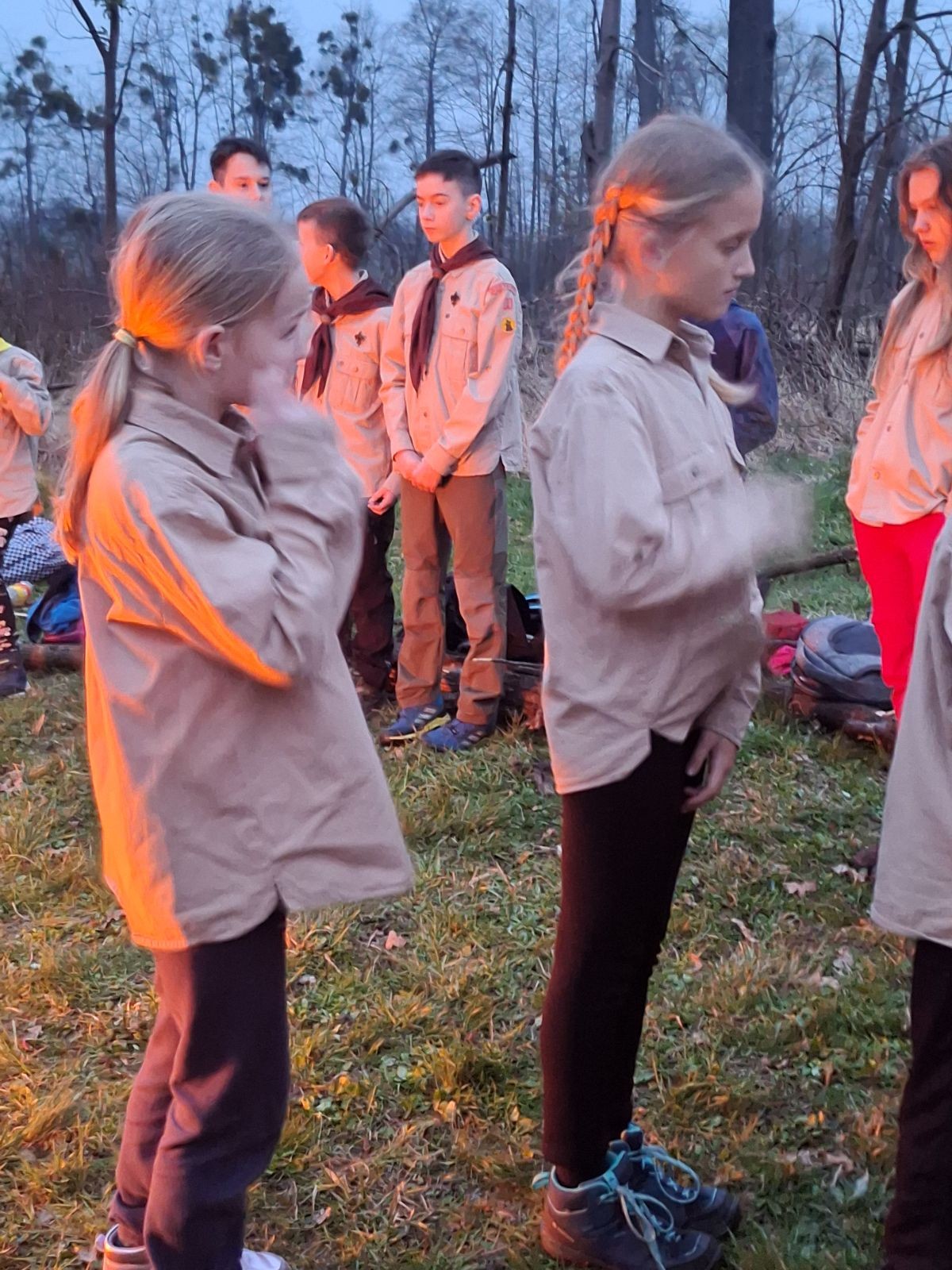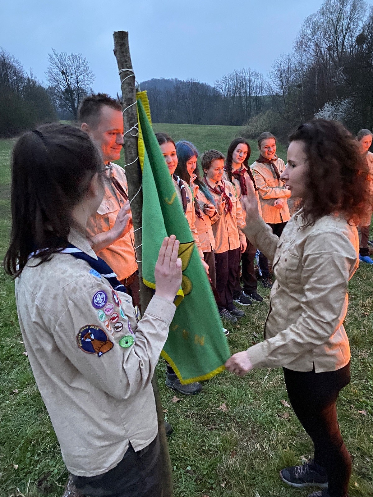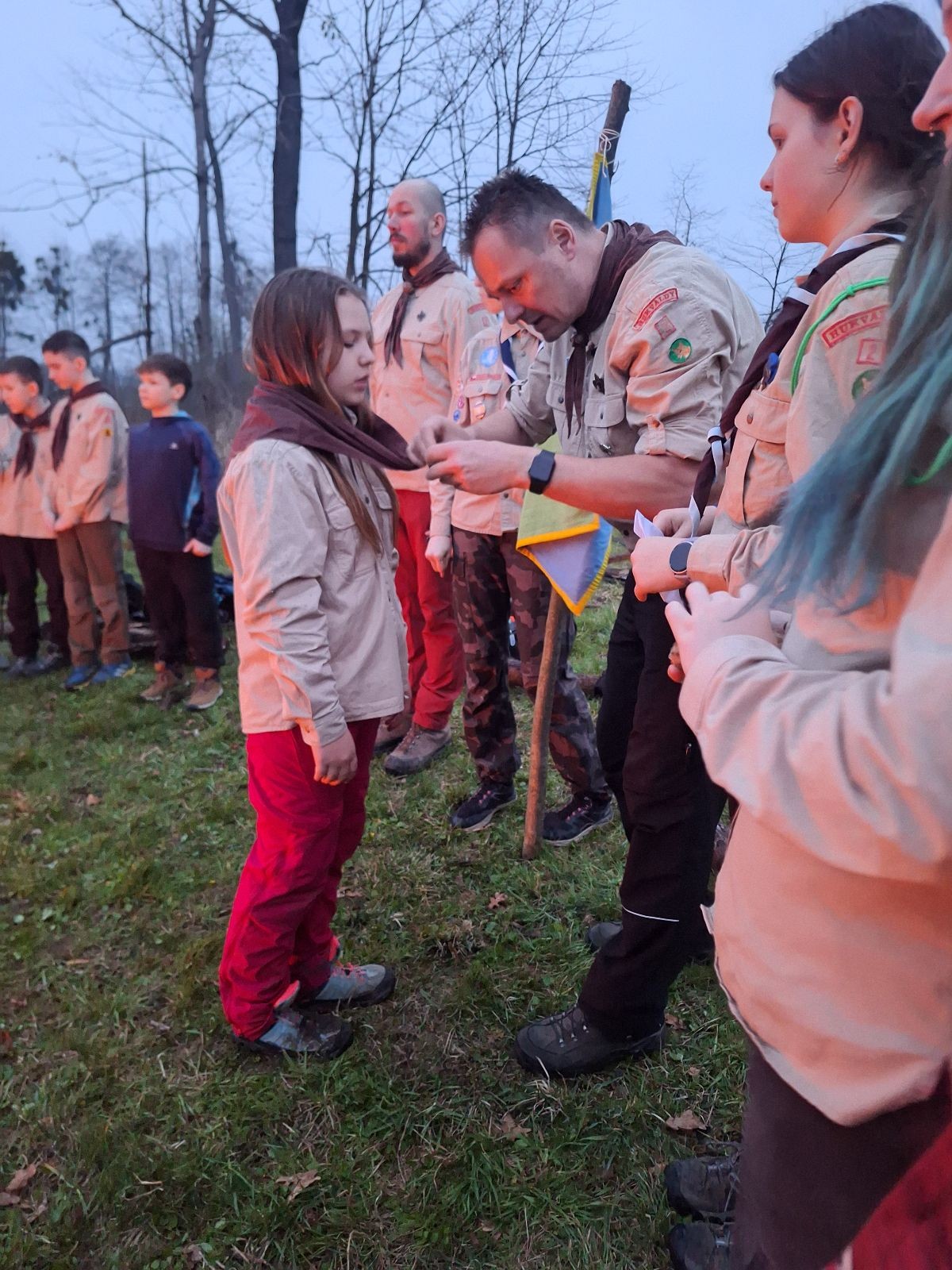 Sbíráme šutry na ohniště. Dřeva je v okolí všude dost, což nám šetří práci. Kolča se mi svěřuje, že má nehty po taťkovi. Koukám na její upravené, gelové nehty růžové barvy a říkám si „hmmm. Libor má fakt vytříbený vkus“ Pořád mi teď naskakuje obrázek Libora s růžovou manikúrou a třpytkami. Toho se asi dlouho nezbavím. Zapalujeme slavnostní oheň, zpíváme Tulácký ráno, znovu zapalujeme slavnostní oheň, který mezitím zhasíná a jde se na sliby. Máme nepočítaně světlušek a vlčat + dva novopečené skauty. I ve třiceti lidech se nám při skládání slibu u ohně dařilo být v klidu, což je u nás dost nezvyk a vlastně i docela paradox. Čím více nás je, tím větší máme schopnost být zticha. A už se to stalo podruhé, což cením a je to hodno zaznamenání, což tímto činím.