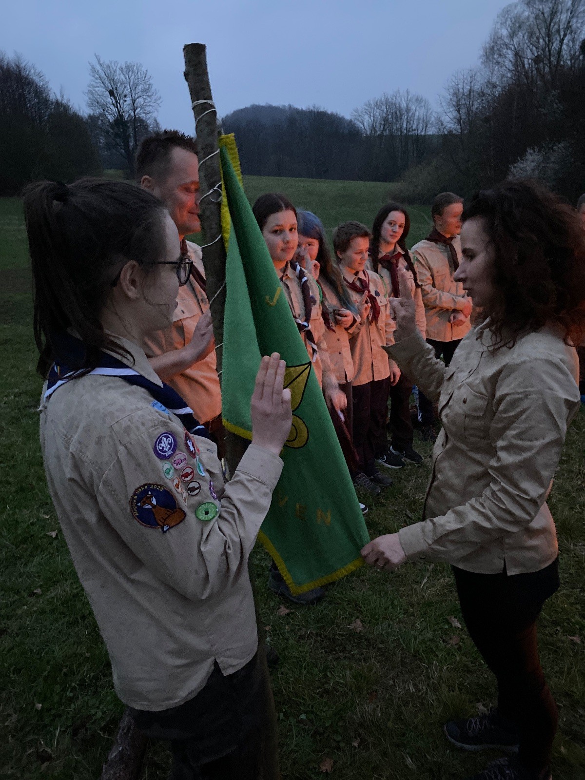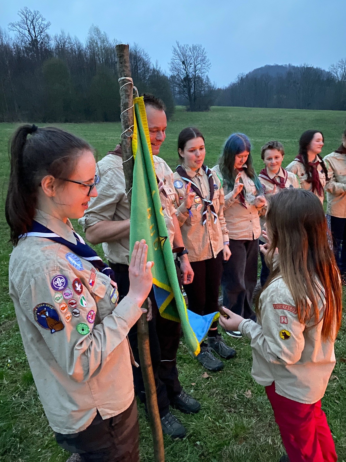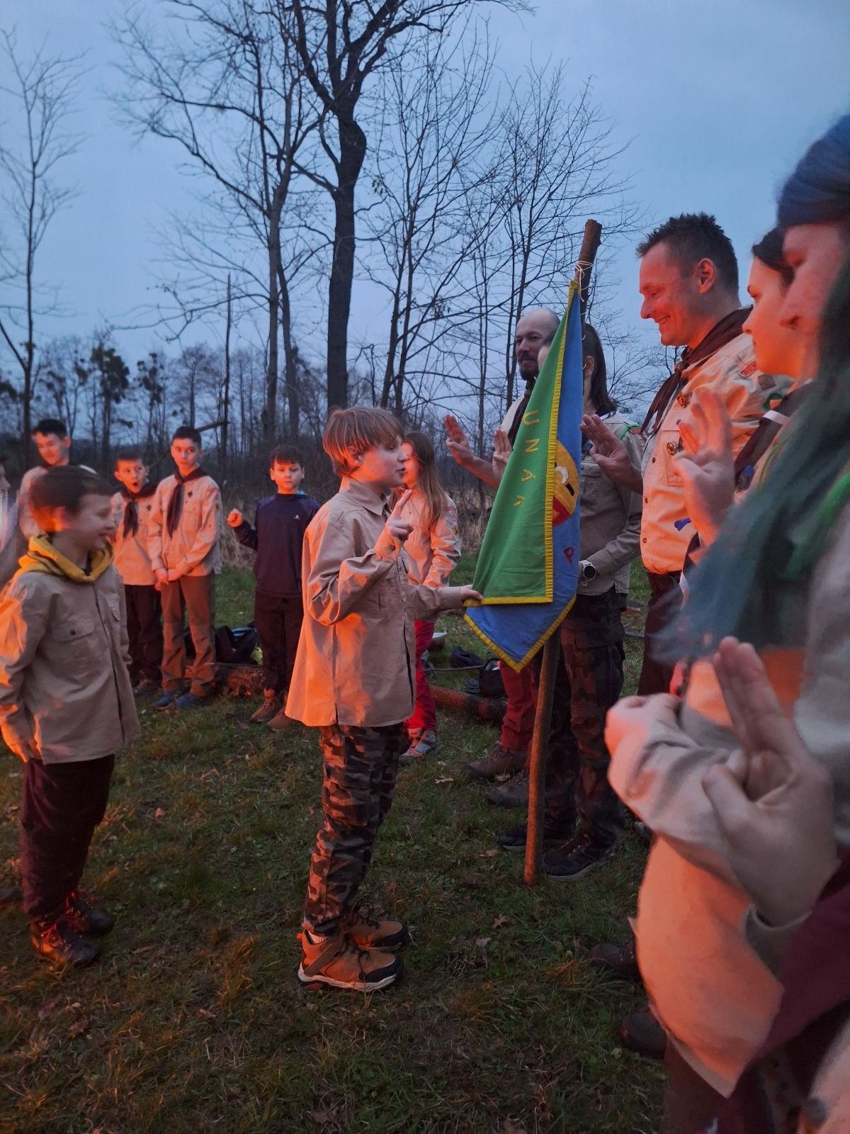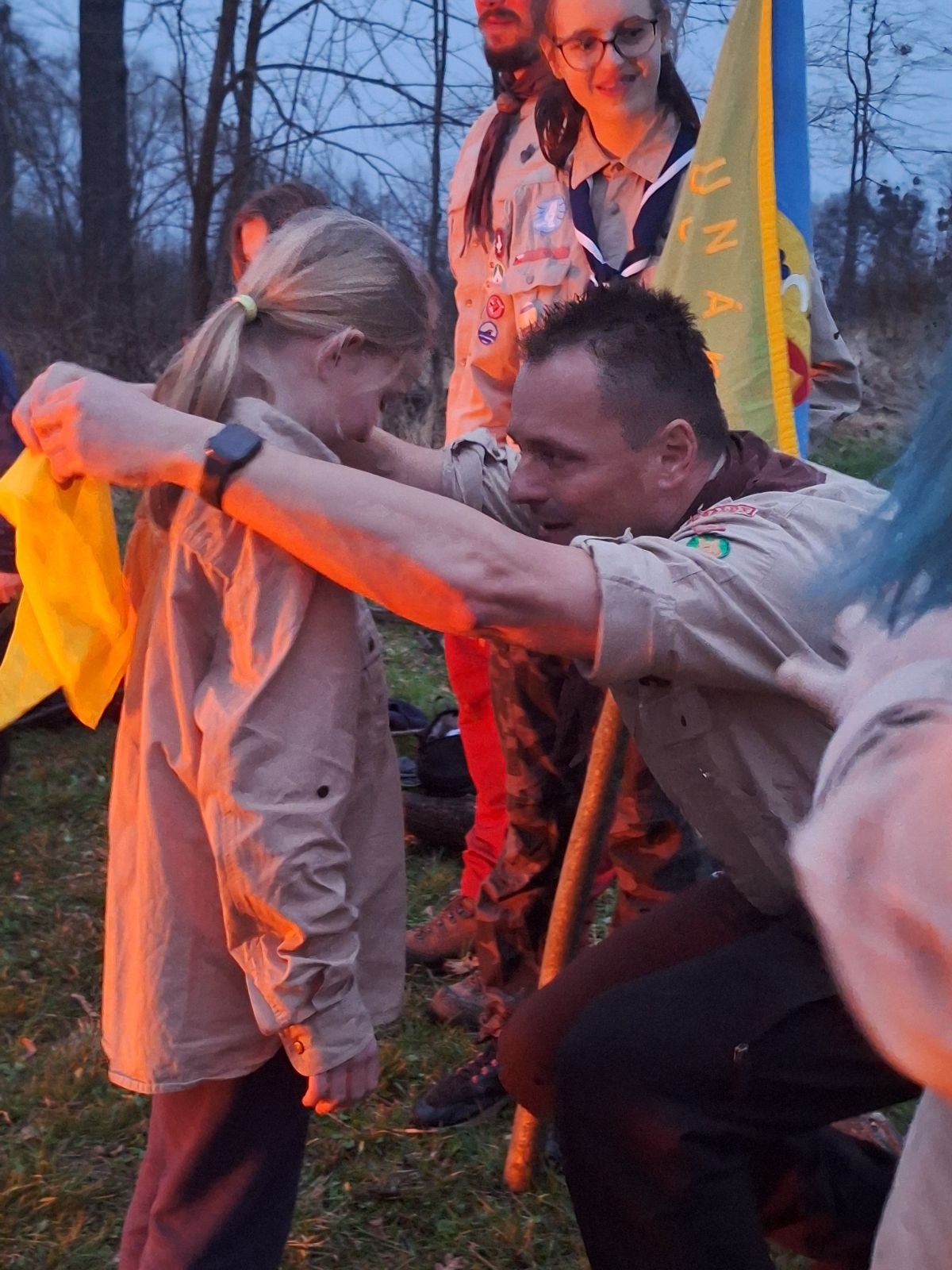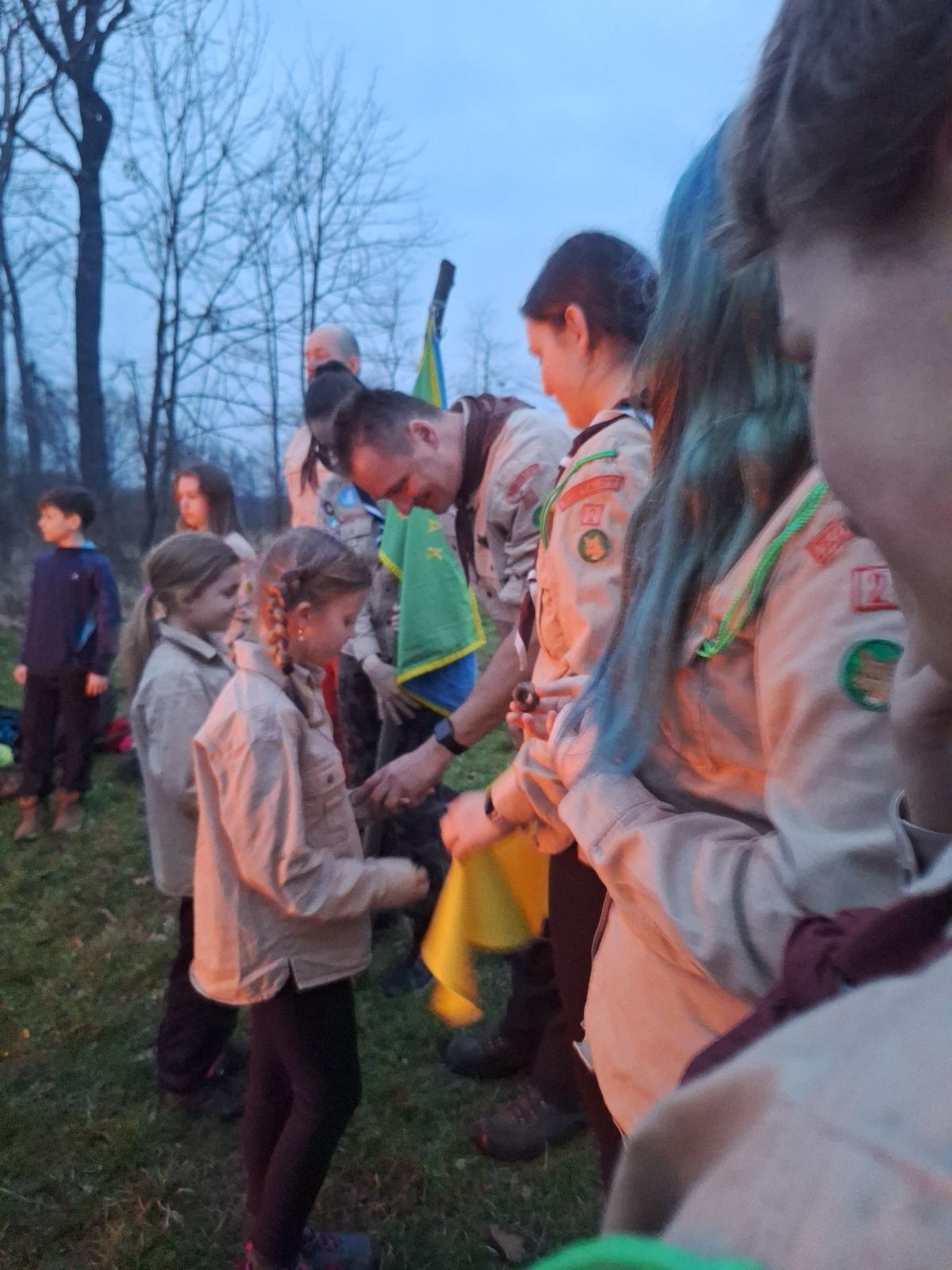 Sbíráme šutry na ohniště. Dřeva je v okolí všude dost, což nám šetří práci. Kolča se mi svěřuje, že má nehty po taťkovi. Koukám na její upravené, gelové nehty růžové barvy a říkám si „hmmm. Libor má fakt vytříbený vkus“ Pořád mi teď naskakuje obrázek Libora s růžovou manikúrou a třpytkami. Toho se asi dlouho nezbavím. Zapalujeme slavnostní oheň, zpíváme Tulácký ráno, znovu zapalujeme slavnostní oheň, který mezitím zhasíná a jde se na sliby. Máme nepočítaně světlušek a vlčat + dva novopečené skauty. I ve třiceti lidech se nám při skládání slibu u ohně dařilo být v klidu, což je u nás dost nezvyk a vlastně i docela paradox. Čím více nás je, tím větší máme schopnost být zticha. A už se to stalo podruhé, což cením a je to hodno zaznamenání, což tímto činím.