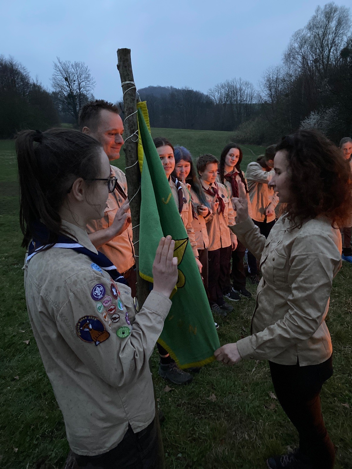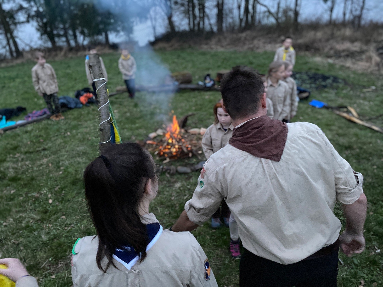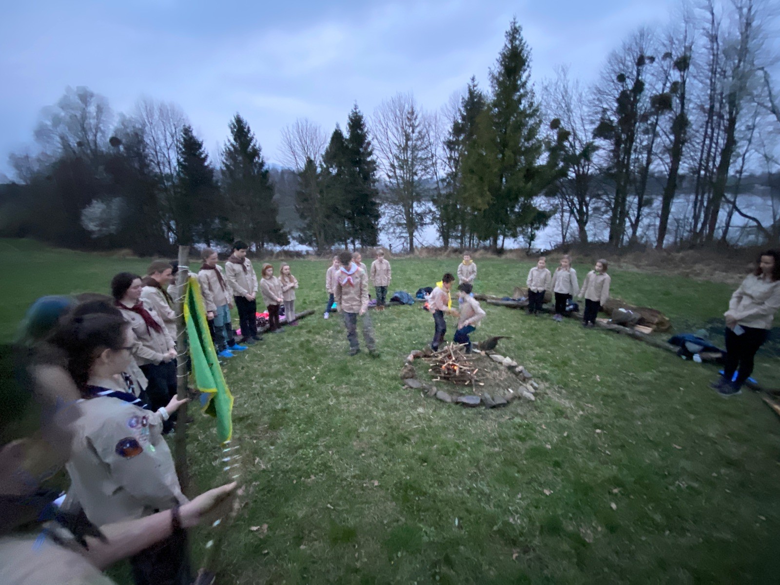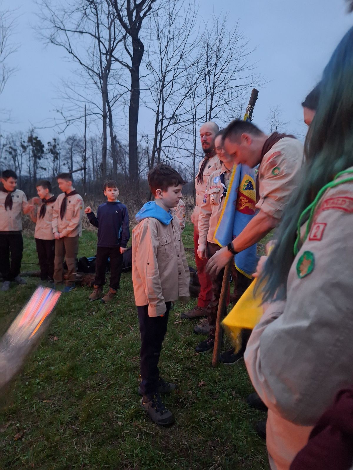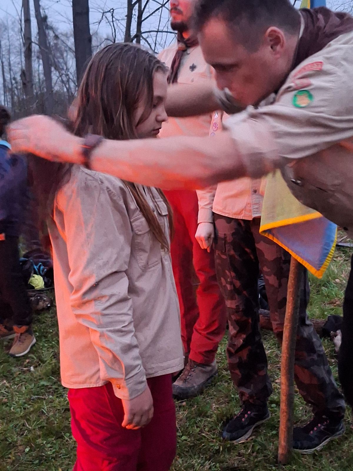 Sbíráme šutry na ohniště. Dřeva je v okolí všude dost, což nám šetří práci. Kolča se mi svěřuje, že má nehty po taťkovi. Koukám na její upravené, gelové nehty růžové barvy a říkám si „hmmm. Libor má fakt vytříbený vkus“ Pořád mi teď naskakuje obrázek Libora s růžovou manikúrou a třpytkami. Toho se asi dlouho nezbavím. Zapalujeme slavnostní oheň, zpíváme Tulácký ráno, znovu zapalujeme slavnostní oheň, který mezitím zhasíná a jde se na sliby. Máme nepočítaně světlušek a vlčat + dva novopečené skauty. I ve třiceti lidech se nám při skládání slibu u ohně dařilo být v klidu, což je u nás dost nezvyk a vlastně i docela paradox. Čím více nás je, tím větší máme schopnost být zticha. A už se to stalo podruhé, což cením a je to hodno zaznamenání, což tímto činím.