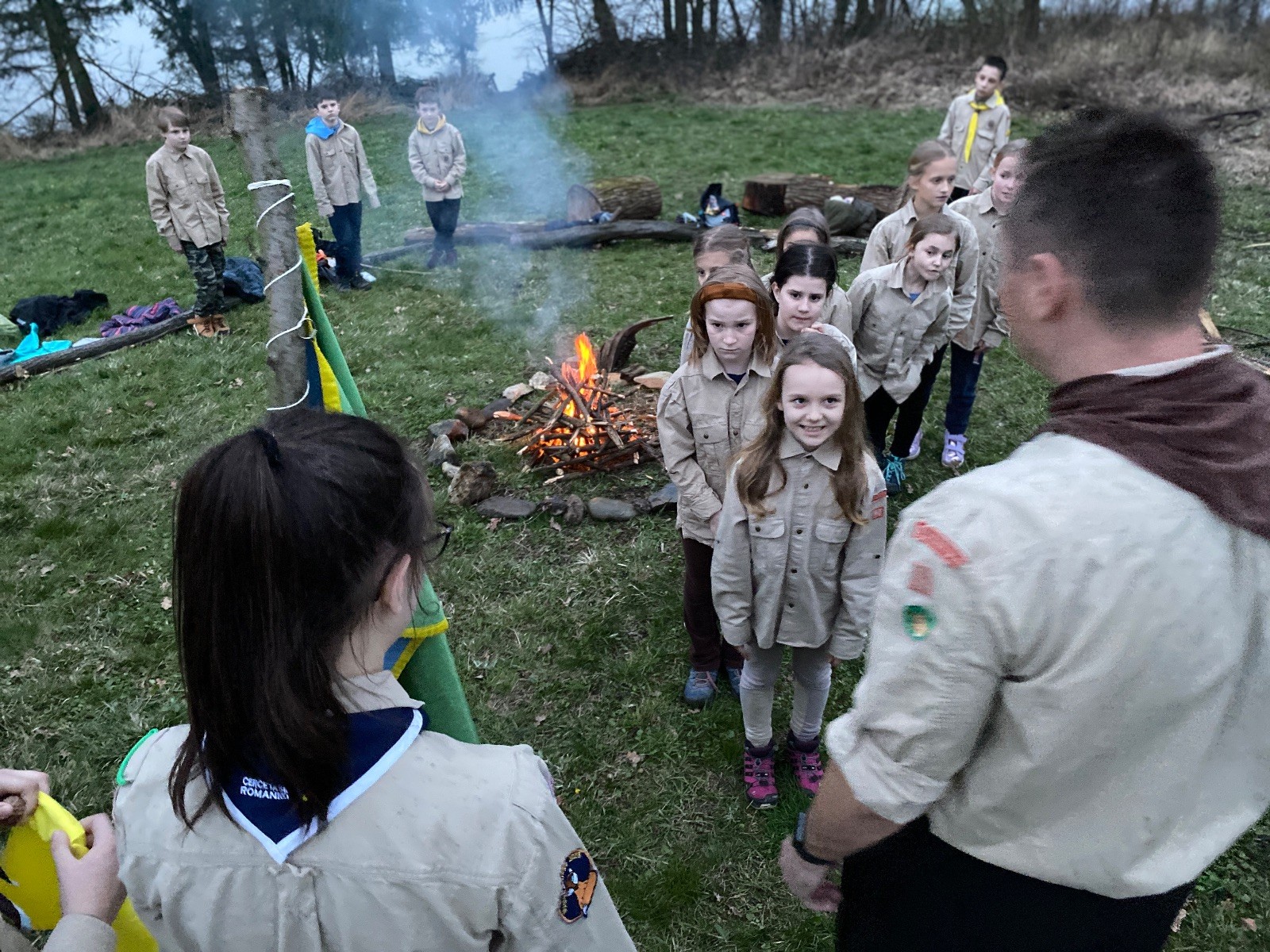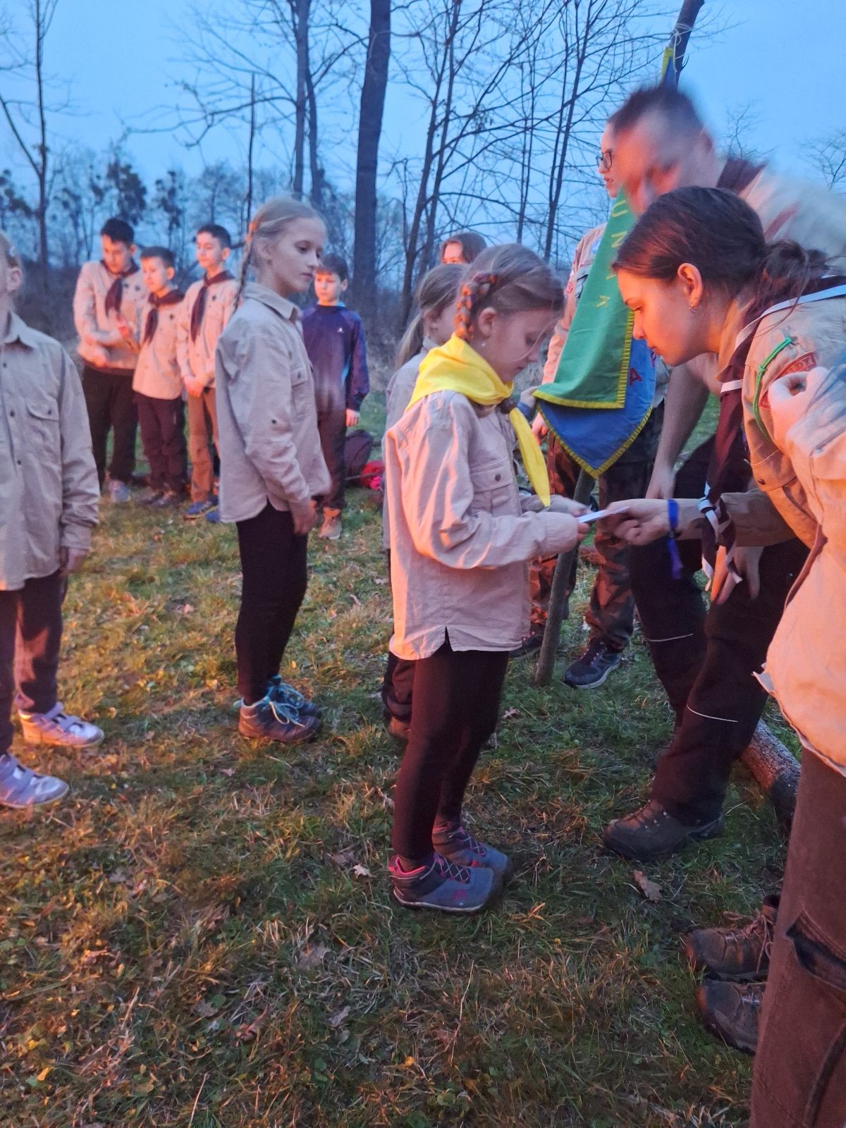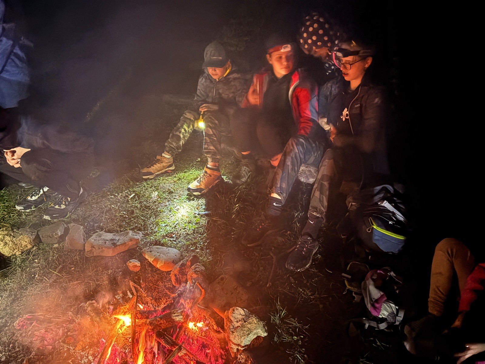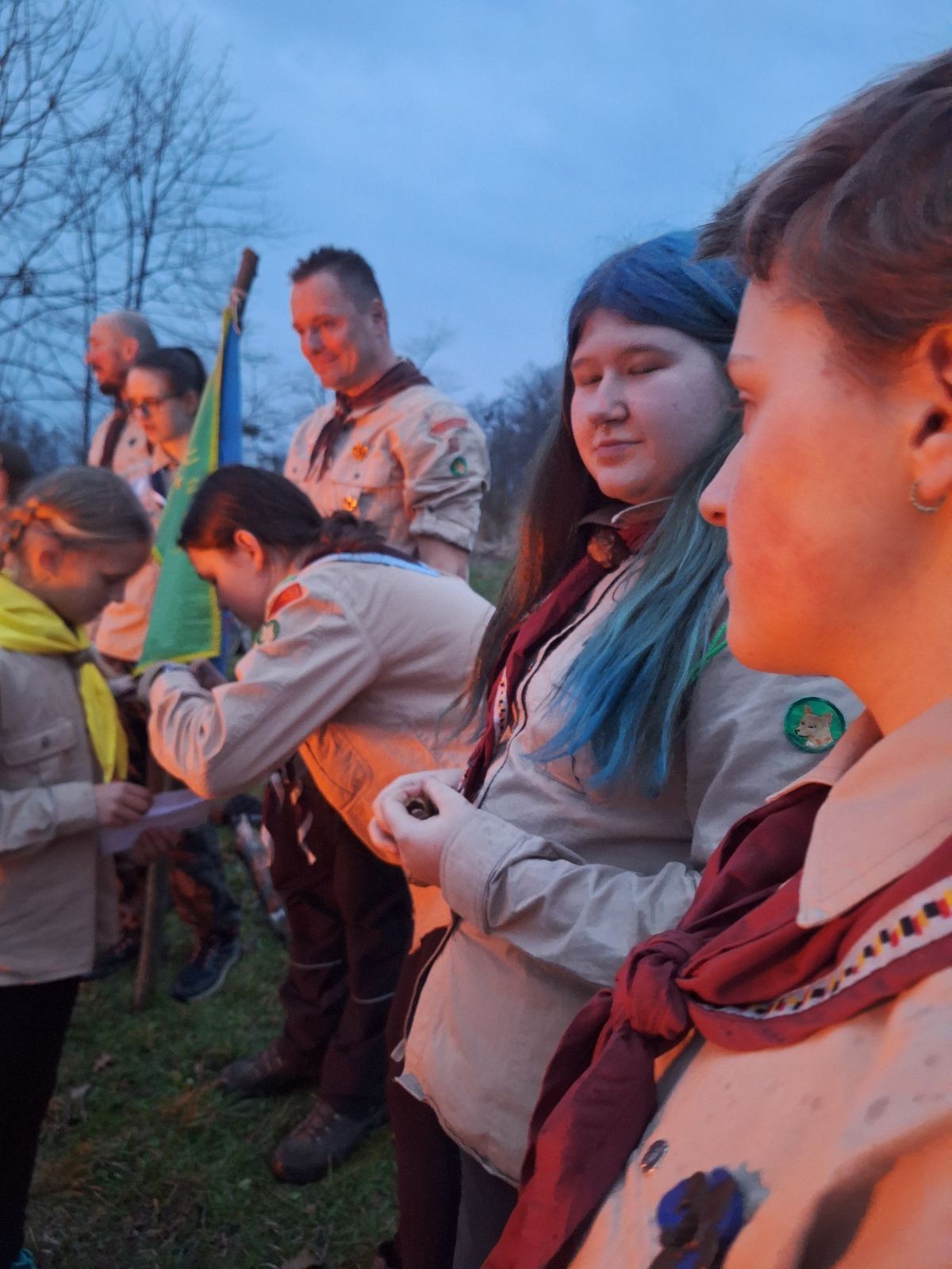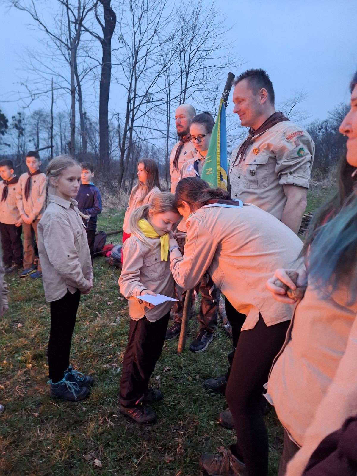 Sbíráme šutry na ohniště. Dřeva je v okolí všude dost, což nám šetří práci. Kolča se mi svěřuje, že má nehty po taťkovi. Koukám na její upravené, gelové nehty růžové barvy a říkám si „hmmm. Libor má fakt vytříbený vkus“ Pořád mi teď naskakuje obrázek Libora s růžovou manikúrou a třpytkami. Toho se asi dlouho nezbavím. Zapalujeme slavnostní oheň, zpíváme Tulácký ráno, znovu zapalujeme slavnostní oheň, který mezitím zhasíná a jde se na sliby. Máme nepočítaně světlušek a vlčat + dva novopečené skauty. I ve třiceti lidech se nám při skládání slibu u ohně dařilo být v klidu, což je u nás dost nezvyk a vlastně i docela paradox. Čím více nás je, tím větší máme schopnost být zticha. A už se to stalo podruhé, což cením a je to hodno zaznamenání, což tímto činím.