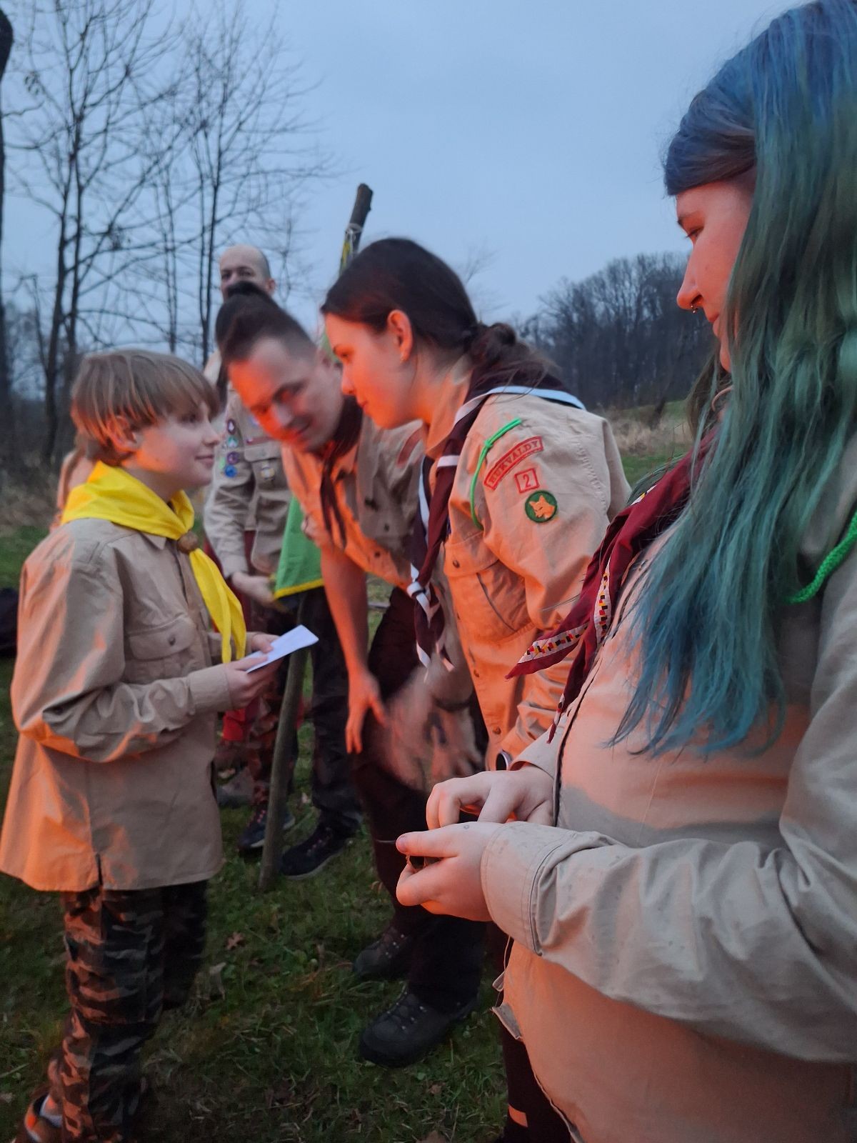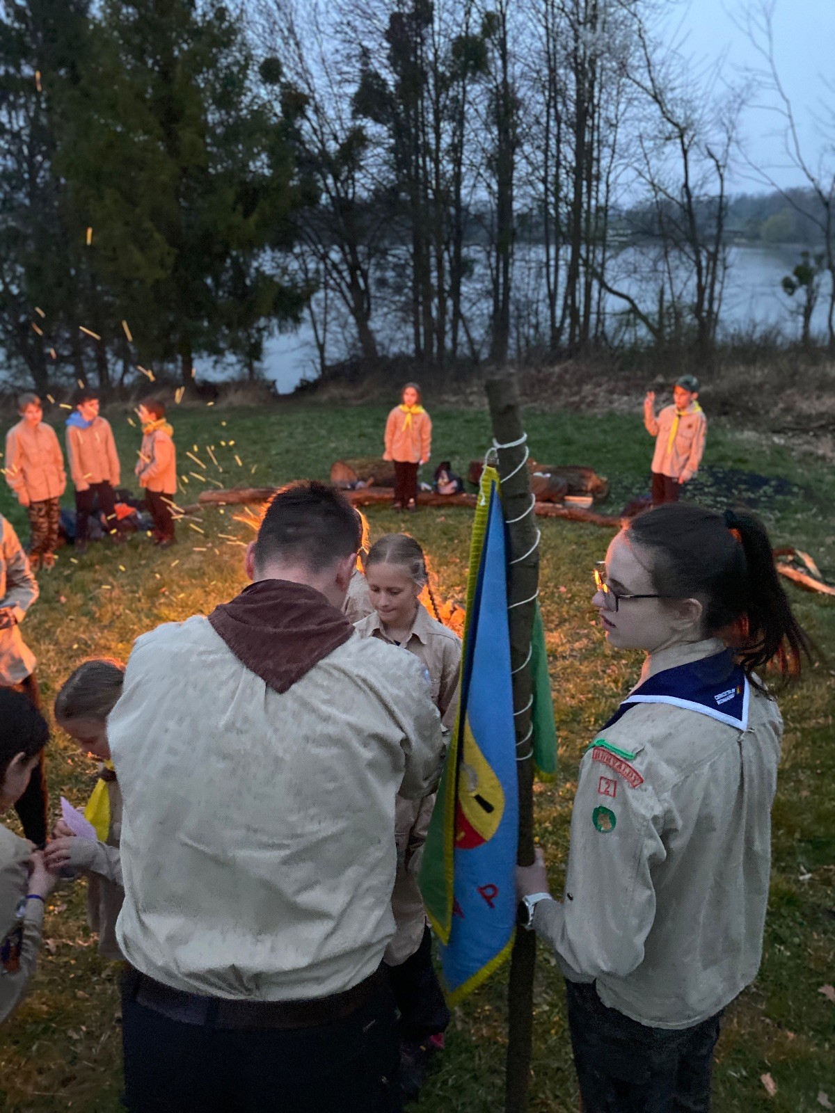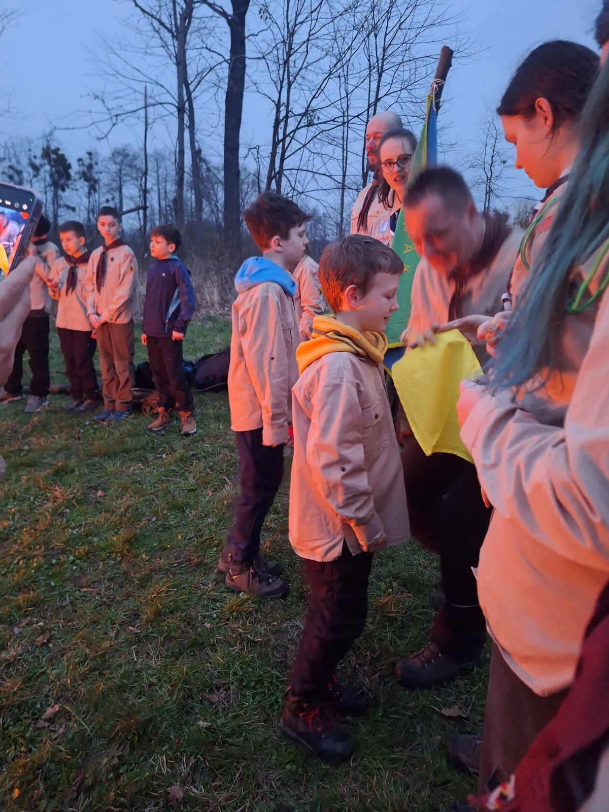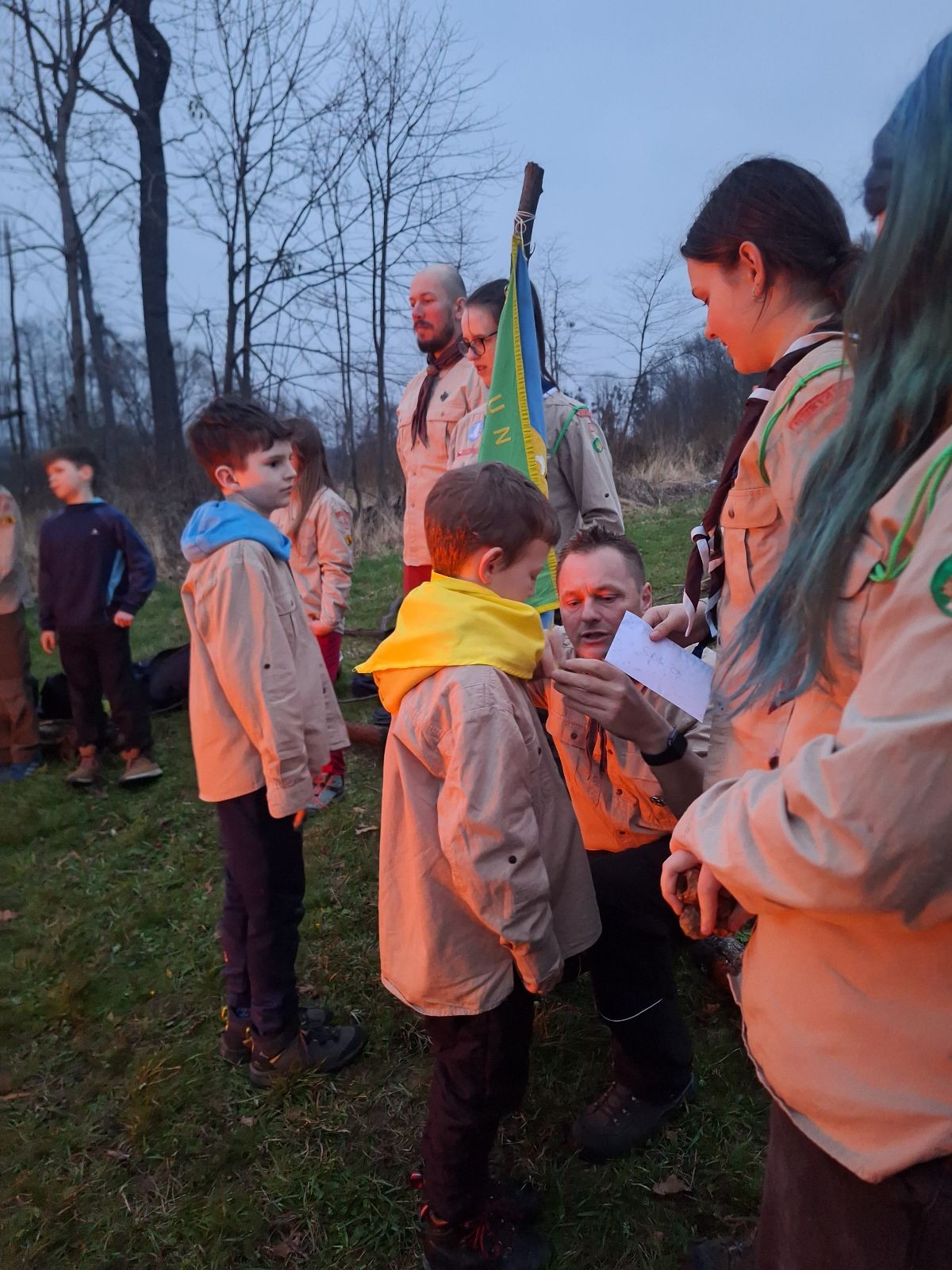 Sbíráme šutry na ohniště. Dřeva je v okolí všude dost, což nám šetří práci. Kolča se mi svěřuje, že má nehty po taťkovi. Koukám na její upravené, gelové nehty růžové barvy a říkám si „hmmm. Libor má fakt vytříbený vkus“ Pořád mi teď naskakuje obrázek Libora s růžovou manikúrou a třpytkami. Toho se asi dlouho nezbavím. Zapalujeme slavnostní oheň, zpíváme Tulácký ráno, znovu zapalujeme slavnostní oheň, který mezitím zhasíná a jde se na sliby. Máme nepočítaně světlušek a vlčat + dva novopečené skauty. I ve třiceti lidech se nám při skládání slibu u ohně dařilo být v klidu, což je u nás dost nezvyk a vlastně i docela paradox. Čím více nás je, tím větší máme schopnost být zticha. A už se to stalo podruhé, což cením a je to hodno zaznamenání, což tímto činím.