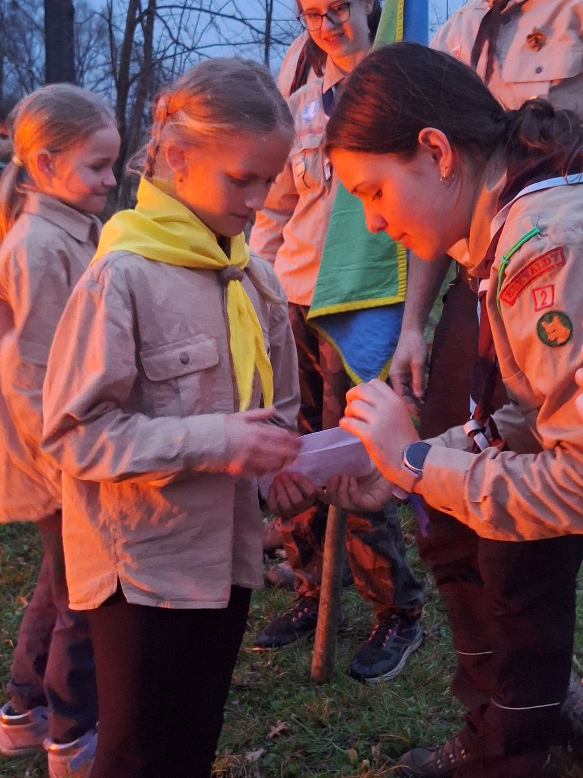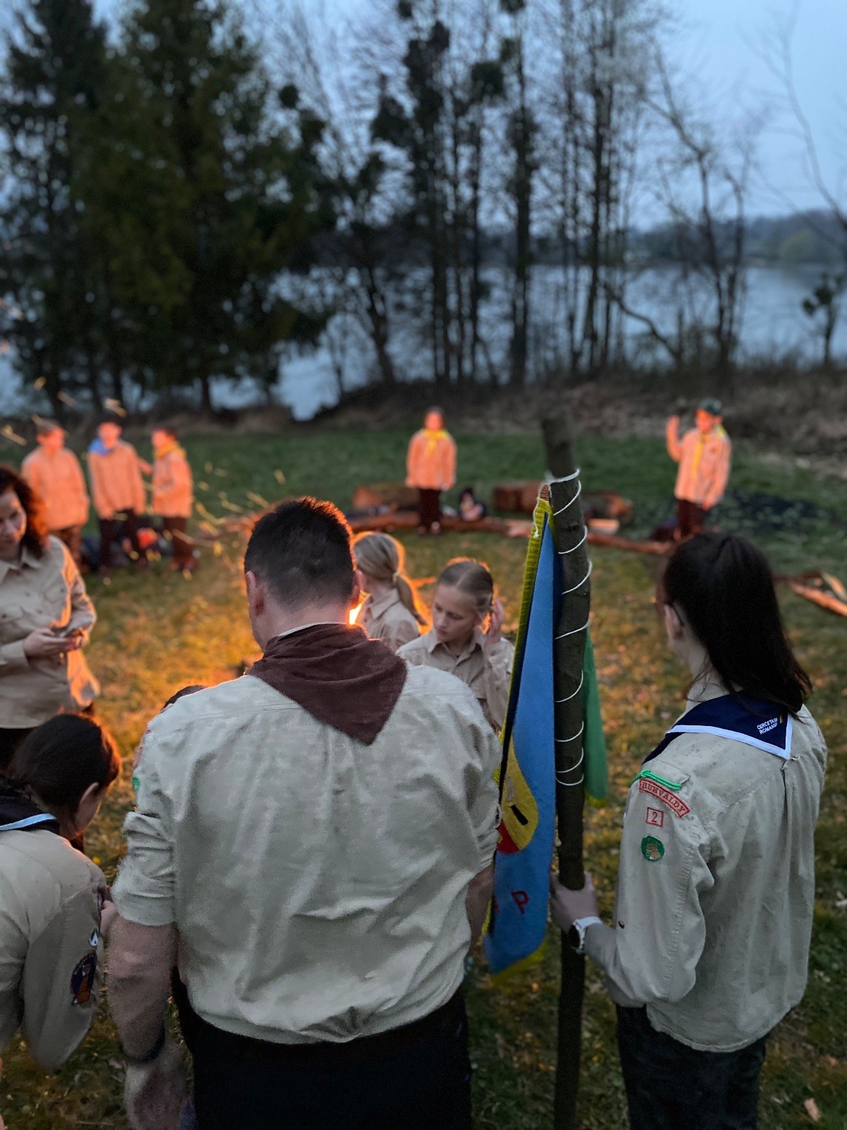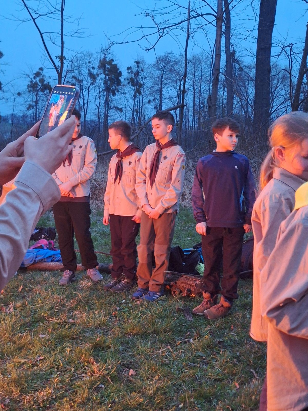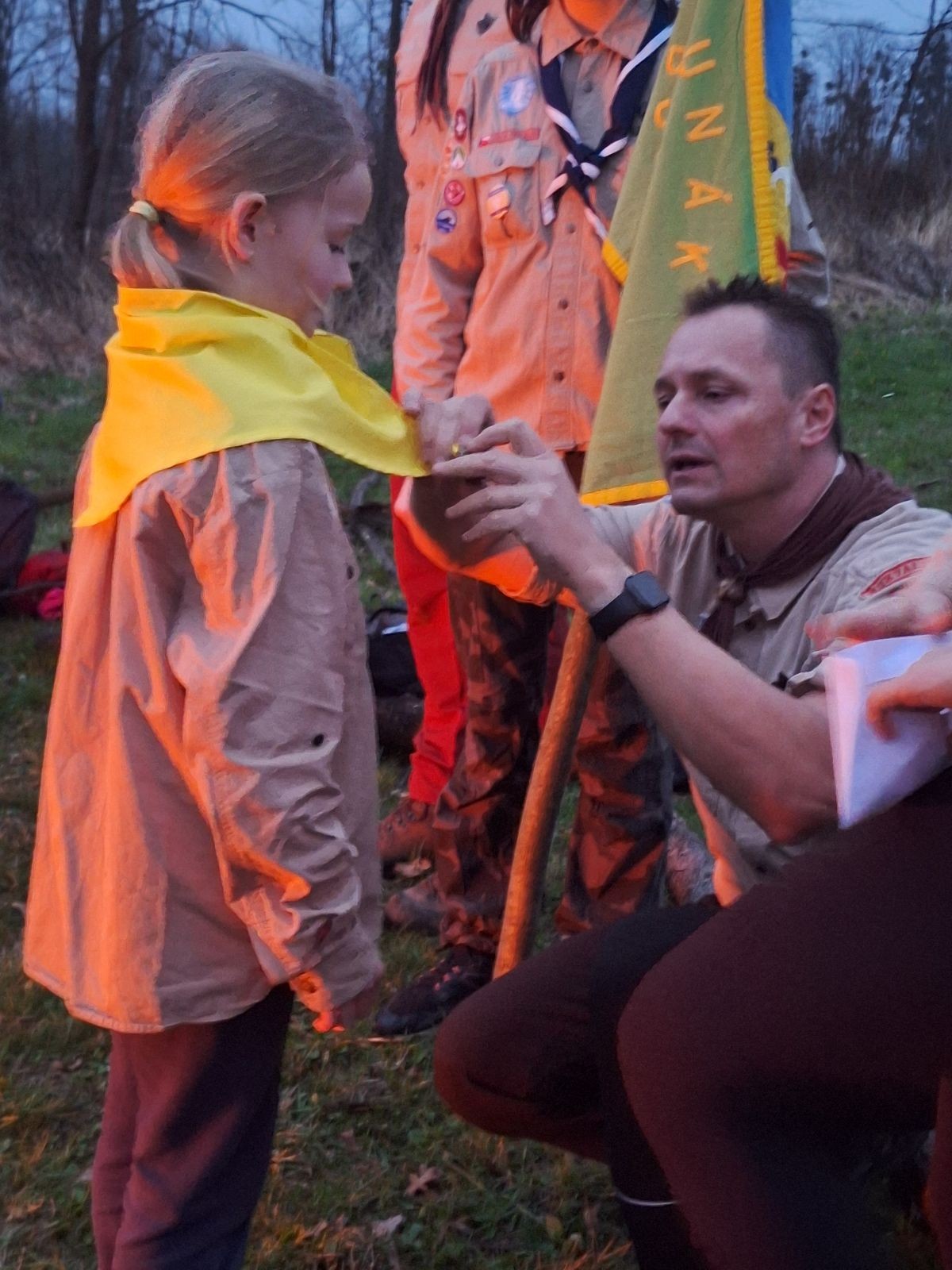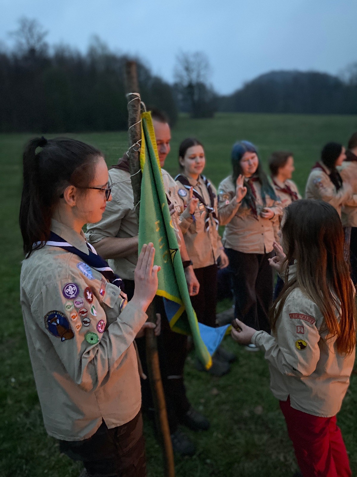 Sbíráme šutry na ohniště. Dřeva je v okolí všude dost, což nám šetří práci. Kolča se mi svěřuje, že má nehty po taťkovi. Koukám na její upravené, gelové nehty růžové barvy a říkám si „hmmm. Libor má fakt vytříbený vkus“ Pořád mi teď naskakuje obrázek Libora s růžovou manikúrou a třpytkami. Toho se asi dlouho nezbavím. Zapalujeme slavnostní oheň, zpíváme Tulácký ráno, znovu zapalujeme slavnostní oheň, který mezitím zhasíná a jde se na sliby. Máme nepočítaně světlušek a vlčat + dva novopečené skauty. I ve třiceti lidech se nám při skládání slibu u ohně dařilo být v klidu, což je u nás dost nezvyk a vlastně i docela paradox. Čím více nás je, tím větší máme schopnost být zticha. A už se to stalo podruhé, což cením a je to hodno zaznamenání, což tímto činím.