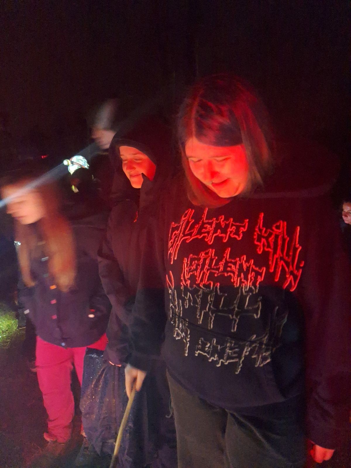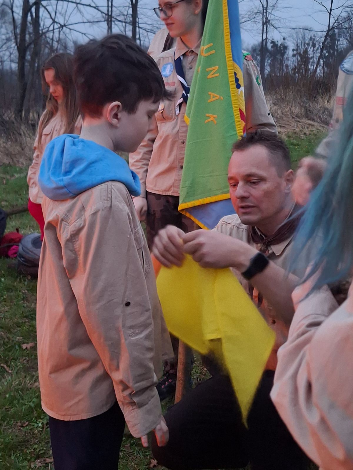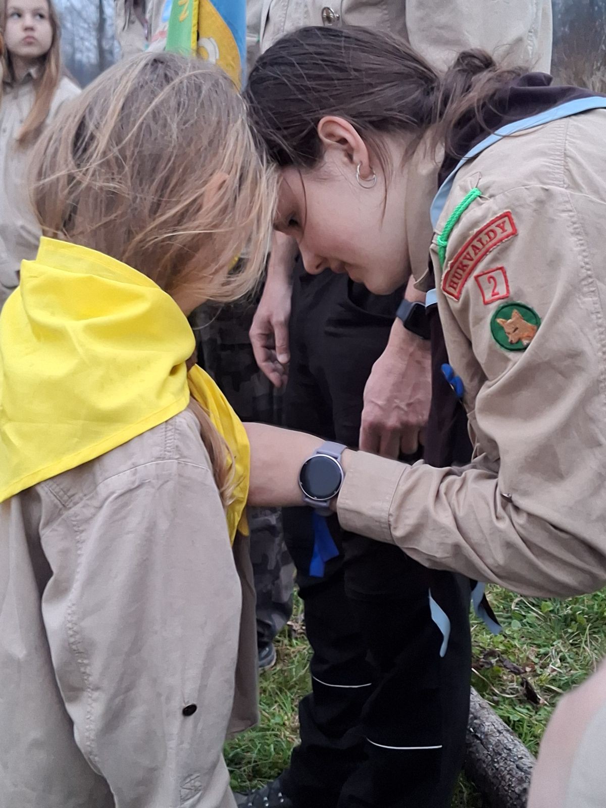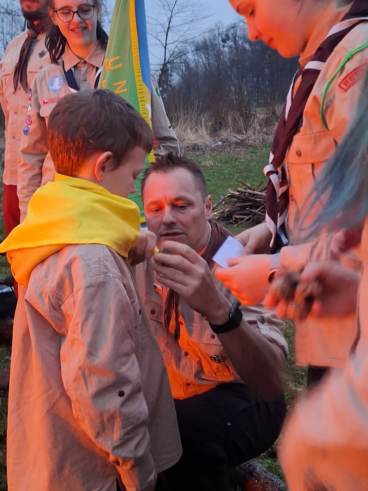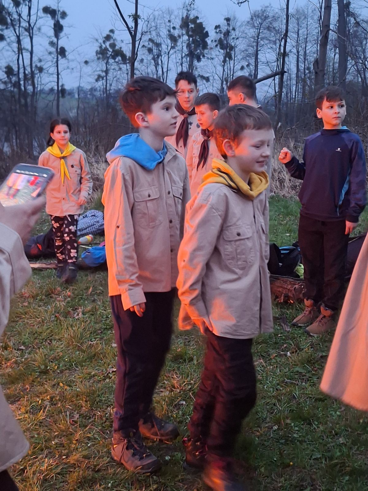Sbíráme šutry na ohniště. Dřeva je v okolí všude dost, což nám šetří práci. Kolča se mi svěřuje, že má nehty po taťkovi. Koukám na její upravené, gelové nehty růžové barvy a říkám si „hmmm. Libor má fakt vytříbený vkus“ Pořád mi teď naskakuje obrázek Libora s růžovou manikúrou a třpytkami. Toho se asi dlouho nezbavím. Zapalujeme slavnostní oheň, zpíváme Tulácký ráno, znovu zapalujeme slavnostní oheň, který mezitím zhasíná a jde se na sliby. Máme nepočítaně světlušek a vlčat + dva novopečené skauty. I ve třiceti lidech se nám při skládání slibu u ohně dařilo být v klidu, což je u nás dost nezvyk a vlastně i docela paradox. Čím více nás je, tím větší máme schopnost být zticha. A už se to stalo podruhé, což cením a je to hodno zaznamenání, což tímto činím.