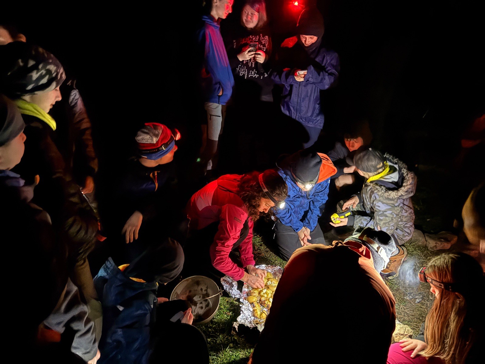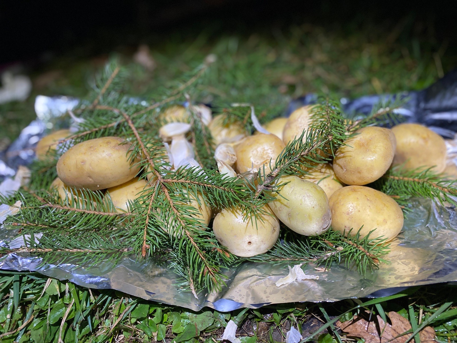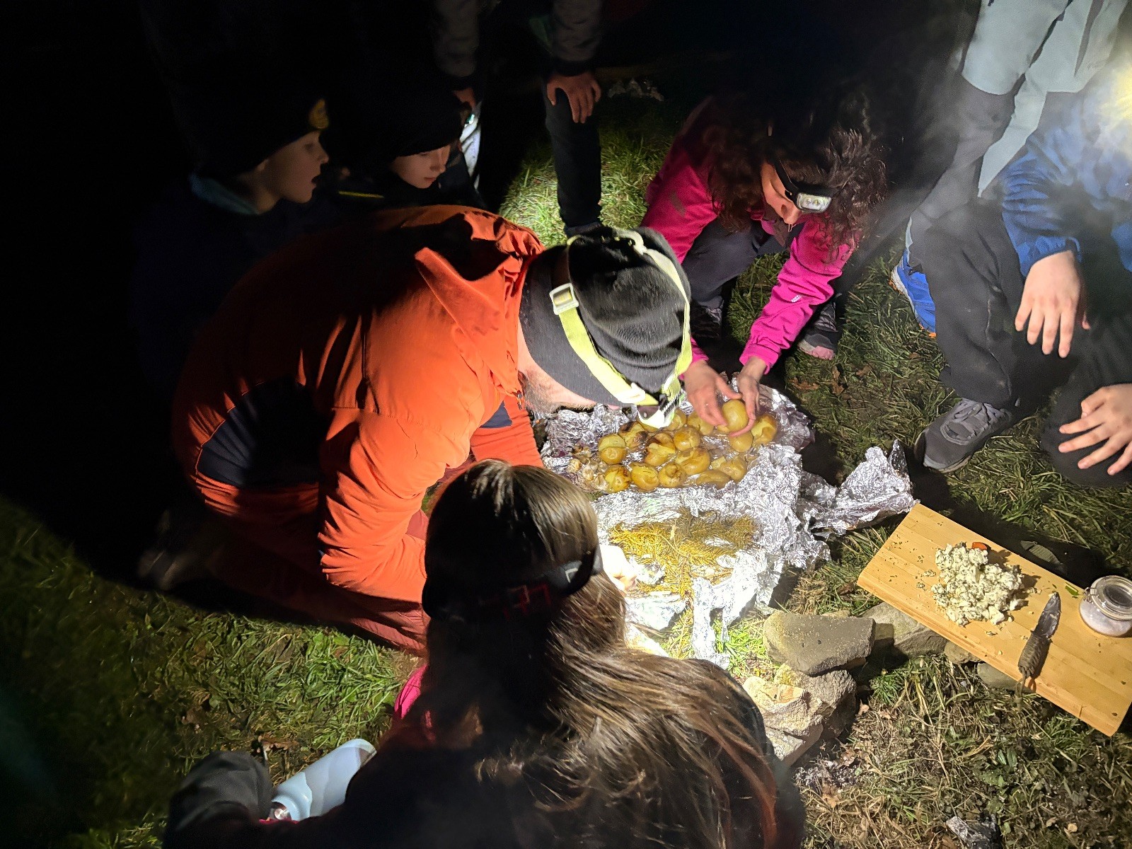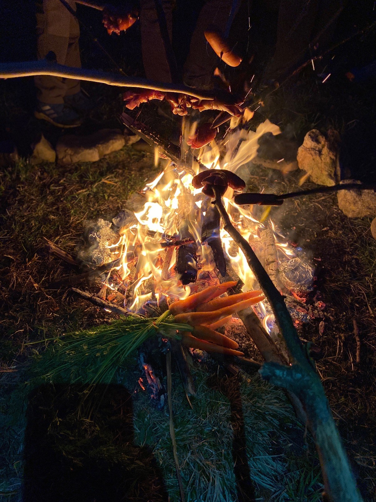 Po slibech děláme ze slavnostního ohně oheň užitkový. Opíkáme na něm párky, hážeme tam hermelíny, brambory a mrkev. Proč brambory a mrkev? Protože nejen špekáčkem či hermelínem je skaut živ a tak si přilepšujeme bramborami pečenými ve smrkovém chvojí s bylinkovým máslem a salátem z pečené mrkve, pomeranče a koriandru.
