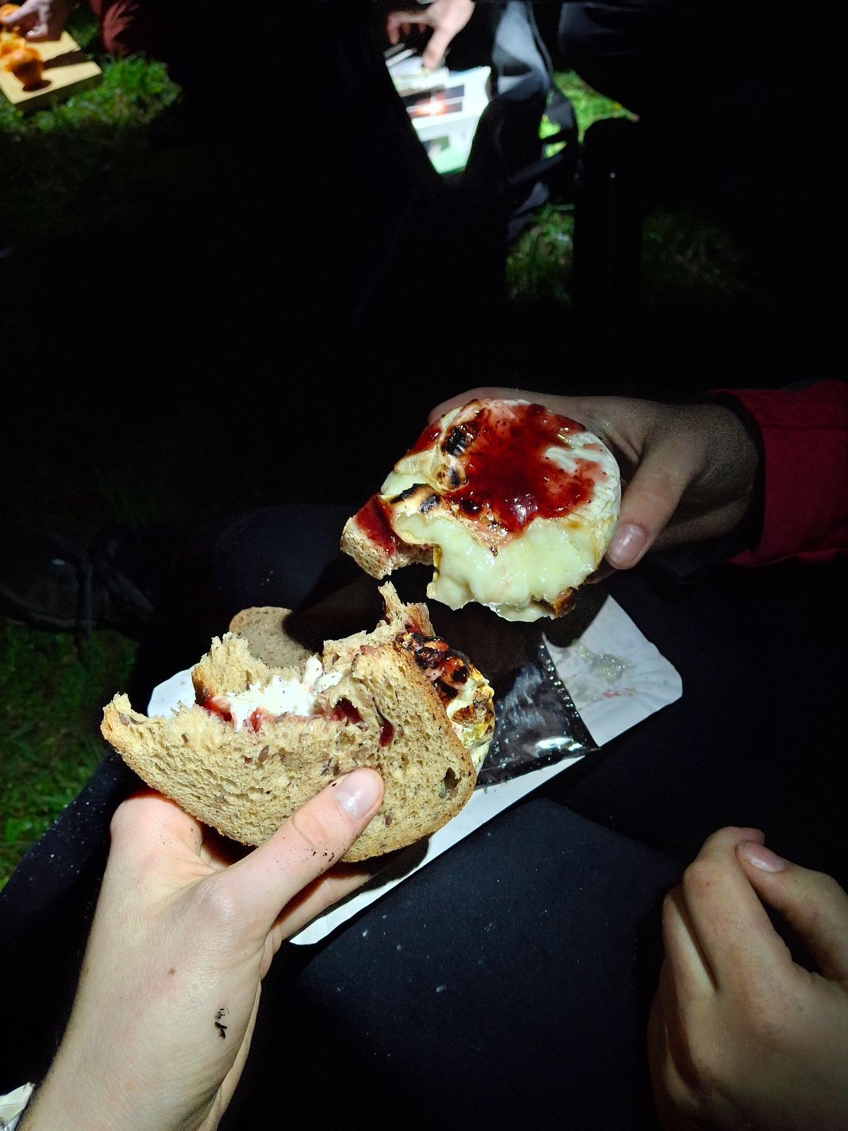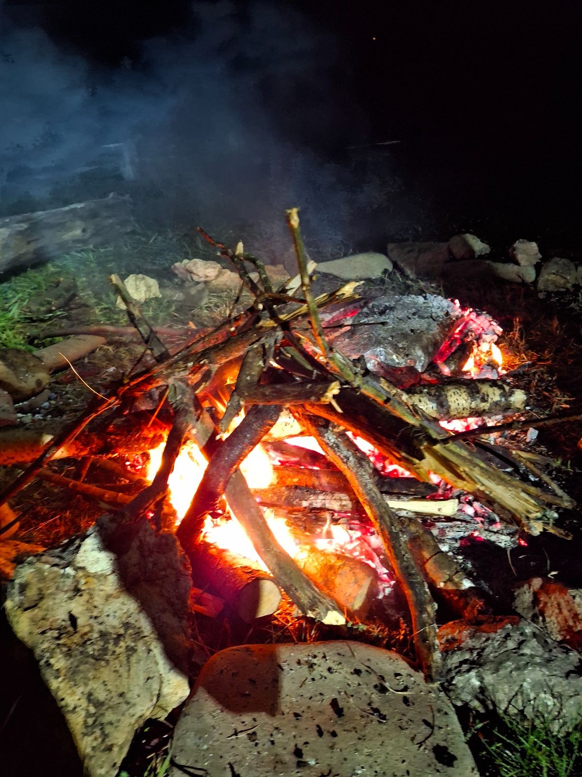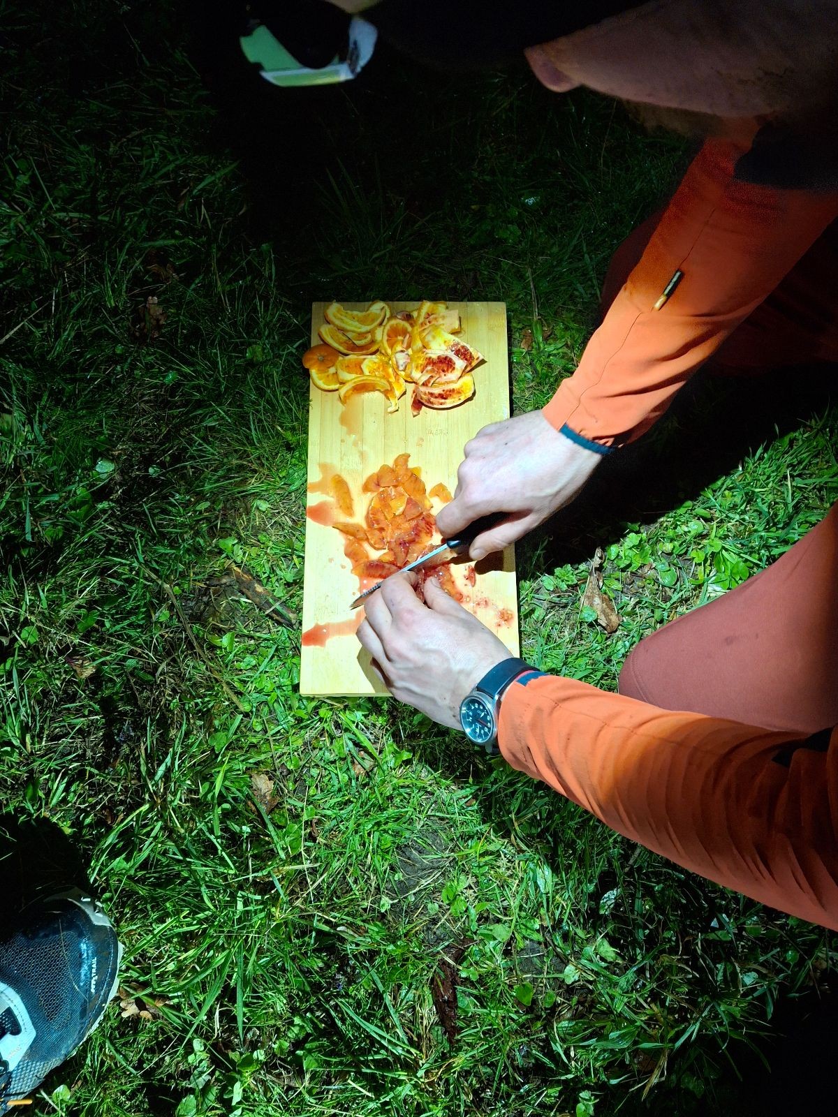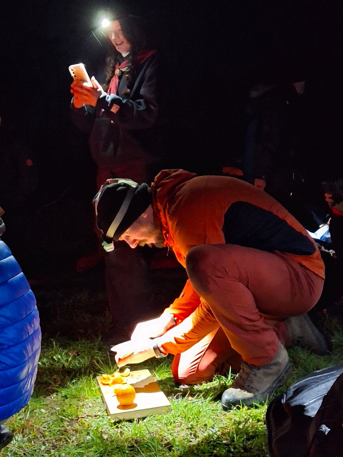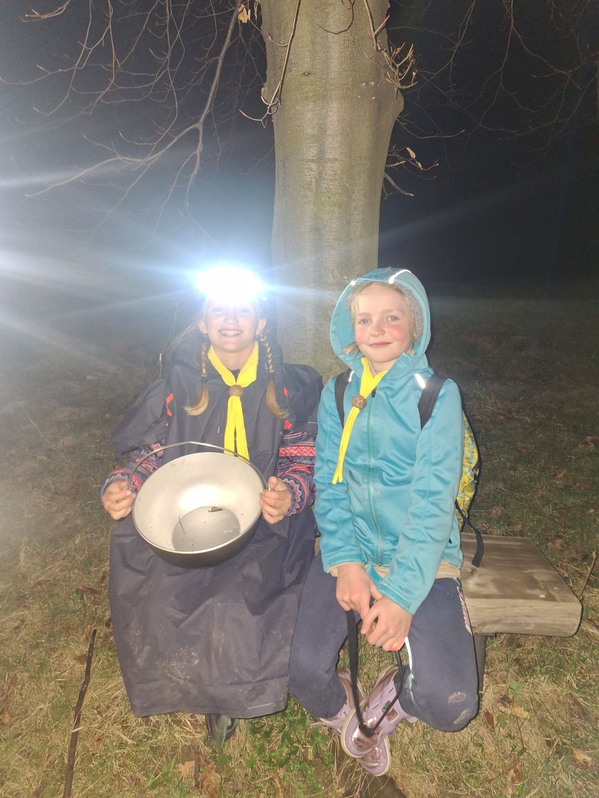 Po slibech děláme ze slavnostního ohně oheň užitkový. Opíkáme na něm párky, hážeme tam hermelíny, brambory a mrkev. Proč brambory a mrkev? Protože nejen špekáčkem či hermelínem je skaut živ a tak si přilepšujeme bramborami pečenými ve smrkovém chvojí s bylinkovým máslem a salátem z pečené mrkve, pomeranče a koriandru.