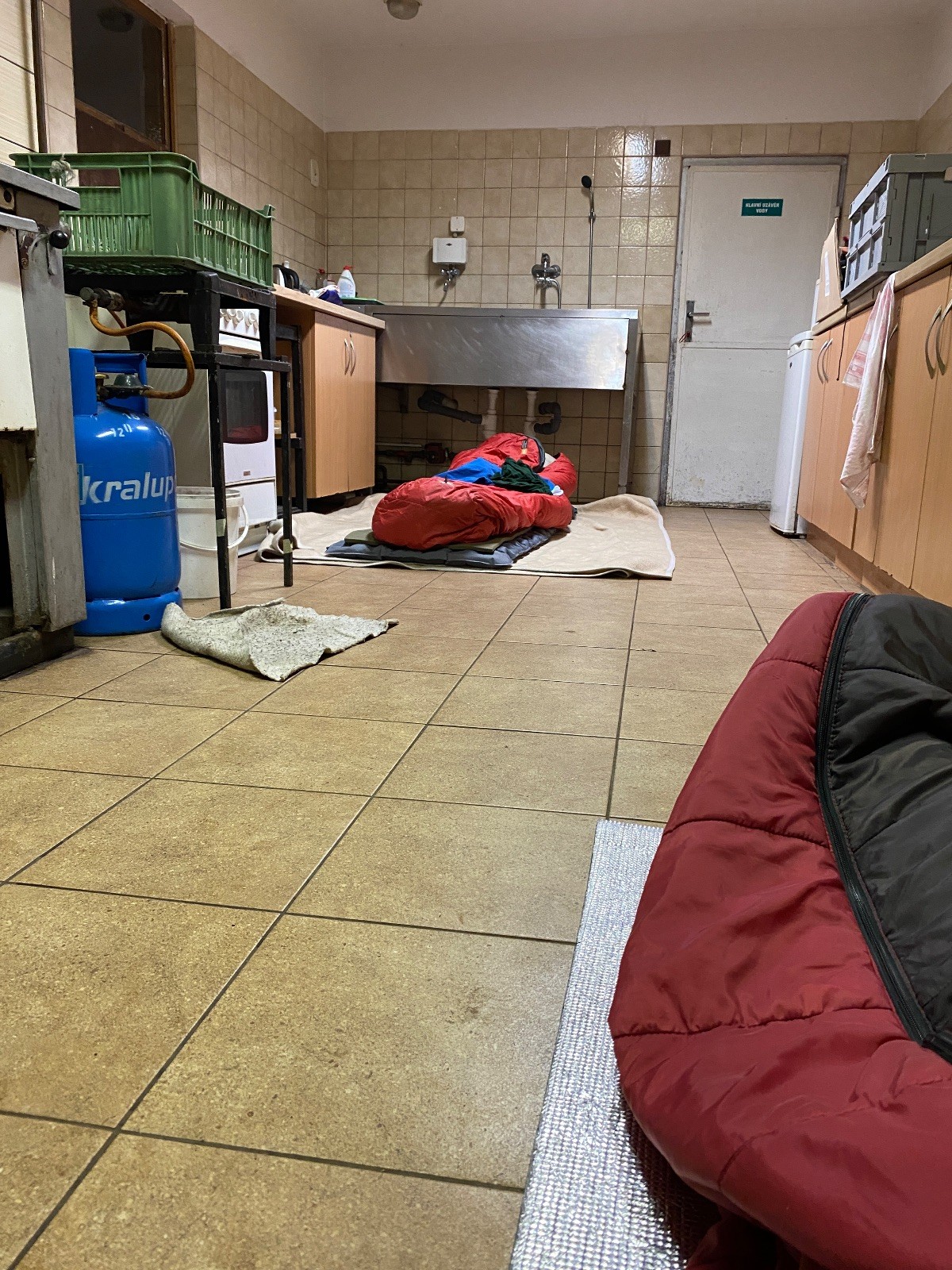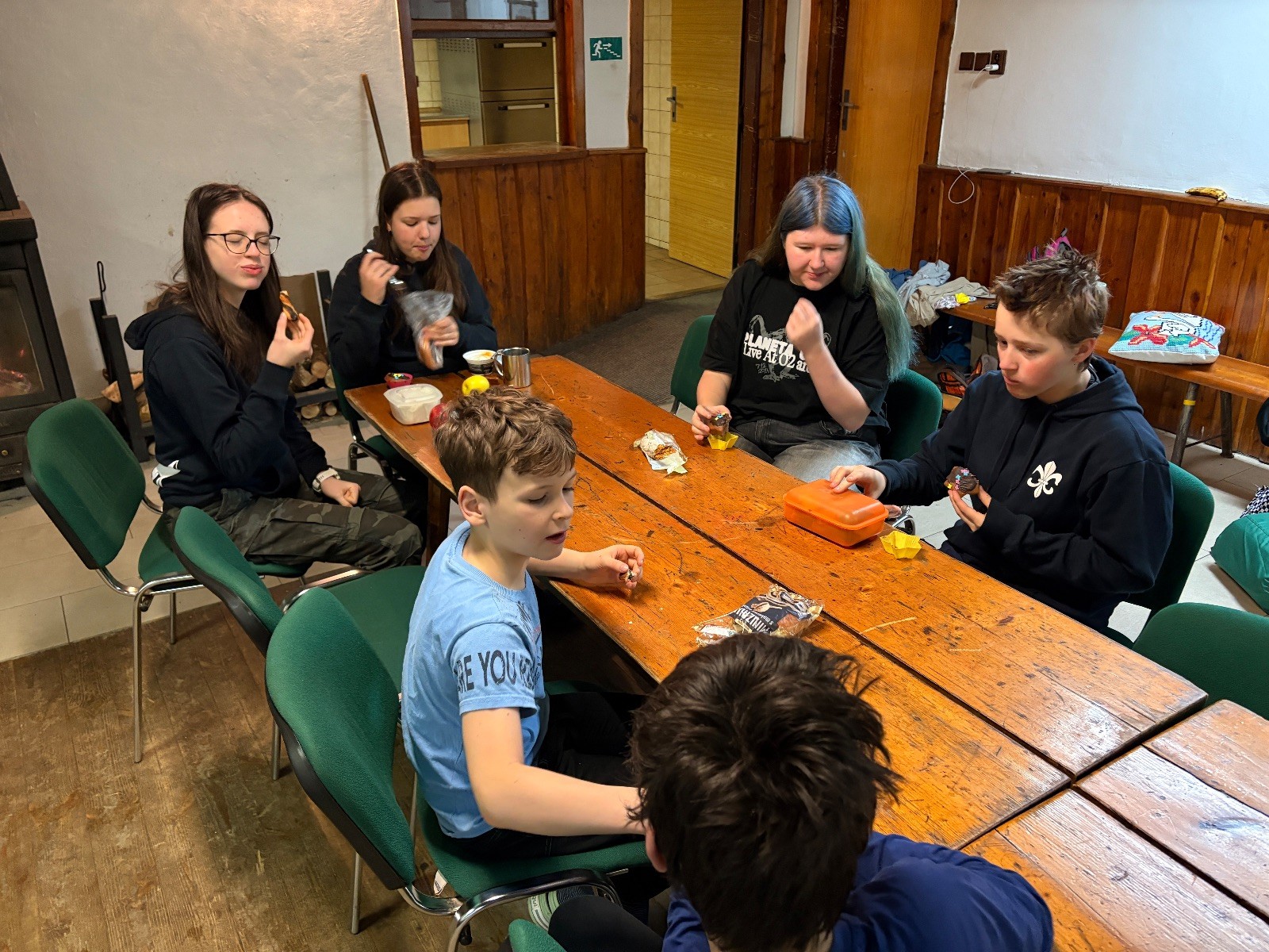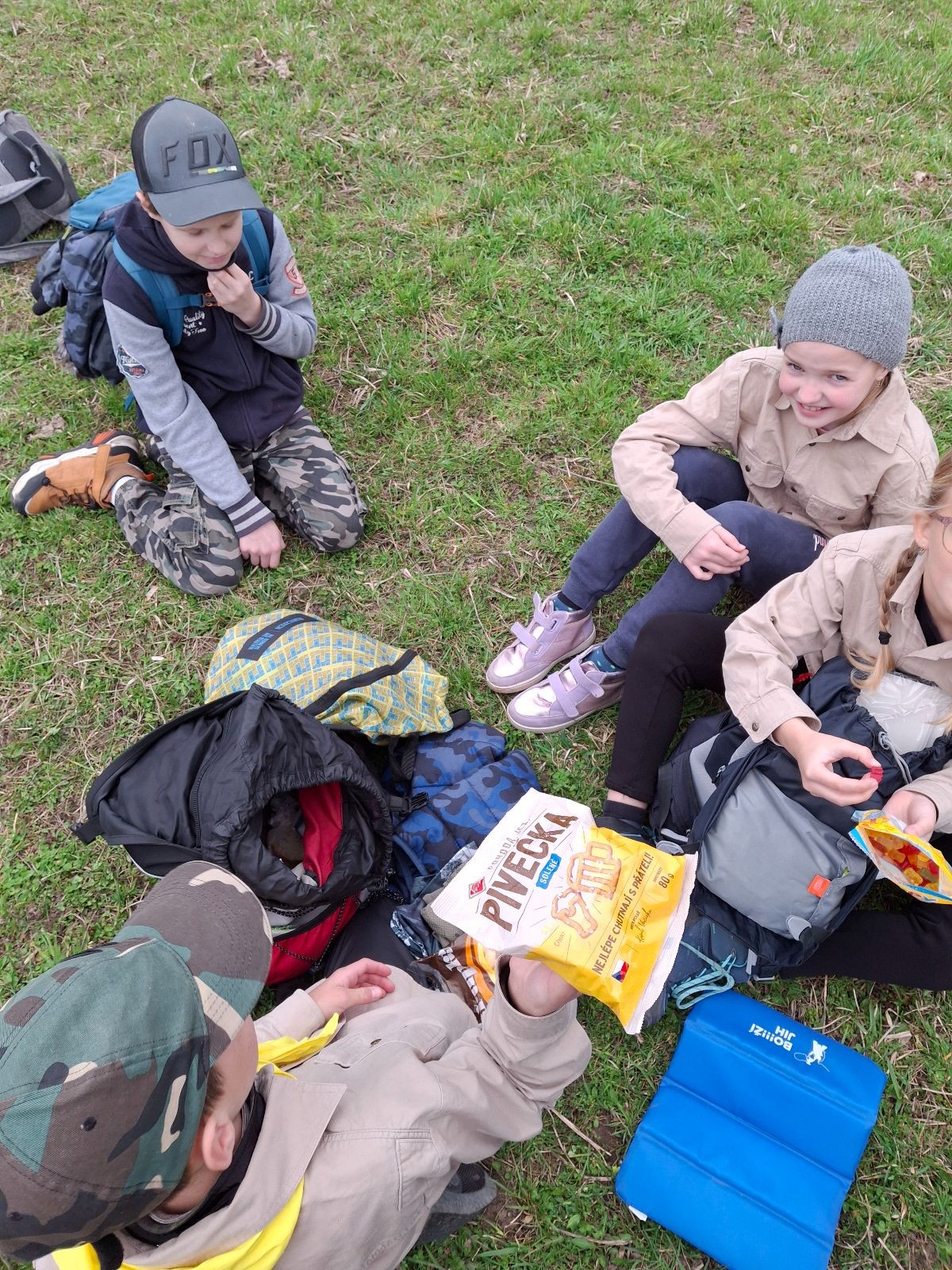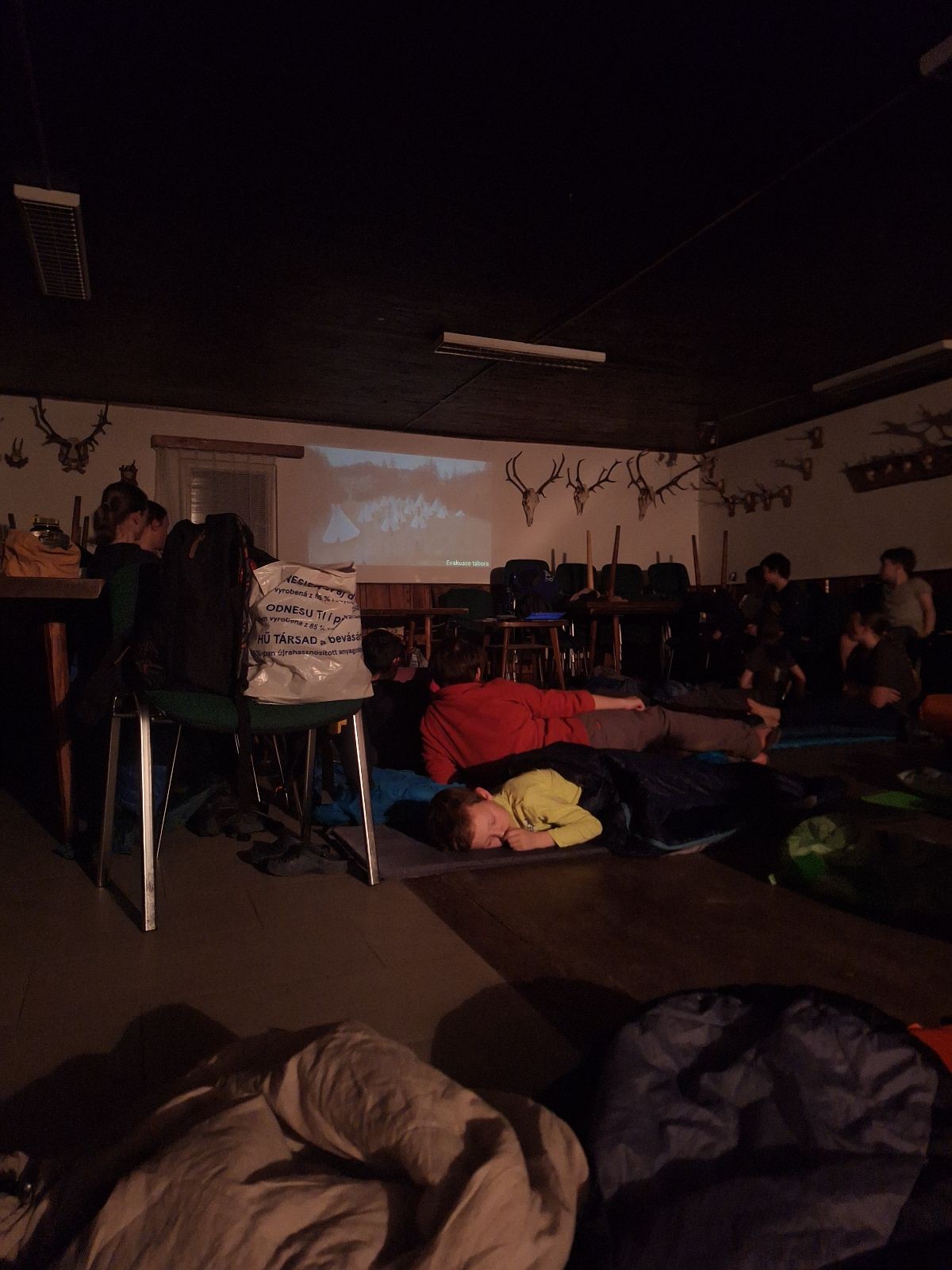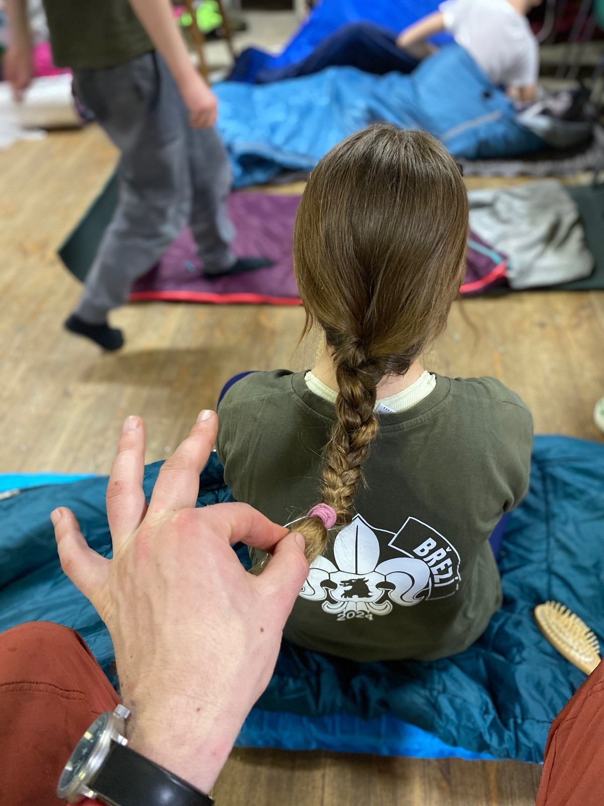 Na myslivně čistíme zuby, ukládáme se do spacáků a pouštíme táborový film. Já ještě testuju buchty co máme na snídani. Jako zodpovědný vedoucí přece musím prověřit, zda je vše v pořádku. Zvlášť cením tvarohovou buchtu od paní Tuleňové. Tak akorát sladká s elegantním hintem citronové kůry. Jako poslední zapadáme do spacáků já a Uzel. Koukám na Uzlův spací setup a povím vám, že Uzel je jak princezna na hrášku… Základ tvoří několik velkých dek na nich obyčejná karimata pak nafukovací karimatka a na tom načechraný spacák s polštářkem. Věřím, že by vrstvy proložil ještě vodní matrací a matrací s jádrem z koňských žíní a žíní jednorožců, ale už ze mu to nevejde do auta.
