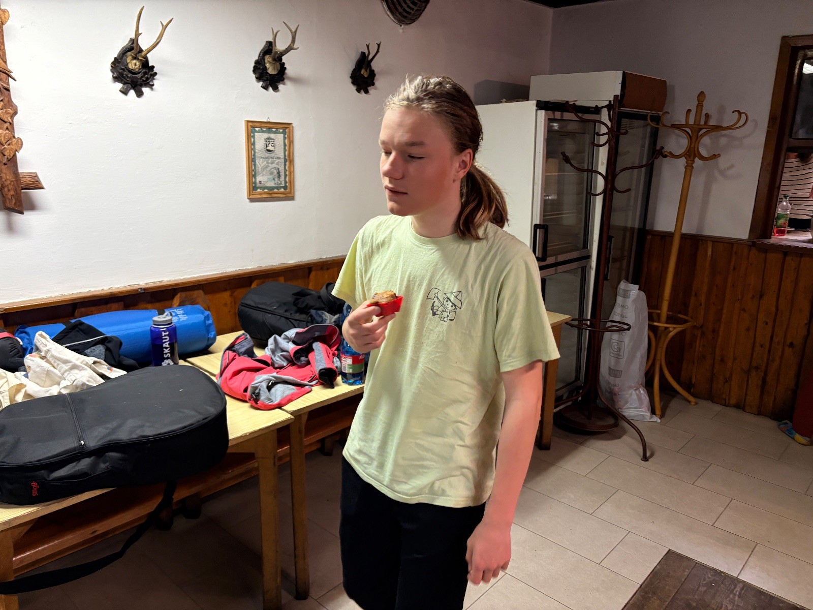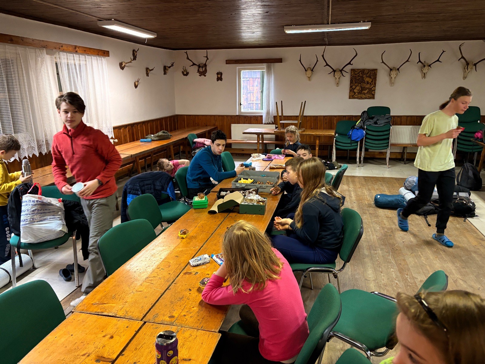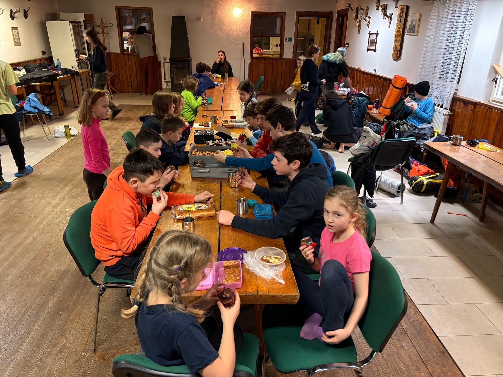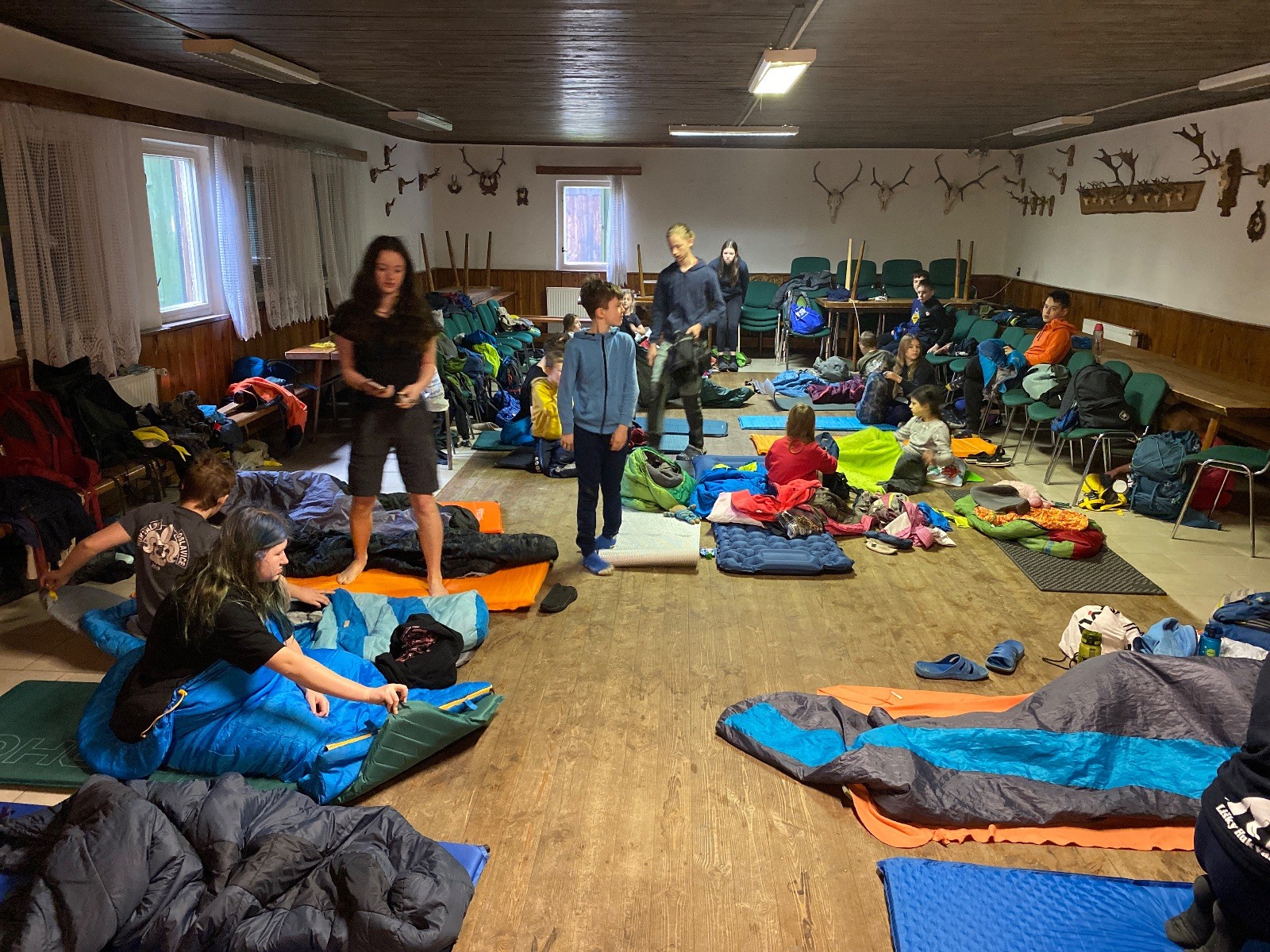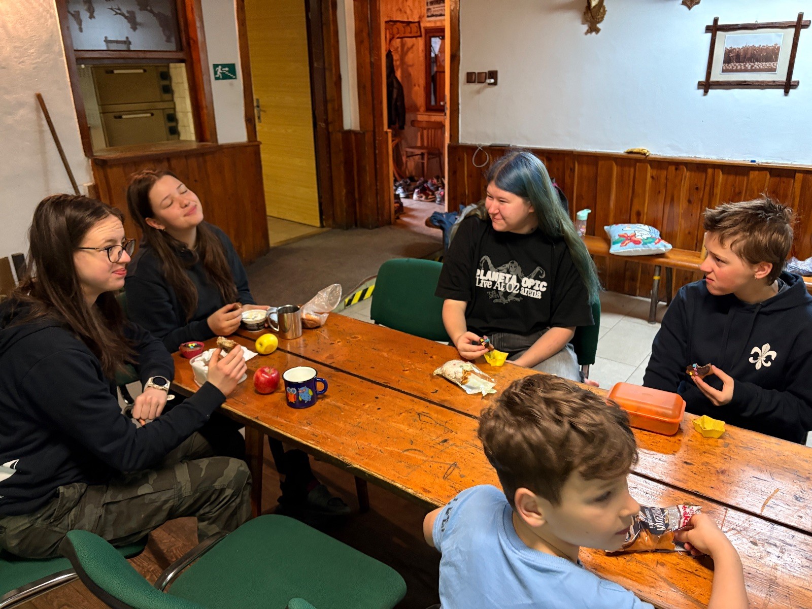 Na myslivně čistíme zuby, ukládáme se do spacáků a pouštíme táborový film. Já ještě testuju buchty co máme na snídani. Jako zodpovědný vedoucí přece musím prověřit, zda je vše v pořádku. Zvlášť cením tvarohovou buchtu od paní Tuleňové. Tak akorát sladká s elegantním hintem citronové kůry. Jako poslední zapadáme do spacáků já a Uzel. Koukám na Uzlův spací setup a povím vám, že Uzel je jak princezna na hrášku… Základ tvoří několik velkých dek na nich obyčejná karimata pak nafukovací karimatka a na tom načechraný spacák s polštářkem. Věřím, že by vrstvy proložil ještě vodní matrací a matrací s jádrem z koňských žíní a žíní jednorožců, ale už ze mu to nevejde do auta.