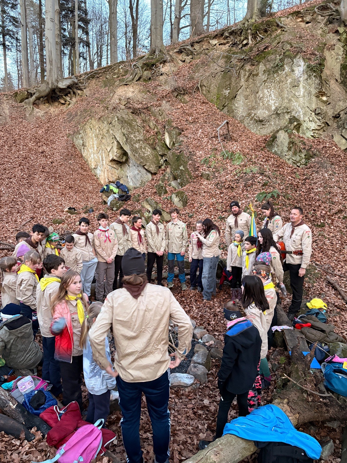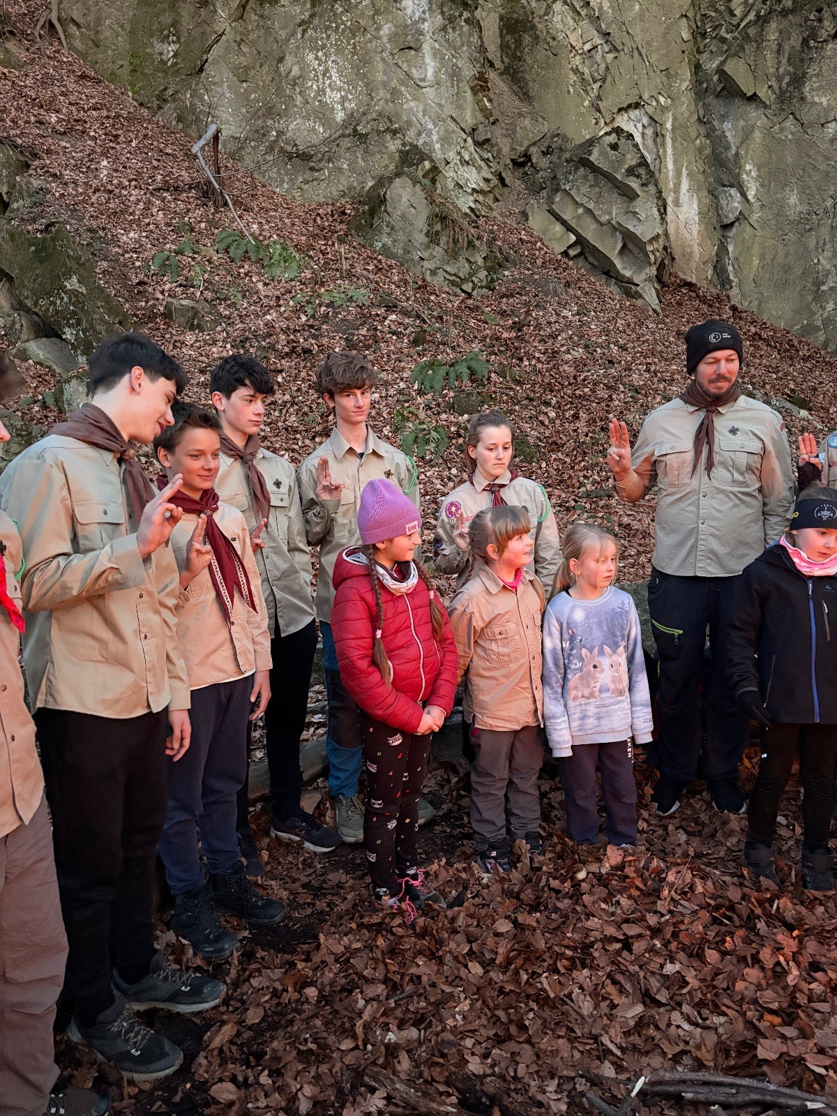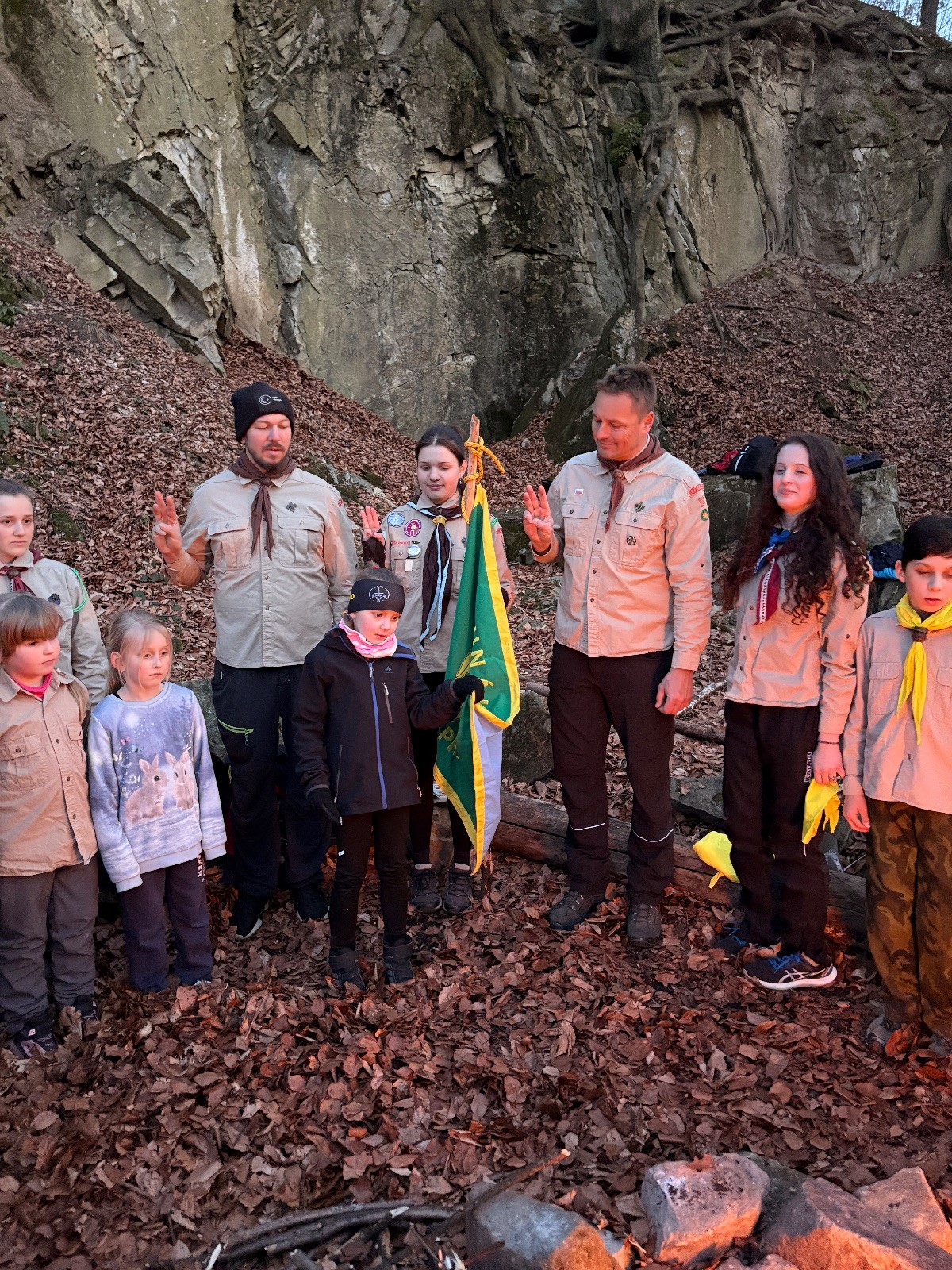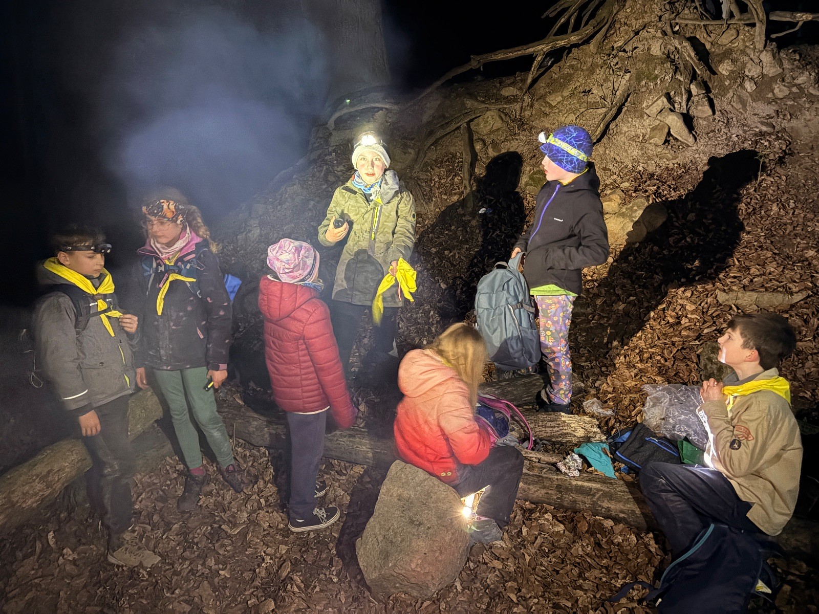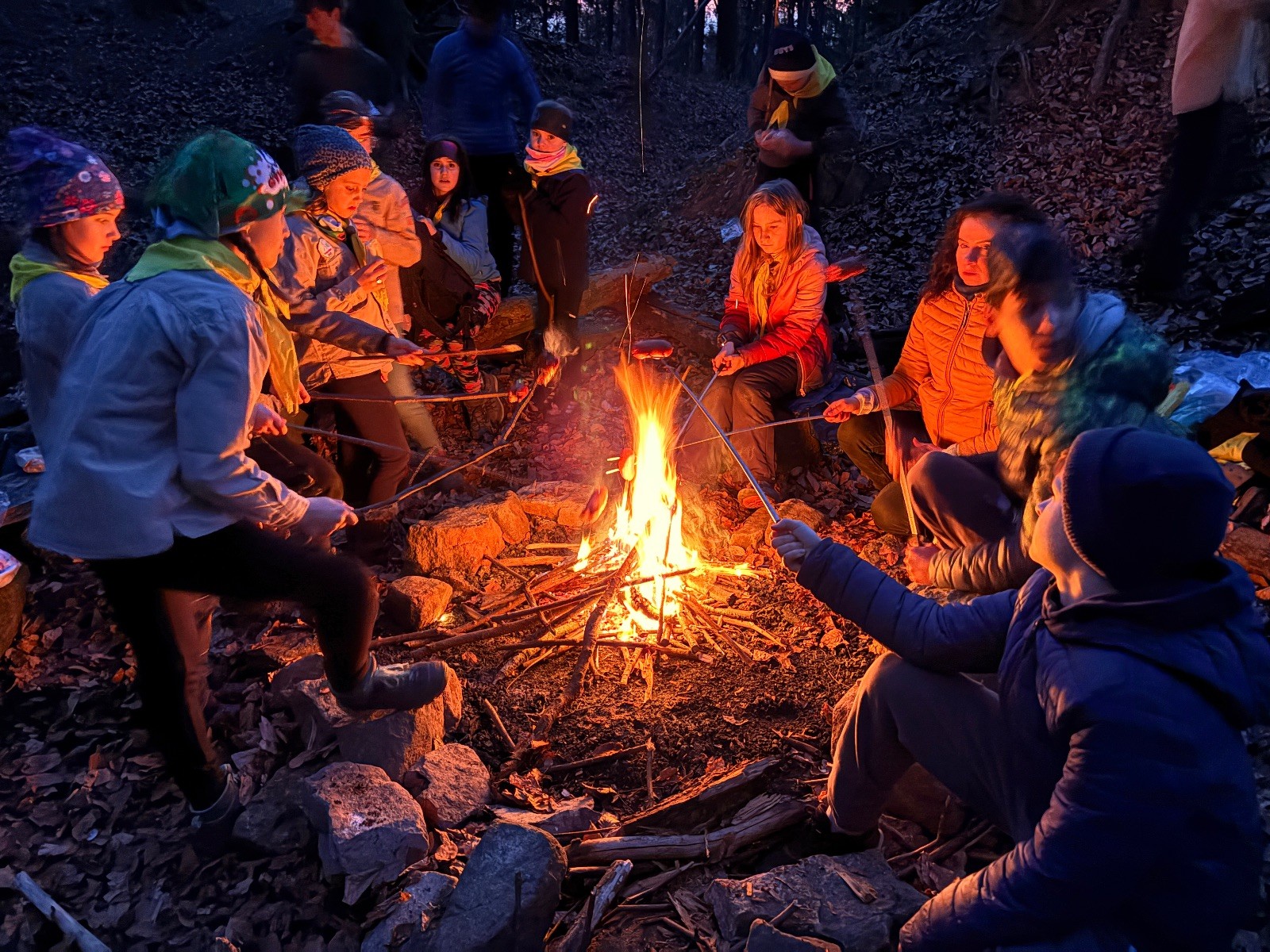 Čas nás lehce tlačil, takže bylo potřeba vyběhnout krpál nahoru do kopce a zase hezky dolů směrem do lomu. Zde všichni kdo mohli, posbírali okolní suché dřevo a mohlo se jít na oheň. Při znění skautské písně Tulácký ráno se nám krásně rozhoříval táborák a po slibu všech malých světlušek, vlčat a jednoho skauta se z malého ohýnku stal užitkový oheň pro hermelíny a špekáčky. Také Klepí se opět činil a na rošt hodil zelí, které se zde dělalo až do posledního uhlíku. Valča si vzala na starost Hágena, hru, která tvořila v tmavém lese tajemnou atmosféru.Zhasili jsme žhavé uhlíky a po družinkách se vydali směr myslivecká chata. Zde si všichni poctivci vydrhli zoubky a při Uzlem puštěném táborovém filmu 2025 jsme se všichni pomalu oddali spánku.