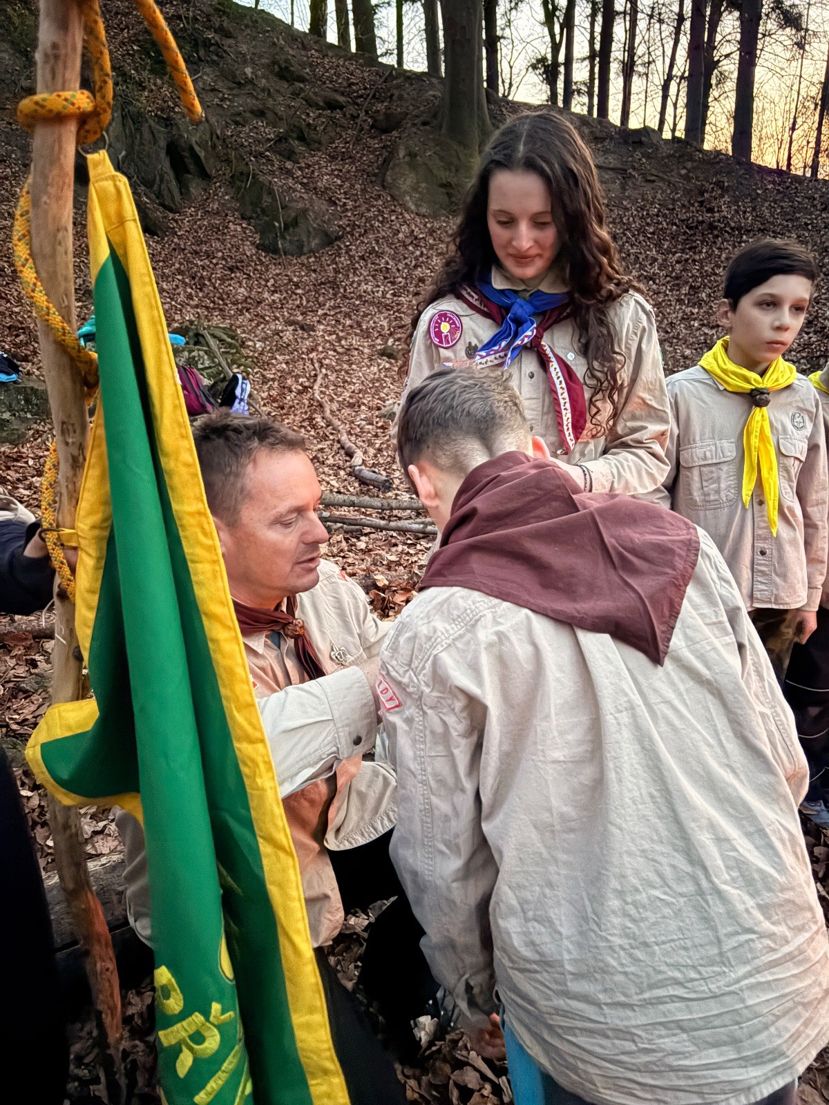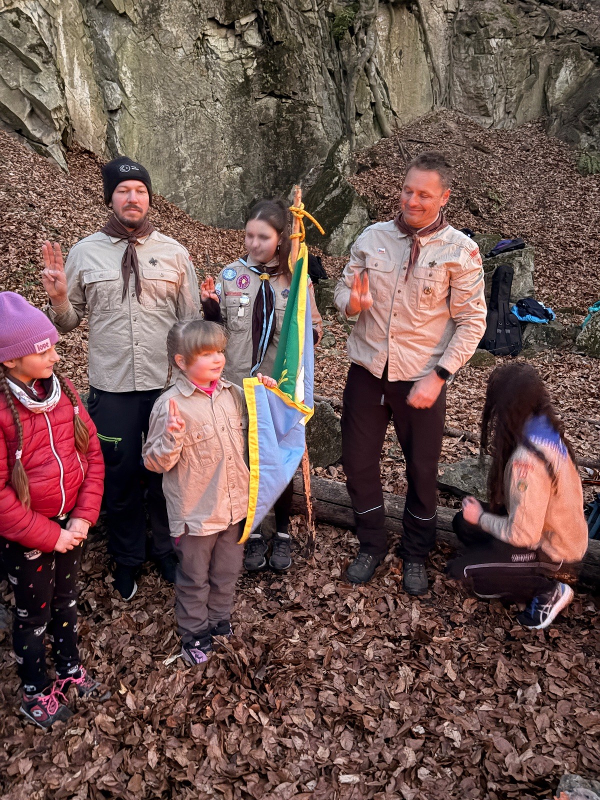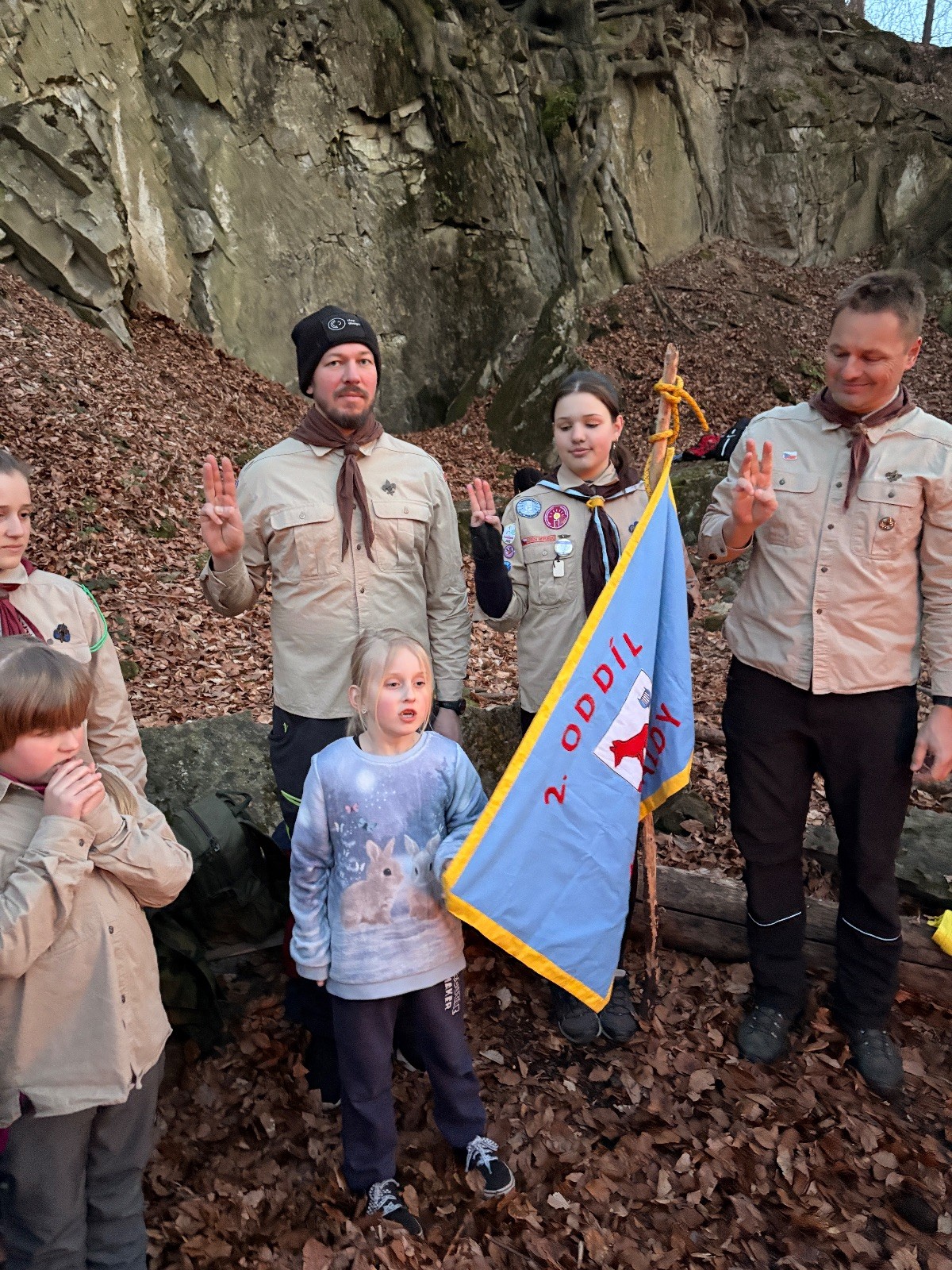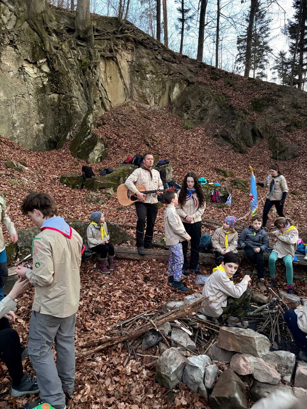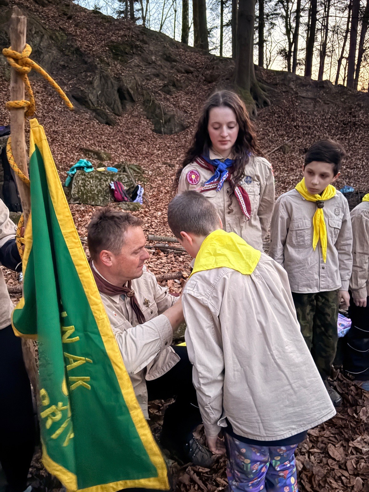 Čas nás lehce tlačil, takže bylo potřeba vyběhnout krpál nahoru do kopce a zase hezky dolů směrem do lomu. Zde všichni kdo mohli, posbírali okolní suché dřevo a mohlo se jít na oheň. Při znění skautské písně Tulácký ráno se nám krásně rozhoříval táborák a po slibu všech malých světlušek, vlčat a jednoho skauta se z malého ohýnku stal užitkový oheň pro hermelíny a špekáčky. Také Klepí se opět činil a na rošt hodil zelí, které se zde dělalo až do posledního uhlíku. Valča si vzala na starost Hágena, hru, která tvořila v tmavém lese tajemnou atmosféru.Zhasili jsme žhavé uhlíky a po družinkách se vydali směr myslivecká chata. Zde si všichni poctivci vydrhli zoubky a při Uzlem puštěném táborovém filmu 2025 jsme se všichni pomalu oddali spánku.